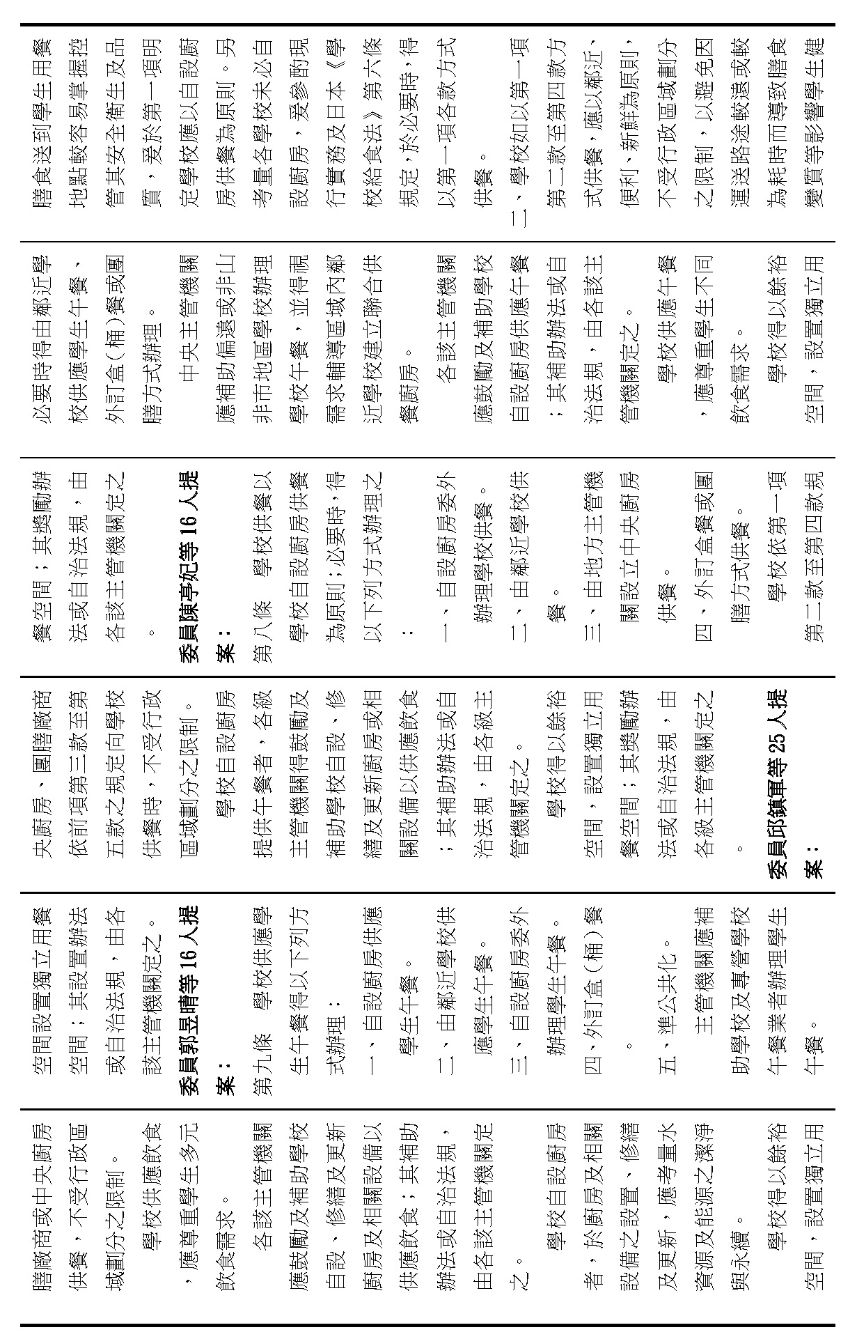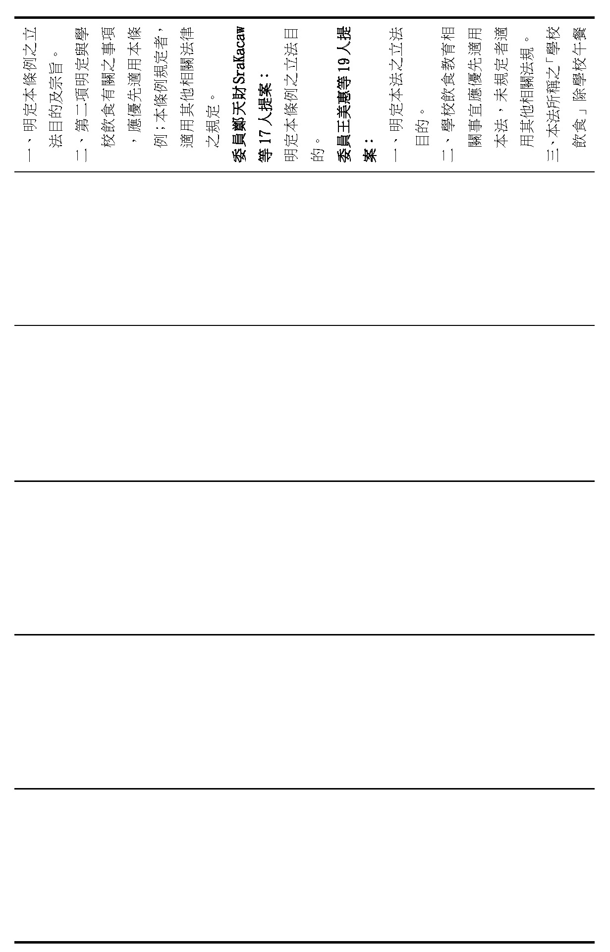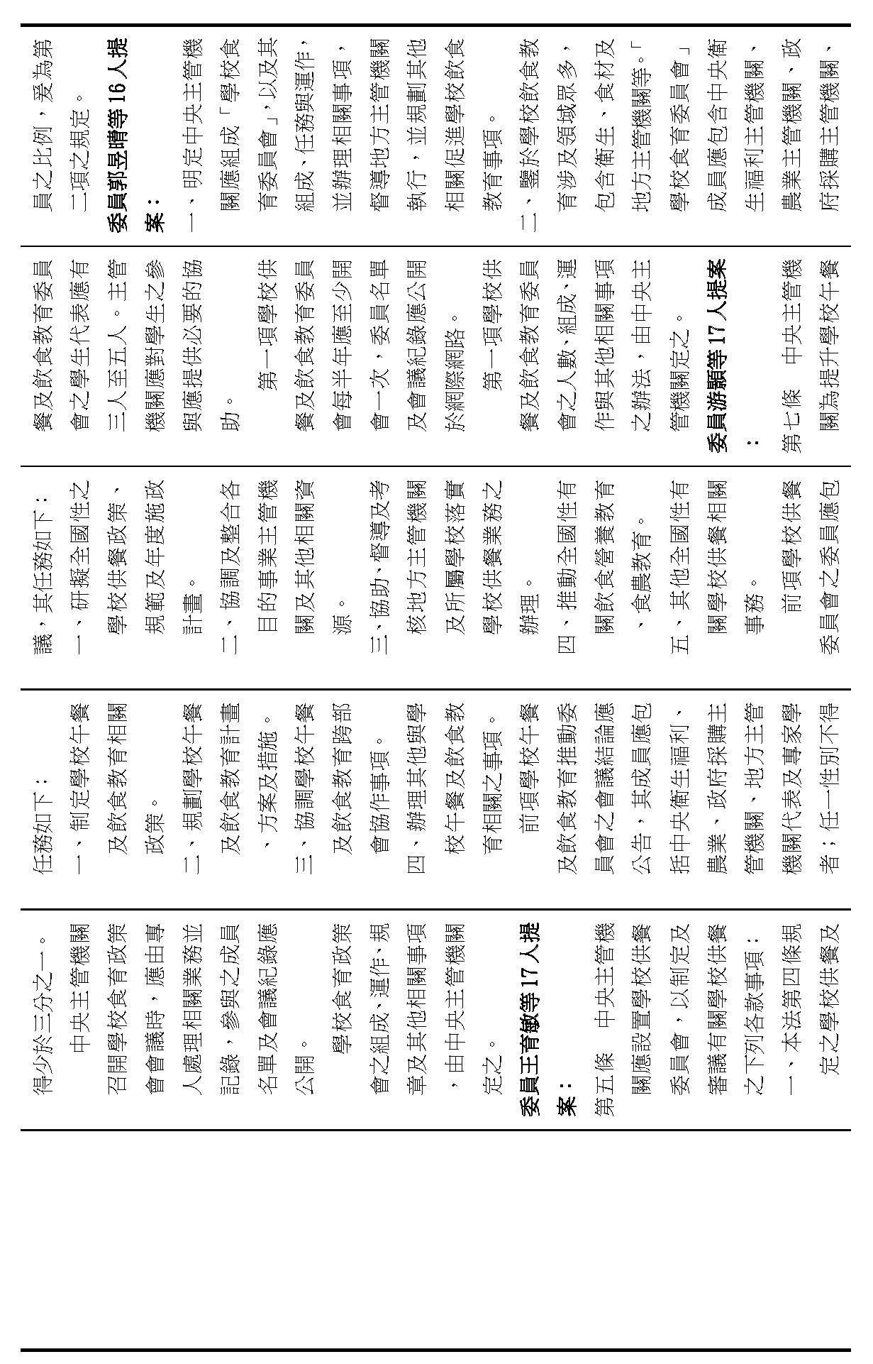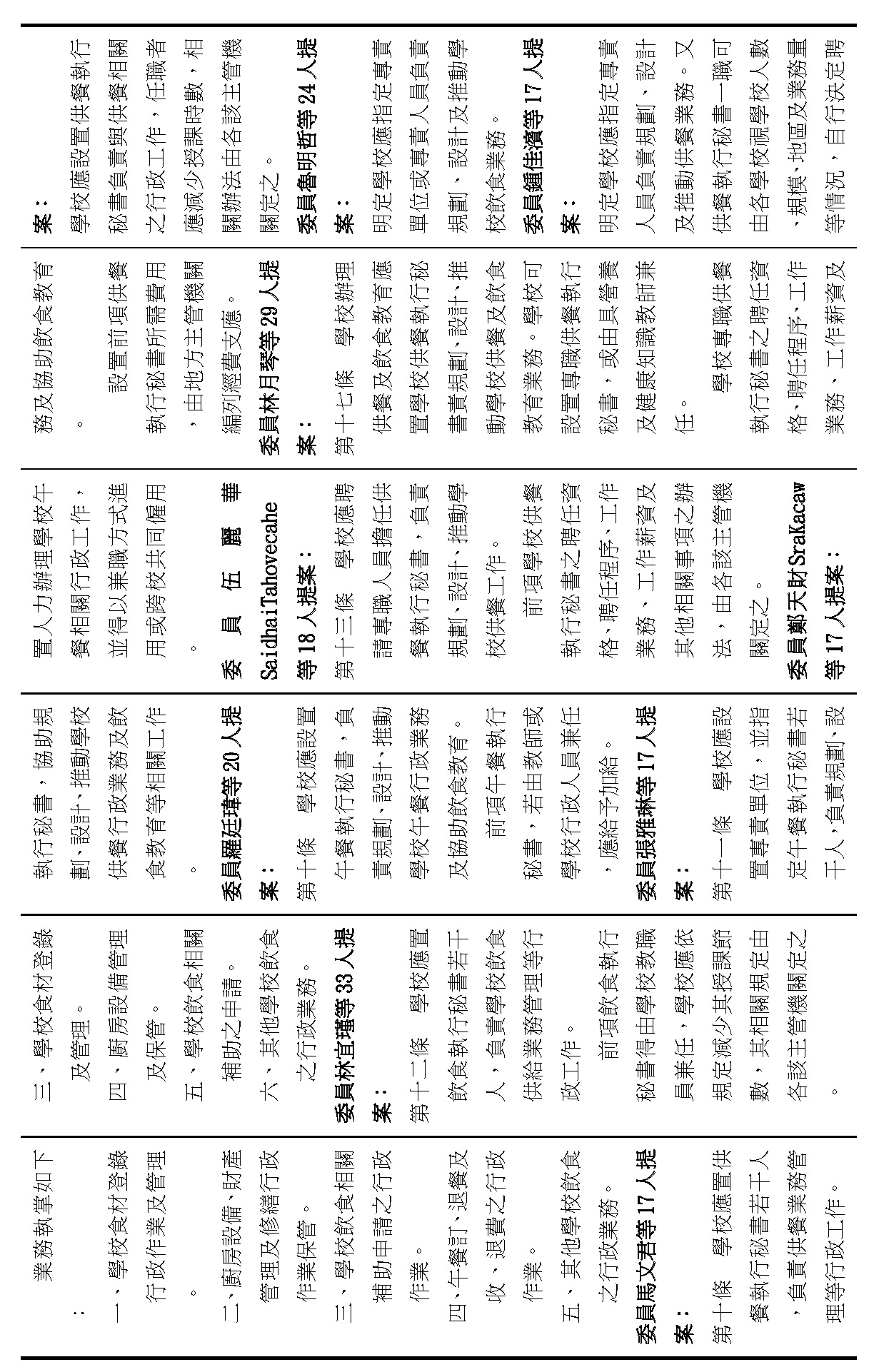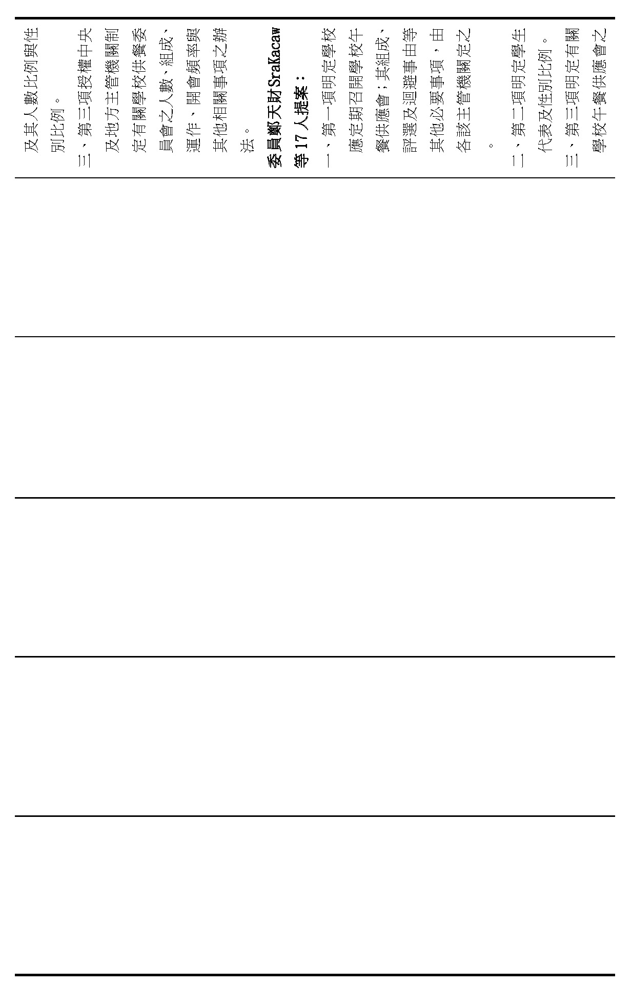 委員如果有臨時提案,請於上午10時30分前提出,處理提案時,若提案委員及連署委員均不在場,援例不予處理。現在審查學校供餐法草案相關草案,進行逐條審查,並進行……