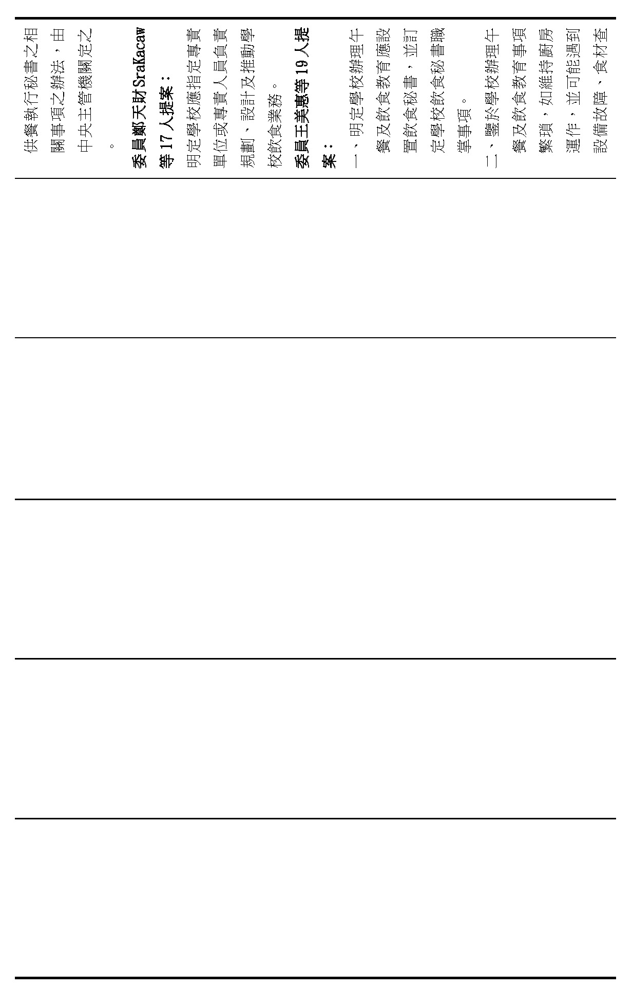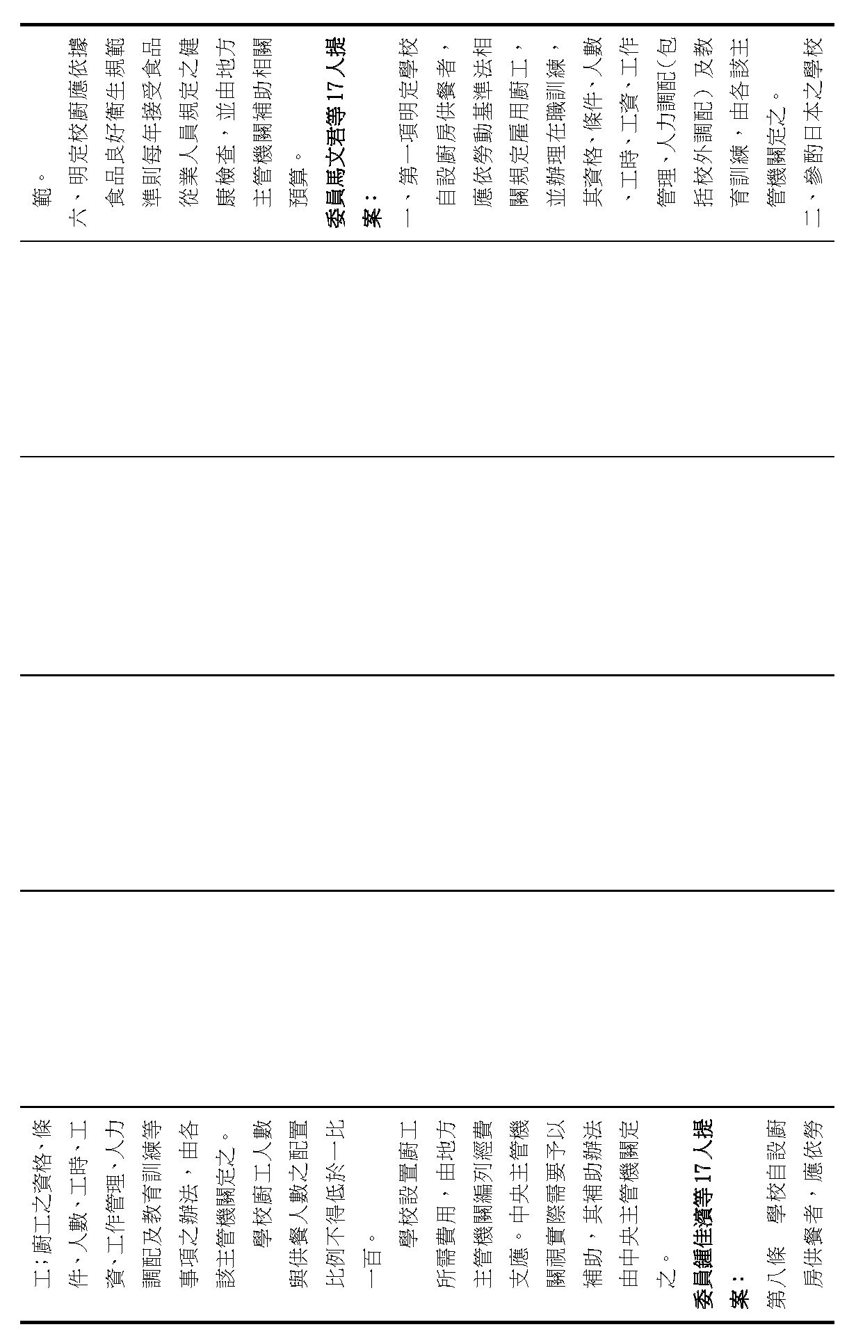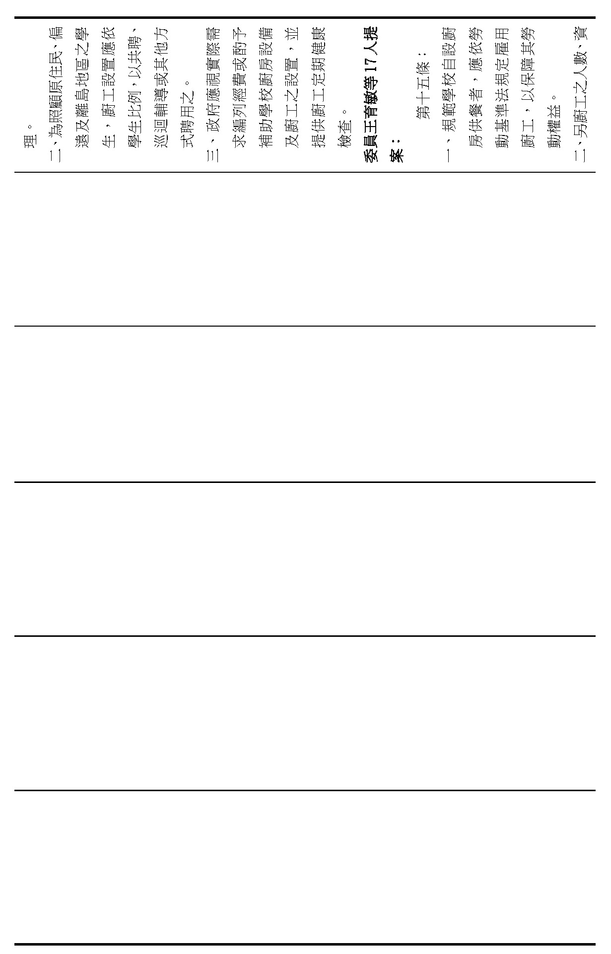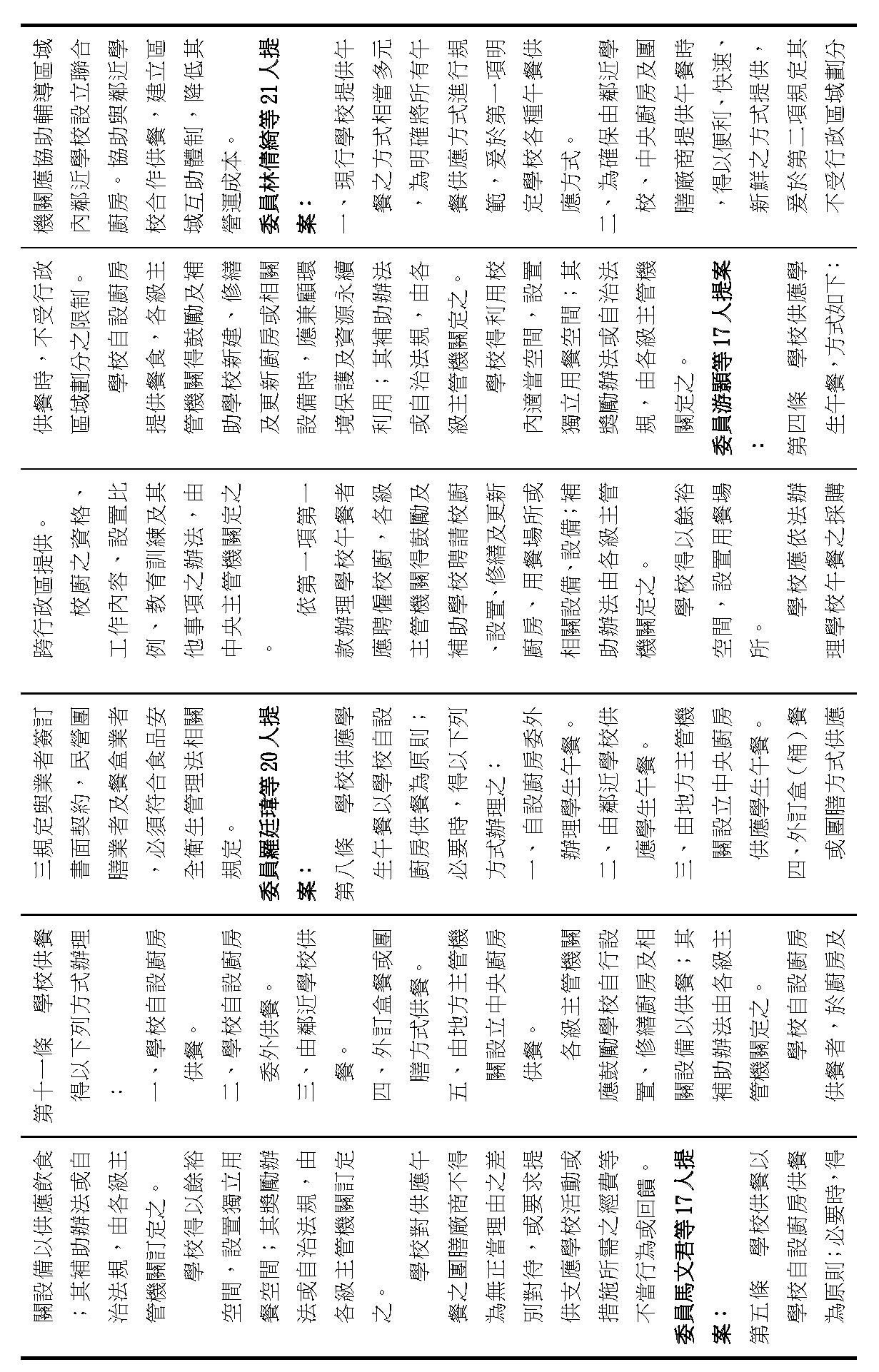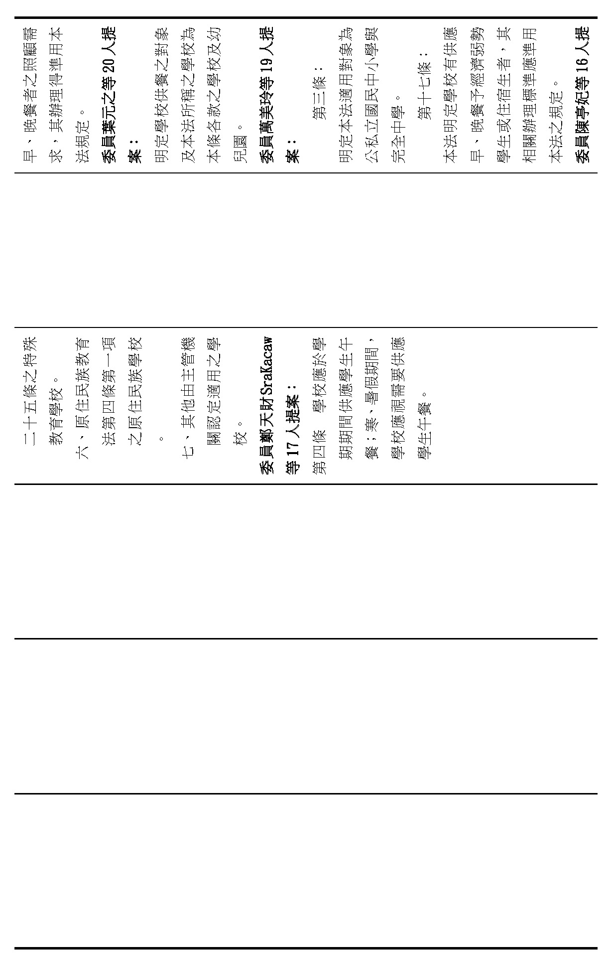 委員如果有臨時提案,請於上午10時30分前提出,處理提案時,若提案委員及連署委員均不在場,援例不予處理。現在審查學校供餐法草案相關草案,進行逐條審查,並進行……