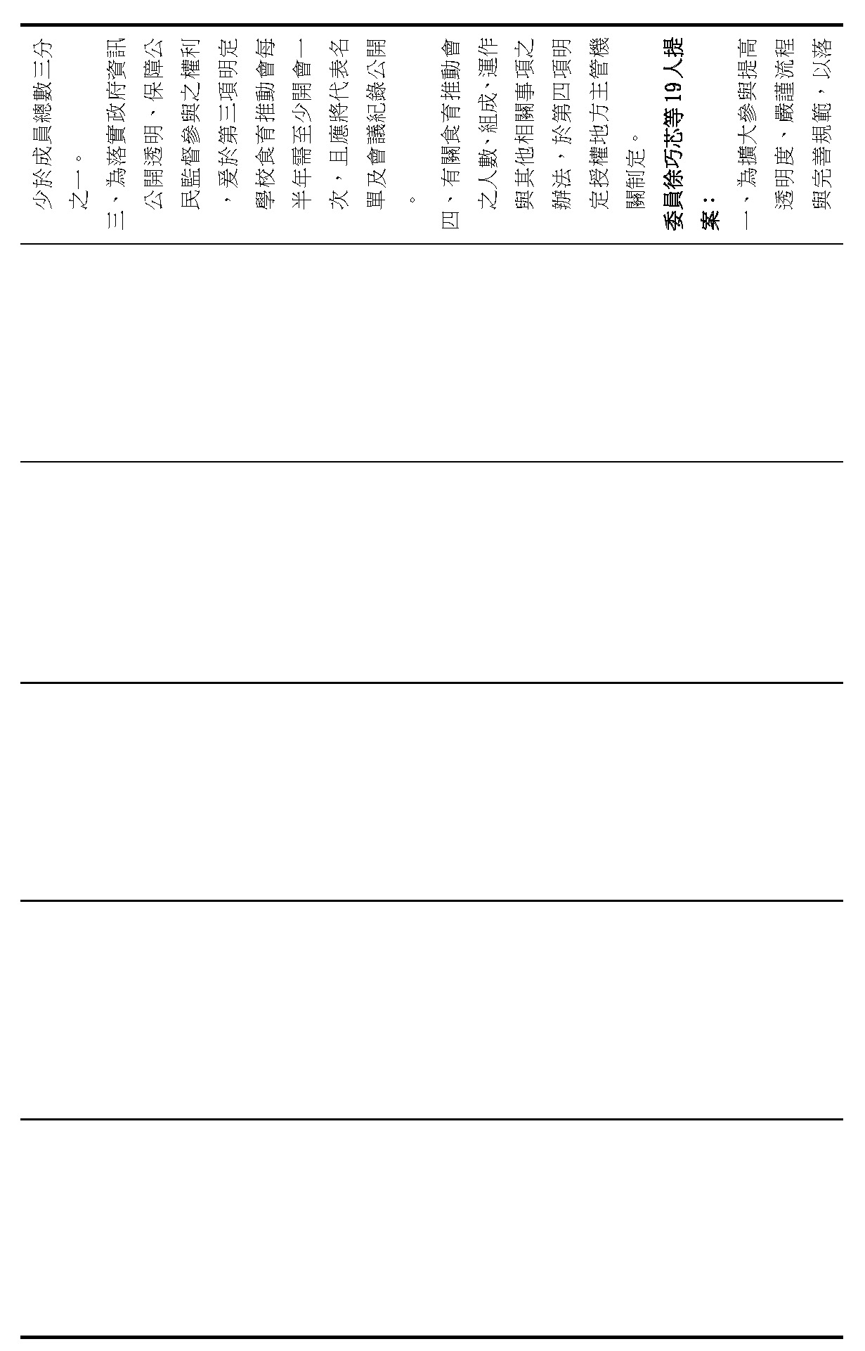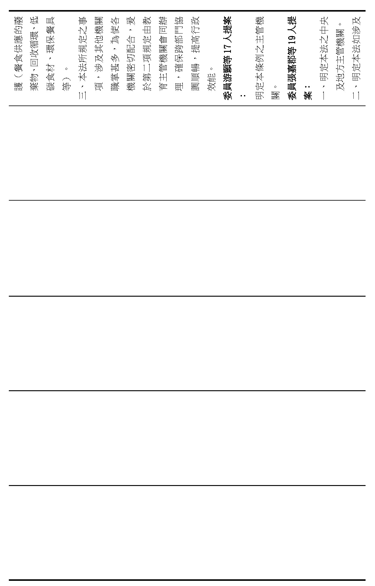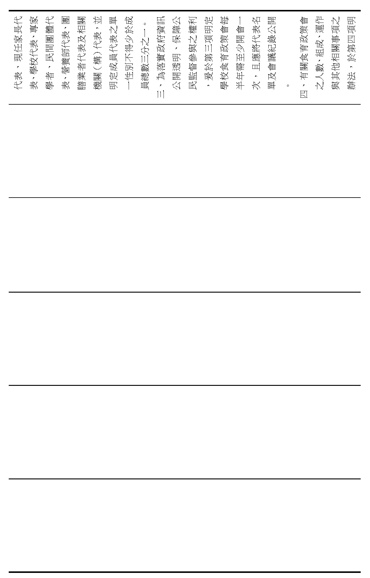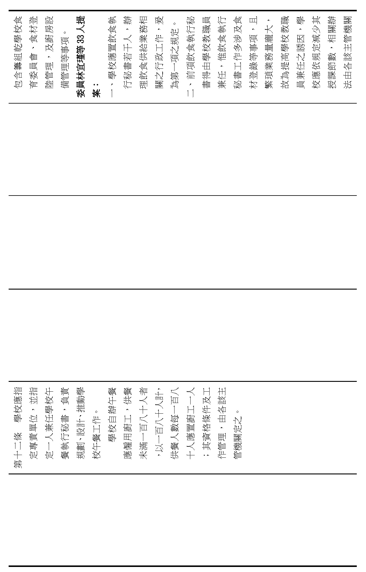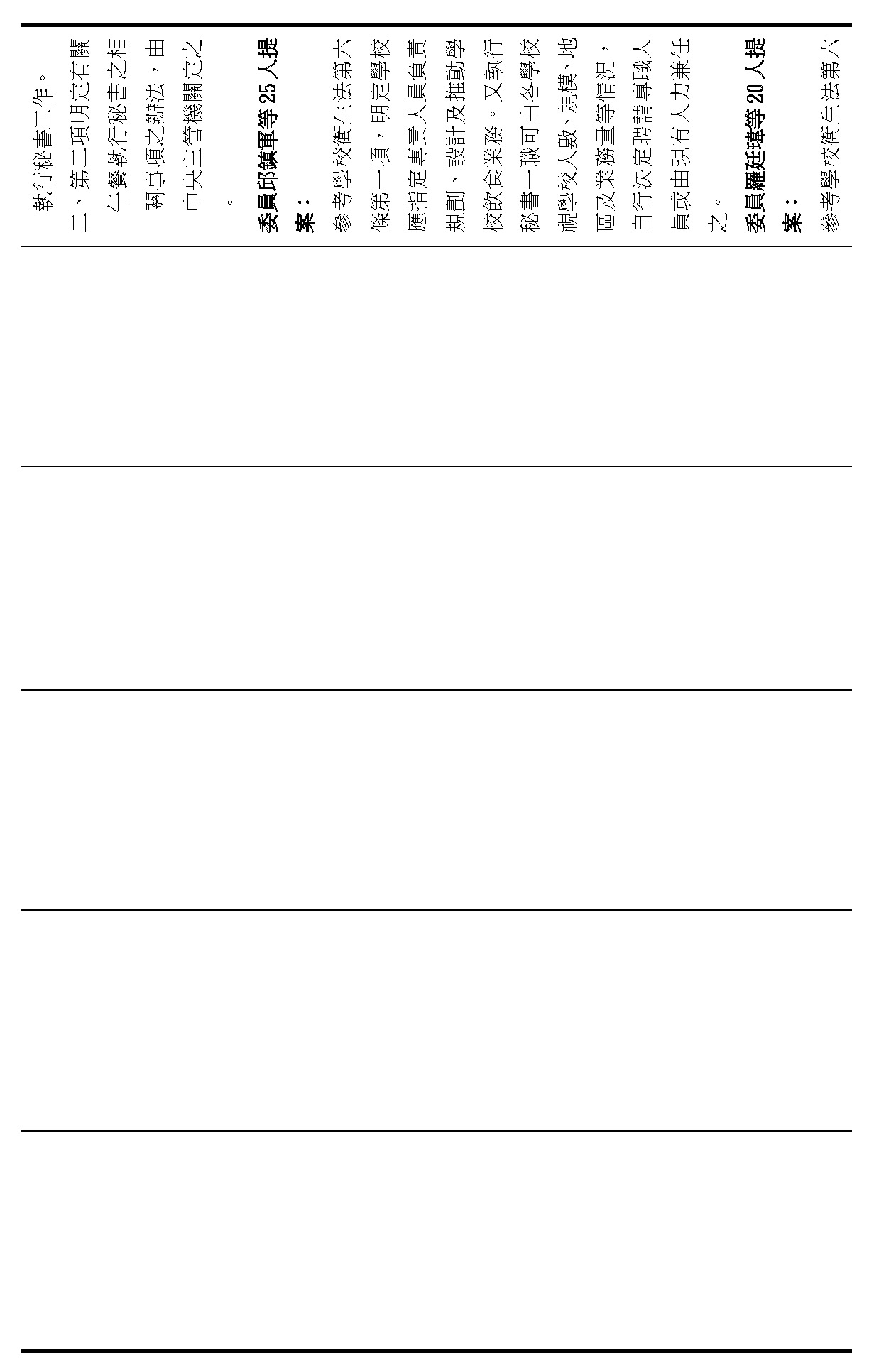 委員如果有臨時提案,請於上午10時30分前提出,處理提案時,若提案委員及連署委員均不在場,援例不予處理。現在審查學校供餐法草案相關草案,進行逐條審查,並進行……