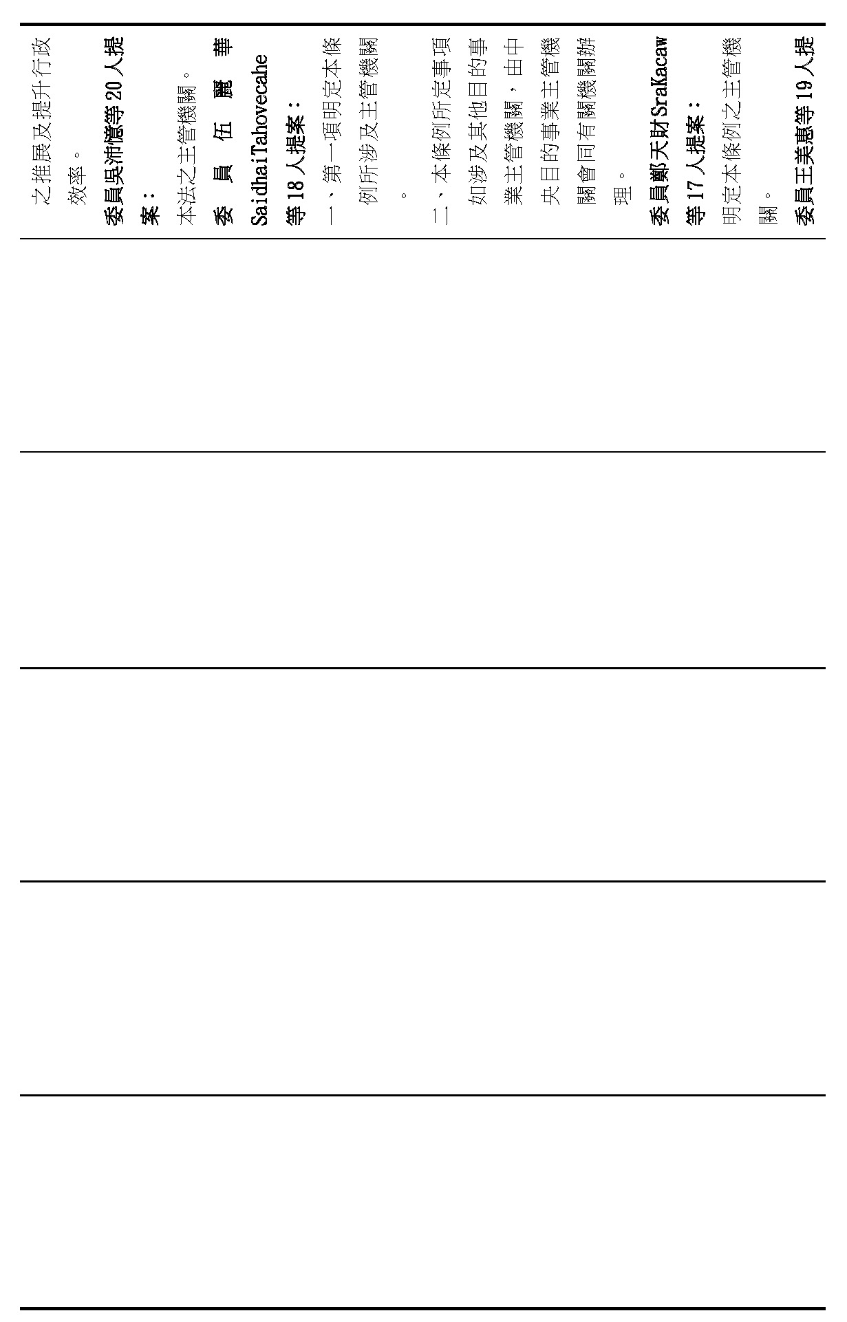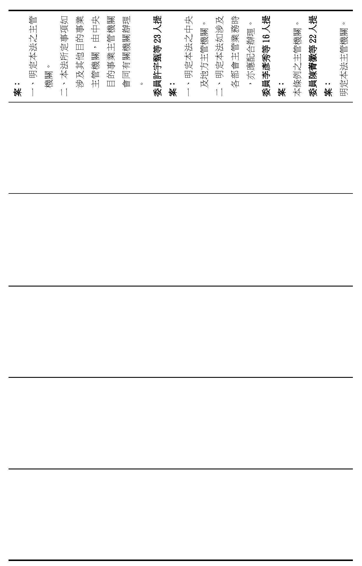各位委員,我們現在就進入逐條討論,委員會這邊有提供像這樣子上、下冊的條文對照表,是從民眾黨立院黨團的提案放在第一個的這個叫做基準表。
