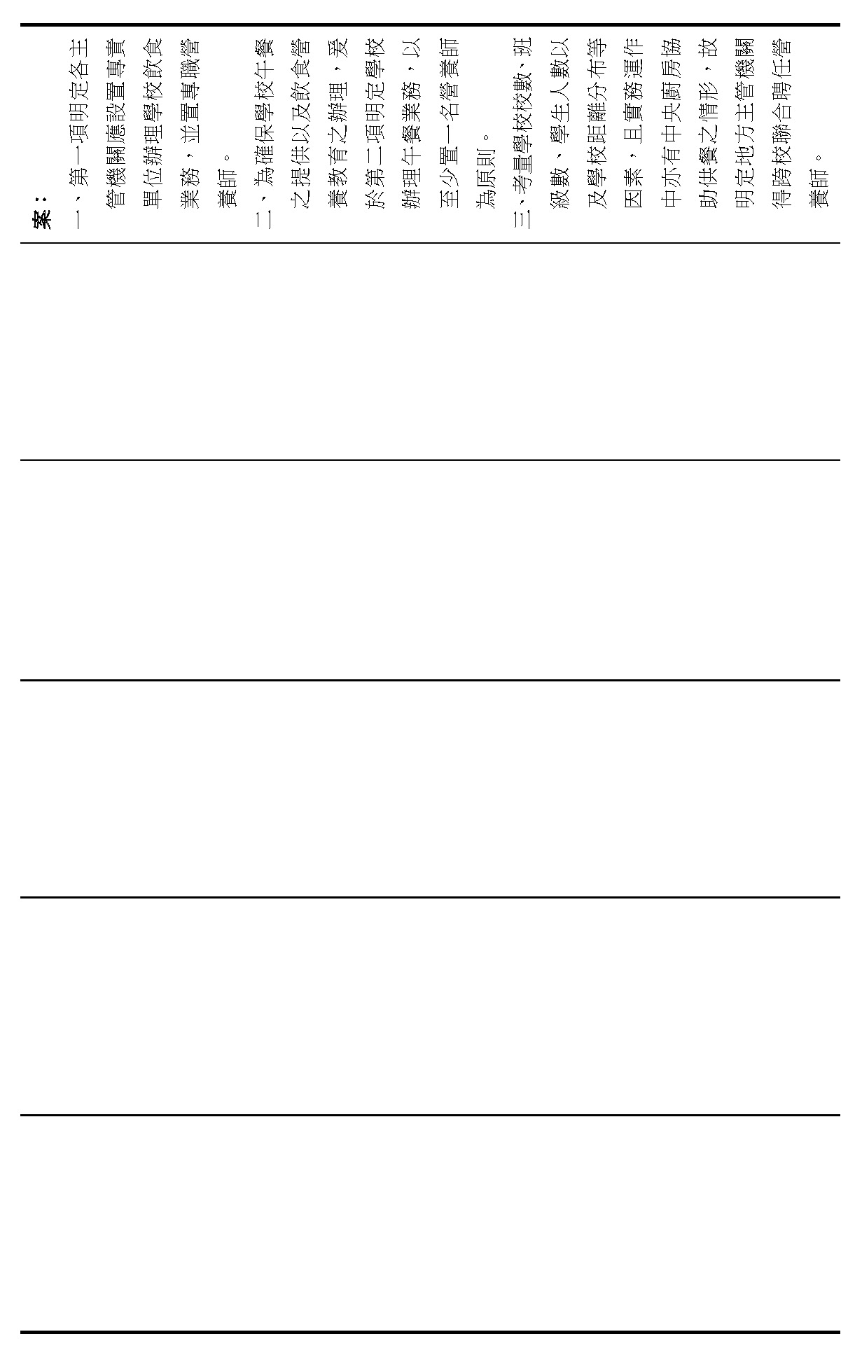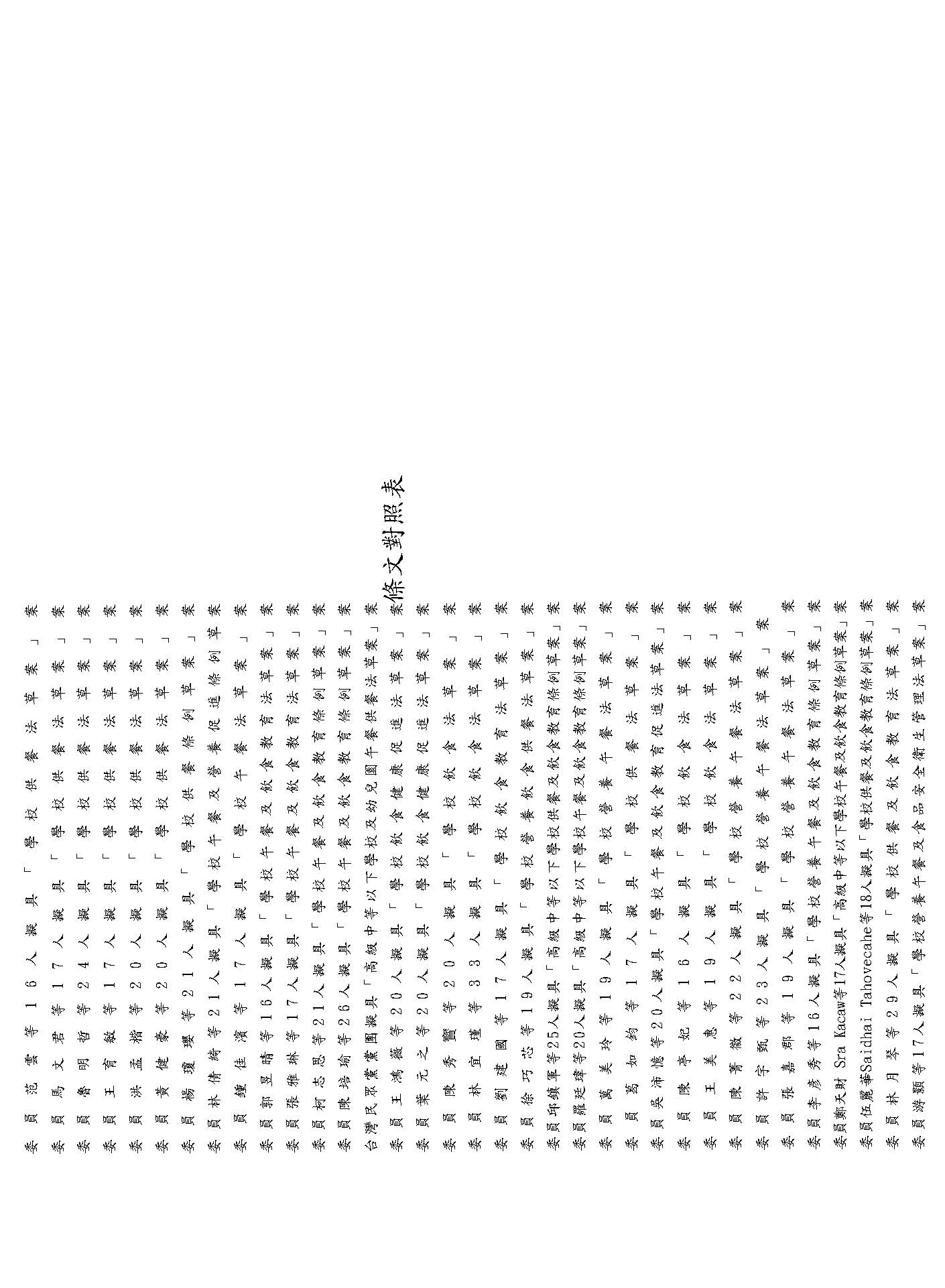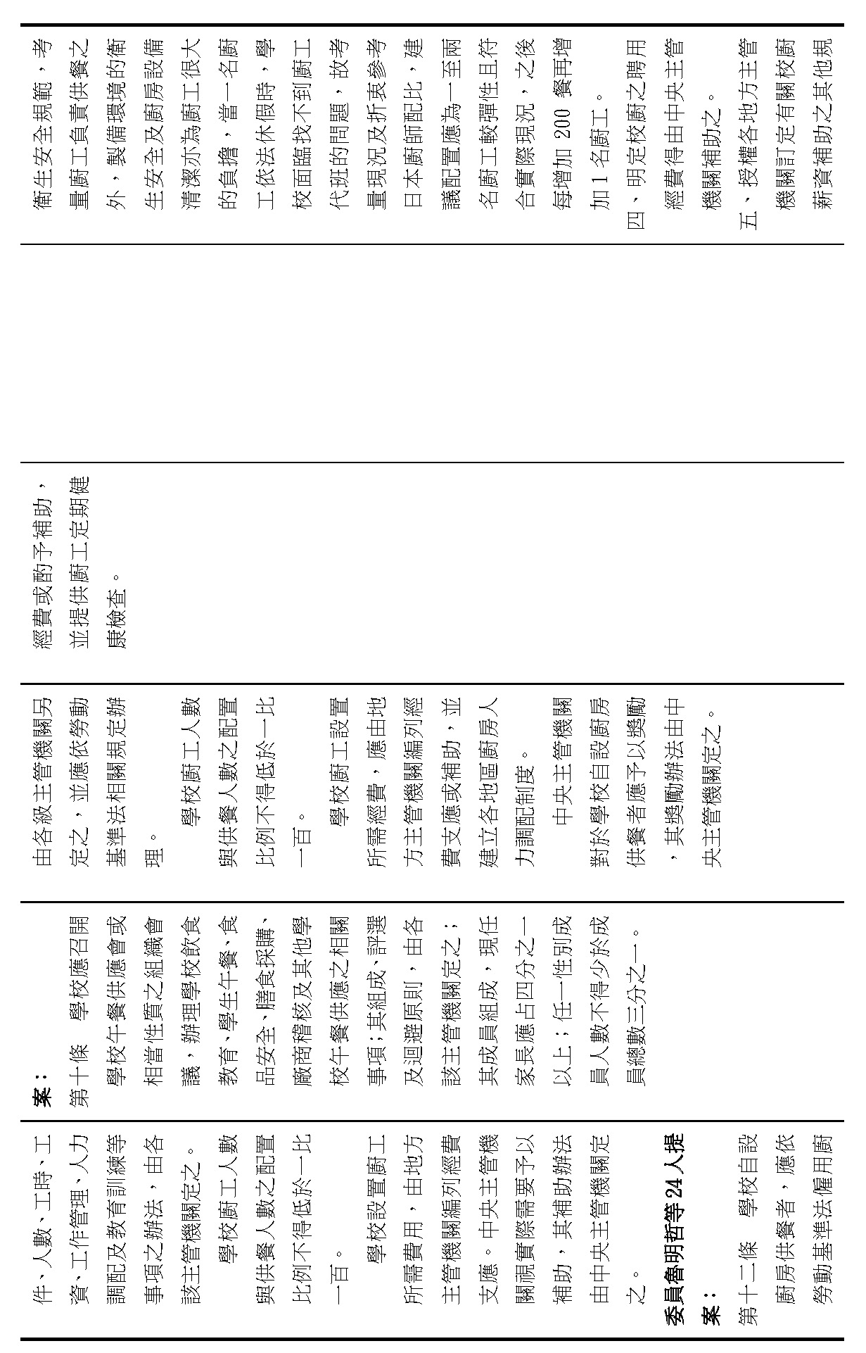 劉委員書彬:主席、各位出席的委員跟官員,大家好。本院台灣民眾黨黨團鑑於臺灣對於學校飲食相關規定鬆散,或由各部會及地方縣市政府自行訂定,多頭馬車、權責不清,且現行規範多為原則性的文字,不易確實執行,無法保障學生權益,為校園飲食安全把關,建立營養、食農教育及完善的校園供餐體系,實踐聯合國永續發展目標與人道經濟之進步價值,以促進學生健康飲食及健全學生身心發展,爰擬具「高級中等以下學校及幼兒園午餐供餐法草案」,敬請今天討論公決,謝謝。