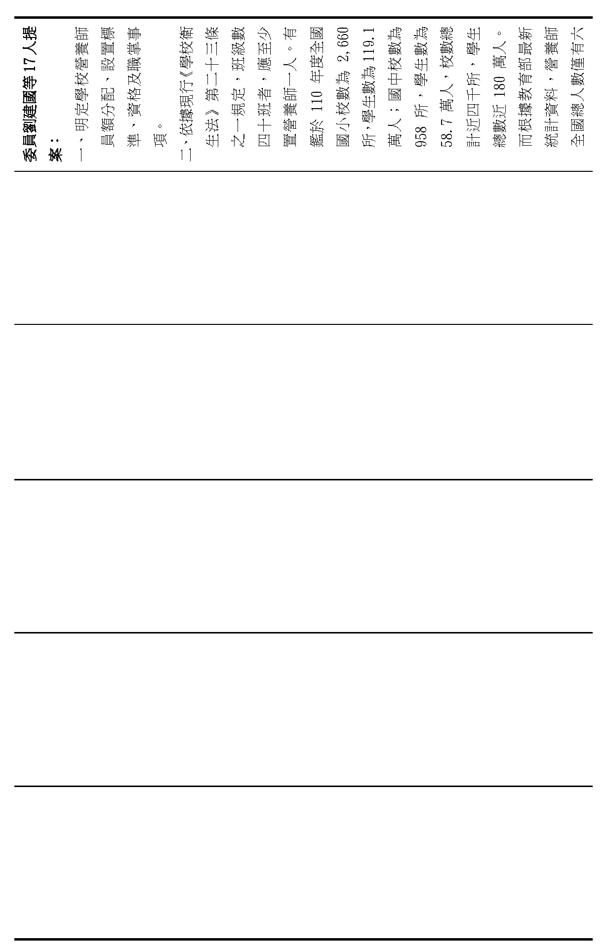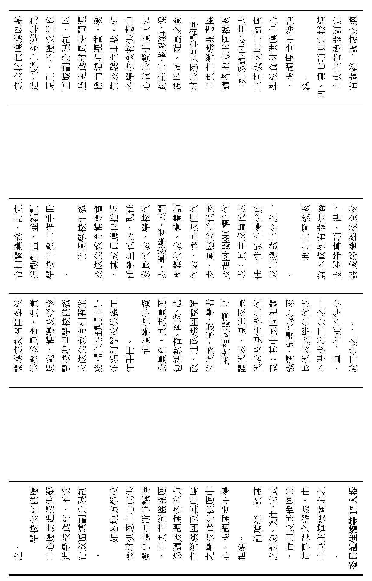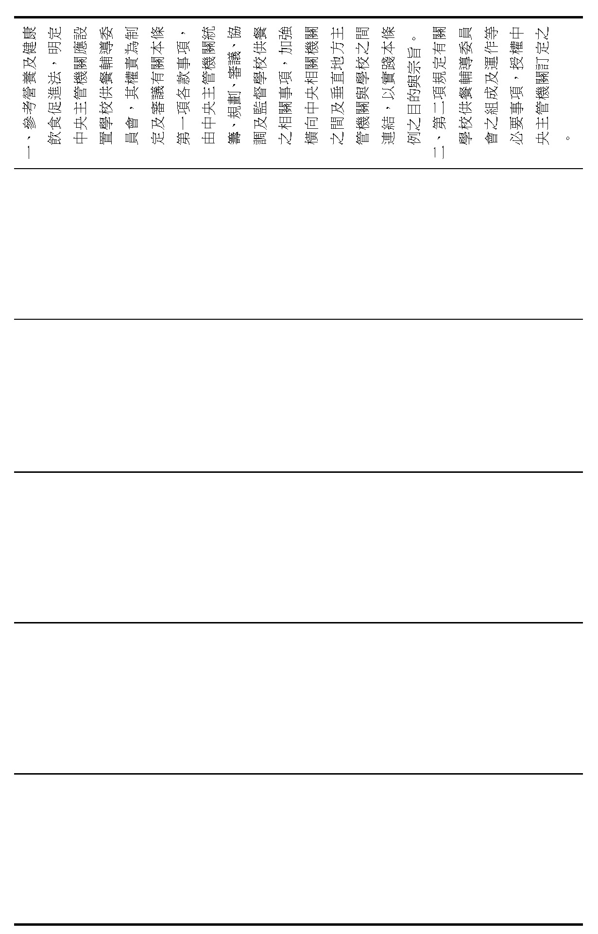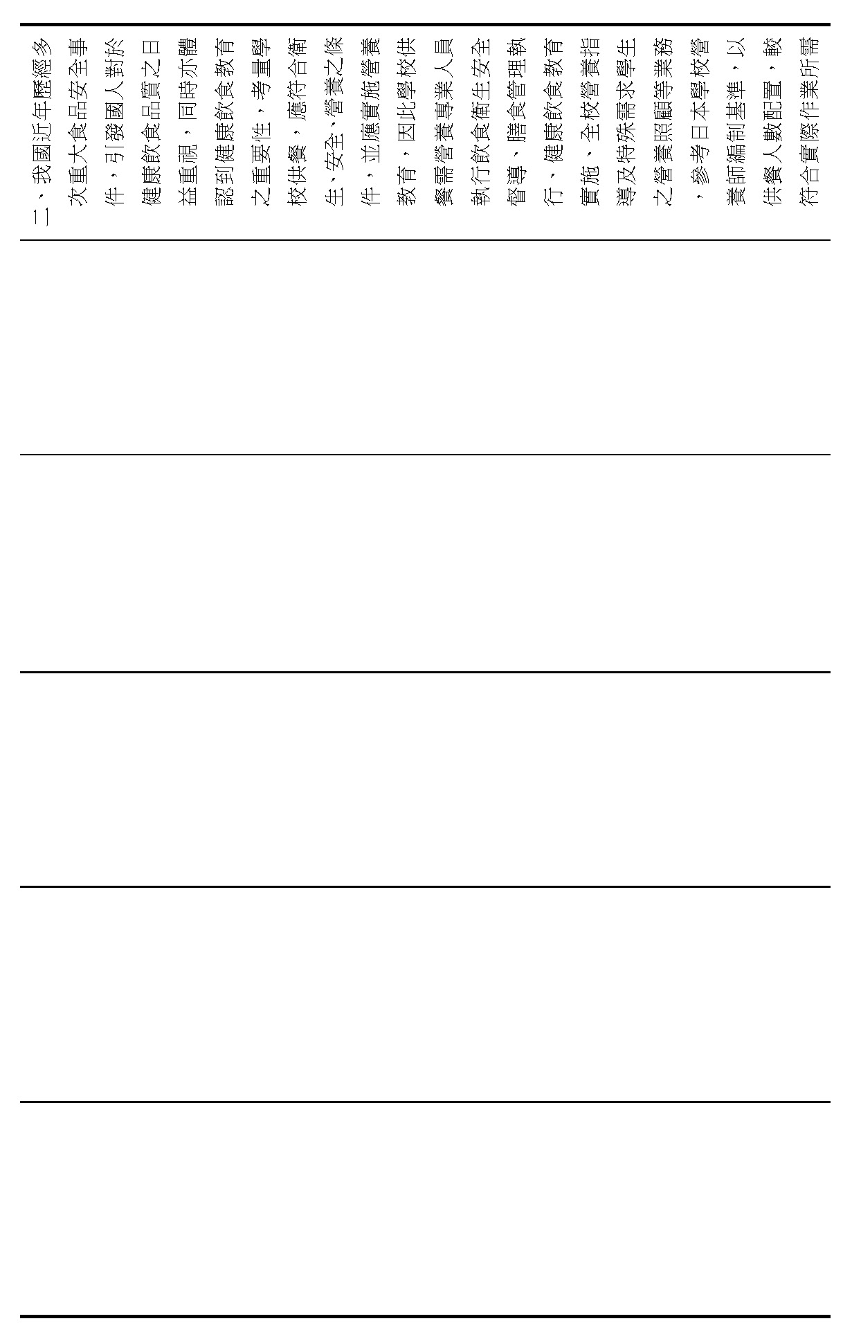 劉委員書彬:主席、各位出席的委員跟官員,大家好。本院台灣民眾黨黨團鑑於臺灣對於學校飲食相關規定鬆散,或由各部會及地方縣市政府自行訂定,多頭馬車、權責不清,且現行規範多為原則性的文字,不易確實執行,無法保障學生權益,為校園飲食安全把關,建立營養、食農教育及完善的校園供餐體系,實踐聯合國永續發展目標與人道經濟之進步價值,以促進學生健康飲食及健全學生身心發展,爰擬具「高級中等以下學校及幼兒園午餐供餐法草案」,敬請今天討論公決,謝謝。