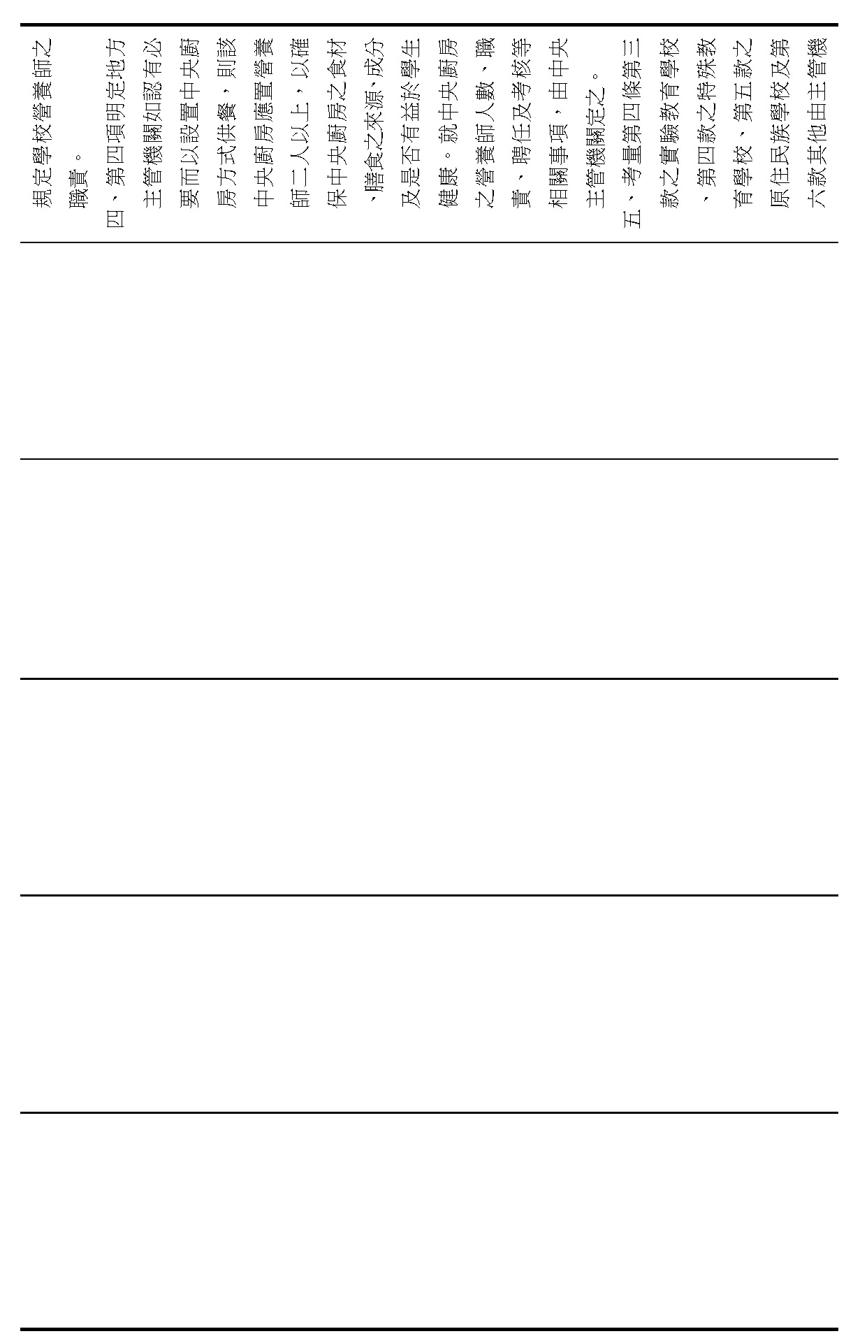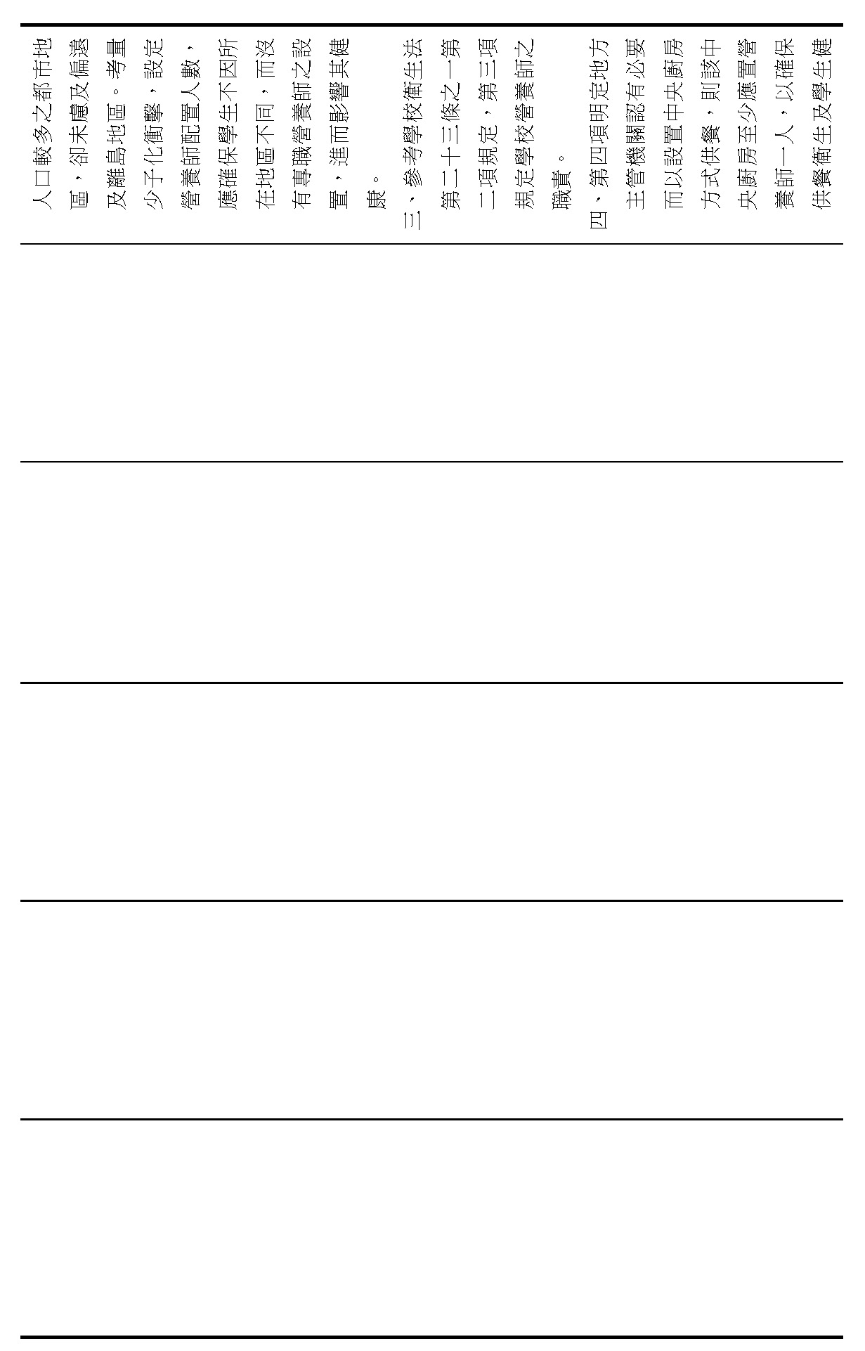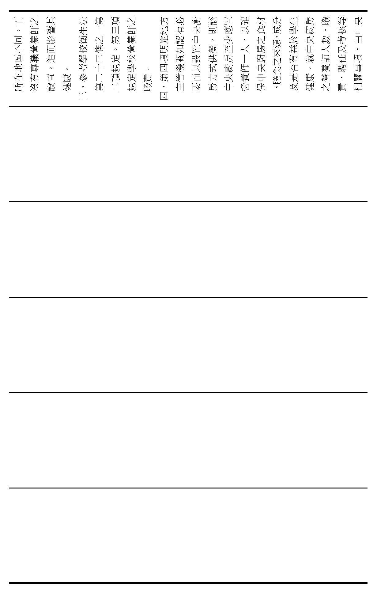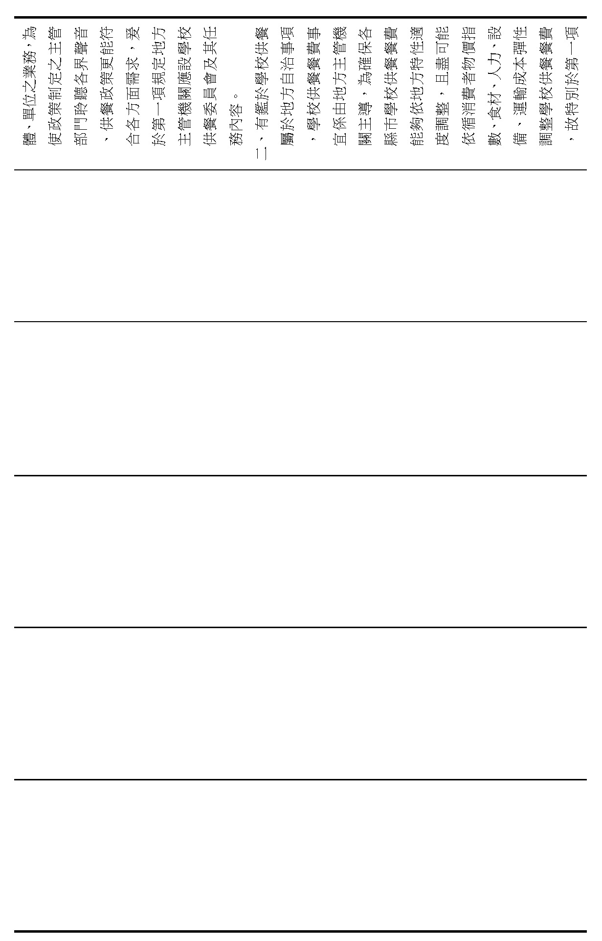 學校飲食需要針對不同的地區及學校教育的狀況來訂定及考量,本次的午餐專法有很多地方需要中央教育部跟地方討論的事項,目前並沒有很完整、充分地討論,所以希望可以讓教育部跟地方政府有完全溝通、完善溝通的時間跟機會,取得了共識之後,我們再來討論。以上,謝謝。