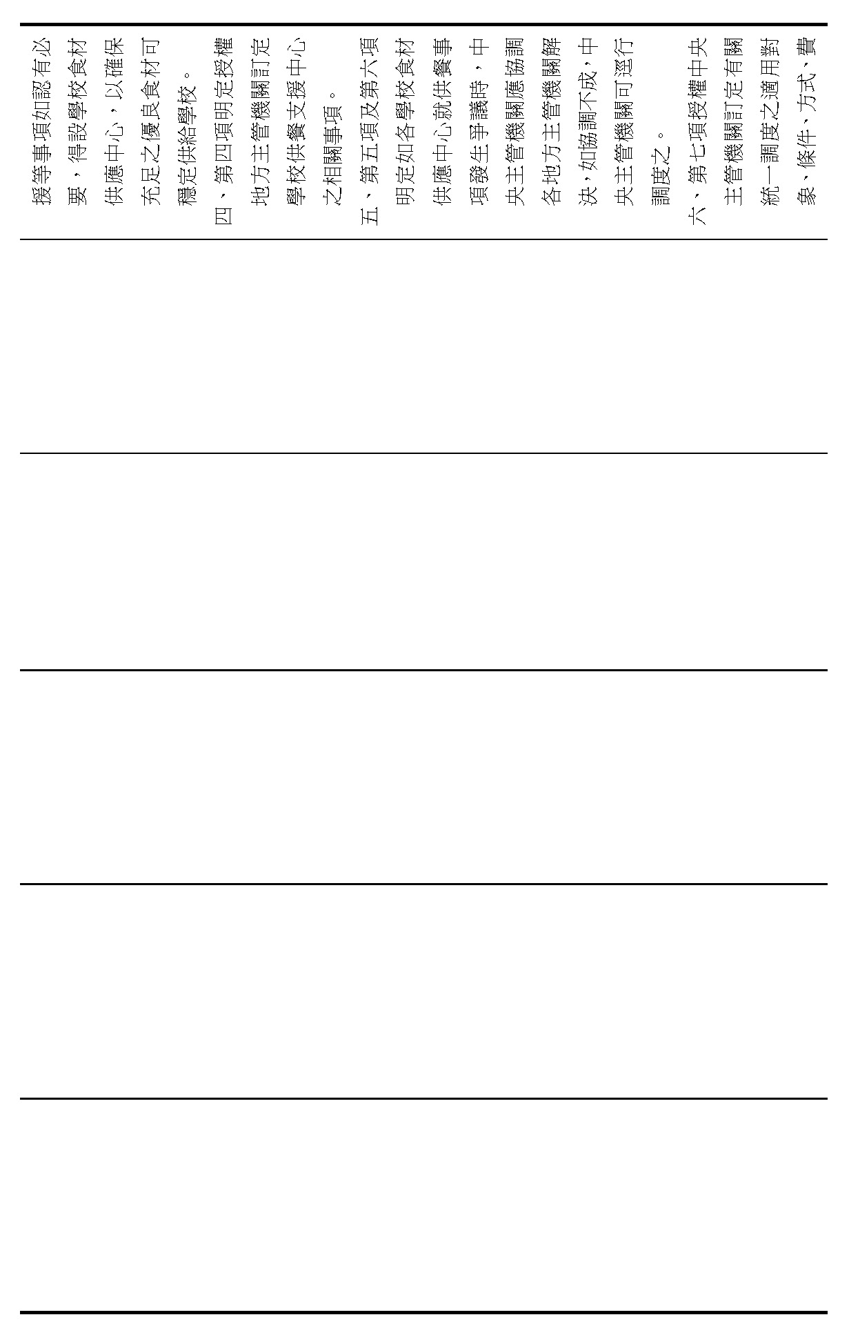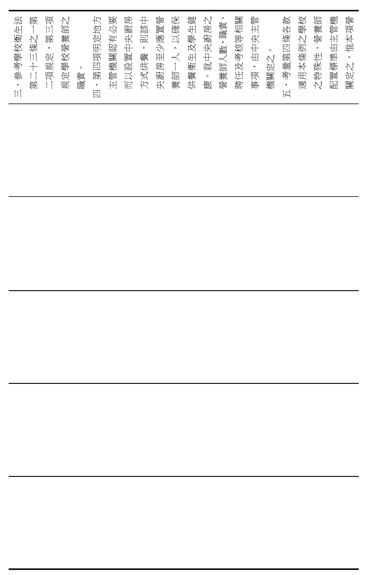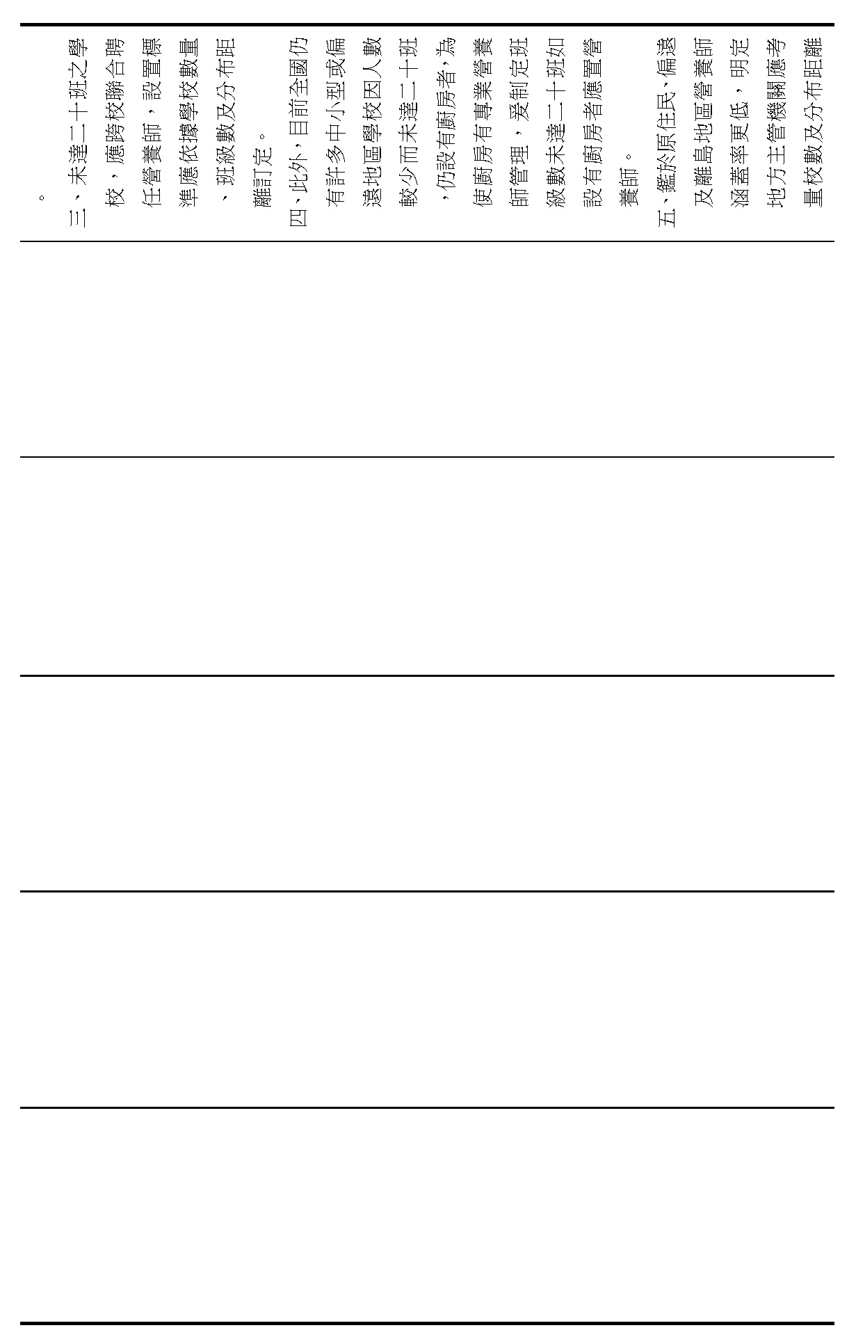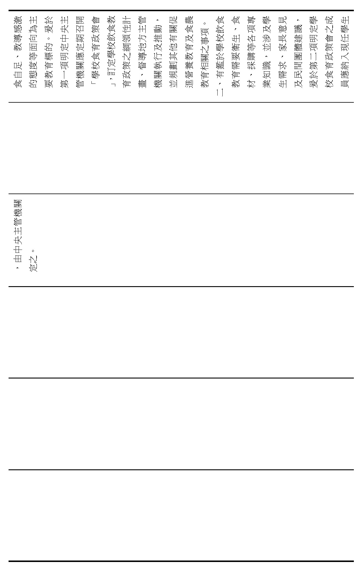學校飲食需要針對不同的地區及學校教育的狀況來訂定及考量,本次的午餐專法有很多地方需要中央教育部跟地方討論的事項,目前並沒有很完整、充分地討論,所以希望可以讓教育部跟地方政府有完全溝通、完善溝通的時間跟機會,取得了共識之後,我們再來討論。以上,謝謝。