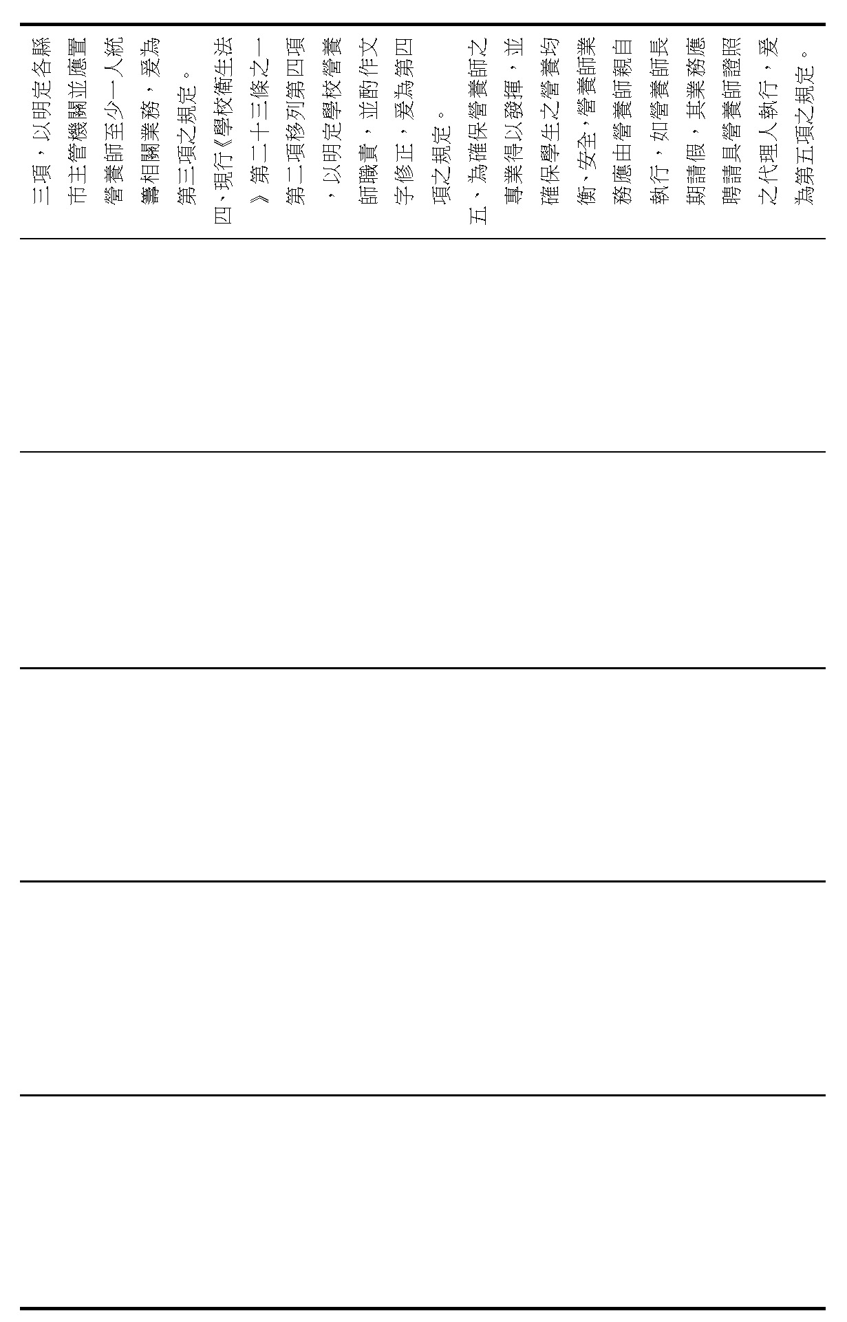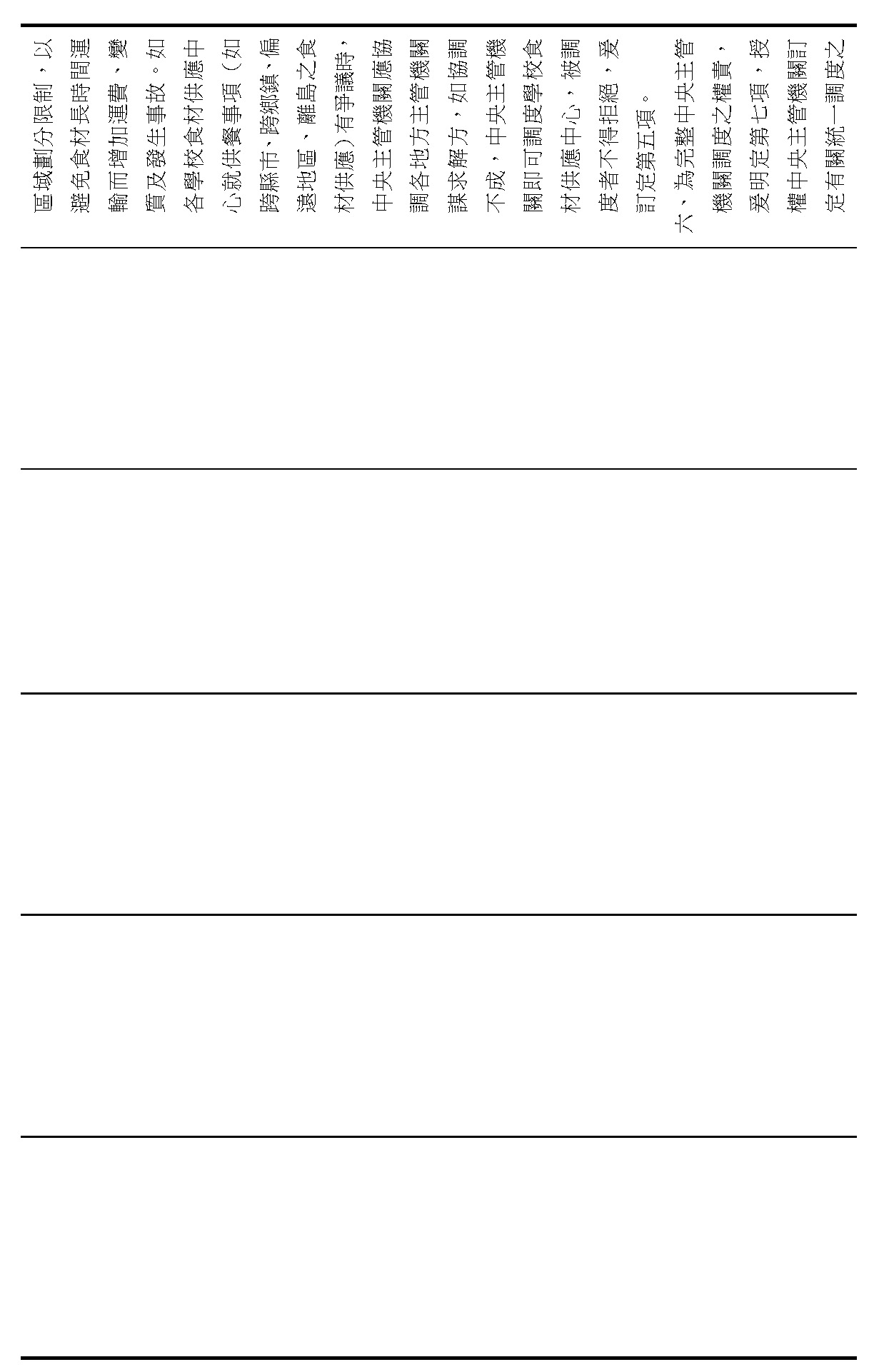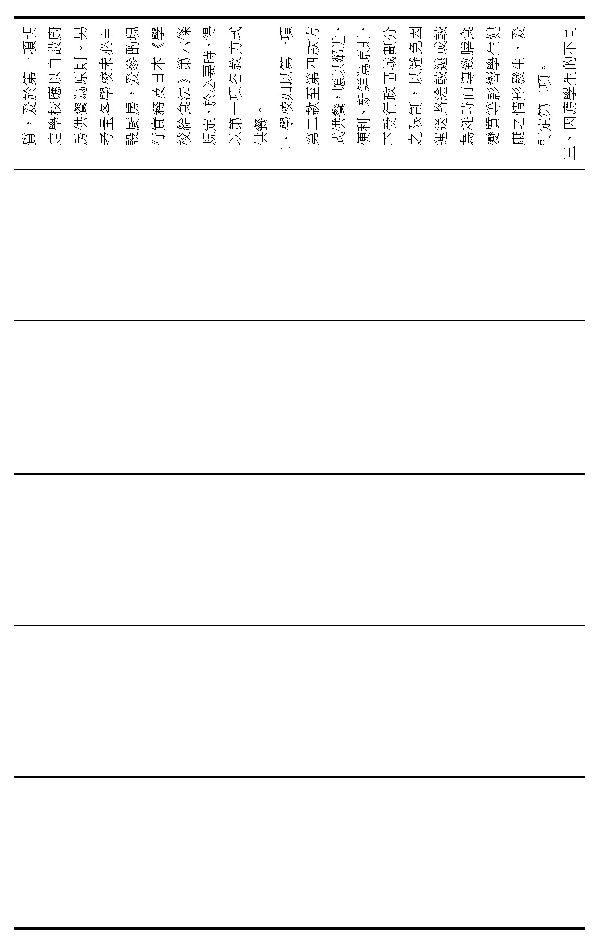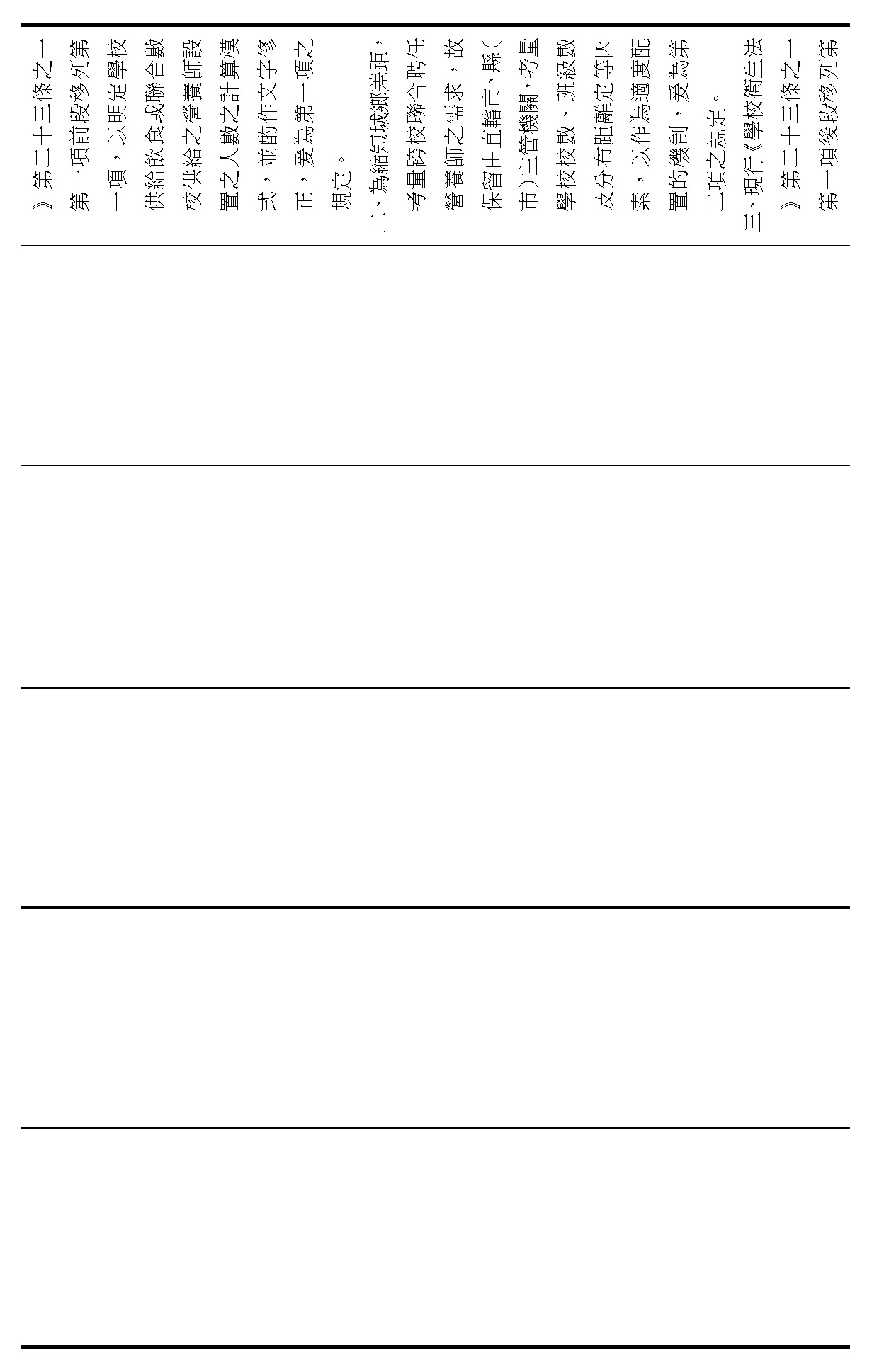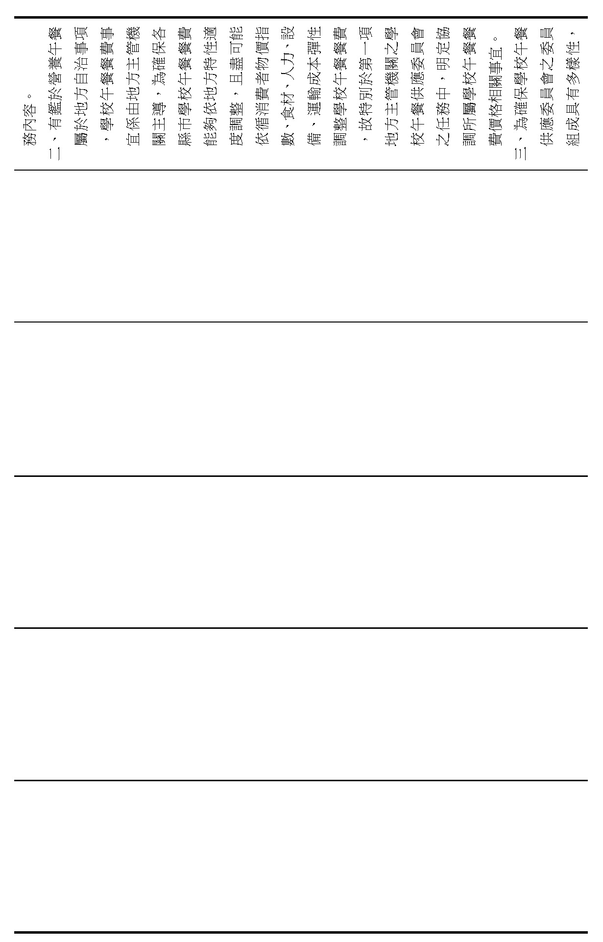 學校飲食需要針對不同的地區及學校教育的狀況來訂定及考量,本次的午餐專法有很多地方需要中央教育部跟地方討論的事項,目前並沒有很完整、充分地討論,所以希望可以讓教育部跟地方政府有完全溝通、完善溝通的時間跟機會,取得了共識之後,我們再來討論。以上,謝謝。