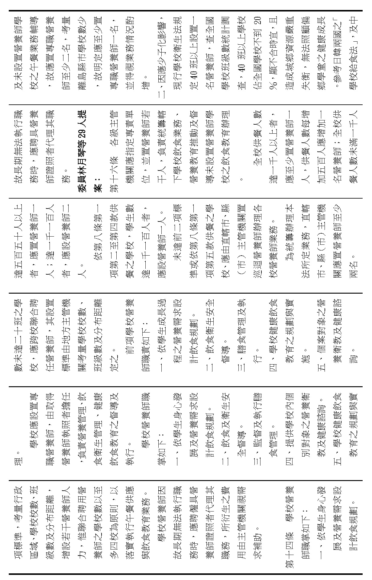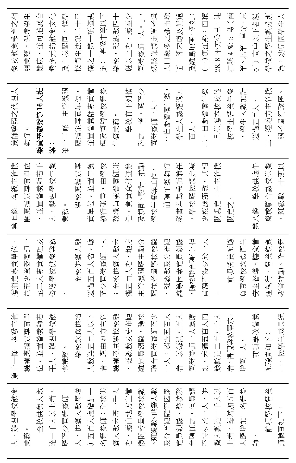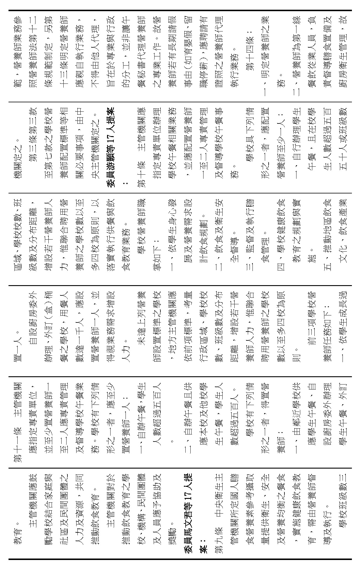 所以今天這個專法的立法其實就是要進一步的來討論我們營養午餐的改革其下一個階段應該要怎麼做,我自己也有提案版本,我大概看了一下,今天的版本非常多,大概有30到40個版本,因為我看了教育部的建議文字,其實很多也相當的具體,例如我自己版本第十三條,像營養師,我是支持學校學生的人數如果在五百五十人以上,而且是自辦營養午餐的話,那麼就要設置一名營養師,這個部分在教育部的建議文字裡面也有具體提出。