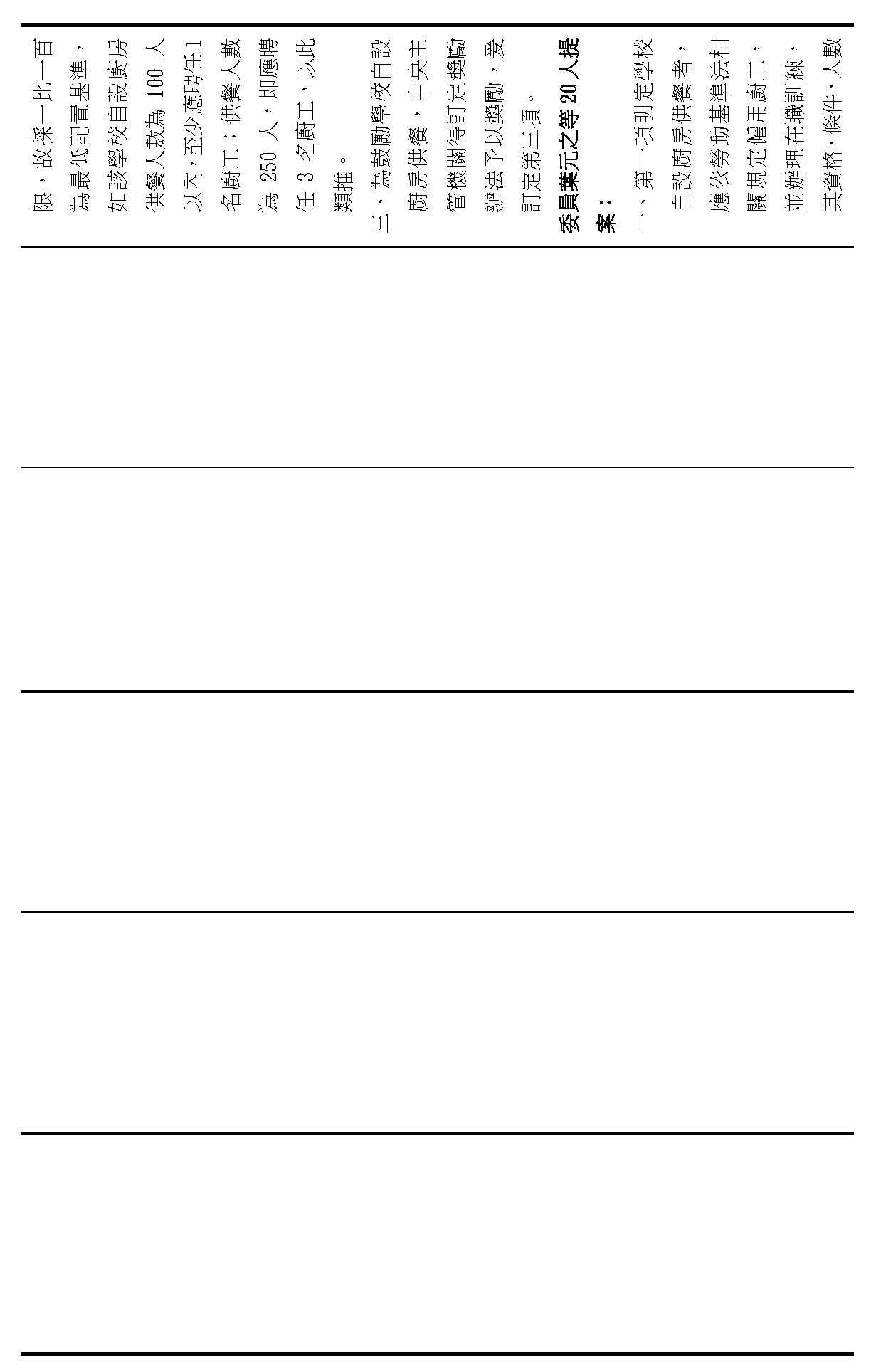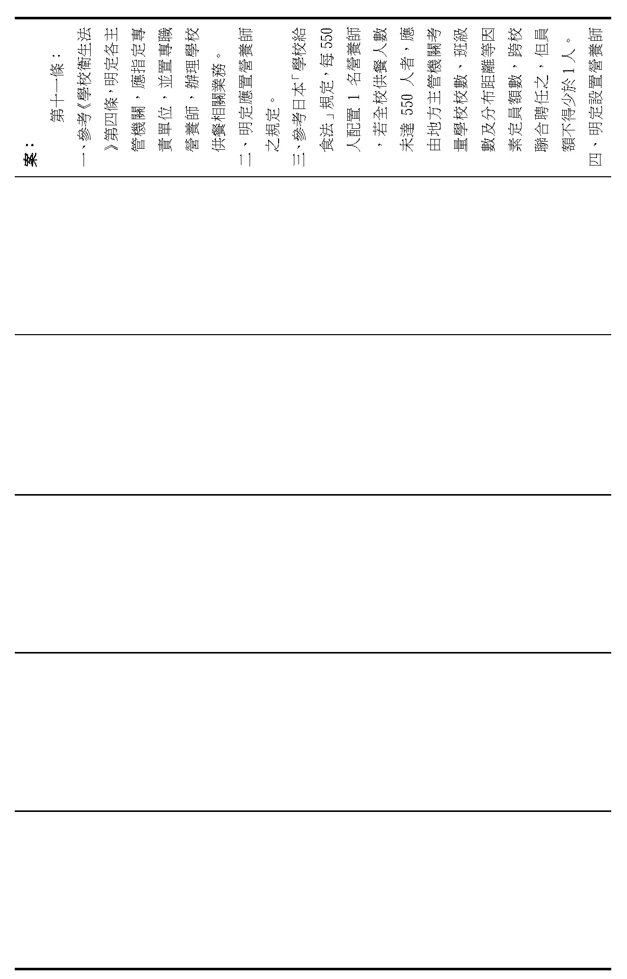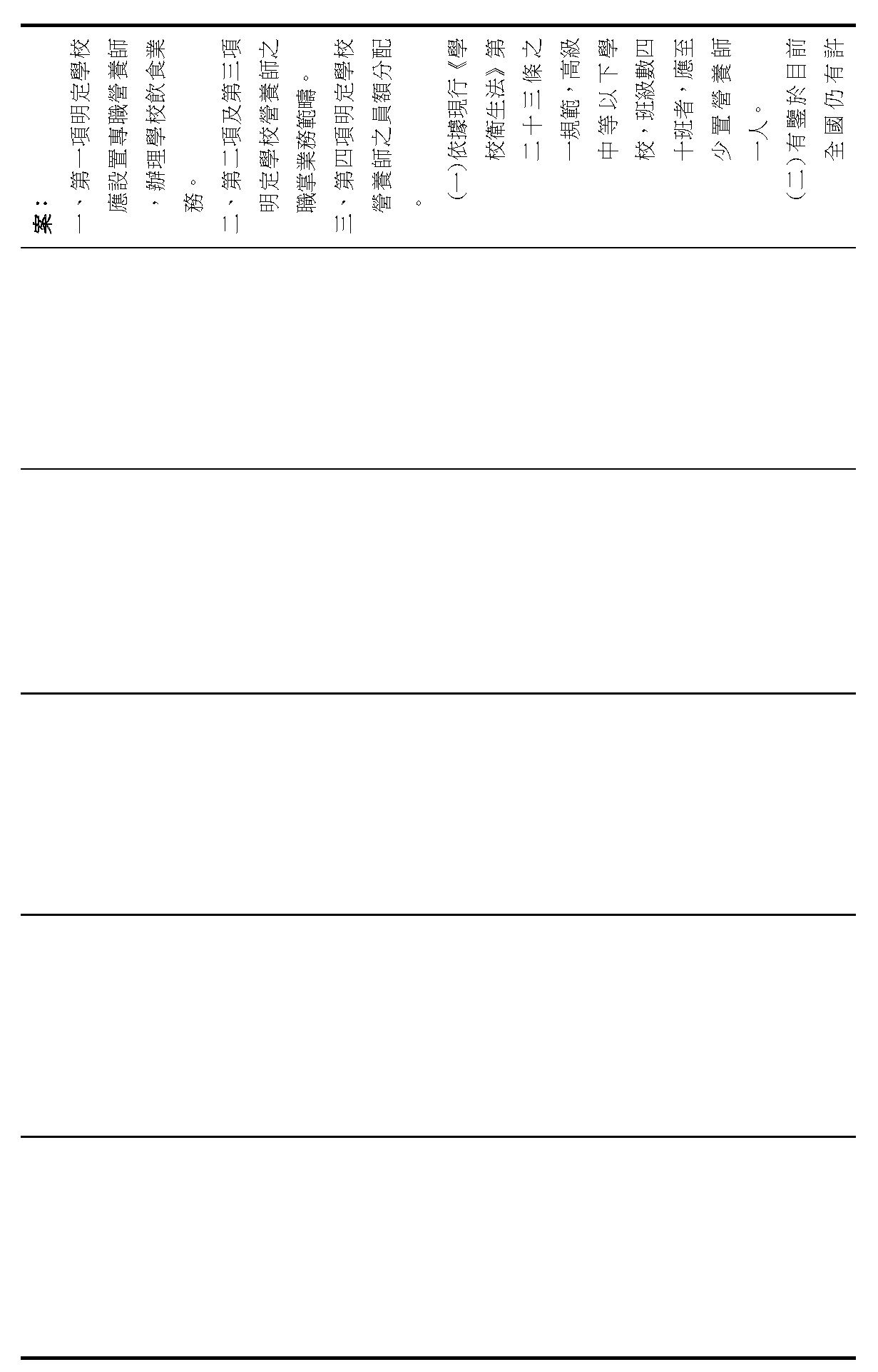 所以今天這個專法的立法其實就是要進一步的來討論我們營養午餐的改革其下一個階段應該要怎麼做,我自己也有提案版本,我大概看了一下,今天的版本非常多,大概有30到40個版本,因為我看了教育部的建議文字,其實很多也相當的具體,例如我自己版本第十三條,像營養師,我是支持學校學生的人數如果在五百五十人以上,而且是自辦營養午餐的話,那麼就要設置一名營養師,這個部分在教育部的建議文字裡面也有具體提出。