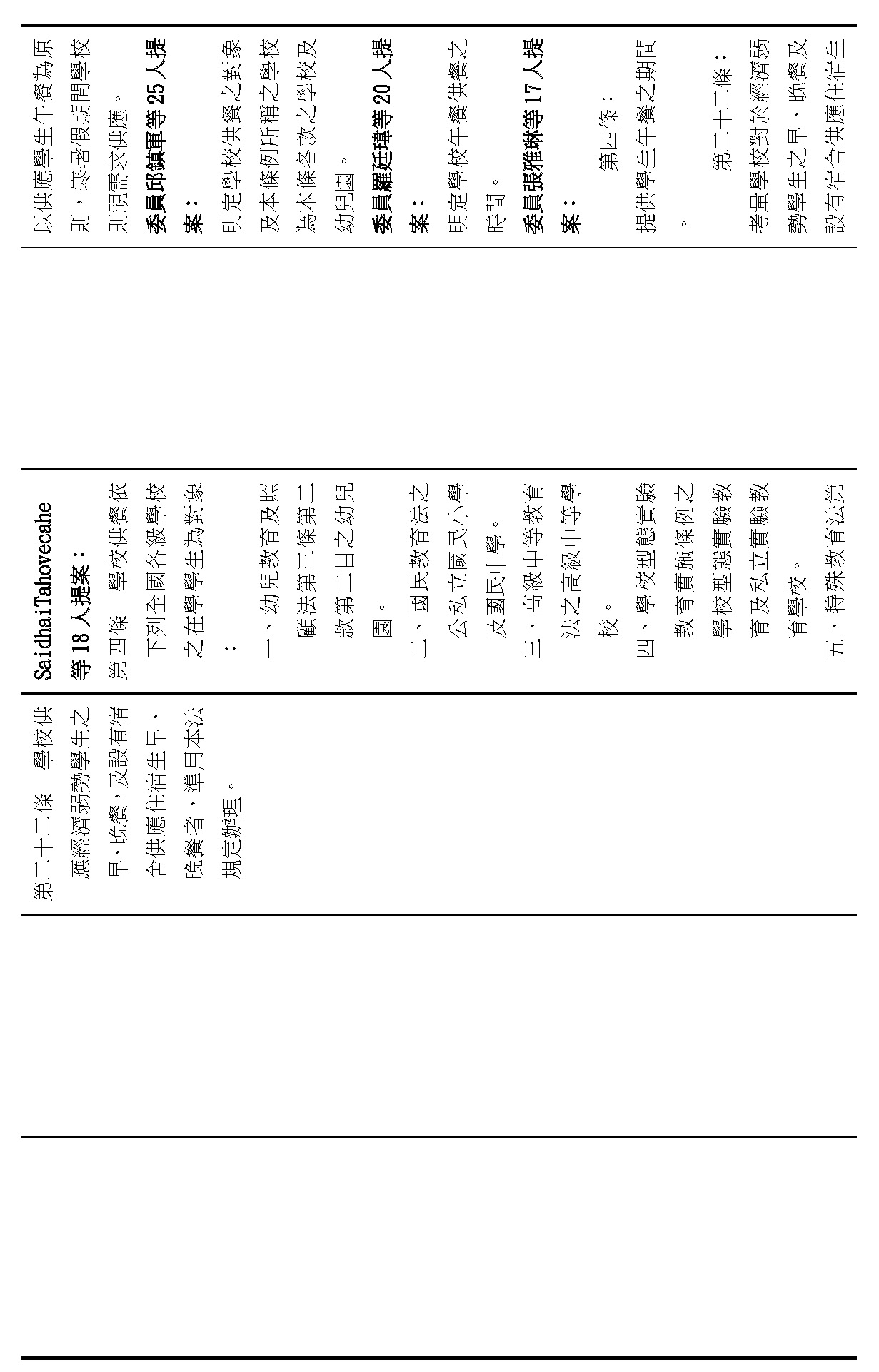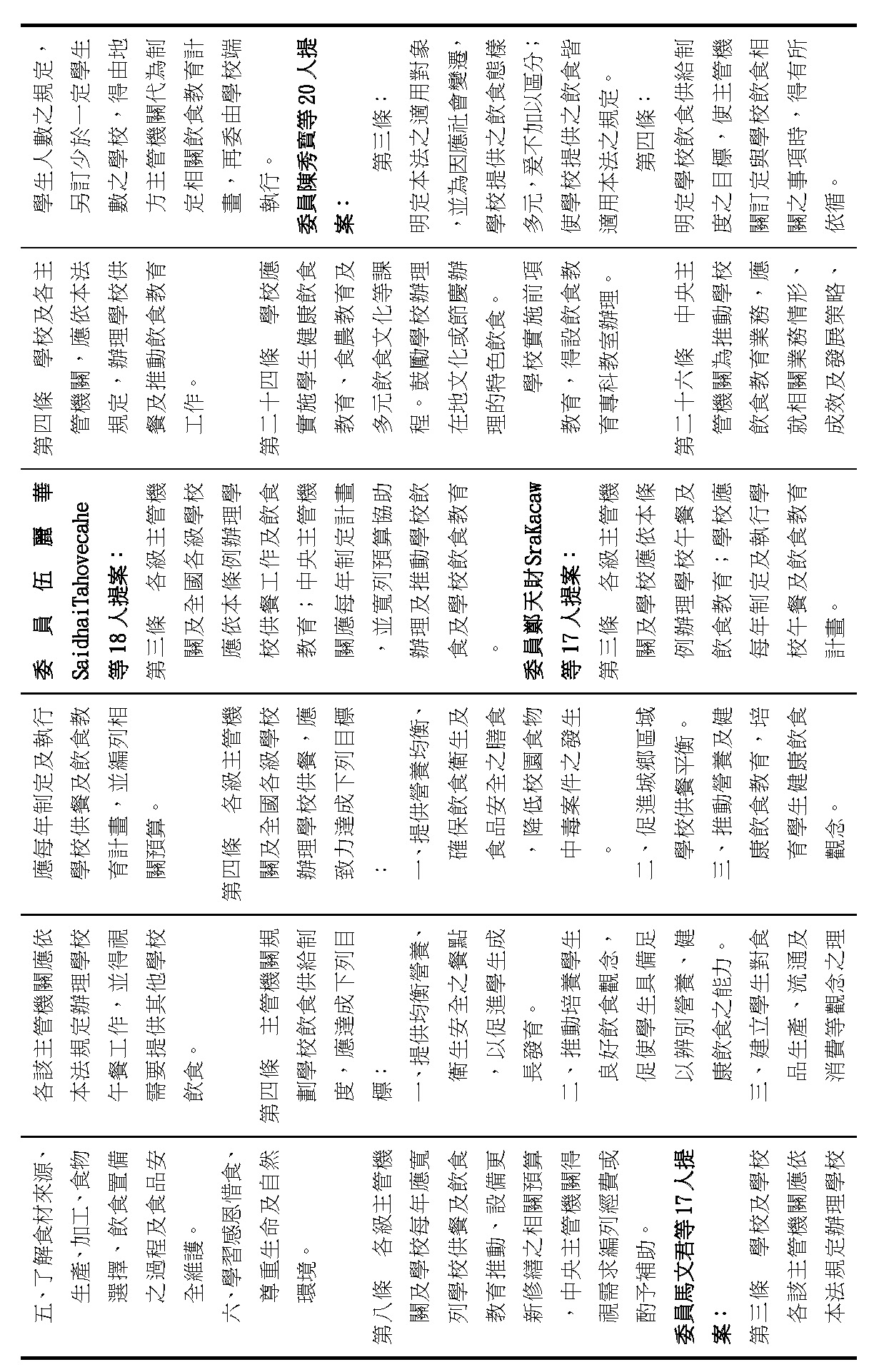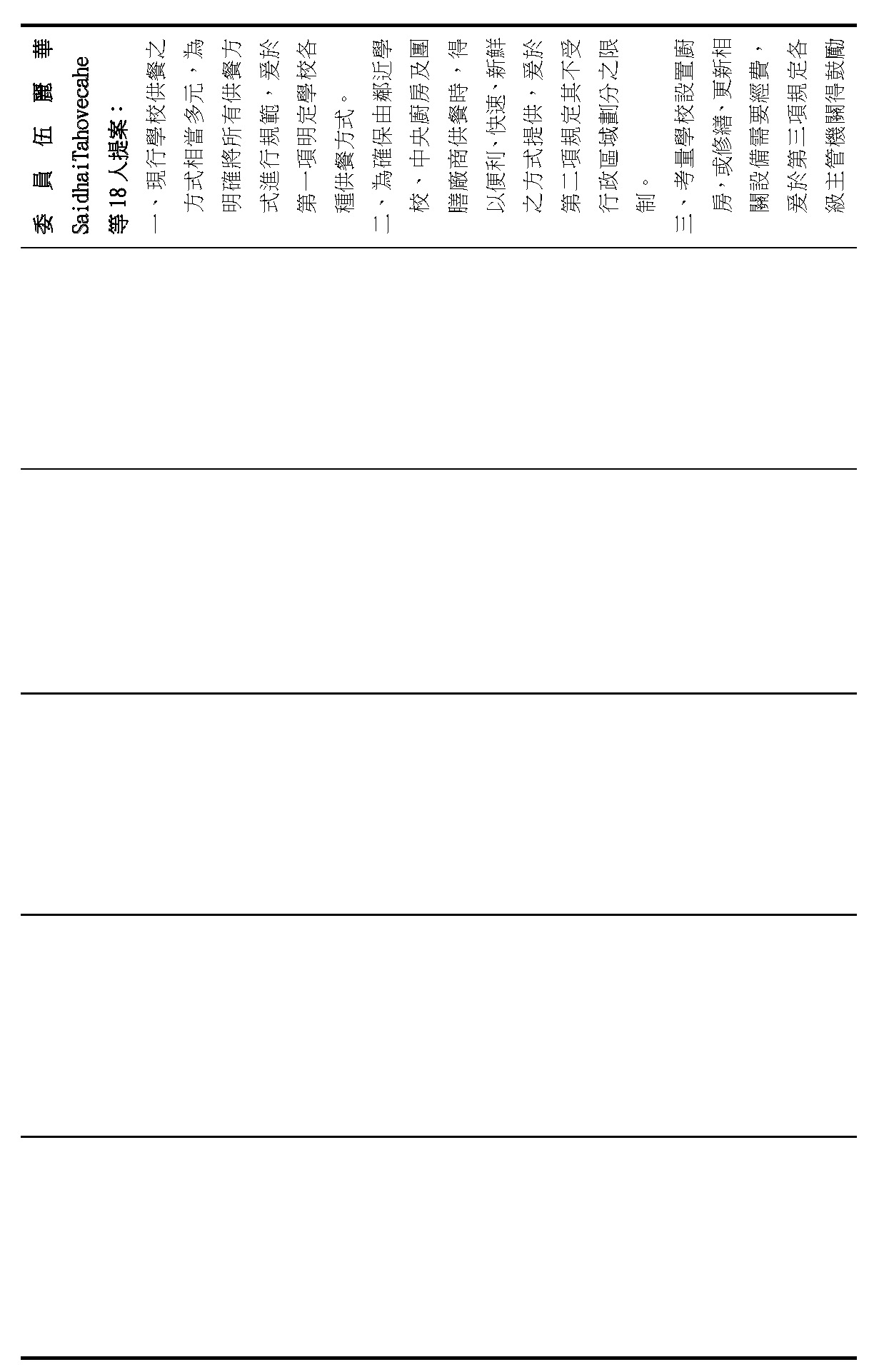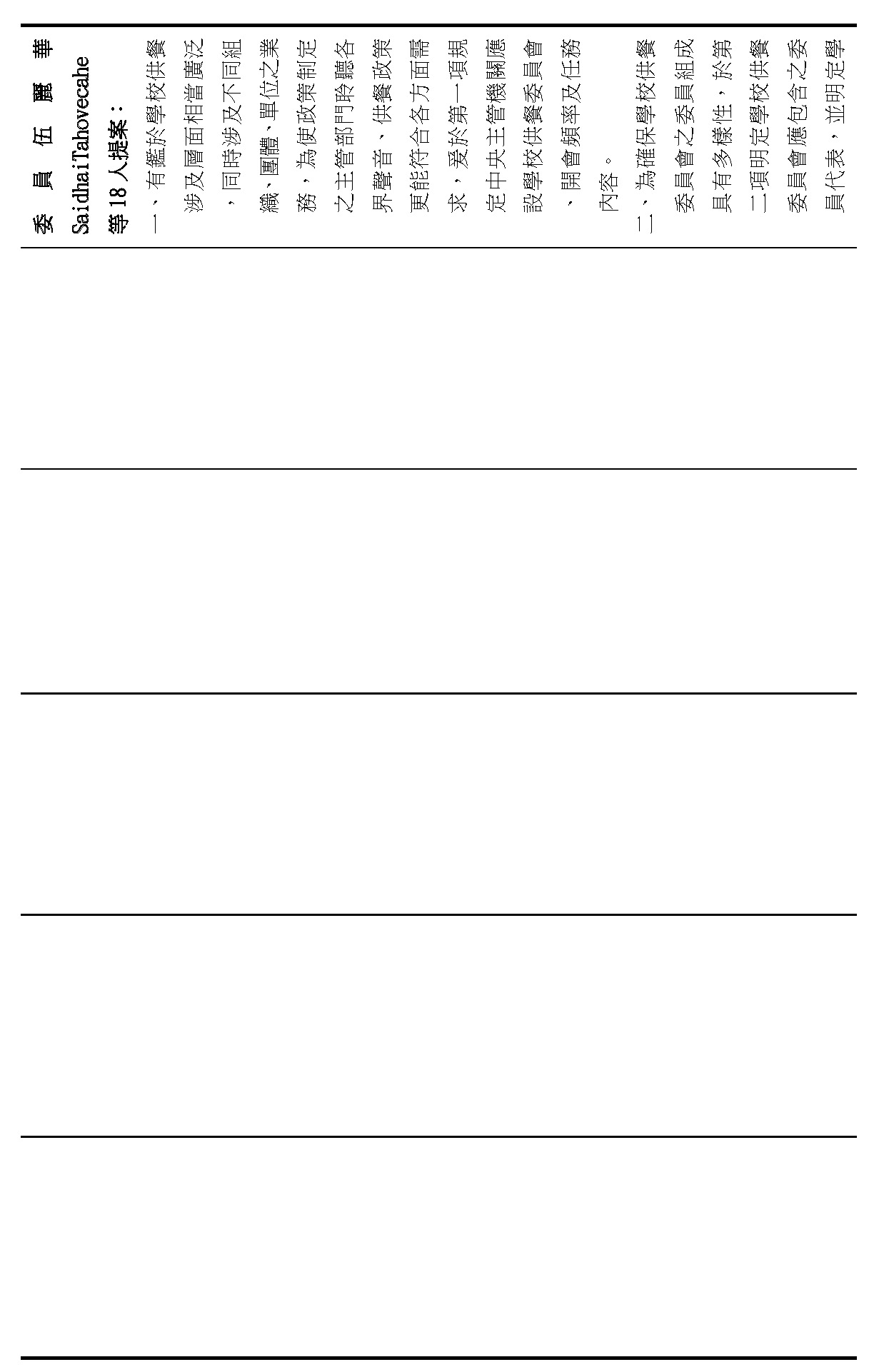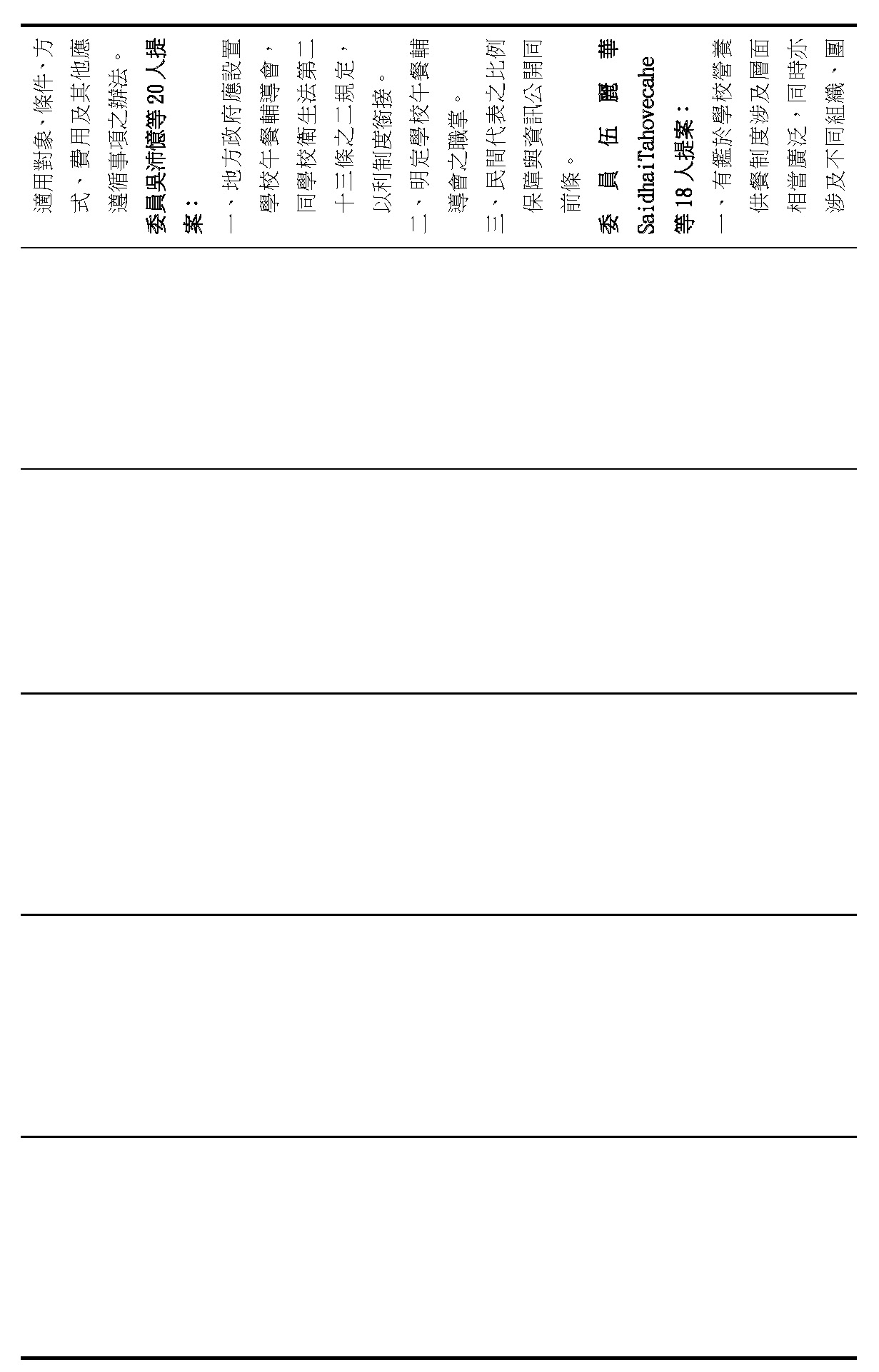 (十)委員伍麗華Saidhai Tahovecahe等18人擬具「學校供餐及飲食教育條例草案」案。