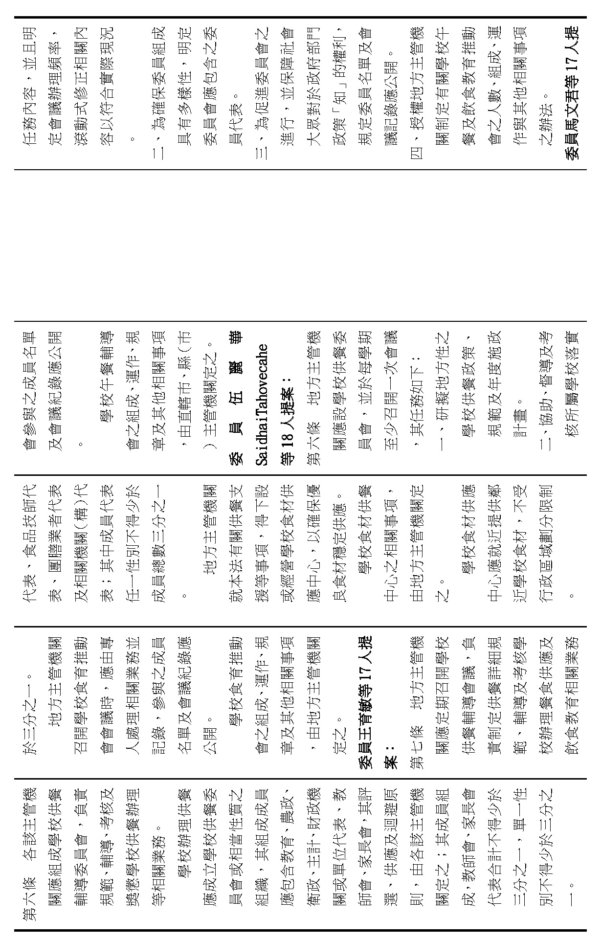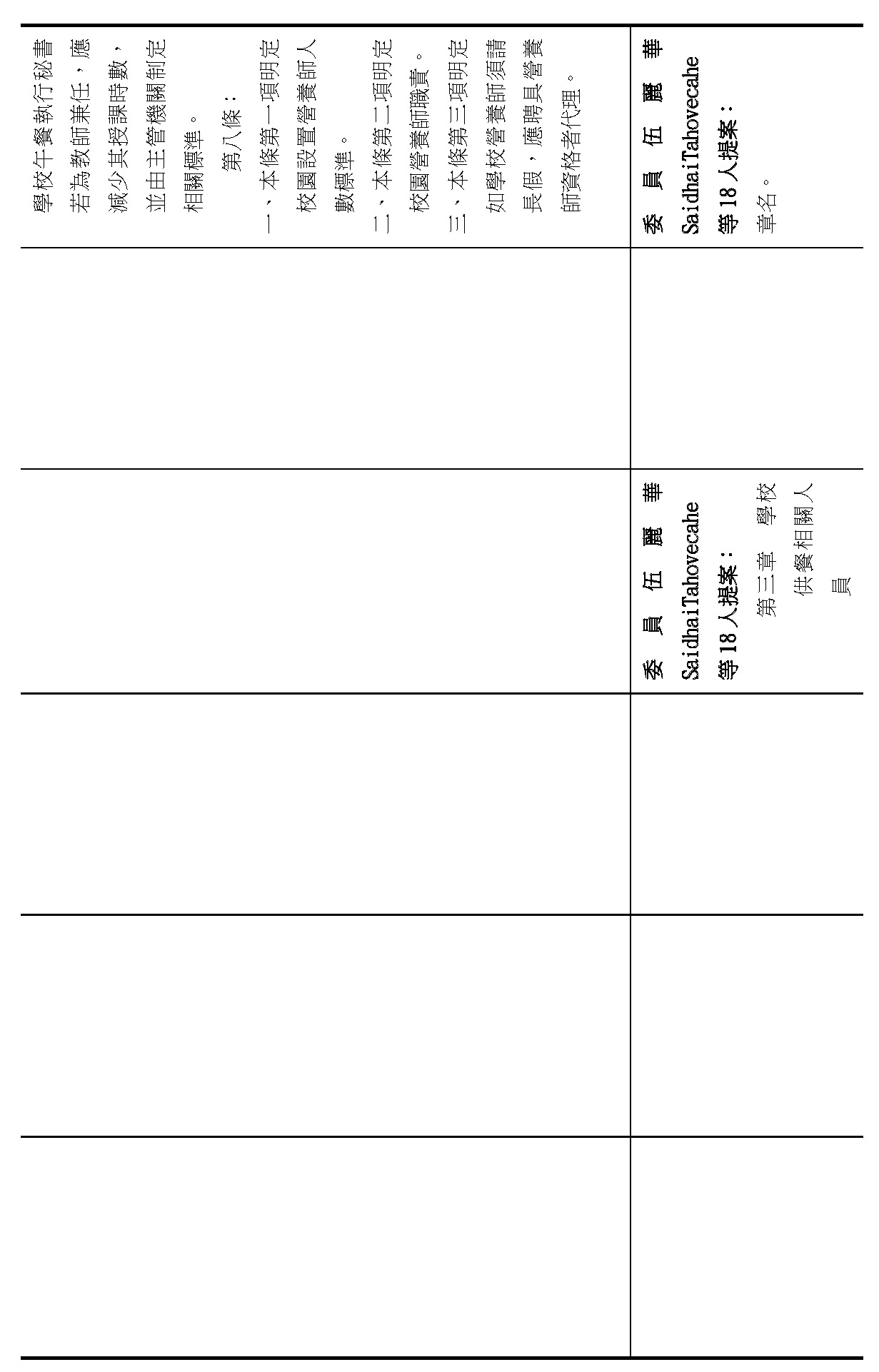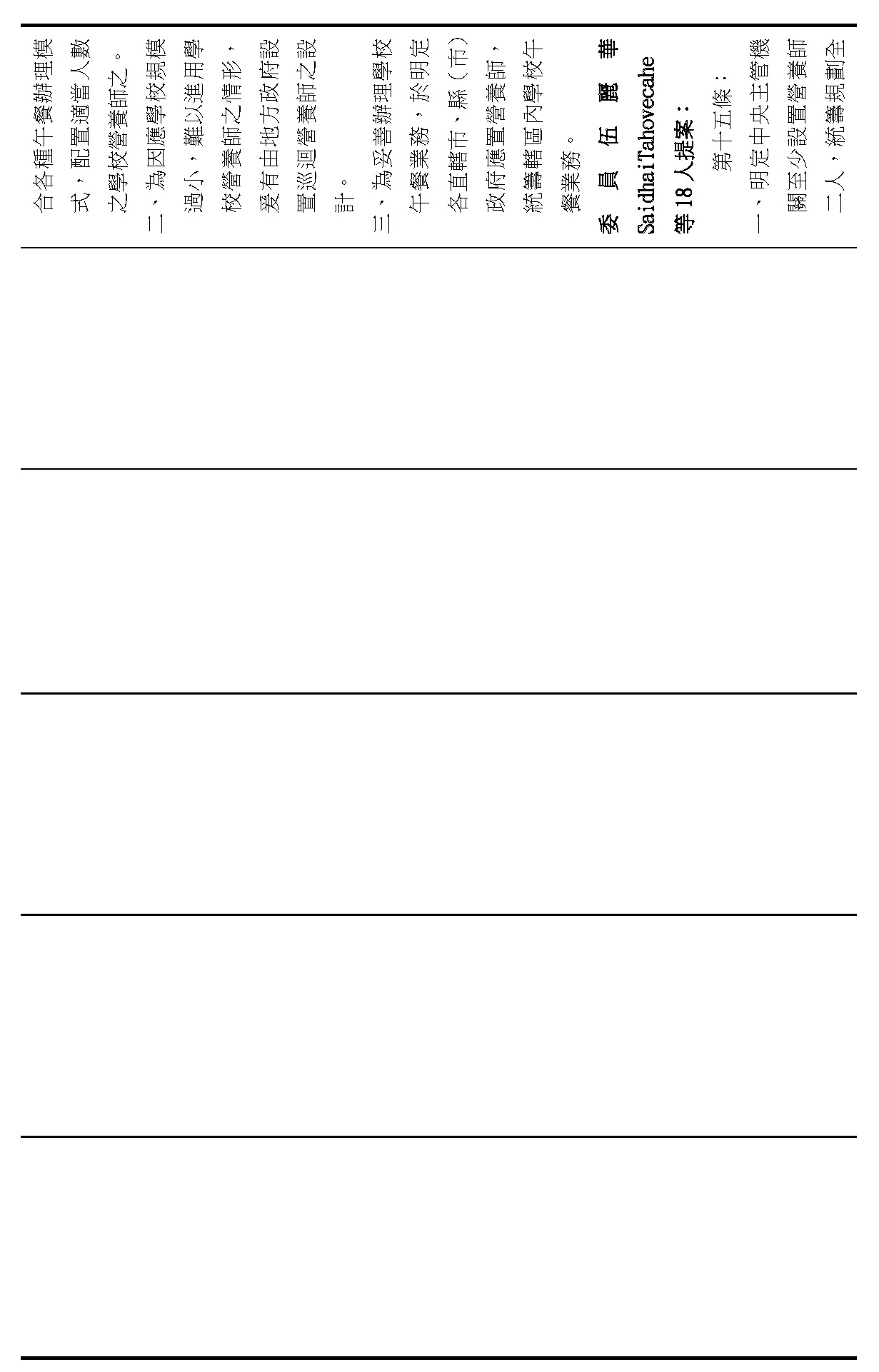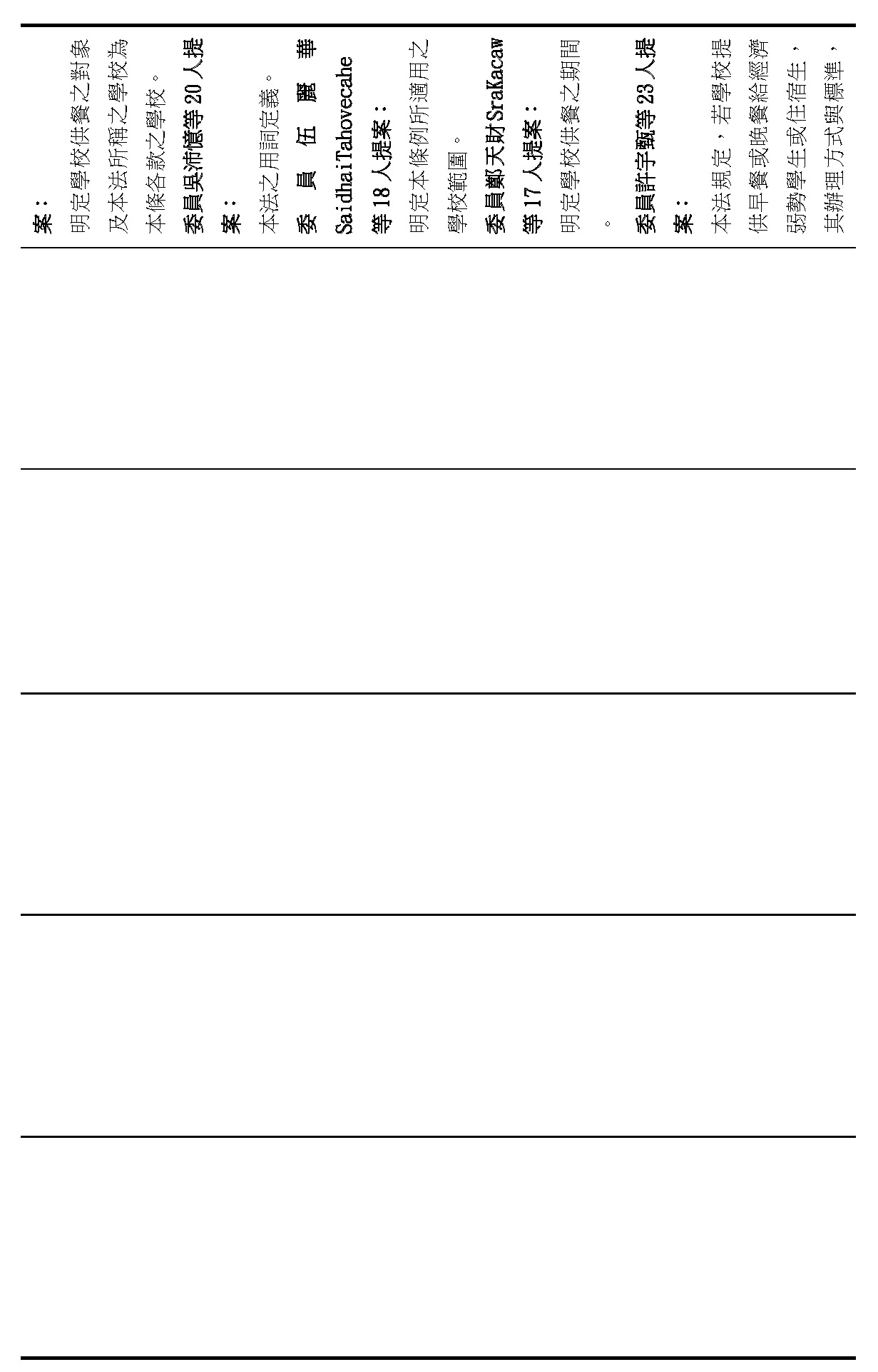 (十)委員伍麗華Saidhai Tahovecahe等18人擬具「學校供餐及飲食教育條例草案」案。