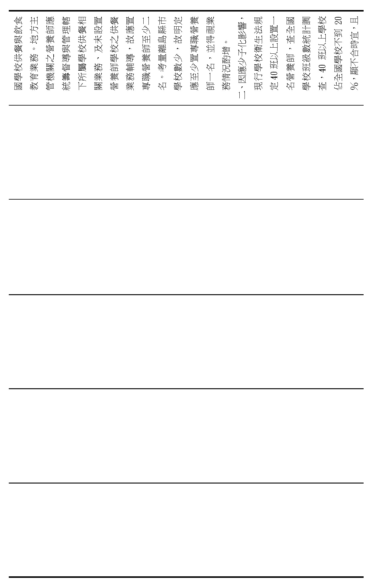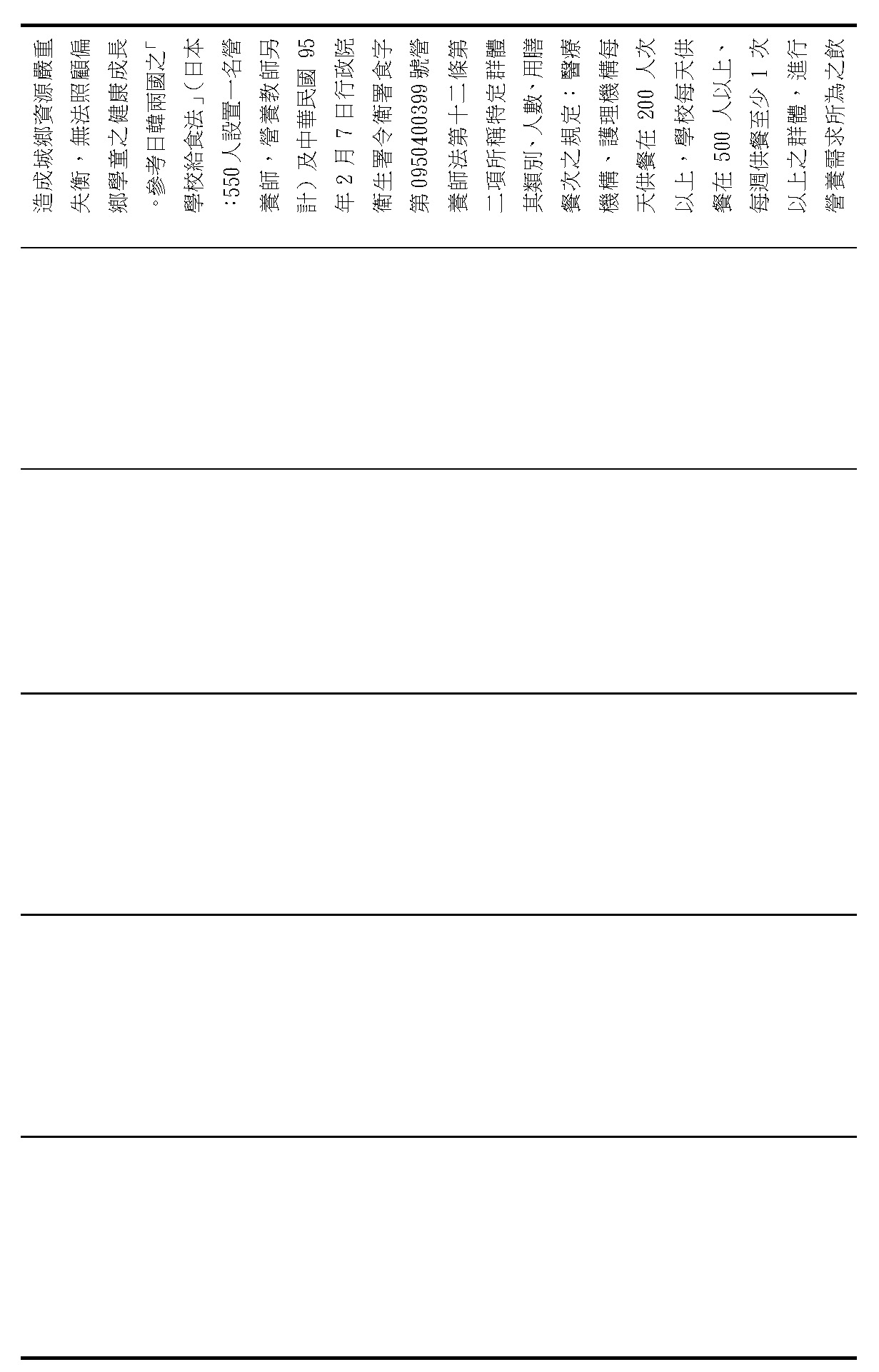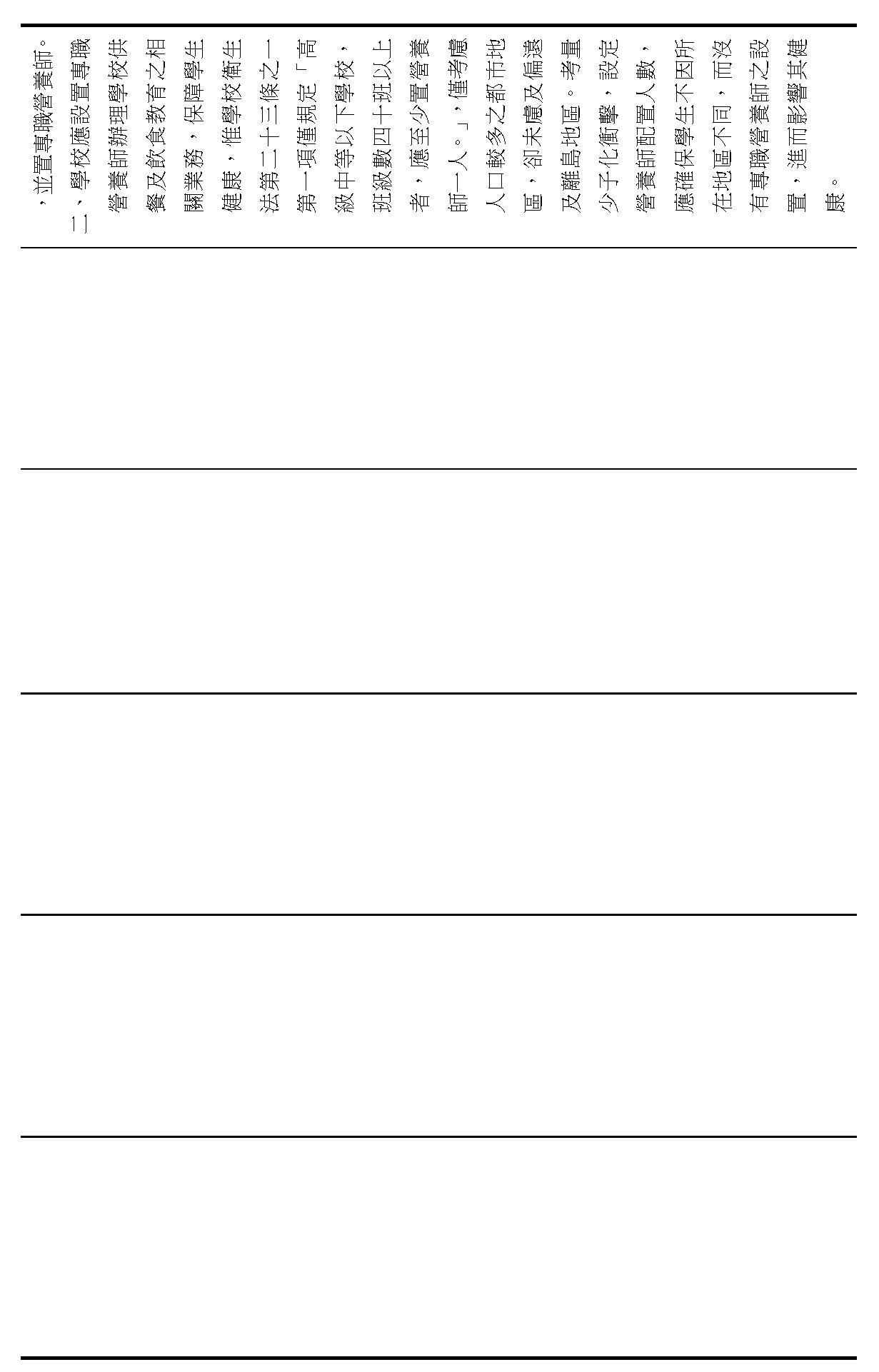 再次跟大家分享,日本1954年、韓國1981年就已經制定了學校的給食法,臺灣至今都沒有學校的午餐專法,我國學童營養午餐的權益遠遠的落後了鄰近國家,所以我們也希望真的能夠好好的來探討這一次的營養午餐專法。不只是我個人,對於整個營養師、廚工、午餐秘書、校園老師分配工作的權益也好,以及最重要的是,我們在供餐的時候所保障學生的權益,我們能夠落實到什麼樣的地步,來加強整個學校供餐飲食最重要的保障。