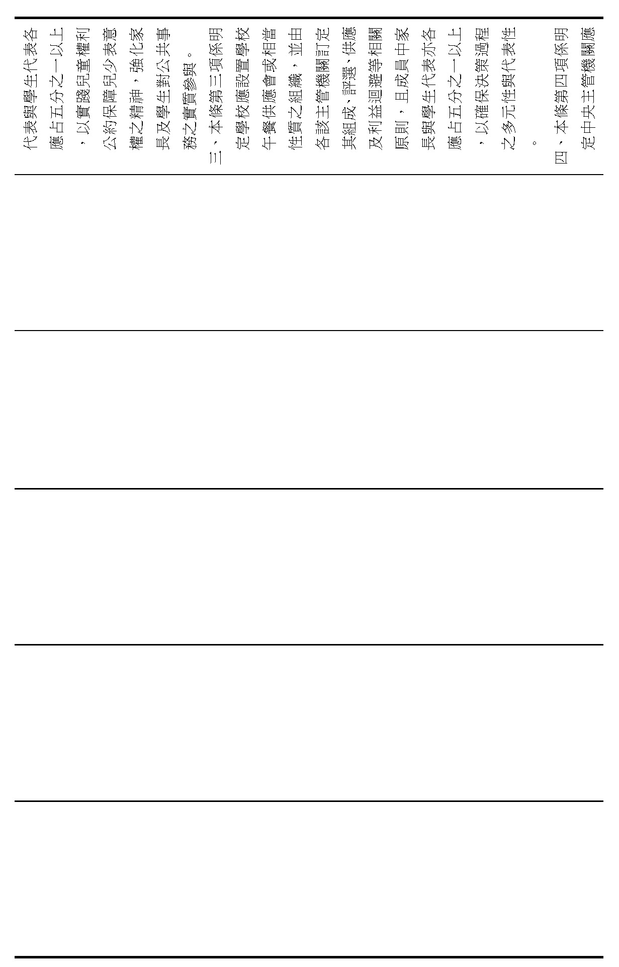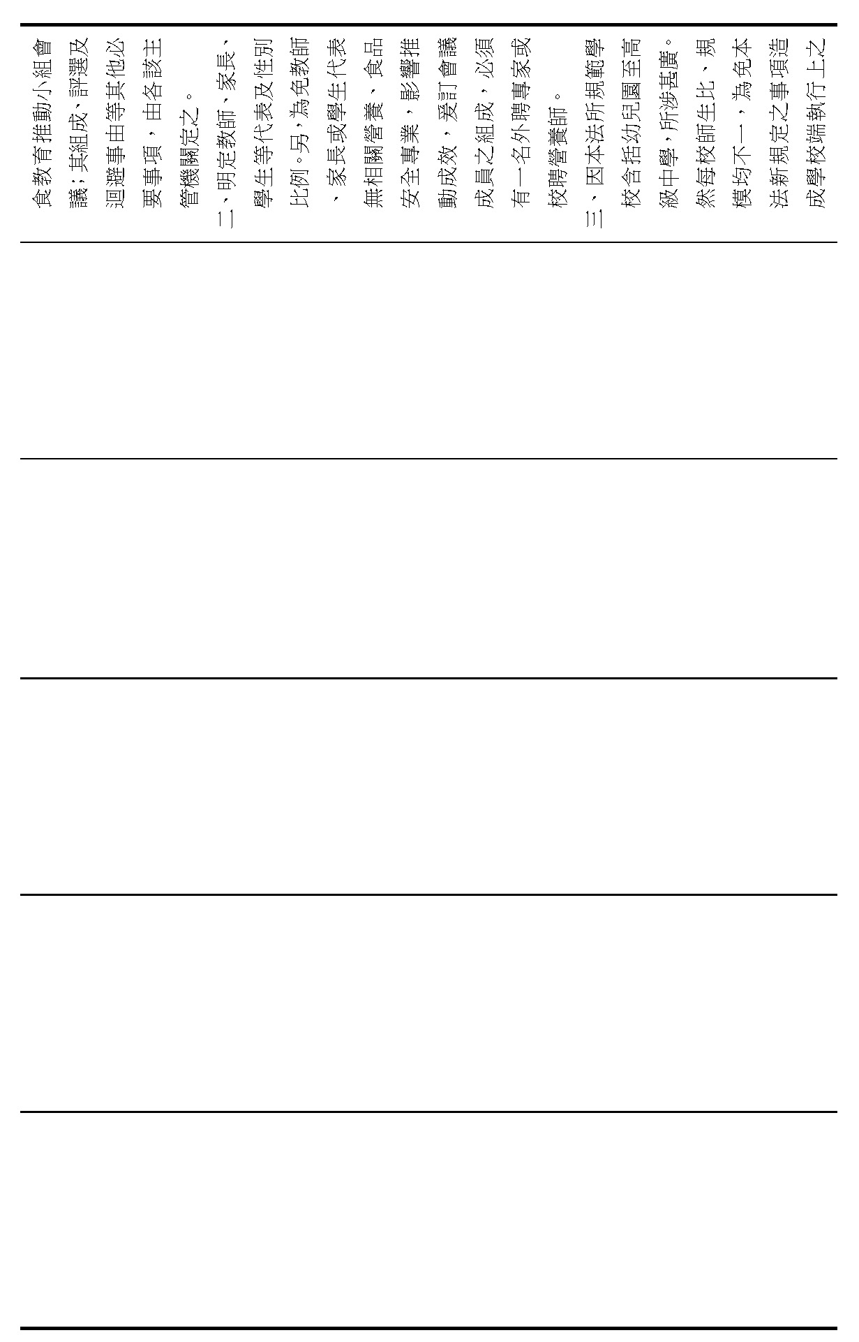 另外,委員也指出了一些目前還沒有辦法建立共識的,確實委員的關心是對的,高中生的自主性是高的,他們不希望在學校吃營養午餐,目前各縣市高中生有吃營養午餐的基本上是屬於完全中學,也就是國中就提供了,但是高中要不要一校兩制?所以我們才在這個部分有所保留,雖然名稱為「高級中等以下學校」,但是我們為了讓各校本於學生跟學生的一個自治跟溝通,而保留給他一個彈性,所以已經有完全中學的怎麼樣讓他在營養午餐的使用上也能夠確保新鮮、安全、健康,這是我們也把他納進來,法案上為什麼會有這樣一個考量的原因。