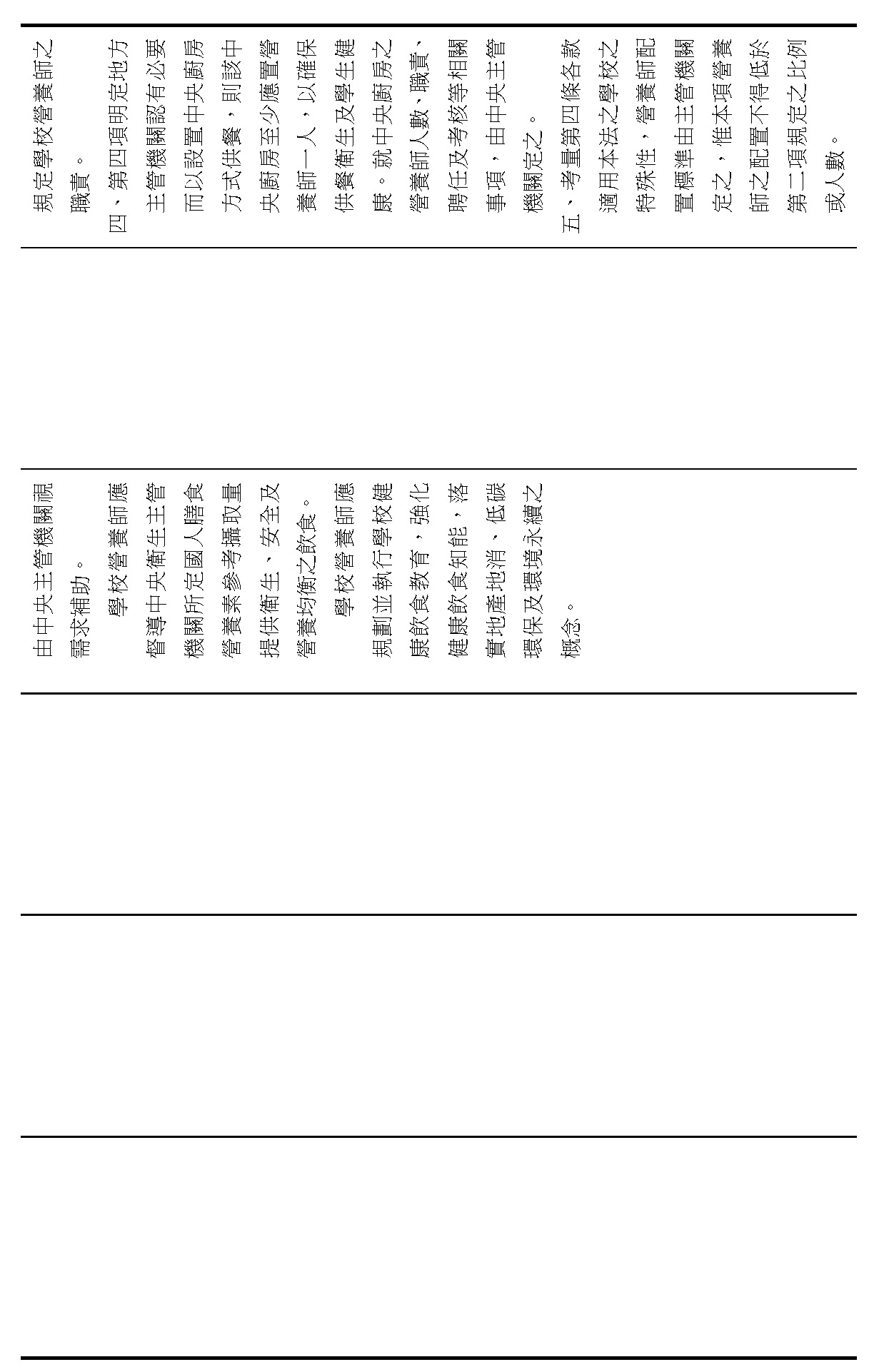 這個草案共分7章27節,重點包括了第一個部分是建立中央與地方雙軌推動的體系,由教育部設置學校午餐及飲食教育促進委員會,地方設置推動會,定期召開會議,確保政策滾動的檢討、透明公開。第二個部分是強化專業人力的配置,調整的門檻以更多學校設置更多營養師與校廚為主,並確立了培訓制度跟健康檢查的機制,以確保膳食品質與衛生安全。第三個部分是推動在地食材與食農教育,鼓勵學校採用國產的食材,發展地方飲食特色,同時將飲食教育納入課程,培養學生的營養素養與惜食觀念。第四個部分是建立校園食材採購與登錄平臺,由農業部與教育部共同管理,簡化採購流程,落實資訊揭露,防止食安漏洞。