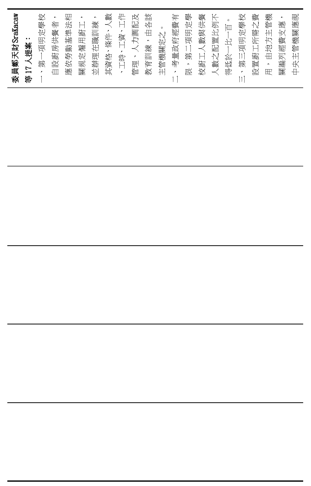 (九)委員鄭天財Sra Kacaw等17人擬具「高級中等以下學校午餐及飲食教育條例草案」案。