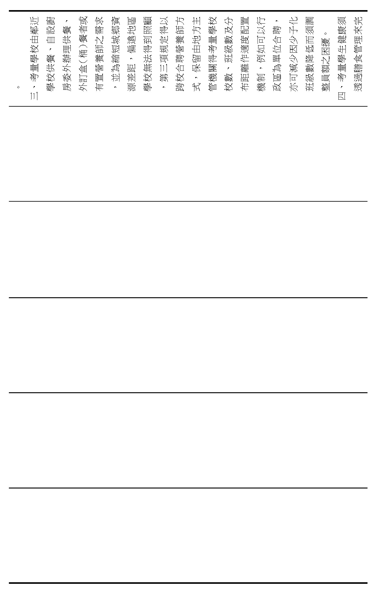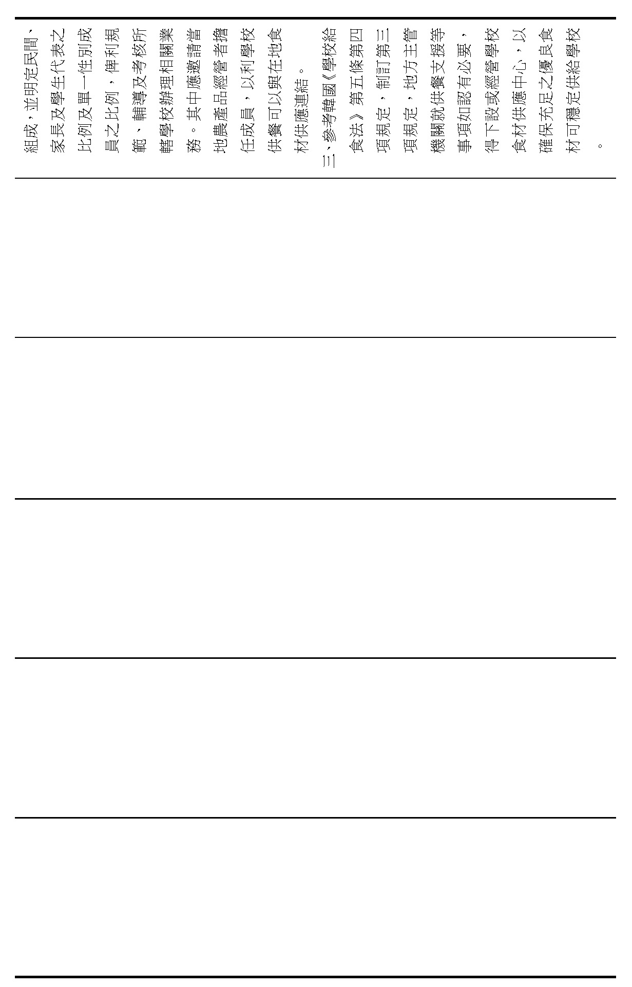 第二個問題,我們現在也有一些版本,有提到高中生要把他納入,但是我覺得大家也可以思考一下,現在許多高中生有非常高度的自主性,其實他們很希望自己決定吃什麼,如果我們把他放進去的時候,會不會造成非常多食物最後變成廚餘?而現在廚餘處理也會是一個很大的問題,到底要不要把高中納入?我覺得委員們還是要思考一下高中生的主體性跟自主性。