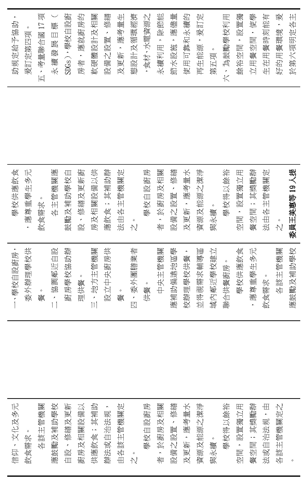 在這次修法當中也看到有人提及,在餐食當中如何納入多元文化這件事情也很重要;也就是說,我非常樂見排案修法、逐條討論,但是我也希望在後續討論當中,我們可以真的逐條、逐條找到不管是執政黨或是在野黨之間最大的共識,而不要只是貿然都保留,然後送出。如果我們真的可以在每一條、每一條細緻地討論,找到對於中央政府、地方政府,或者是對於我剛剛所說的每一個相關人都最好的立場,我認為是最好,畢竟現在都已經有在野黨提案要延會到1月底,以上,謝謝。