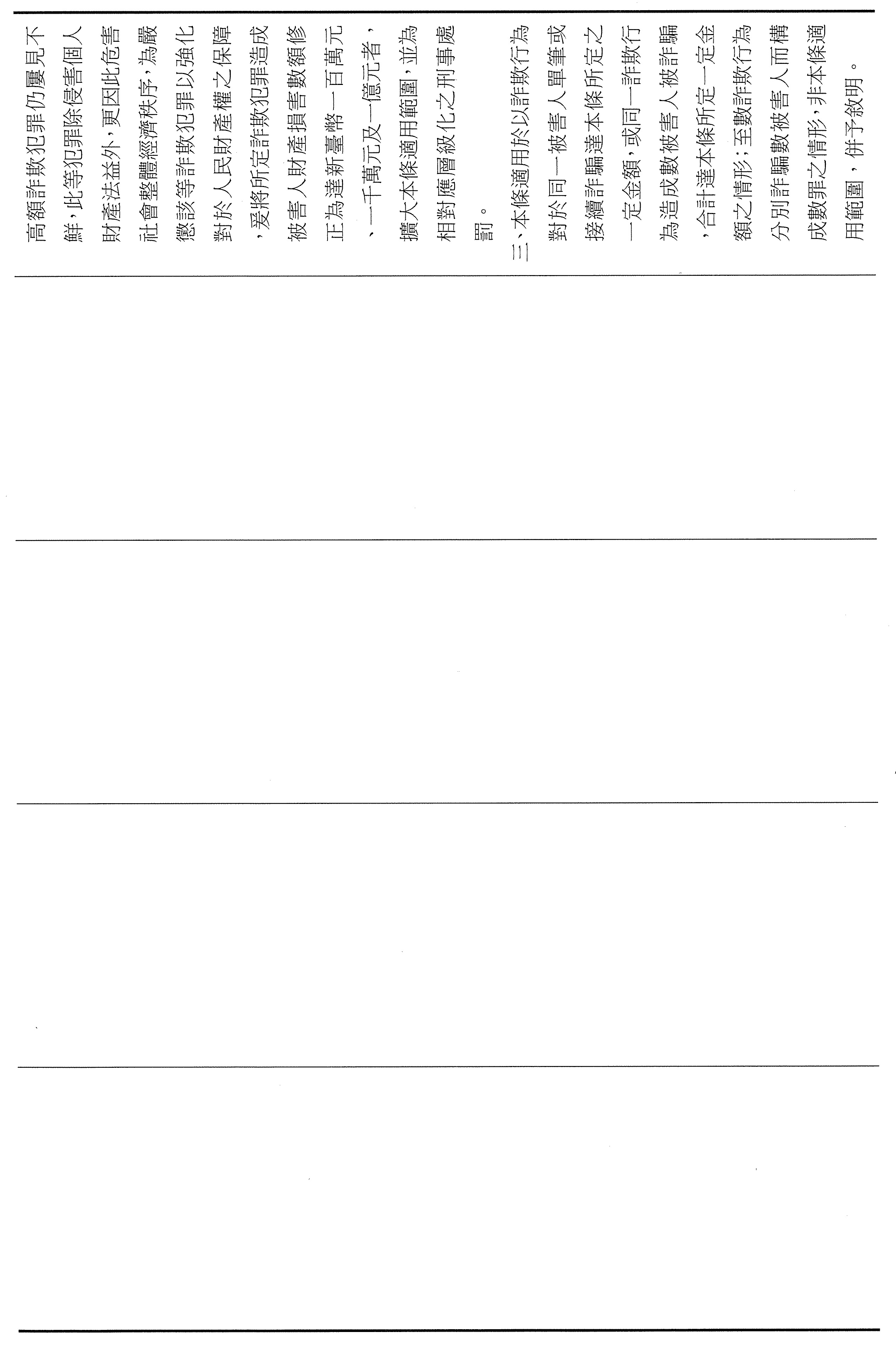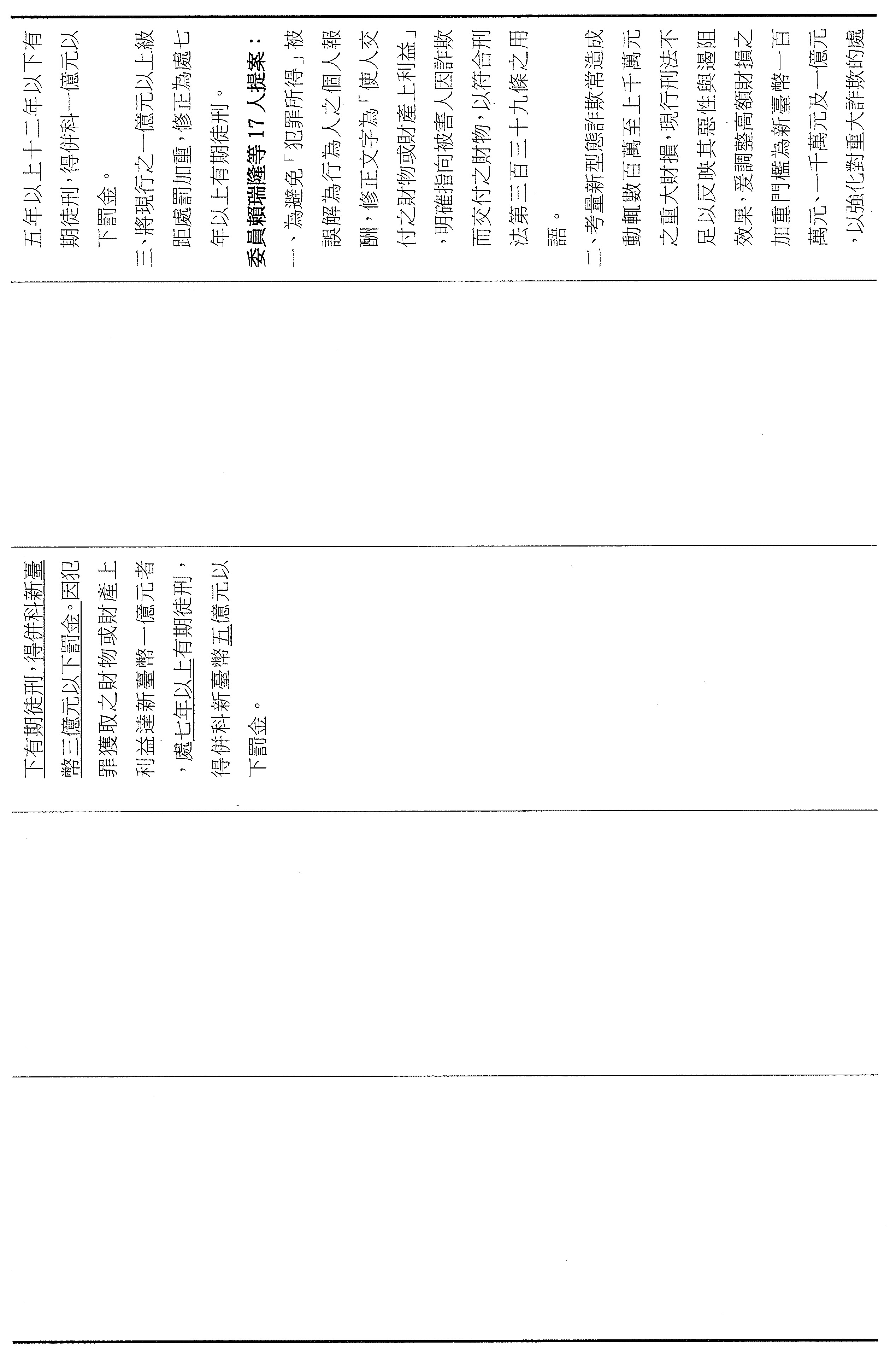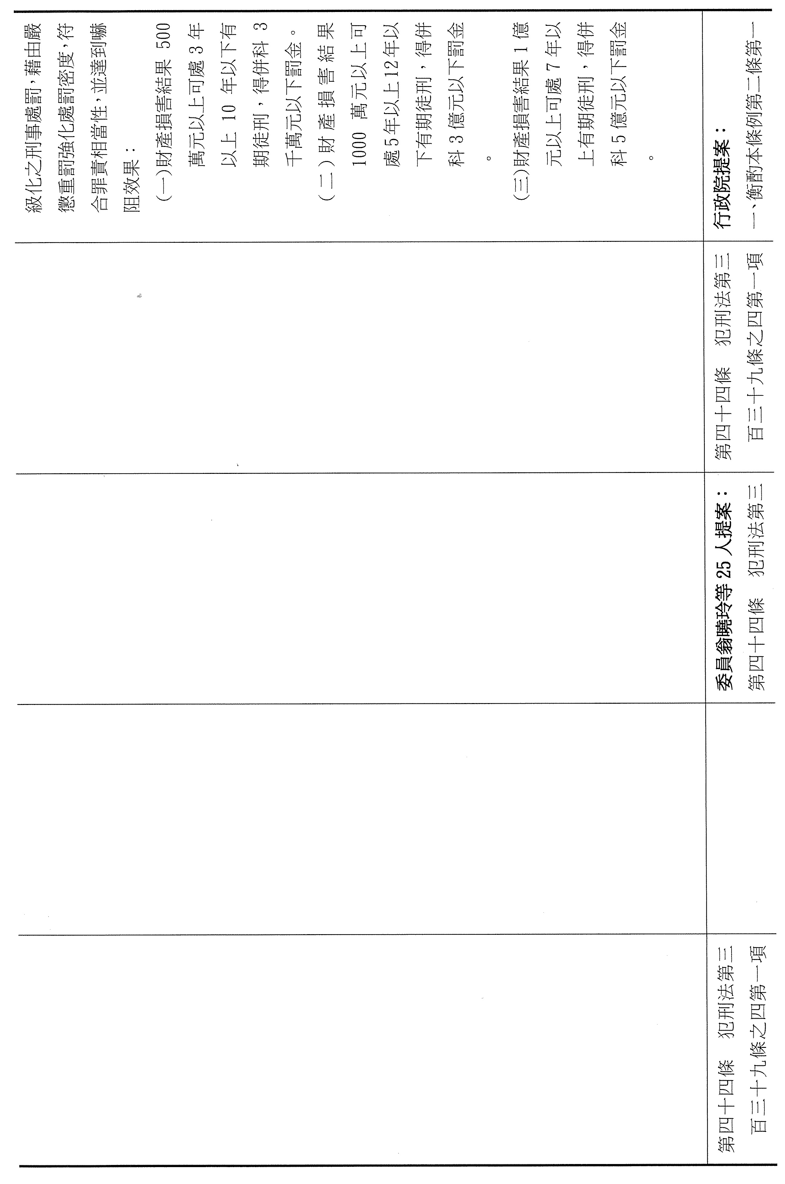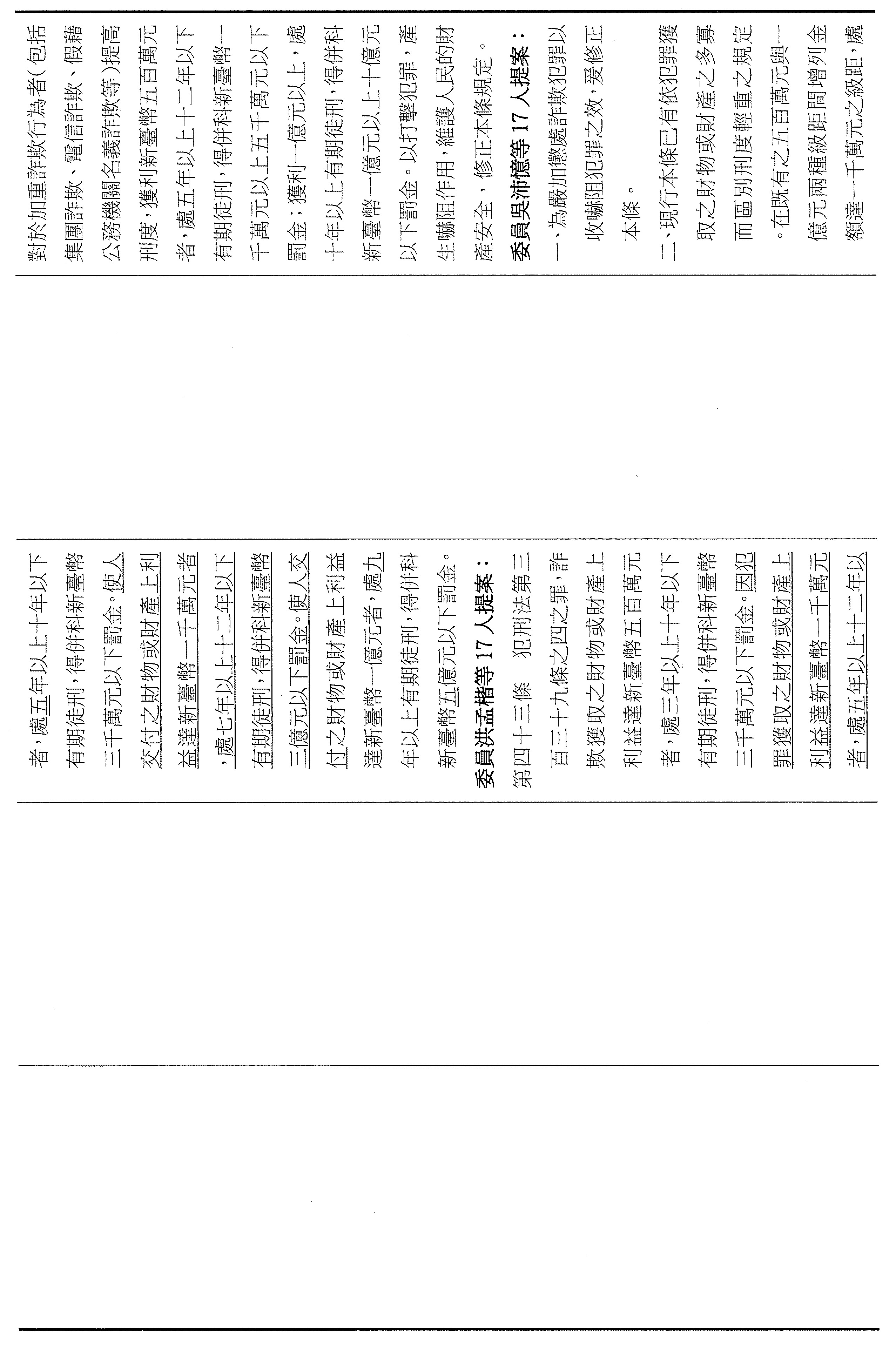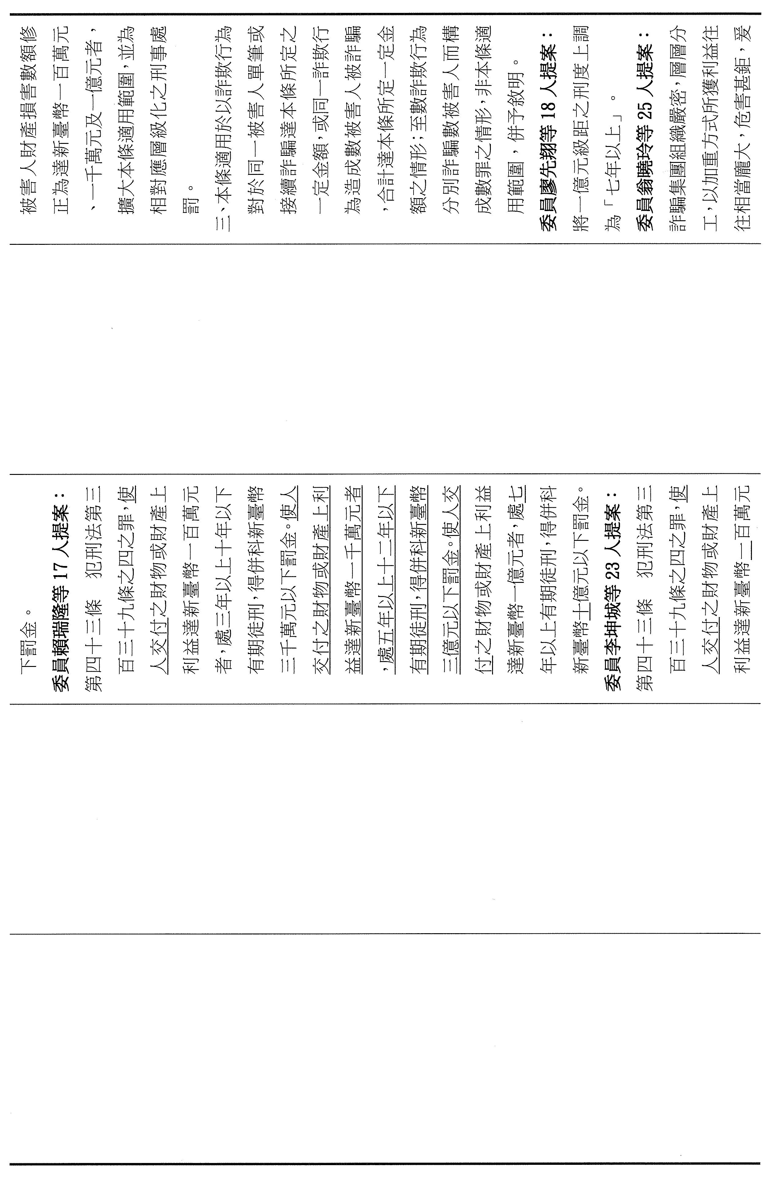 今天本席以及立院同仁分別針對第四十三條、第四十四條、第四十六條、第四十七條等相關條文提案,本席則提出第四十三條的修法,希望能夠加重處分密度,最大程度強化對人民財產權的保障。為確保詐騙所造成的損害結果符合罪責相當性,這是我們修正第四十三條的精神與態度,主張層級化刑事處罰機制,將詐騙犯罪造成被害者的財損結果明確分為三個階段的懲戒等級:第一級,詐騙所造成的財產損害結果在五百萬元以上者,加重處分三年以上十年以下有期徒刑,得併科三千萬元以下罰金;第二級,詐騙所造成的財產損害結果在一千萬元以上者,可處五年以上十二年以下有期徒刑,得併科三億元以下罰金;第三級是最高的,詐騙造成的財產損害結果在一億元以上,這是對社會經濟秩序造成嚴重侵害的犯罪行為,可處七年以上有期徒刑,得併科五億元以下罰金。