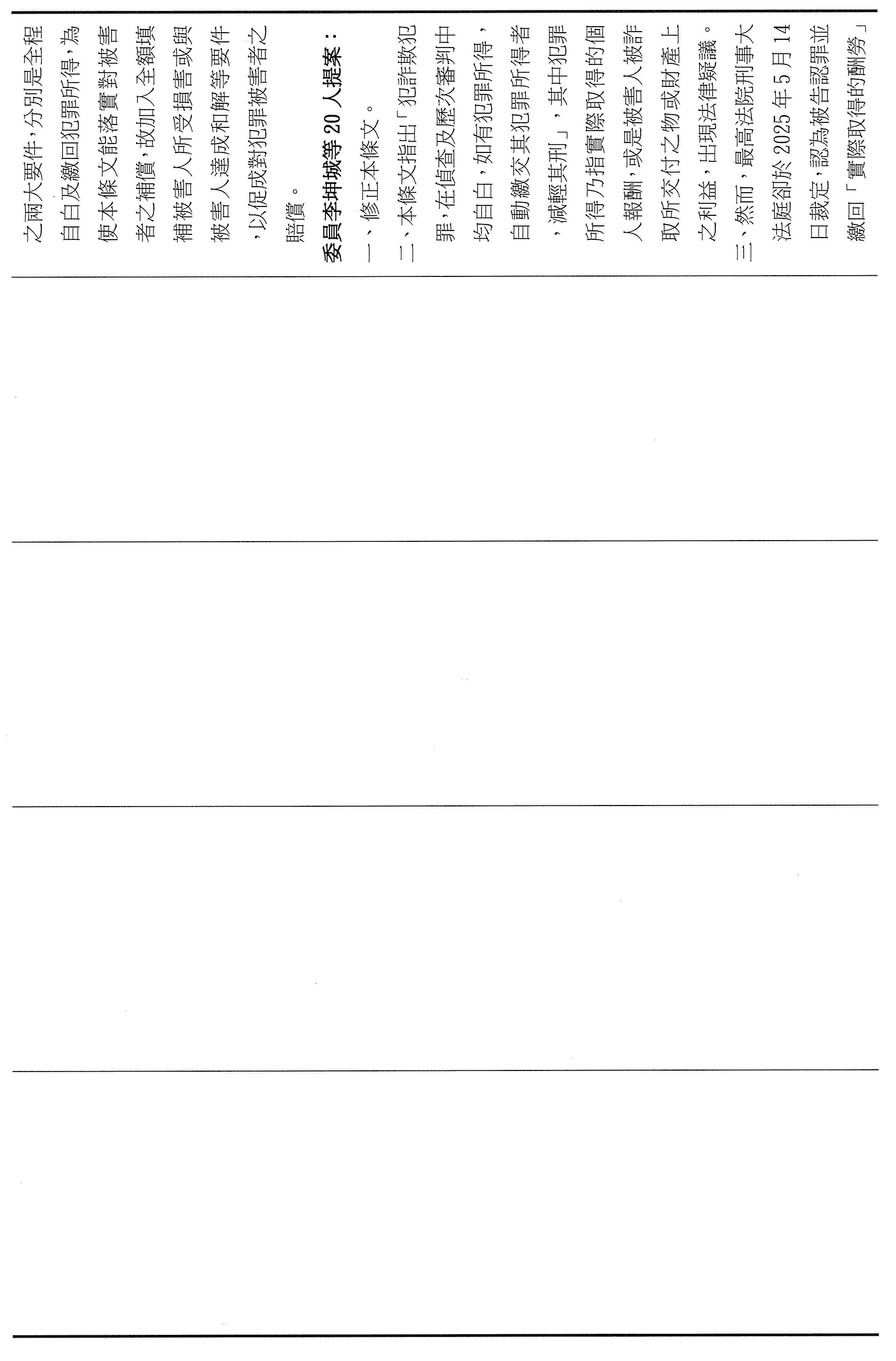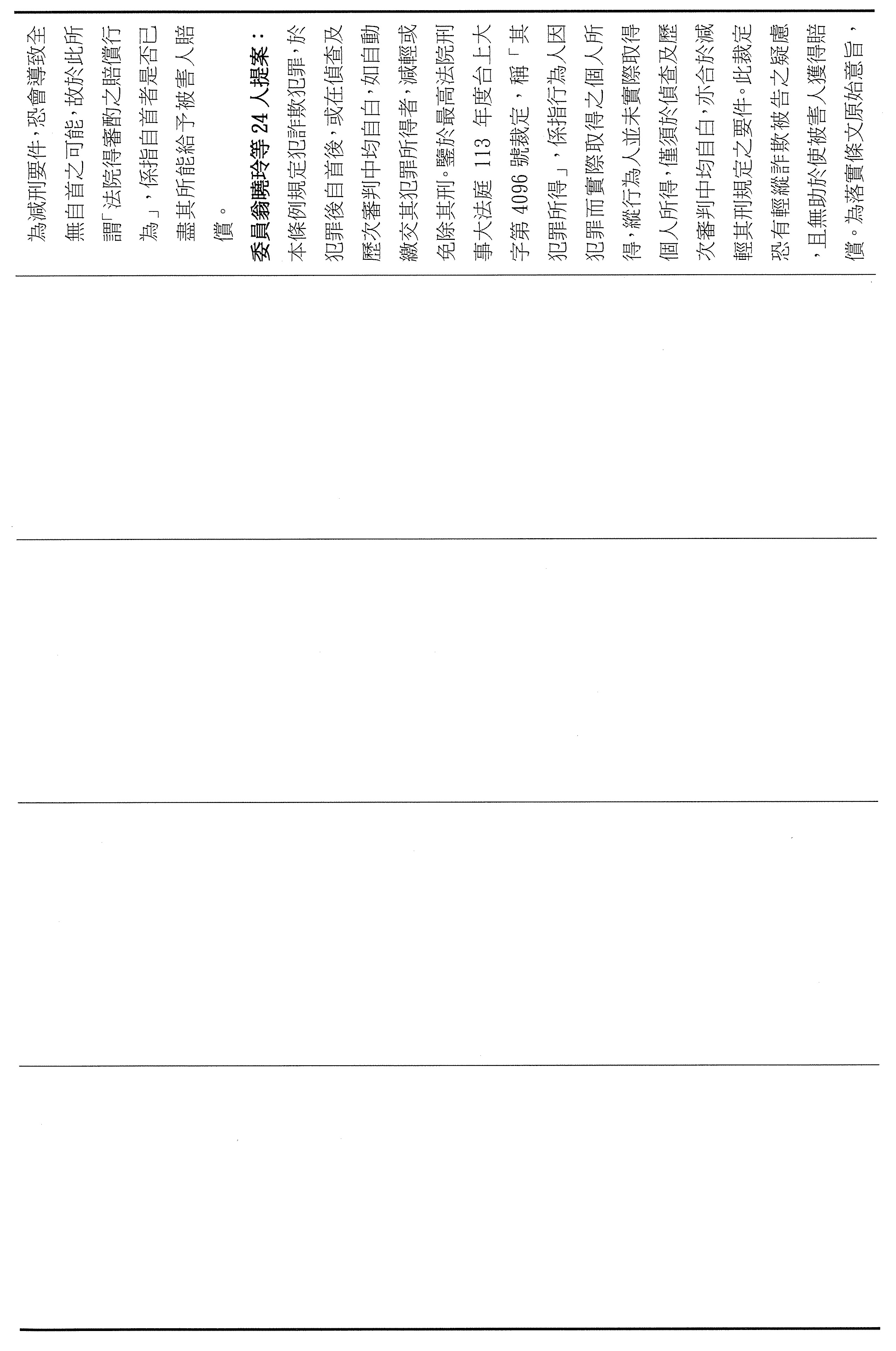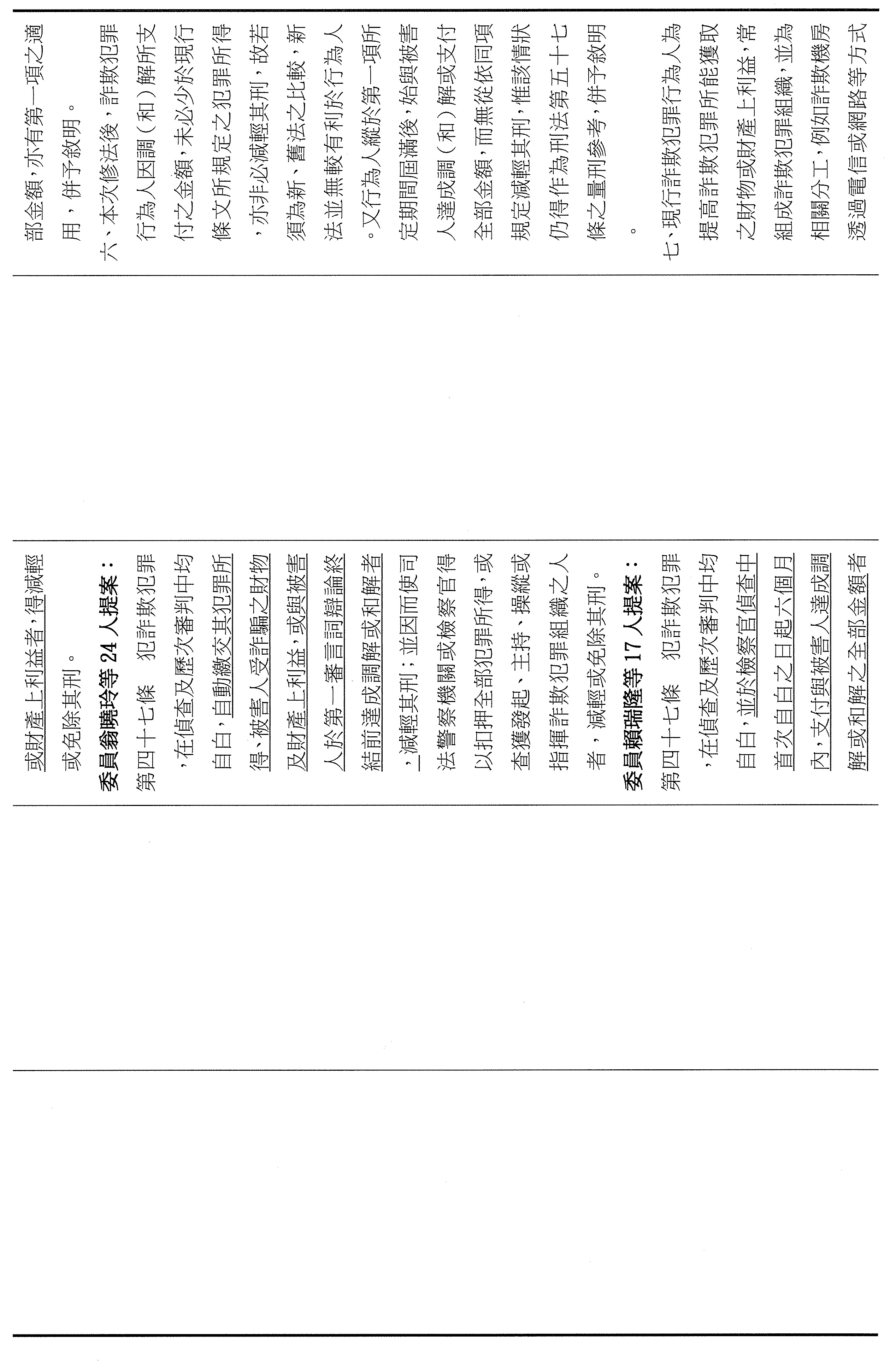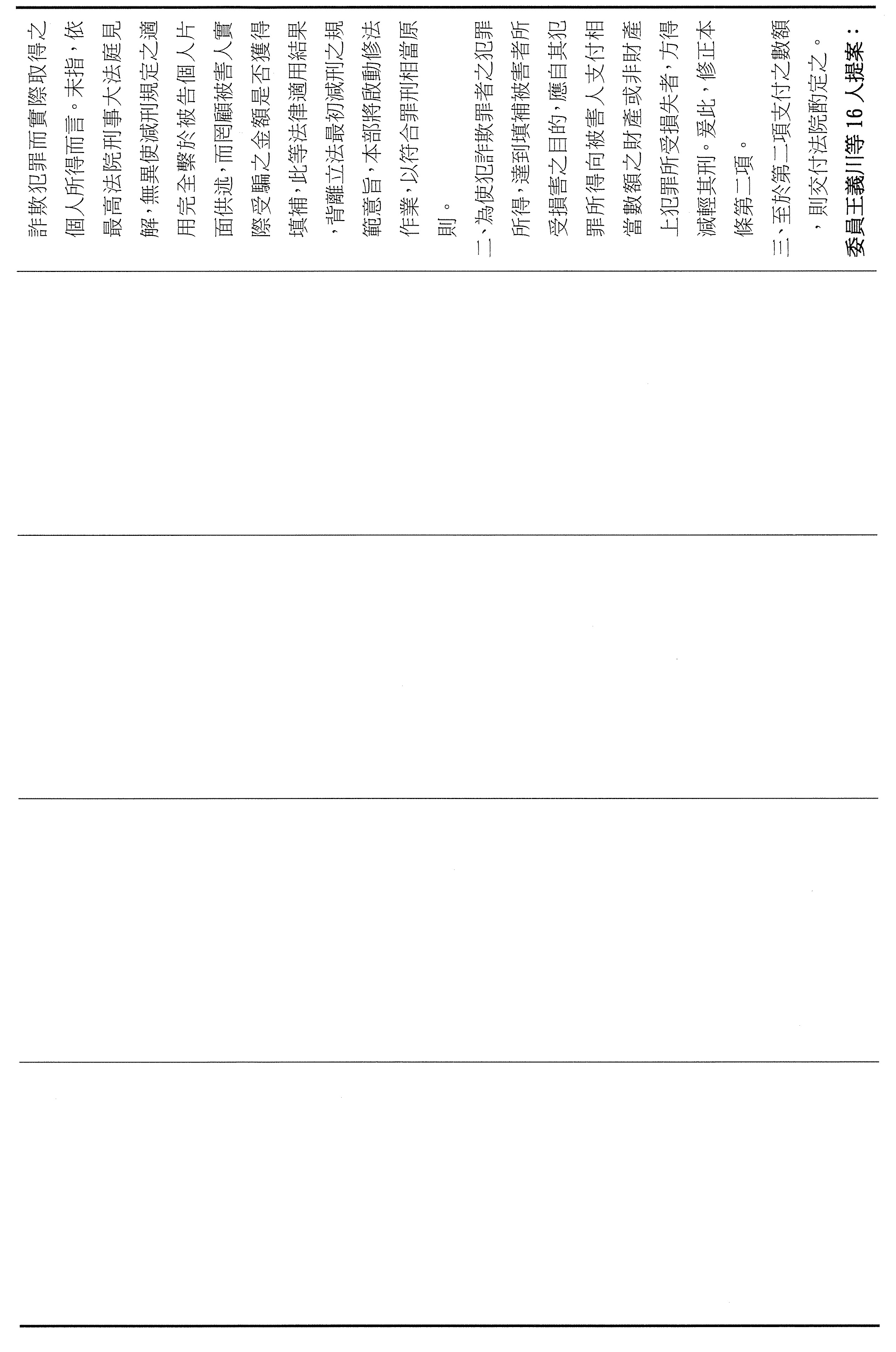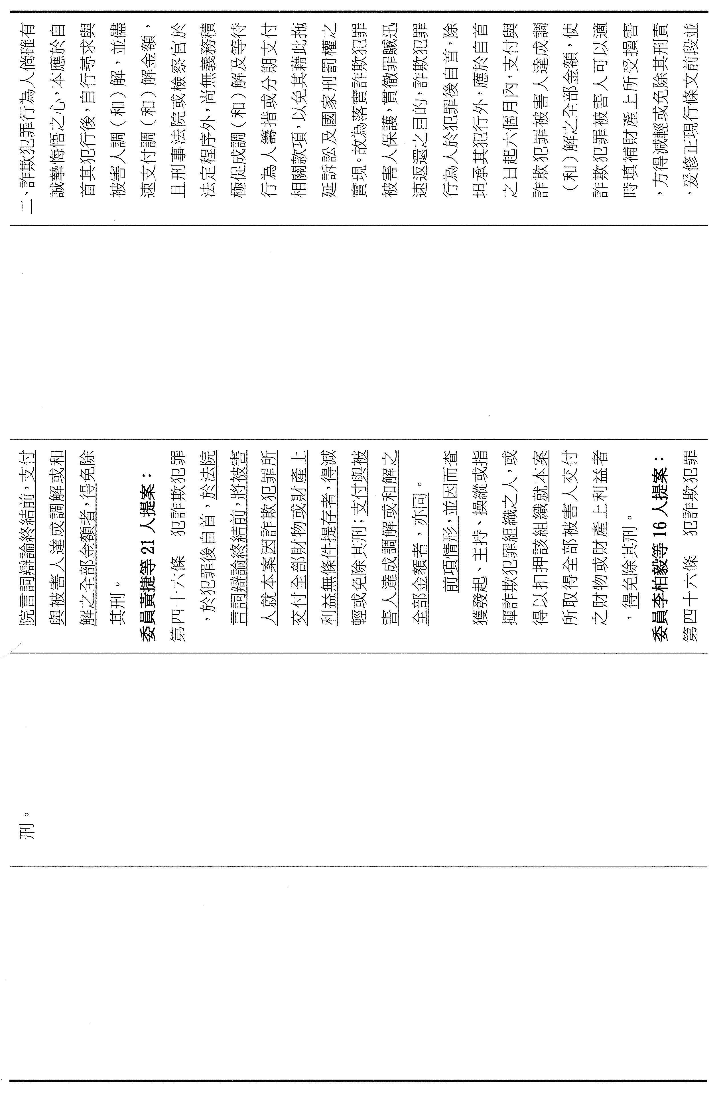 黃委員捷:謝謝主席。我提一下我的提案說明,可分成兩個部分,第一個是針對最高法院第4096號裡裁定有關詐欺犯只要繳回個人犯罪所得就可以減刑的部分,其實這件事情在社會上也引起譁然,覺得哇!原來現在不管你是車手還是詐騙產業鏈裡的任何一分子,只要你可以繳回部分所得,用非常少的錢就可以換減刑,這對被害人來說非常非常的不公平。所以,我提案修正第四十六條及第四十七條,嚴格規定如果被告要爭取減刑,必須要把被害人因本案所交付的全部財物都進行無條件的提存,或是必須支付進行調解或和解的全部金額。這是這一次修法最重要的其中一條,大家立場都很清楚,不能讓詐騙集團任何一分子,就算是車手也不能讓他輕易地脫罪。