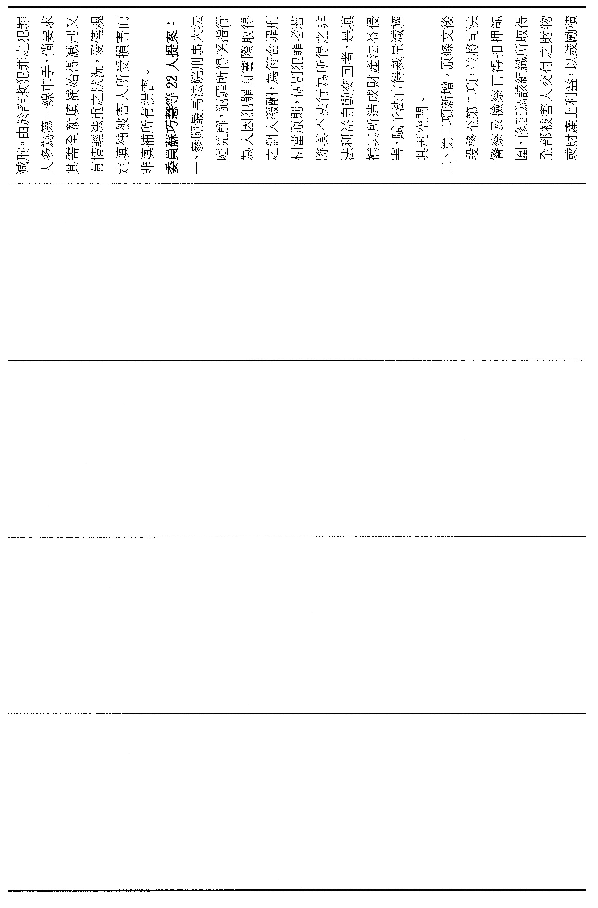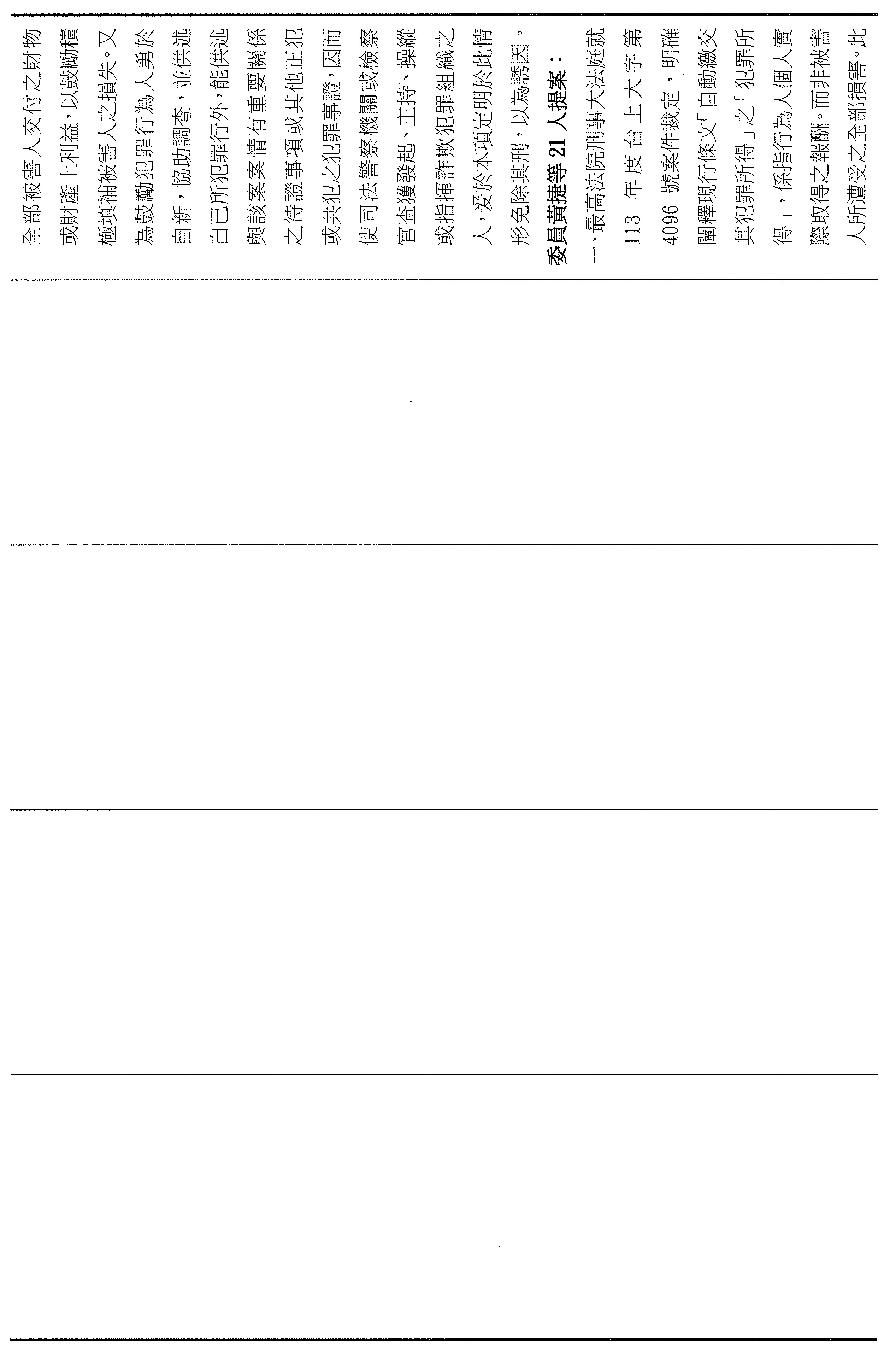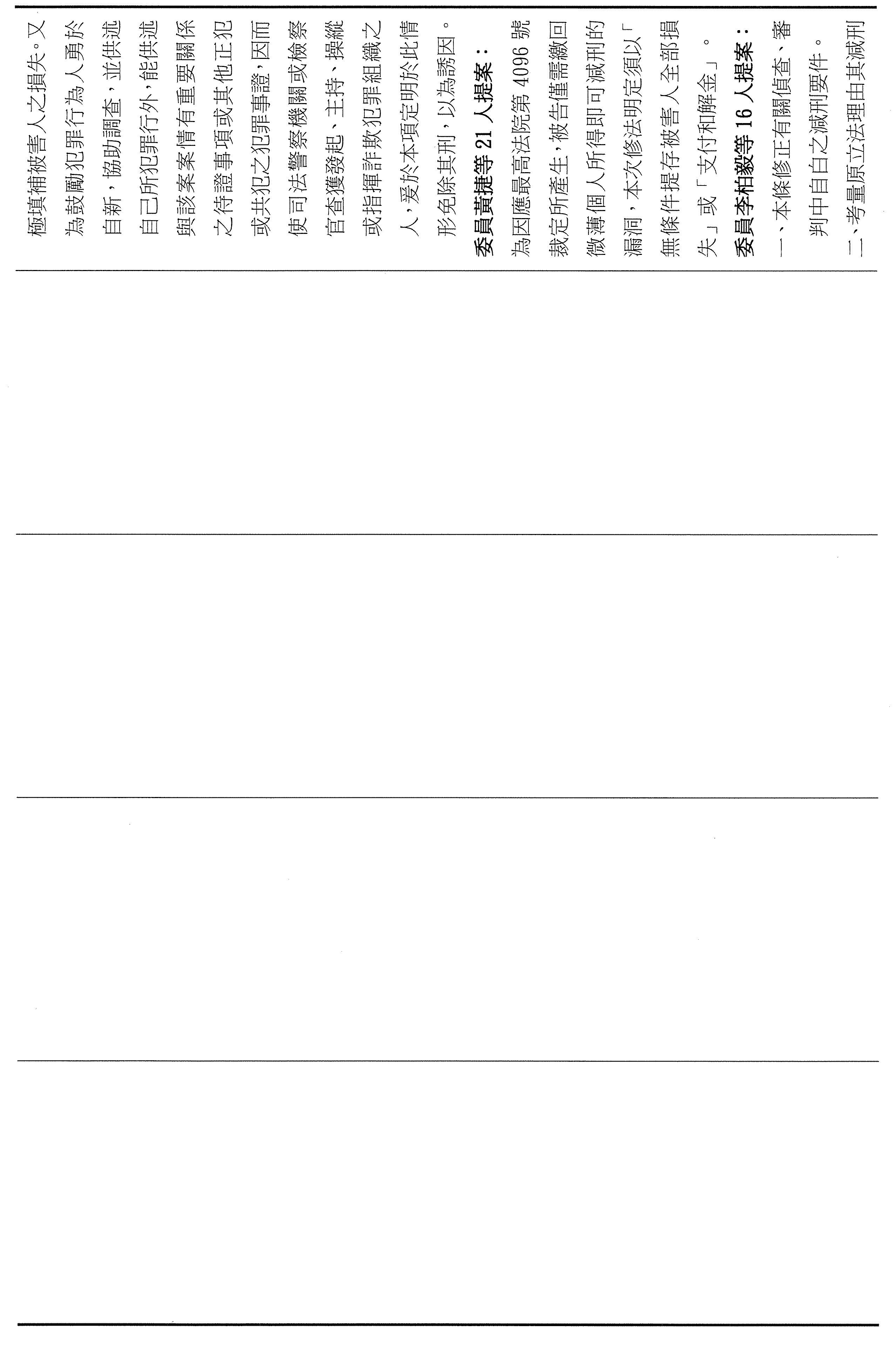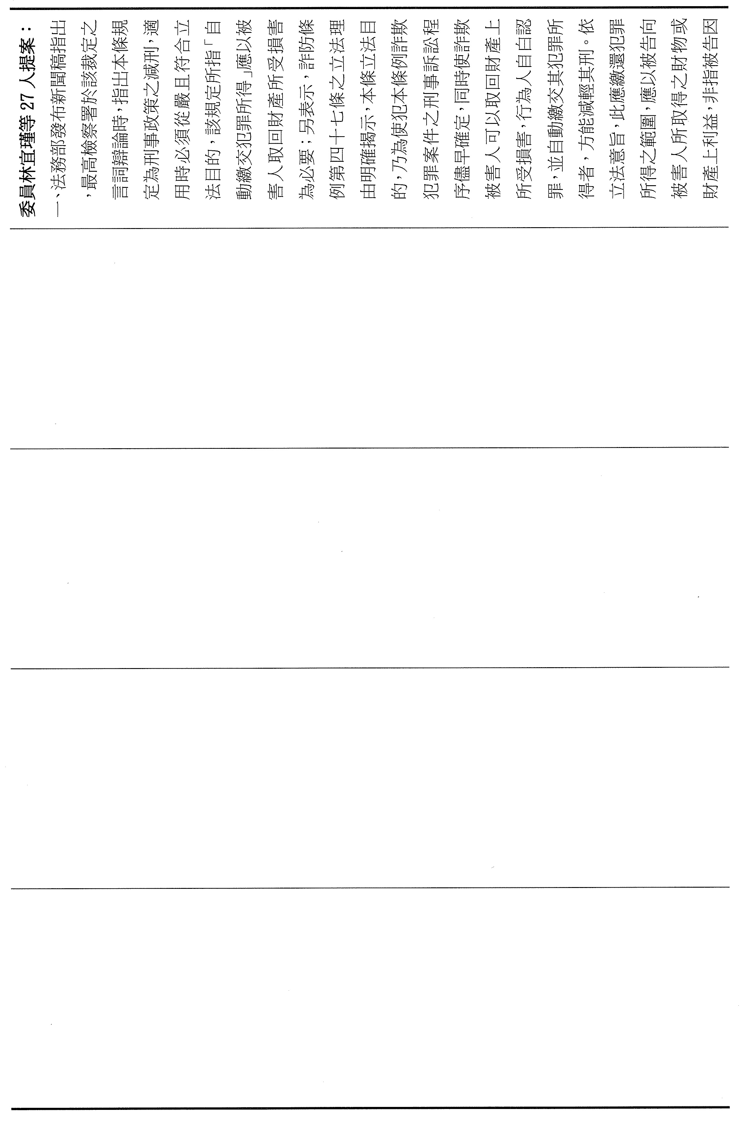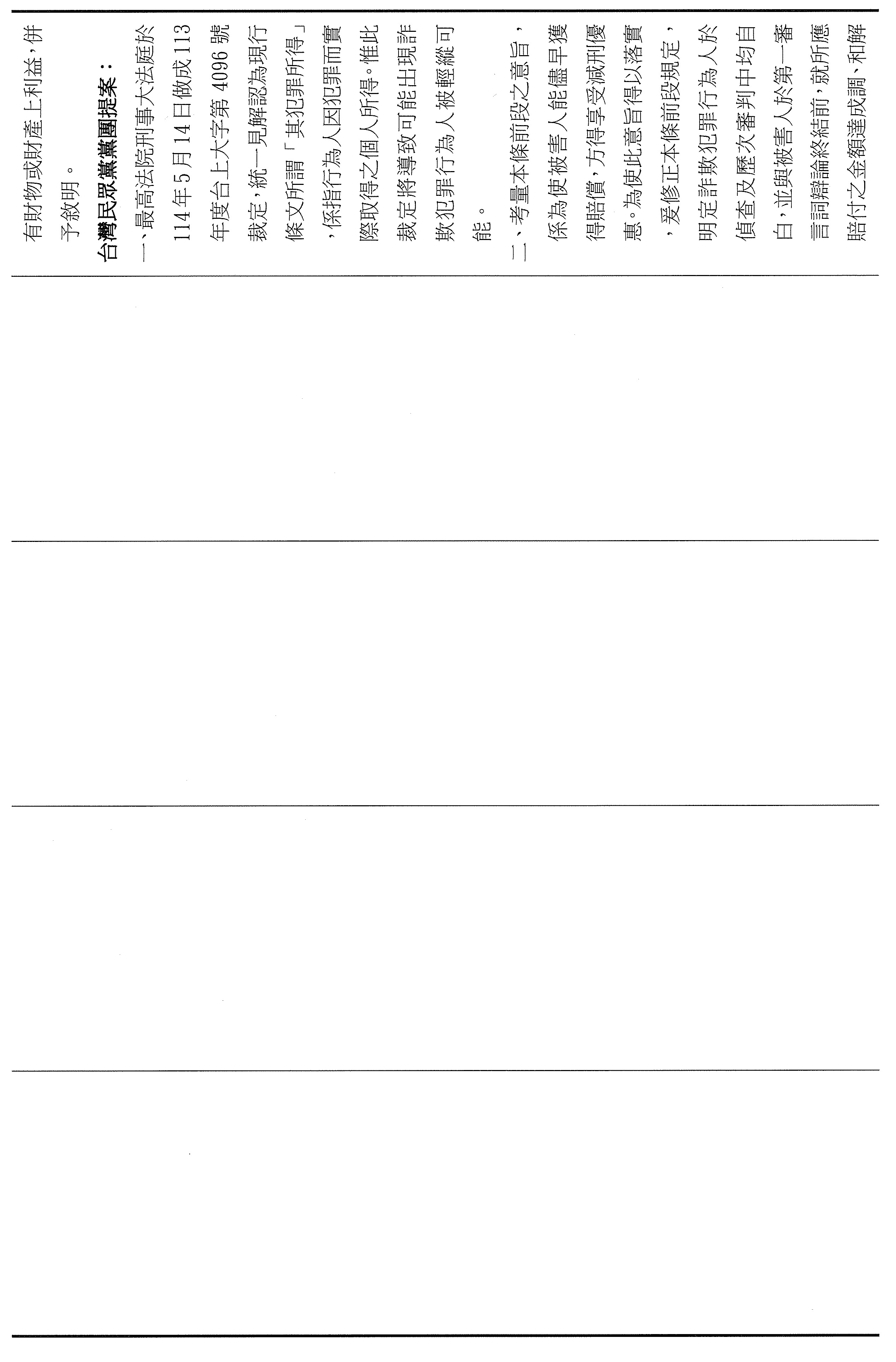 黃委員捷:謝謝主席。我提一下我的提案說明,可分成兩個部分,第一個是針對最高法院第4096號裡裁定有關詐欺犯只要繳回個人犯罪所得就可以減刑的部分,其實這件事情在社會上也引起譁然,覺得哇!原來現在不管你是車手還是詐騙產業鏈裡的任何一分子,只要你可以繳回部分所得,用非常少的錢就可以換減刑,這對被害人來說非常非常的不公平。所以,我提案修正第四十六條及第四十七條,嚴格規定如果被告要爭取減刑,必須要把被害人因本案所交付的全部財物都進行無條件的提存,或是必須支付進行調解或和解的全部金額。這是這一次修法最重要的其中一條,大家立場都很清楚,不能讓詐騙集團任何一分子,就算是車手也不能讓他輕易地脫罪。