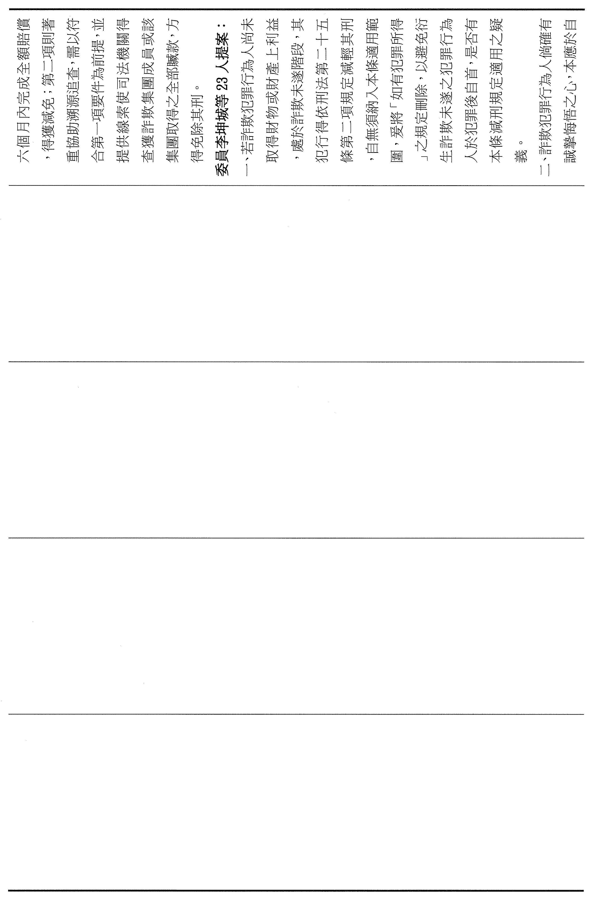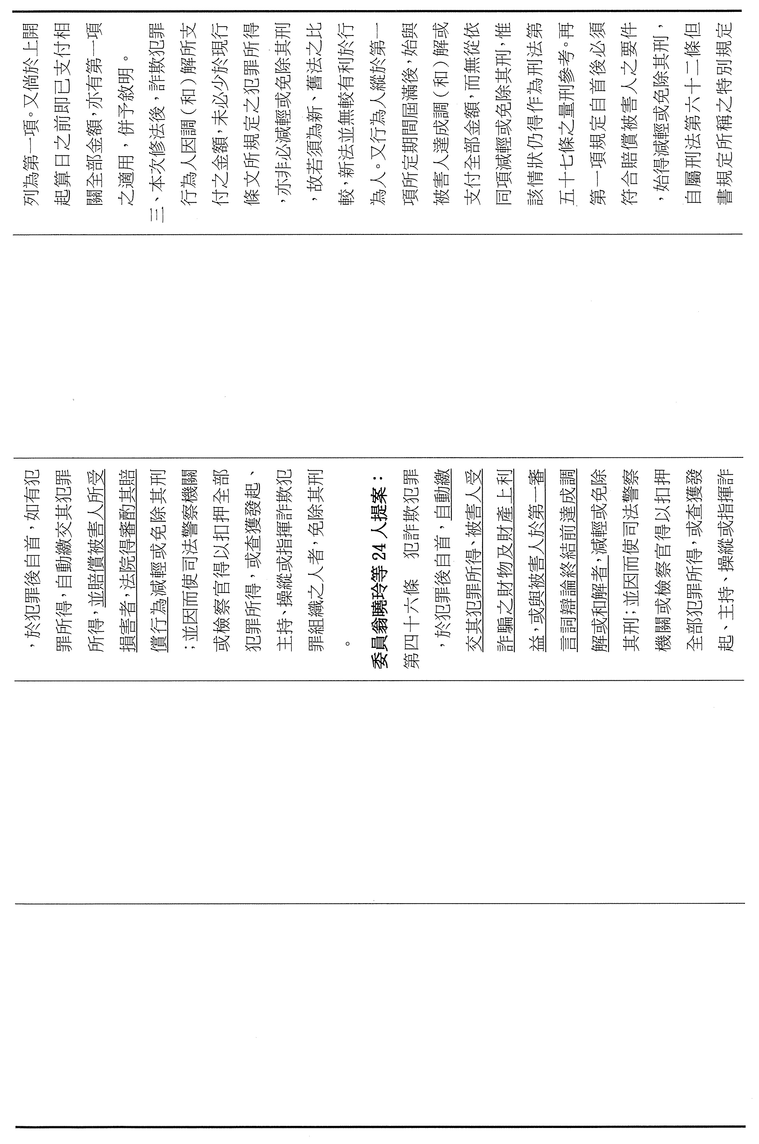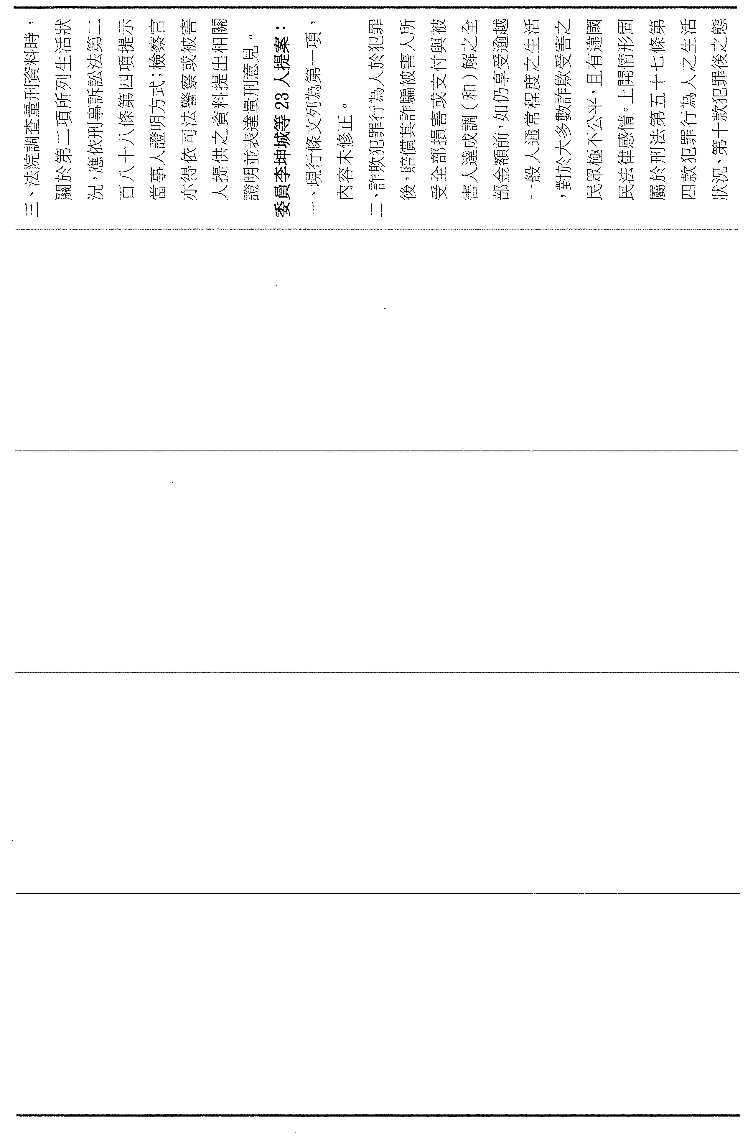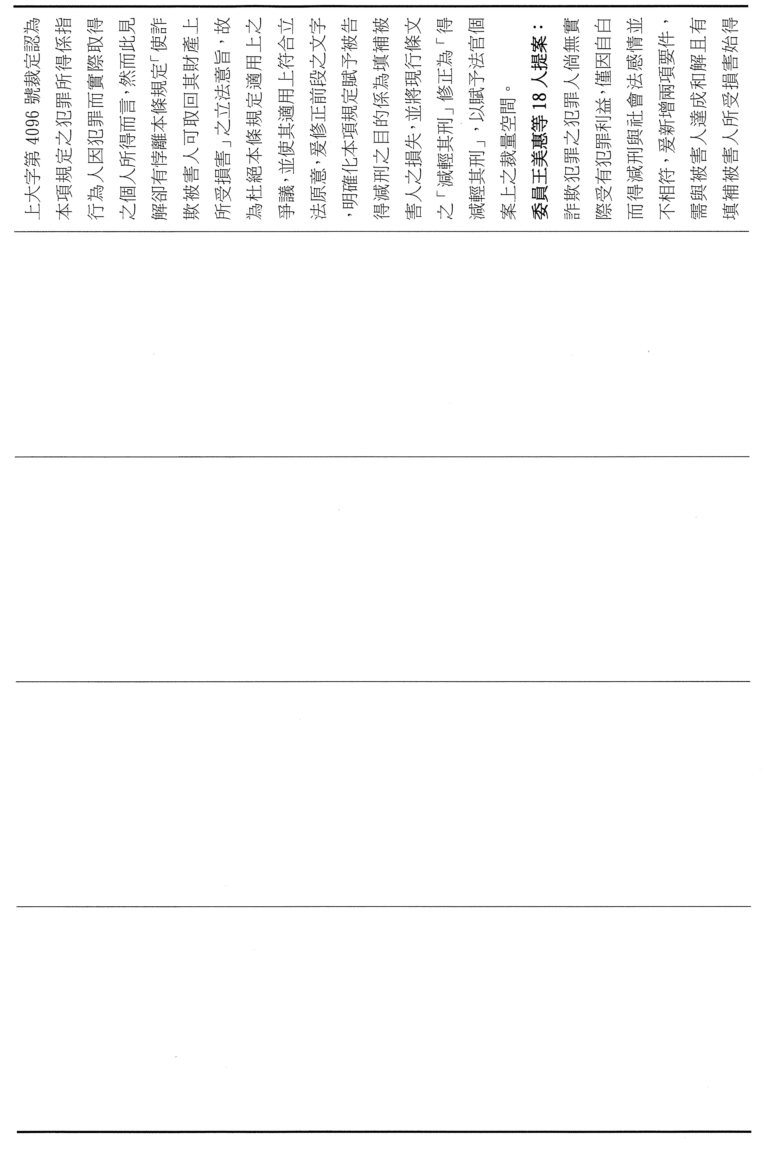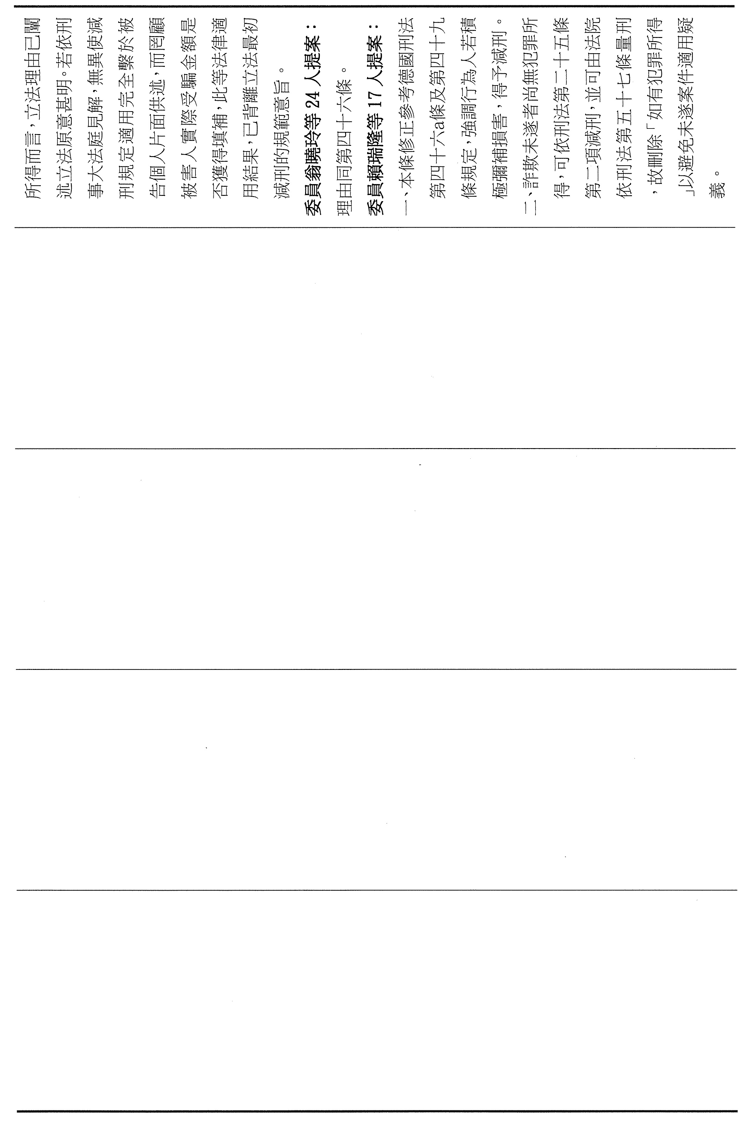 黃委員捷:謝謝主席。我提一下我的提案說明,可分成兩個部分,第一個是針對最高法院第4096號裡裁定有關詐欺犯只要繳回個人犯罪所得就可以減刑的部分,其實這件事情在社會上也引起譁然,覺得哇!原來現在不管你是車手還是詐騙產業鏈裡的任何一分子,只要你可以繳回部分所得,用非常少的錢就可以換減刑,這對被害人來說非常非常的不公平。所以,我提案修正第四十六條及第四十七條,嚴格規定如果被告要爭取減刑,必須要把被害人因本案所交付的全部財物都進行無條件的提存,或是必須支付進行調解或和解的全部金額。這是這一次修法最重要的其中一條,大家立場都很清楚,不能讓詐騙集團任何一分子,就算是車手也不能讓他輕易地脫罪。