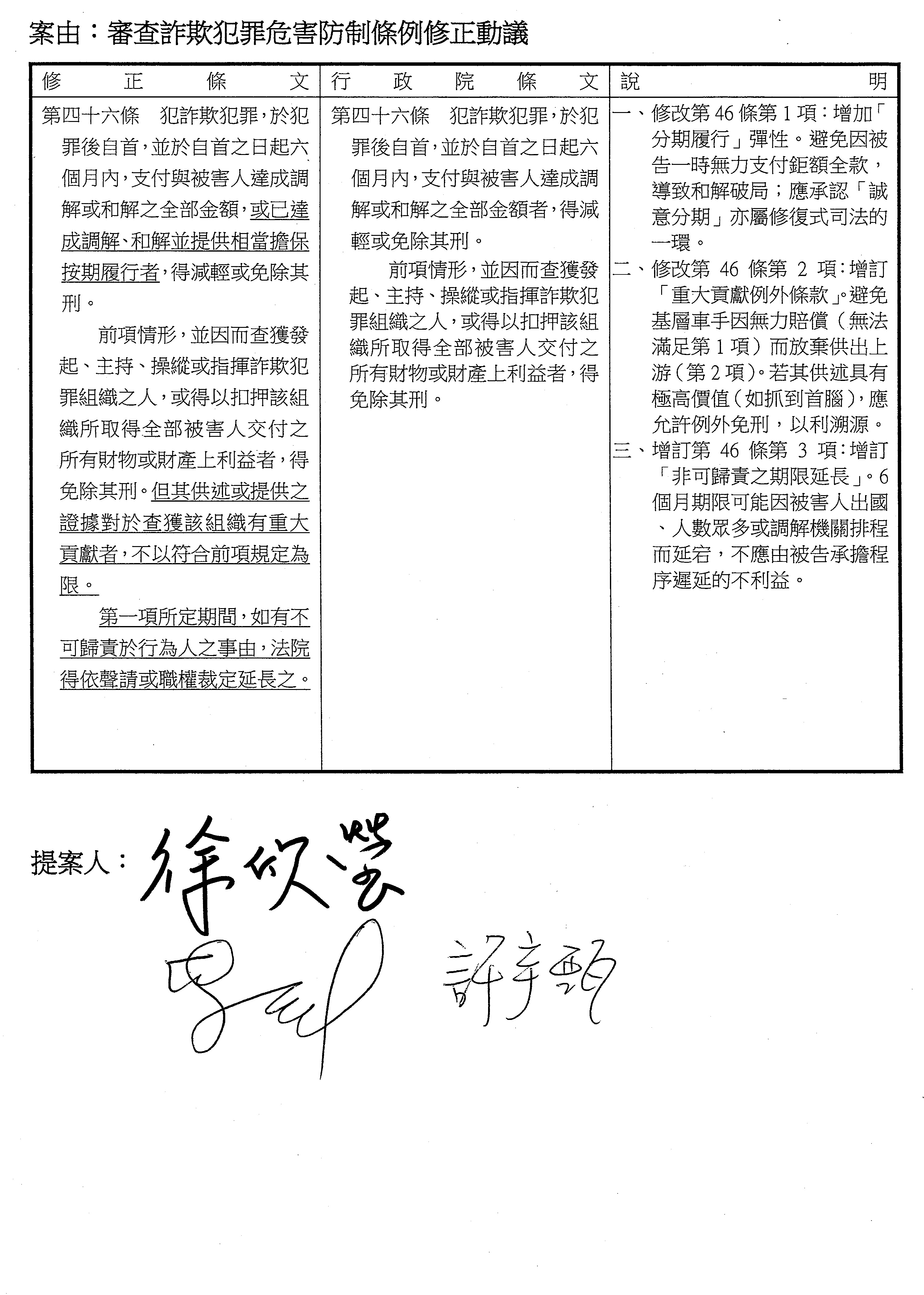 徐委員欣瑩:行政院版是你們寫出來的條文,你看看這個條文的精神是什麼,是說詐欺犯罪者如果自首之後要減輕或免除其刑,他必須要支付與被害人達成調解或和解的全部金額,他要支付全部金額又或者是他再供出首腦。你有沒有去問過啊?你們這個根本是mission impossible!這有可能嗎?他根本付不出金額。
