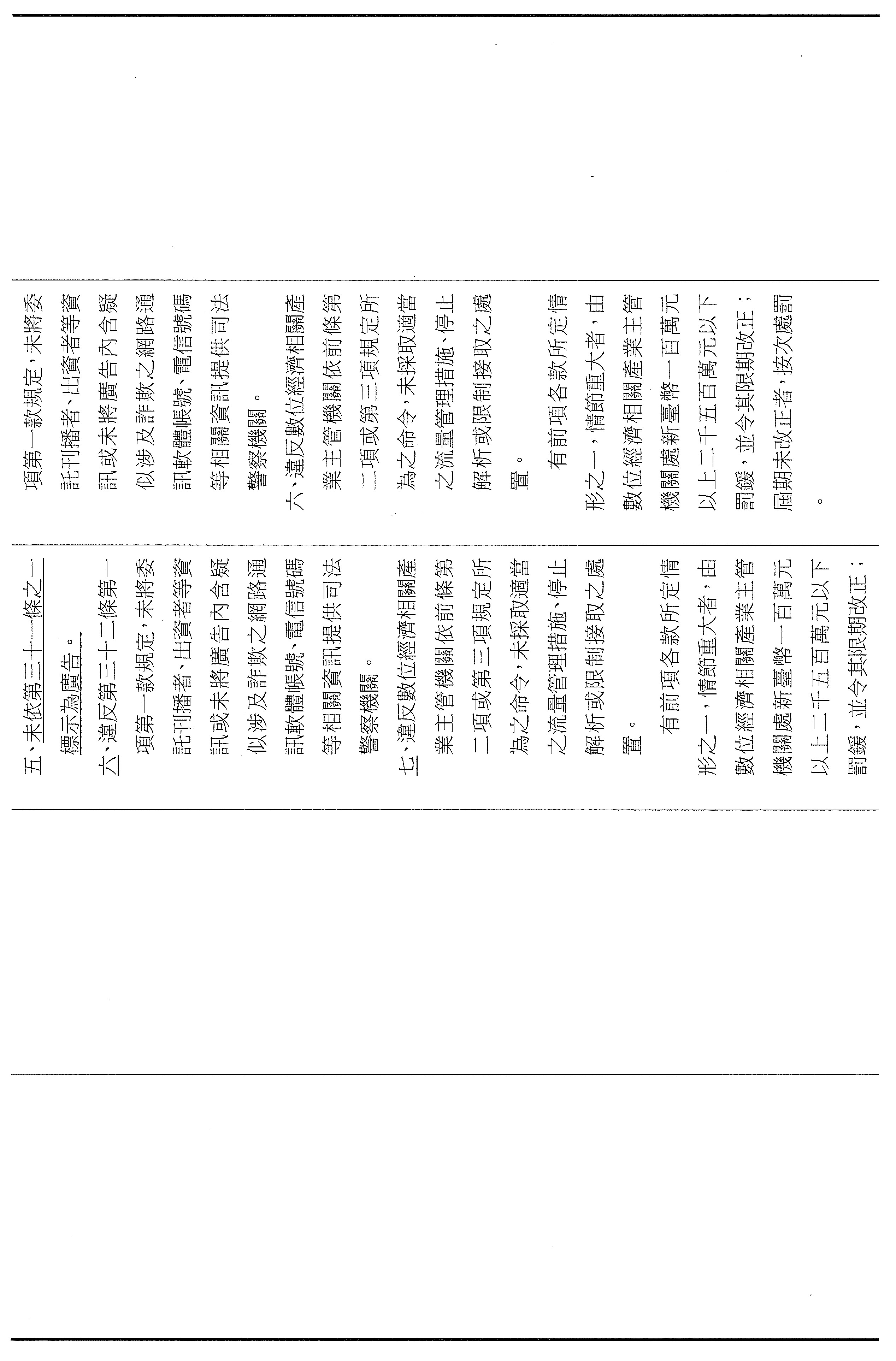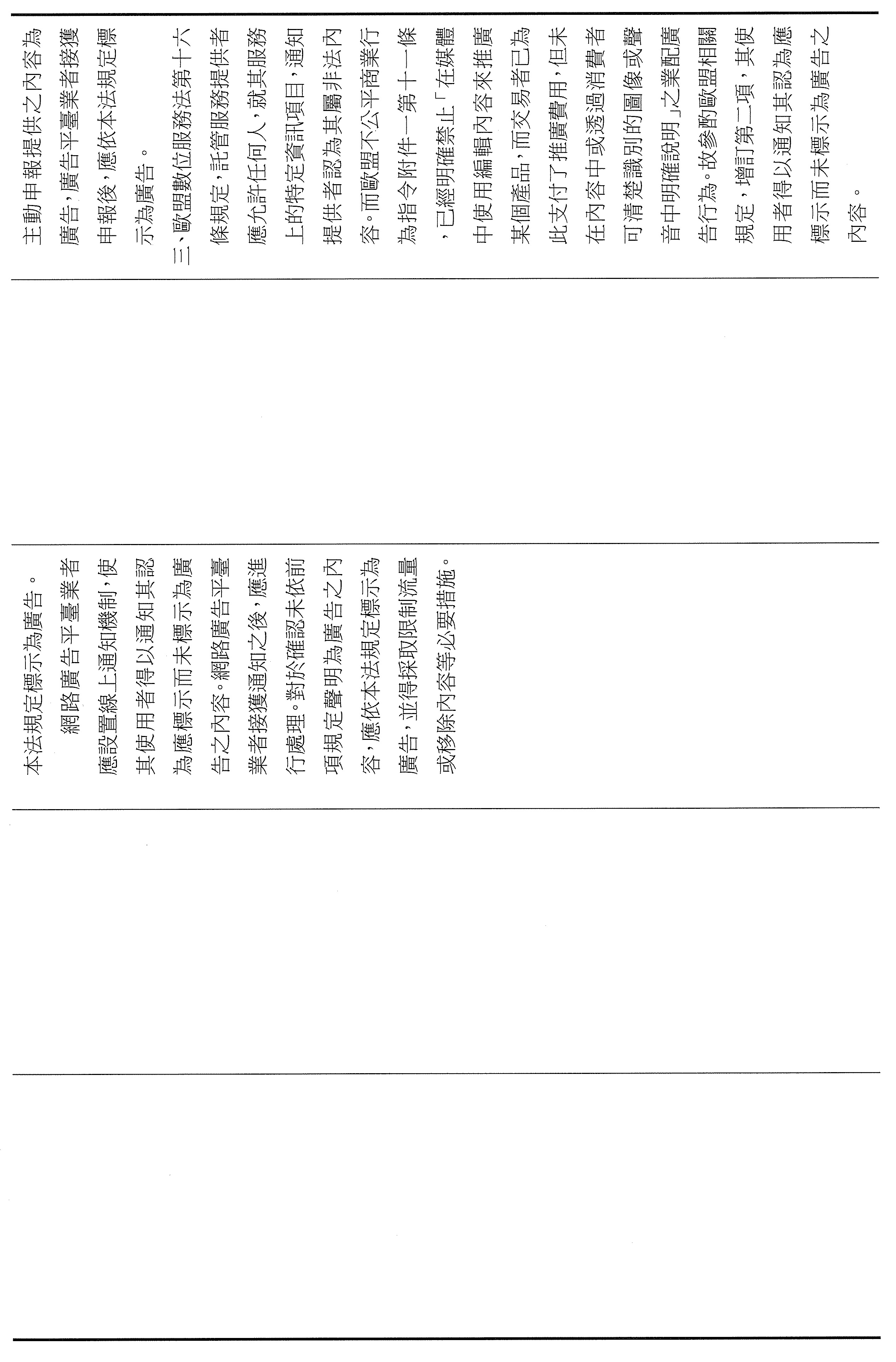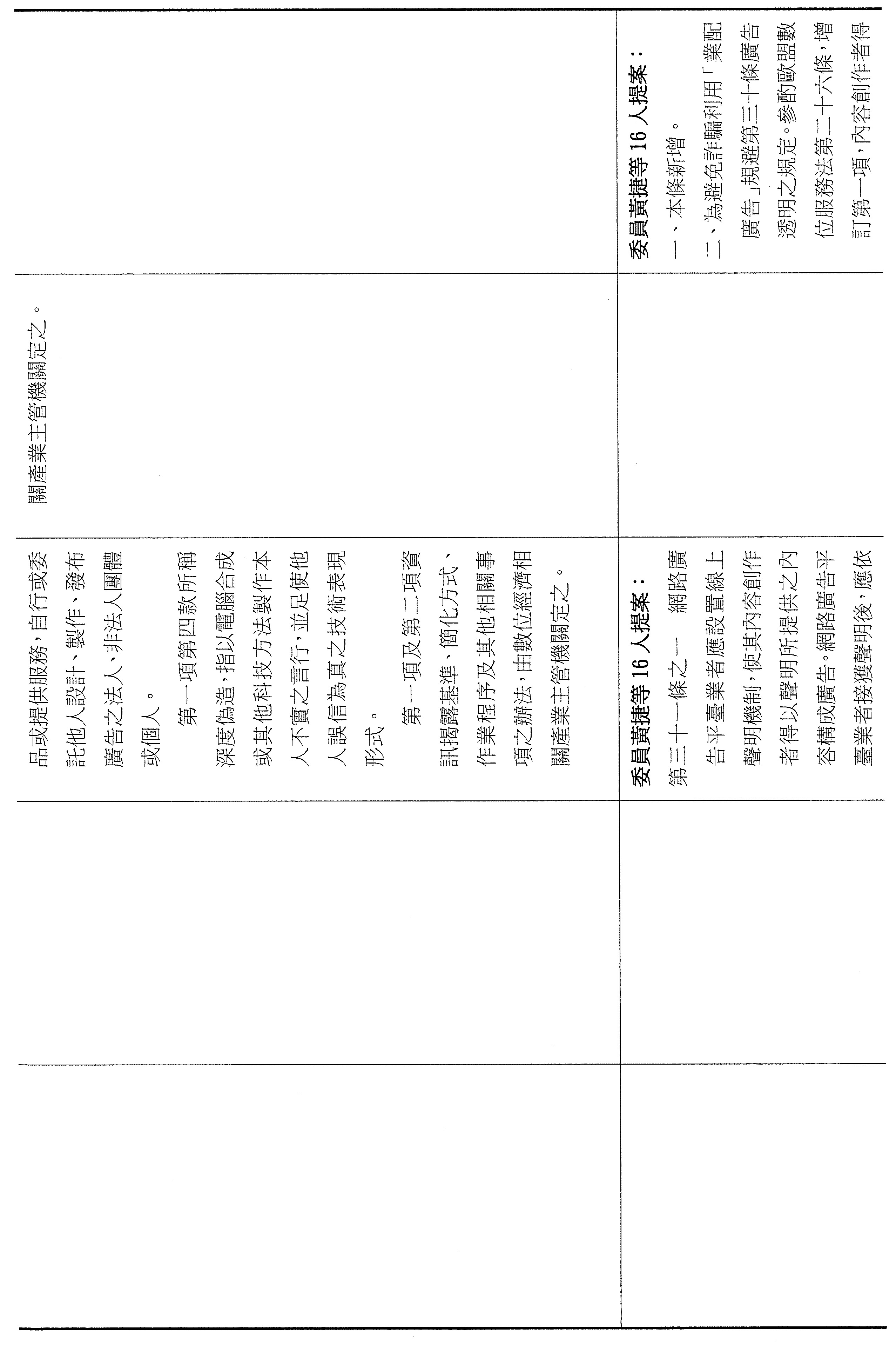 另外一部分是因為很多詐騙其實都會偽裝成試用心得,或是投顧專家、財經專家等等,用這樣的方式、用網紅的方式變成一個業配文,但是這樣的廣告其實是沒有規範的,所以我也增訂了第三十一條之一,建立創作者主動申報跟使用者的檢舉機制,如果發現應該要標示而未標示的廣告內容。就像我說的,它明明就是廣告,可是假裝是一般的使用心得、假裝是投顧或財經專家來告訴你這是他的經驗,民眾其實可以通知平臺來處理,並告訴大家這就是業配、這就是廣告,這明明內容就是涉及詐騙。如果平臺沒有依規定來處置,也面臨處二十萬至五百萬元罰鍰,以杜絕這些假推薦、真詐騙的情形。以上,謝謝。