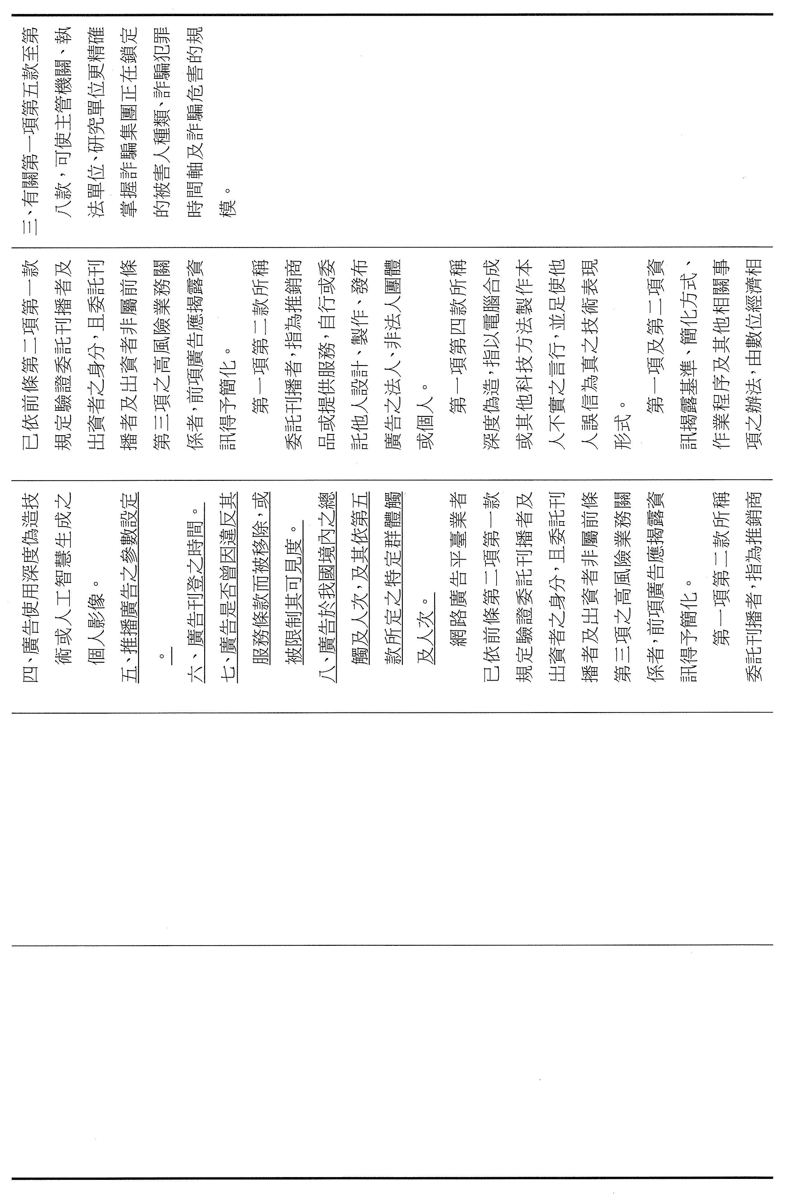另外一個部分是跟大家比較不一樣,我有加強網路廣告的透明化,我是參考歐盟數位服務法裡的精神修正第三十一條,要求網路廣告平臺業者必須要建置公開的廣告庫,強制揭露廣告推播的參數,例如廣告推播的年齡、性別、地理位置等等,還有刊登時間跟觸及數據,讓相關研究機構跟我們的執法單位都可以分析詐騙的路徑,及針對對象是不是真的投其所好。