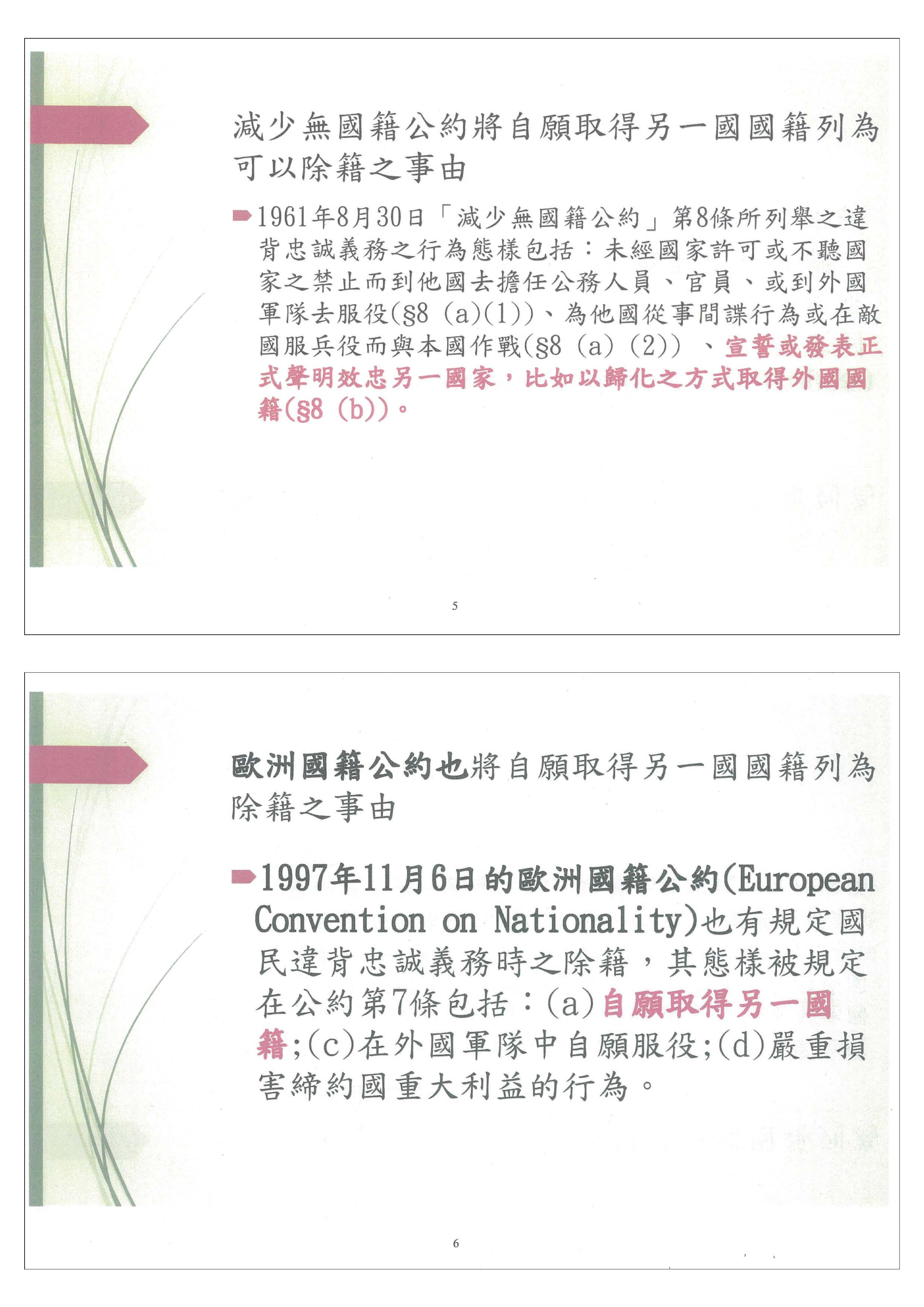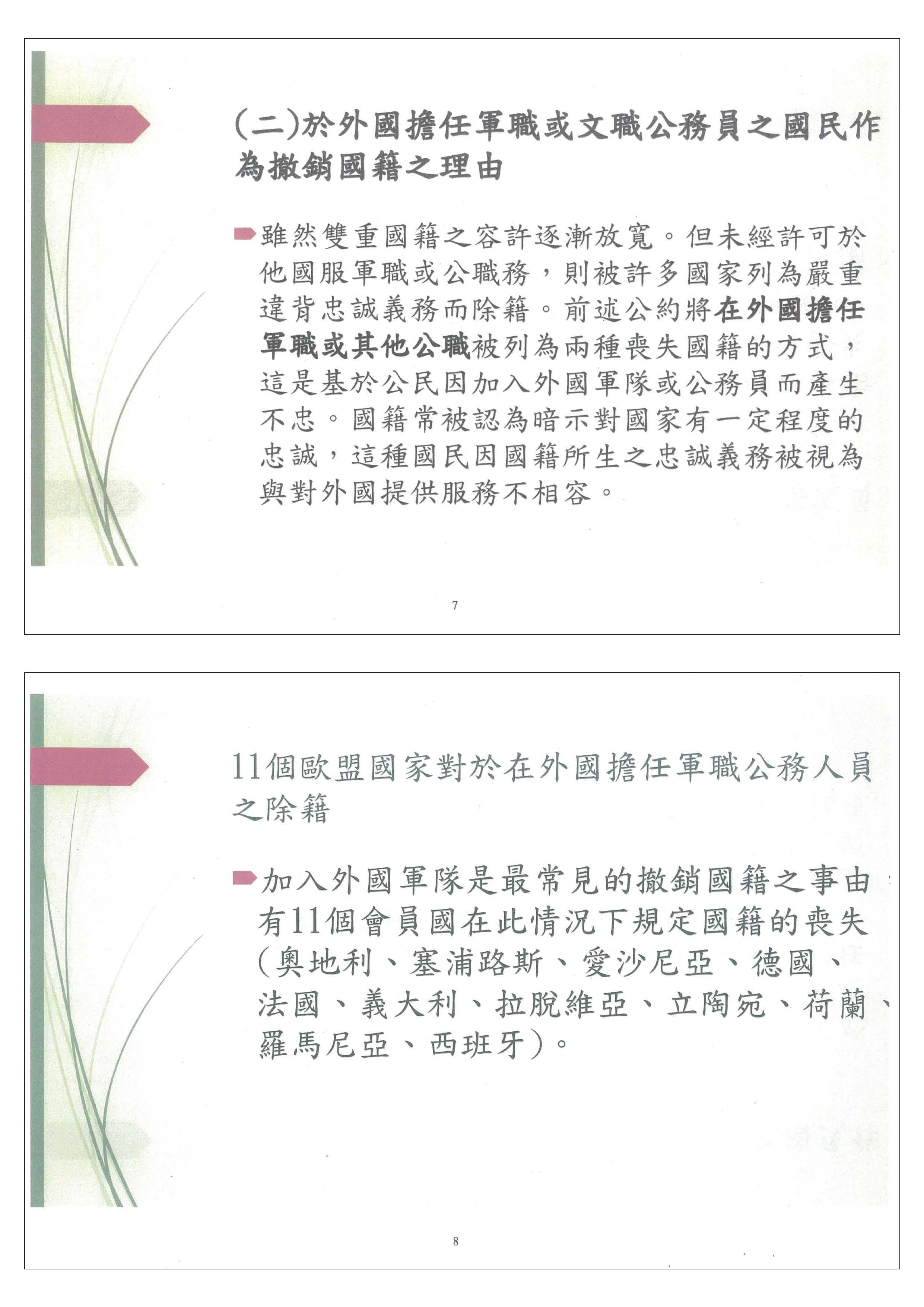 另外,關於撤銷國籍,公約裡面可以被承認的,就是你不可以去他國擔任公務人員或是去當兵,這個是特別嚴重的違反忠誠義務的衝突,這裡面有特別點出來,所以對於國民可不可以有外國國籍,同時又擔任公務人員這件事情,公約認為特別的不相容,我們在這裡必須要特別的謹慎。