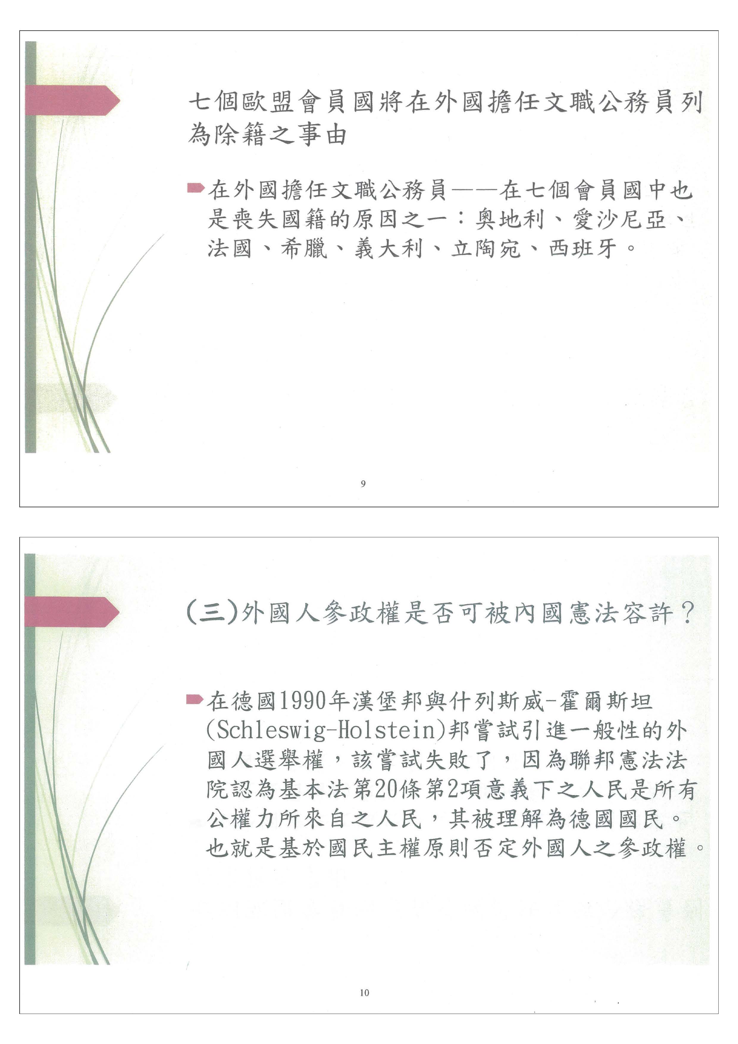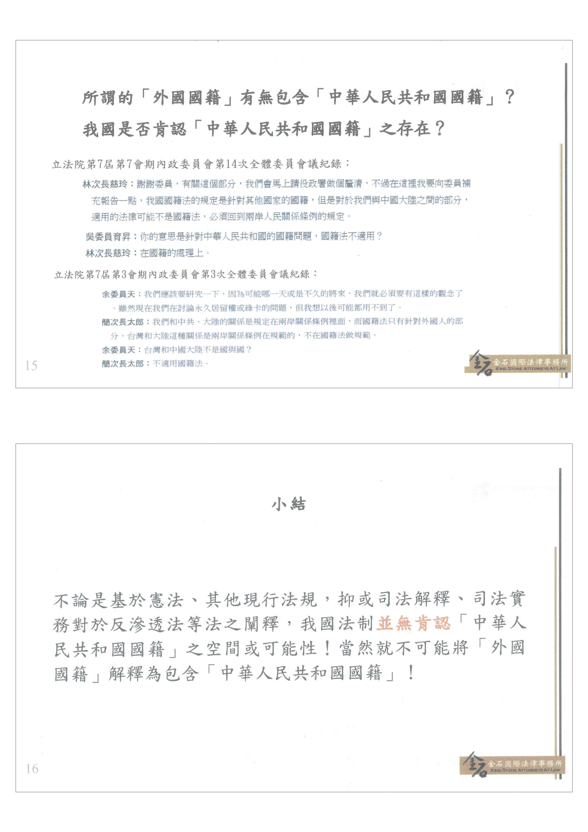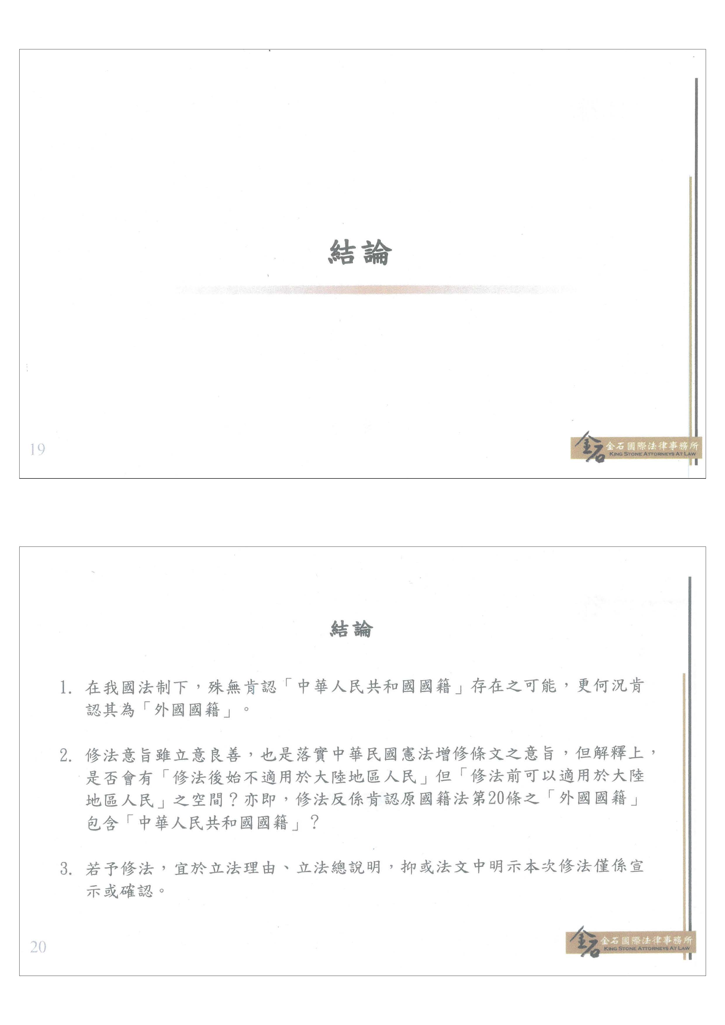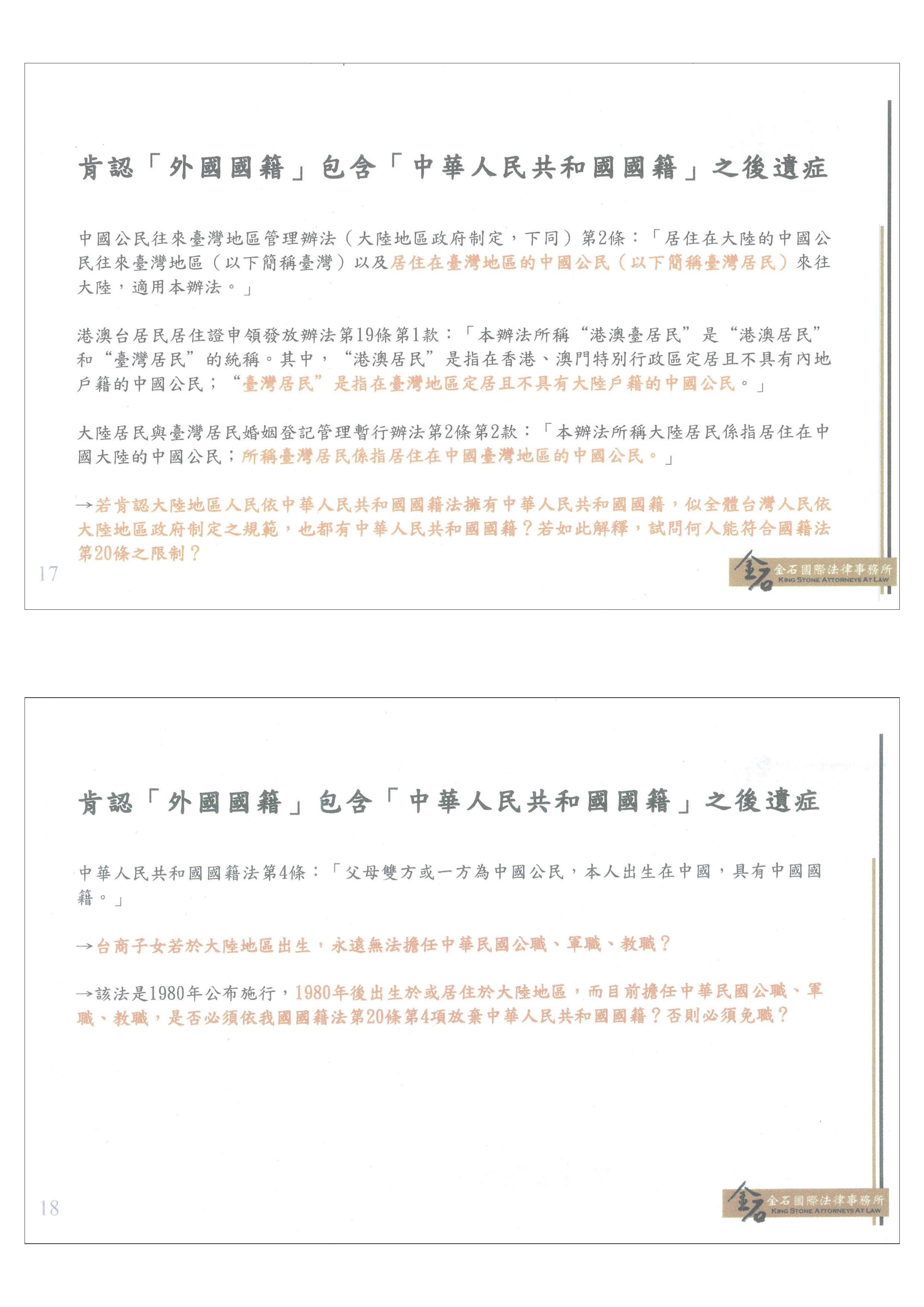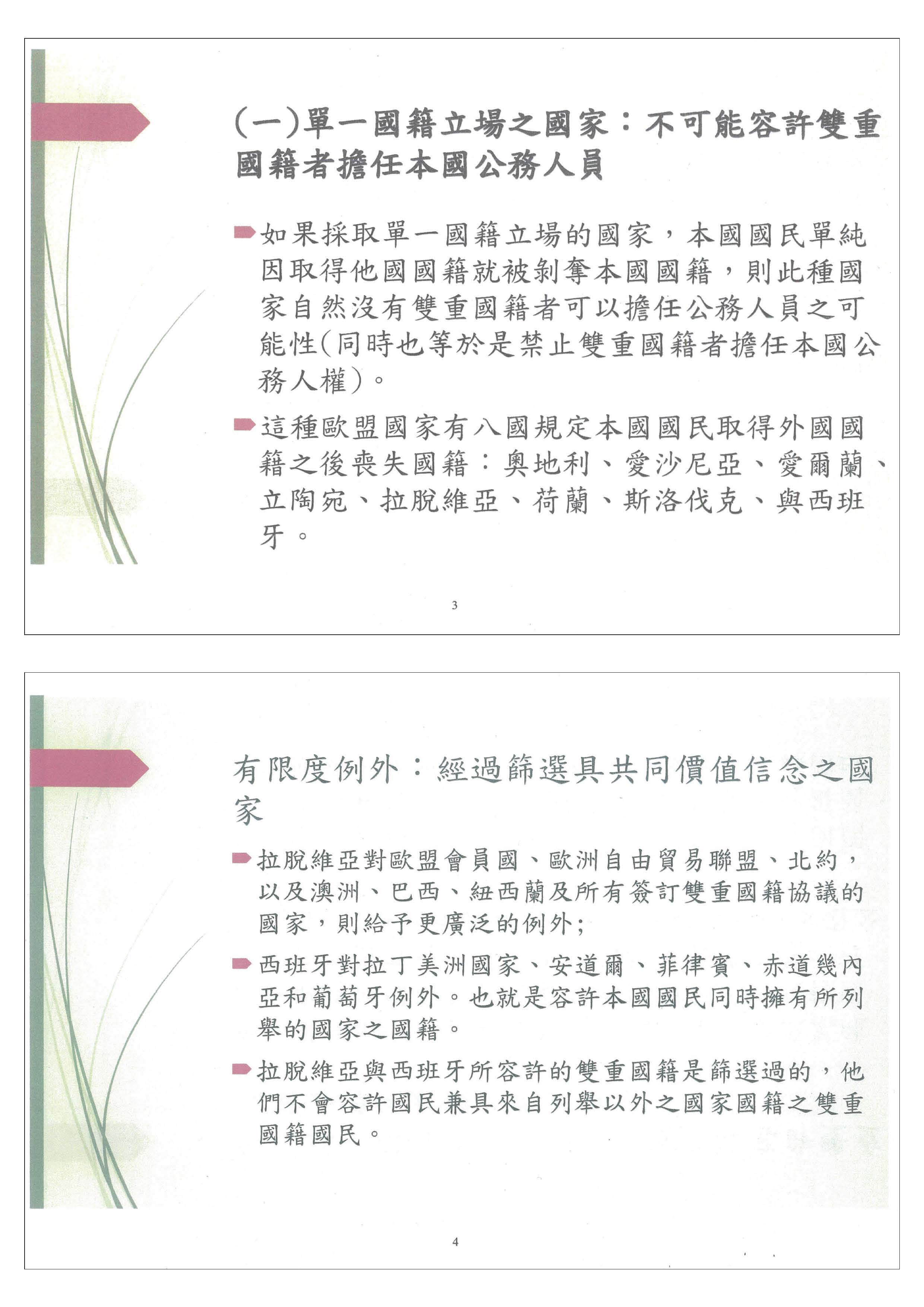 第三個,在這樣子的過程中,有提到中國是不是沒有辦法拿到放棄國籍的證明?我告訴各位,是可以的,但我不展開相關的研究,有些國家是用宣誓取代,有些國家就是要你拿到這個證明,但是中國的政策是曠日廢時,你可能要幾個月、幾年,要很長一段時間,但是國外的法庭裡是有這樣子,拿到放棄中國國籍證明之後,加入這個國籍,而且去參政的,這是第三個。