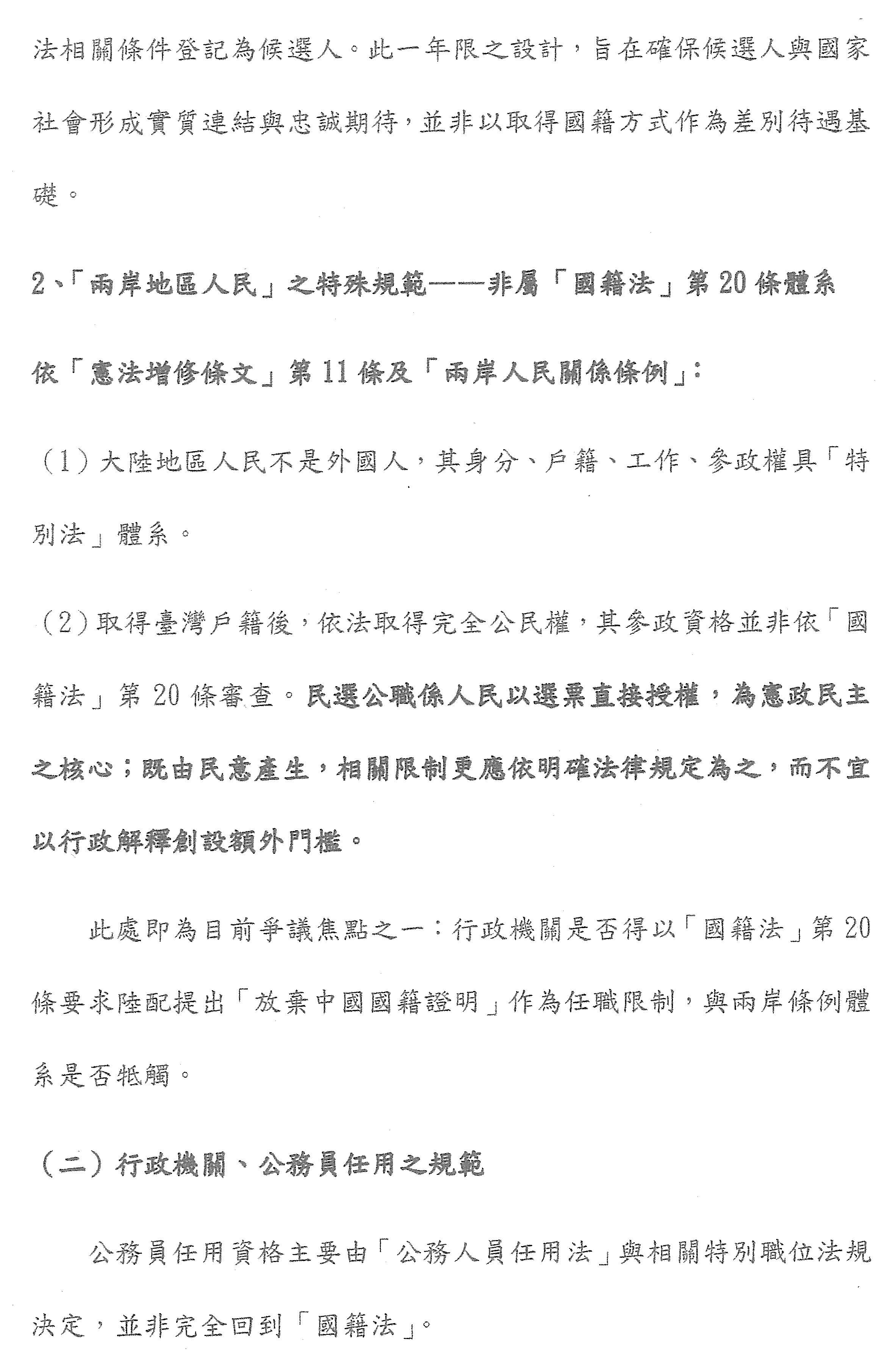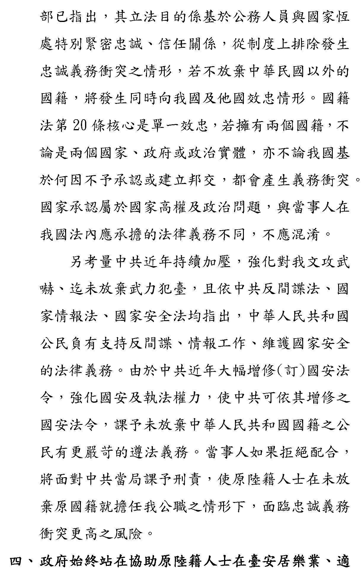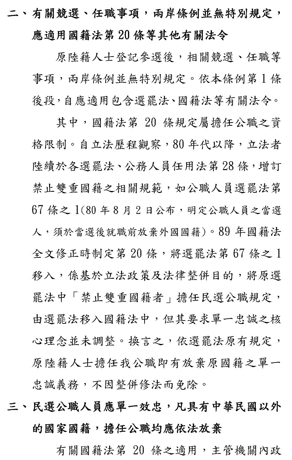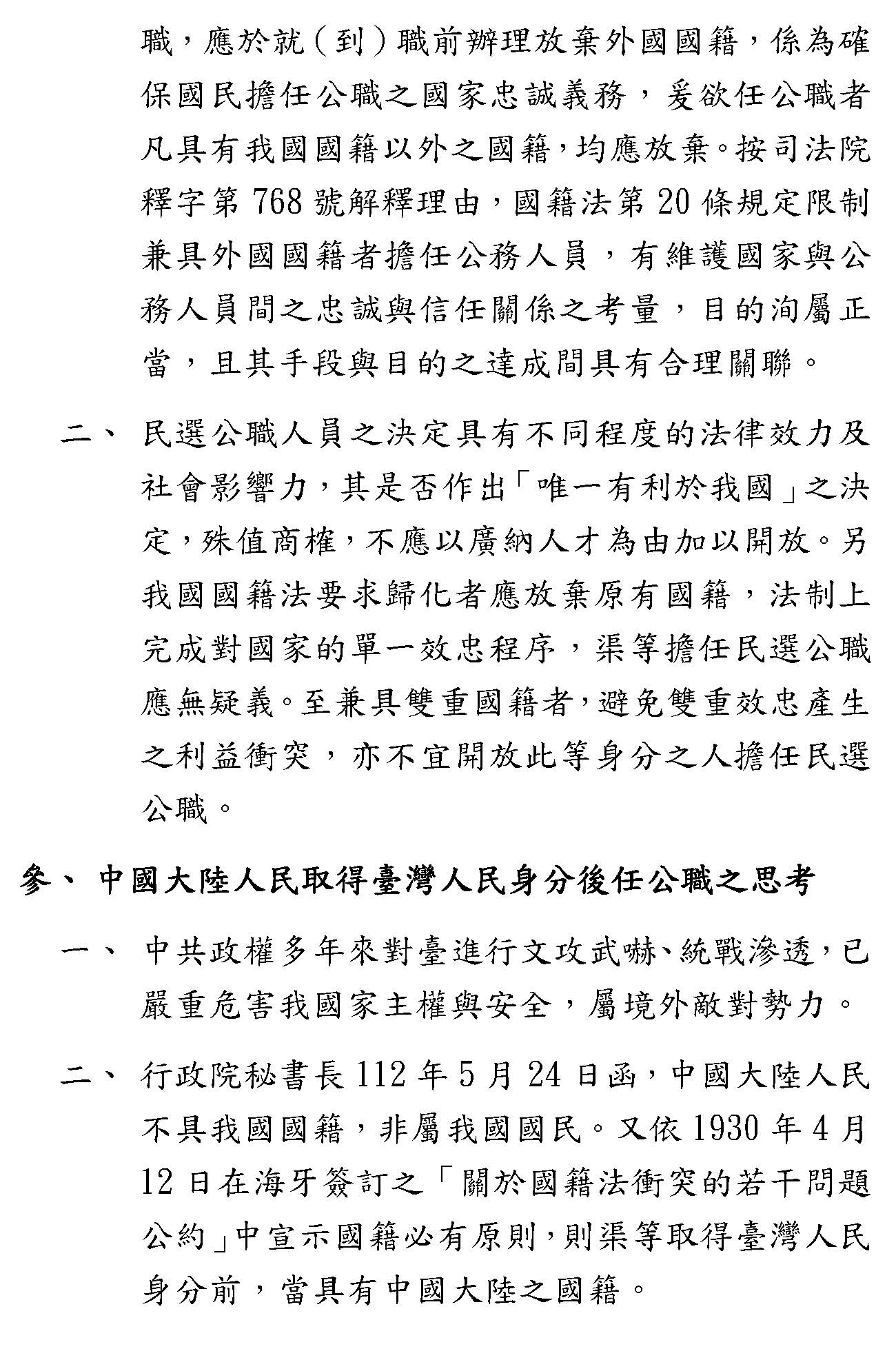 第二個部分,行政院秘書長在112年5月24日的函釋就已經一再強調,中國大陸人民並不具有我國國籍,非屬我國民,一旦取得我中華民國的身分之後,既然轉化為我國的國民,擔任公職就一定要恪遵我國國籍法第二十條之規定。