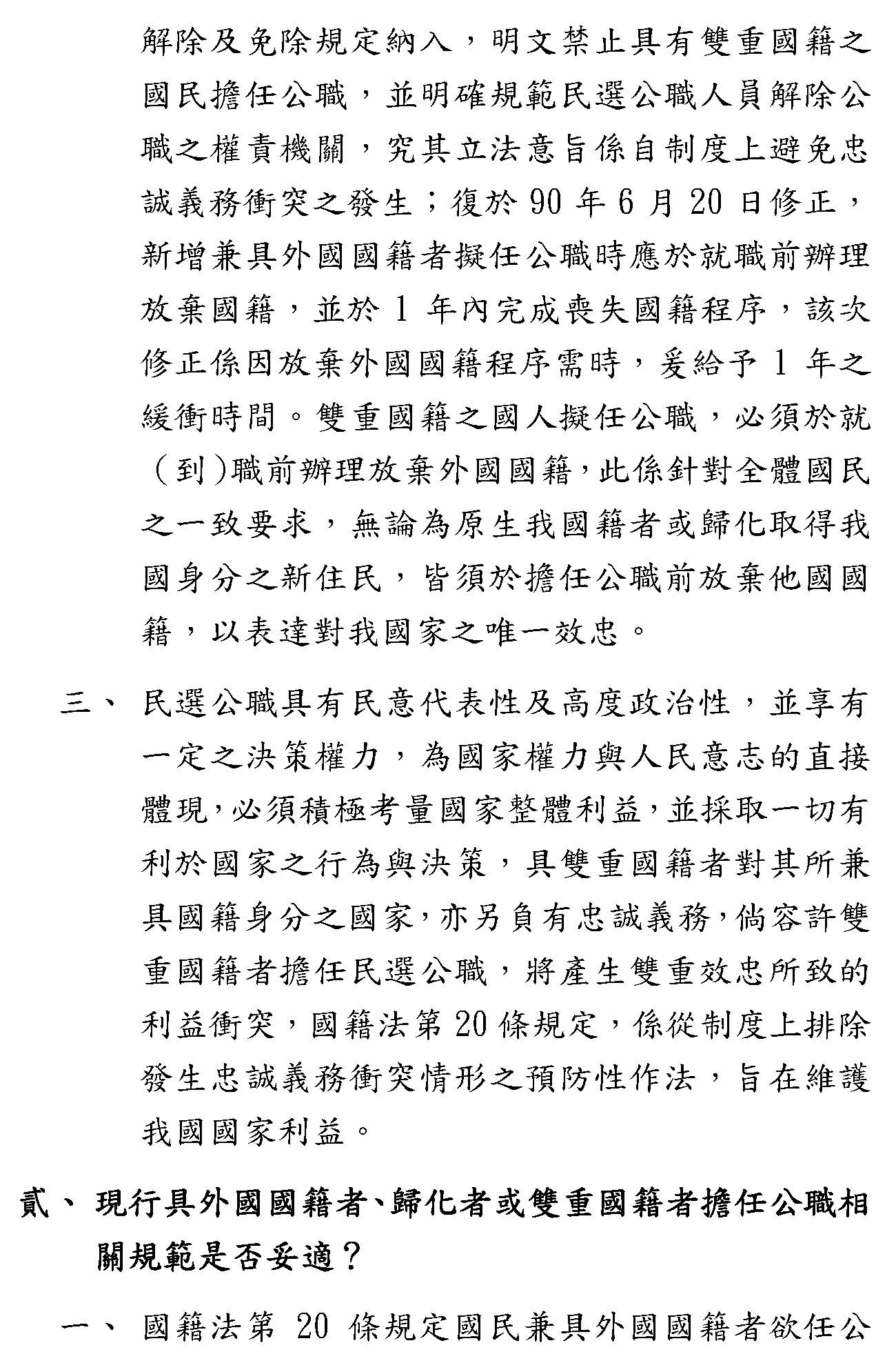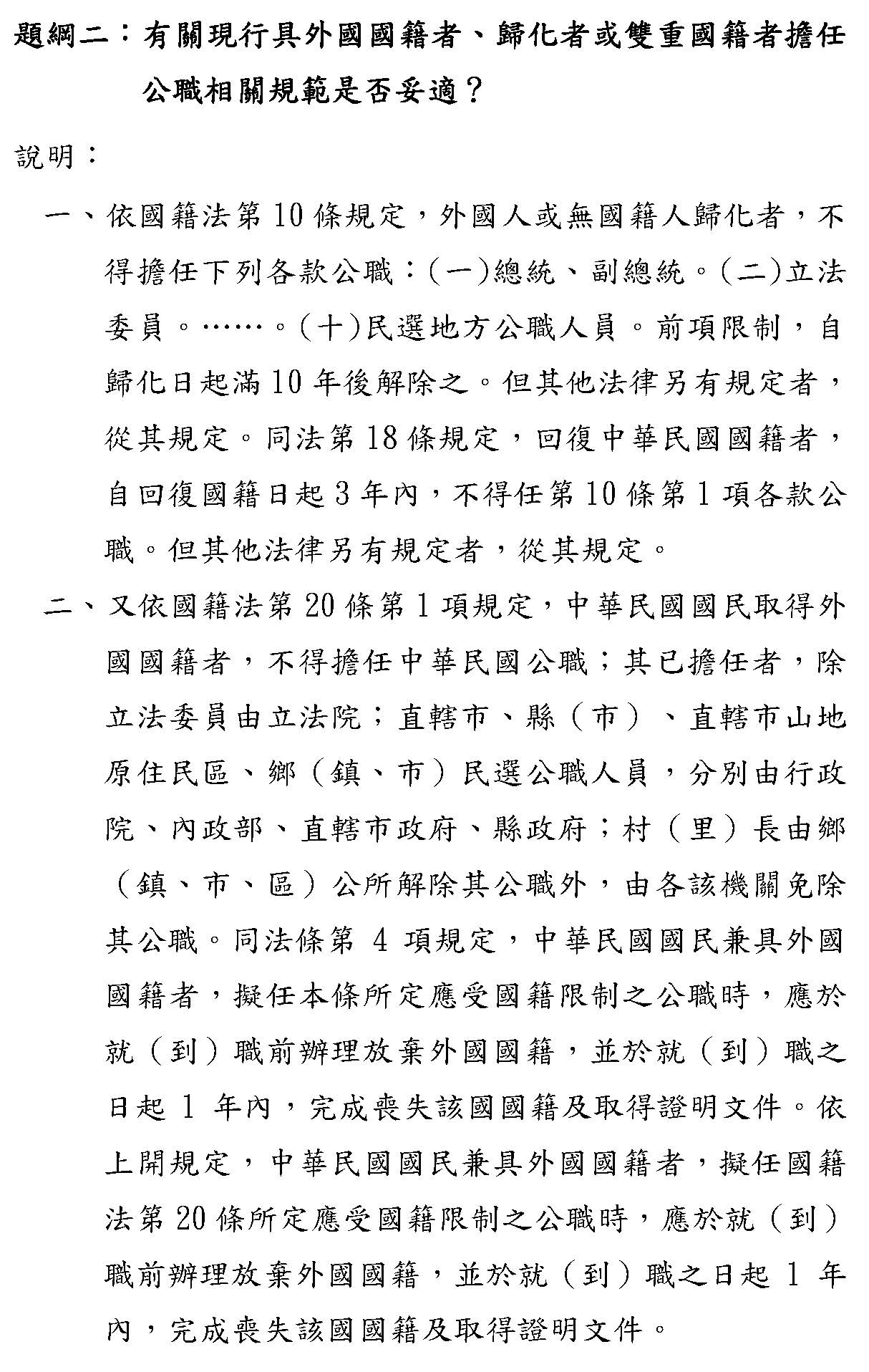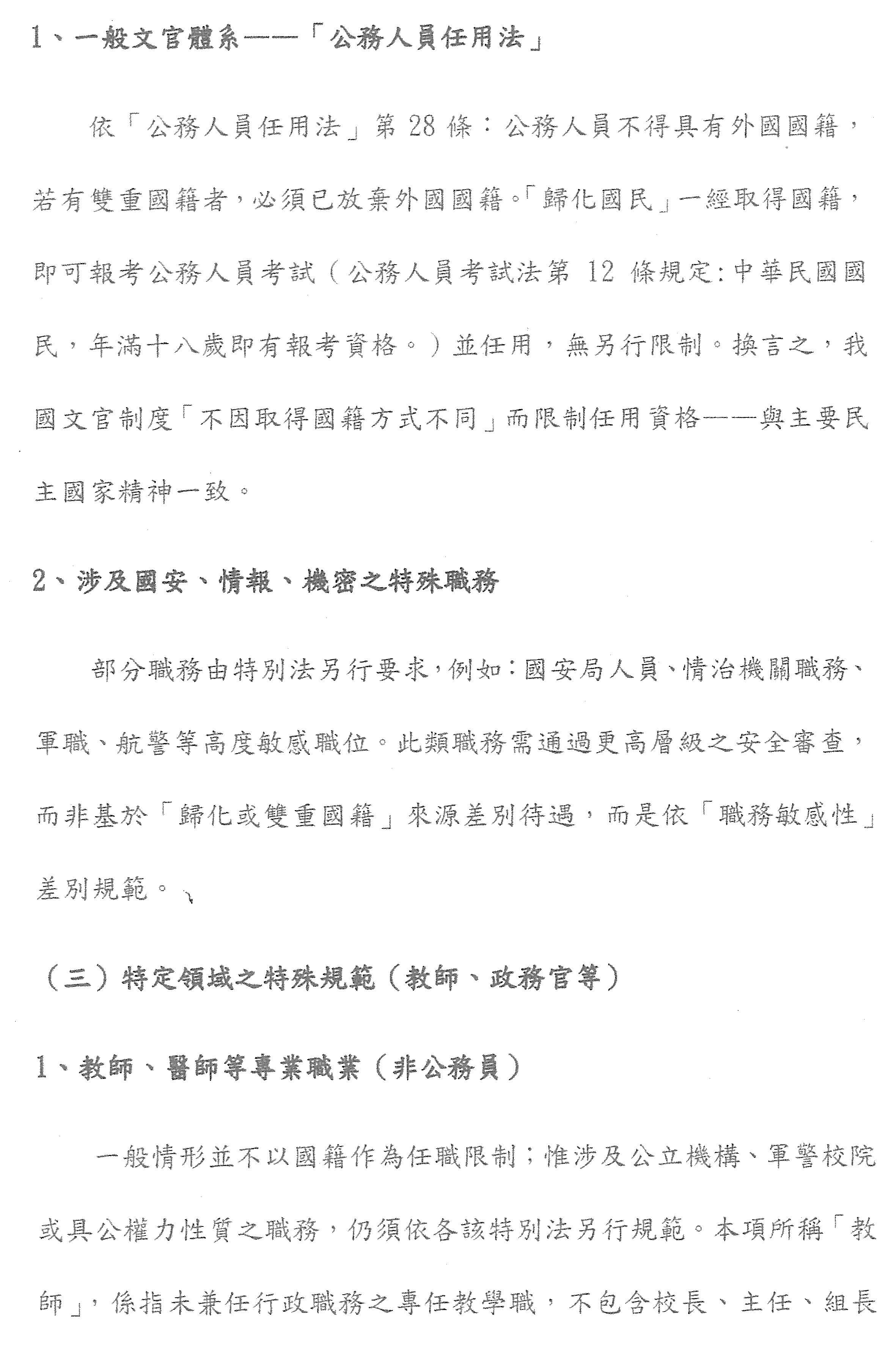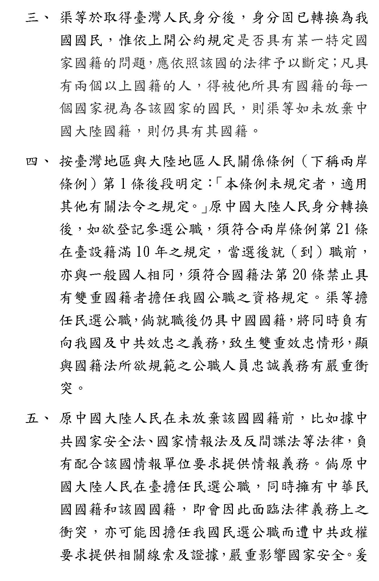 第二個部分,行政院秘書長在112年5月24日的函釋就已經一再強調,中國大陸人民並不具有我國國籍,非屬我國民,一旦取得我中華民國的身分之後,既然轉化為我國的國民,擔任公職就一定要恪遵我國國籍法第二十條之規定。