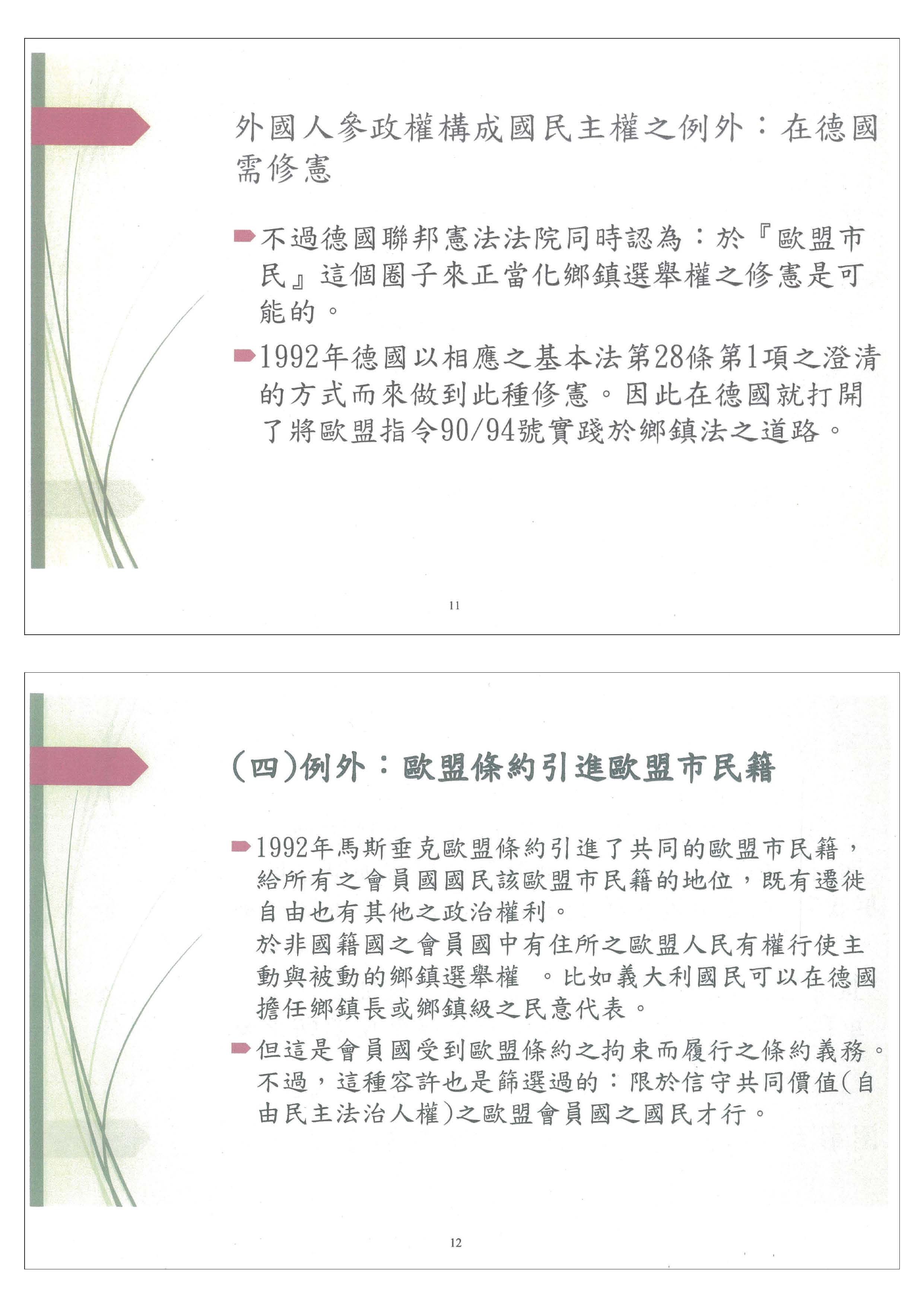 陳副教授怡凱:主席、各位先進,大家好。我是成功大學法律系副教授陳怡凱,剛剛聆聽在座許多先進的發言,我想要澄清一個觀念,當然也有很多人同時都澄清了,因為我們彼此必須要有一些對話。這裡有一個問題就是剛剛吳教授有援引公政公約第二十五條,他認為這是人權,然後也不能……但是這裡的條文是說不能任意或不合理的限制,也就是合理的差別待遇是可以的,而且並沒有所謂各國都允許外國人通通可以毫無條件、無限制的參與公民權或是投票權。1990年德國的漢堡邦和Schleswig-Holstein邦都有提出要引進外國人的投票權,但是這個法通通被德國聯邦憲法法院宣告違憲,他的理由是根據基本法第二十條,所有國家權力來自於人民,所謂人民指的是德國國民,而不是外國人,就是說他已經……但是德國因為受到歐盟條約的拘束,而歐盟條約在馬斯垂克條約的時候就已經引進所謂的歐盟盟籍或是歐盟公民權籍,它的意思是凡取得會員國國籍者,就通通都是歐盟的公民者,也就是歐盟的盟籍。因此他就引進歐盟國家境內鄉鎮地區的選舉權與被選舉權,也因此歐盟國家在這個限度內就例外的容許,比如義大利人到德國的杜賓根市,他可以去投票,也可以被選為杜賓根市的市長,以及他也可以投票去選歐洲議會的議員,他不必回國,在德國就可以投票了。但這是因為有一個前提,你必須是歐盟國家,然後都是信守民主、自由、法治、人權的這些歐盟國家,也就是說,他會篩選出跟他的理念、共同價值是相近的,為什麼會這樣子呢?因為國籍的涵義是來自國際法,而國際法是含有國民對國家負擔忠誠義務,國家對國民負擔保護義務的相互權利義務關係,所以不是我們自己可以隨便解釋。