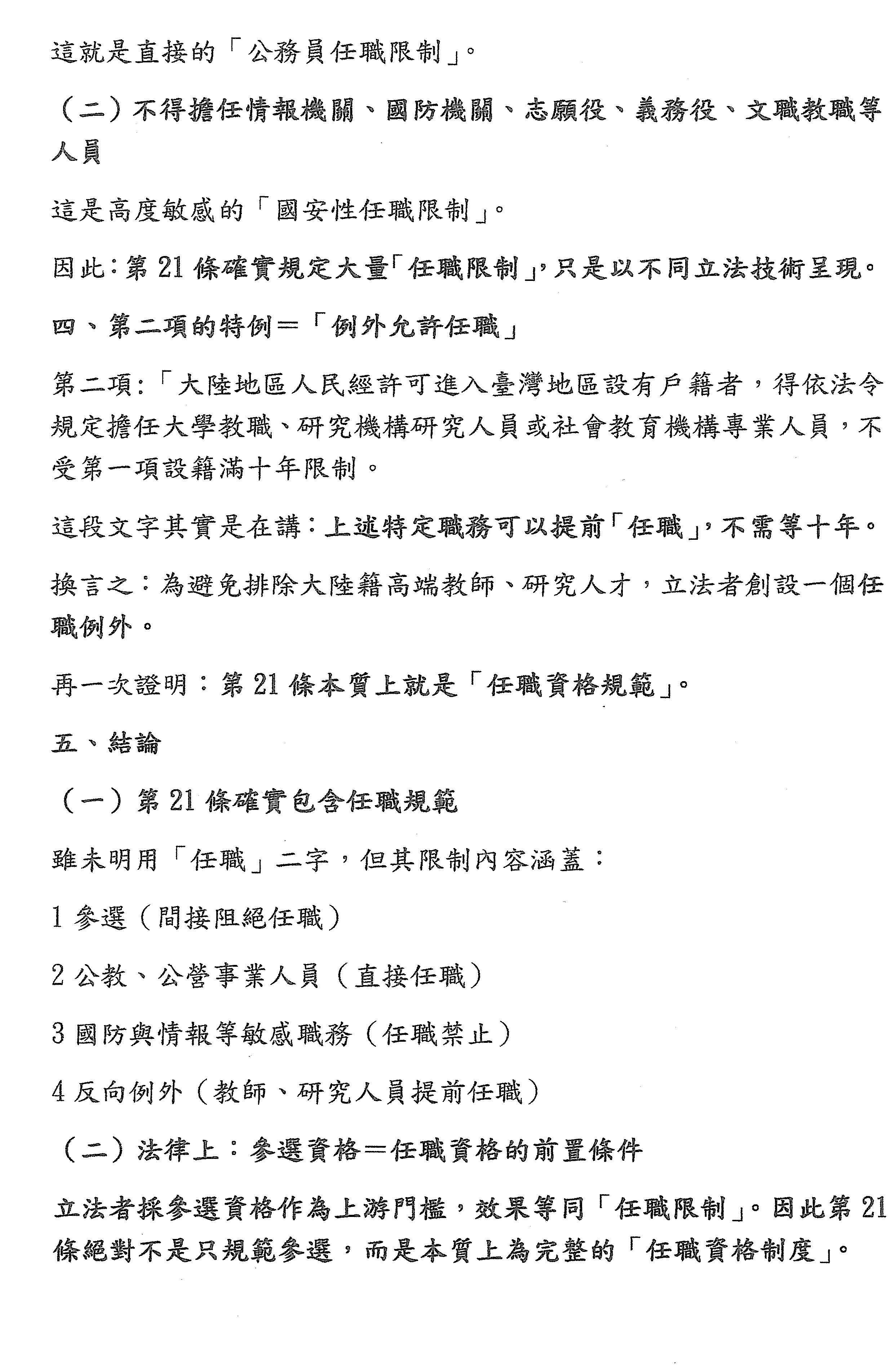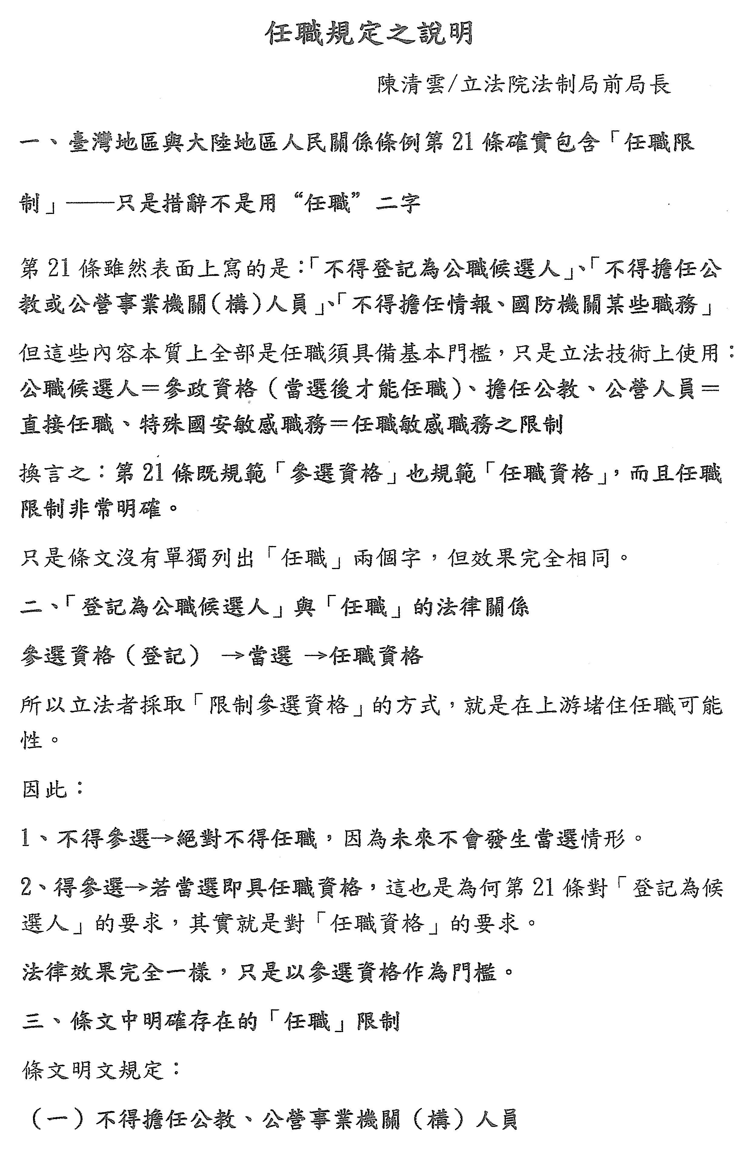 兩岸人民關係條例第二十一條有規定一些項目,我現在簡單跟各位報告,有關任職的限制,它只是措辭不用「任職」兩個字,但第二十一條表面上是寫:不得登記為公職候選人、不得擔任公教或公營事業機關(構)人員、不得擔任情報機關(構)人員,或國防機關某些職務等等,這些內容本質上都是任職必須具備的一個基本門檻,只是在立法技術上的使用。公職候選人必須取得參政的資格,因為沒有登記參選就不可能當選,而當選後才能任職;擔任公教、公營事業機關(構)人員就等於是直接任職;特殊國安敏感職務就是任職敏感職務的限制。所以我們在第二十一條裡面規範所謂的參選資格就是規範任職的資格,而且任職限制非常明確,只是條文因為立法技術上的關係,並沒有列出「任職」這兩個字,但是效果完全相同。