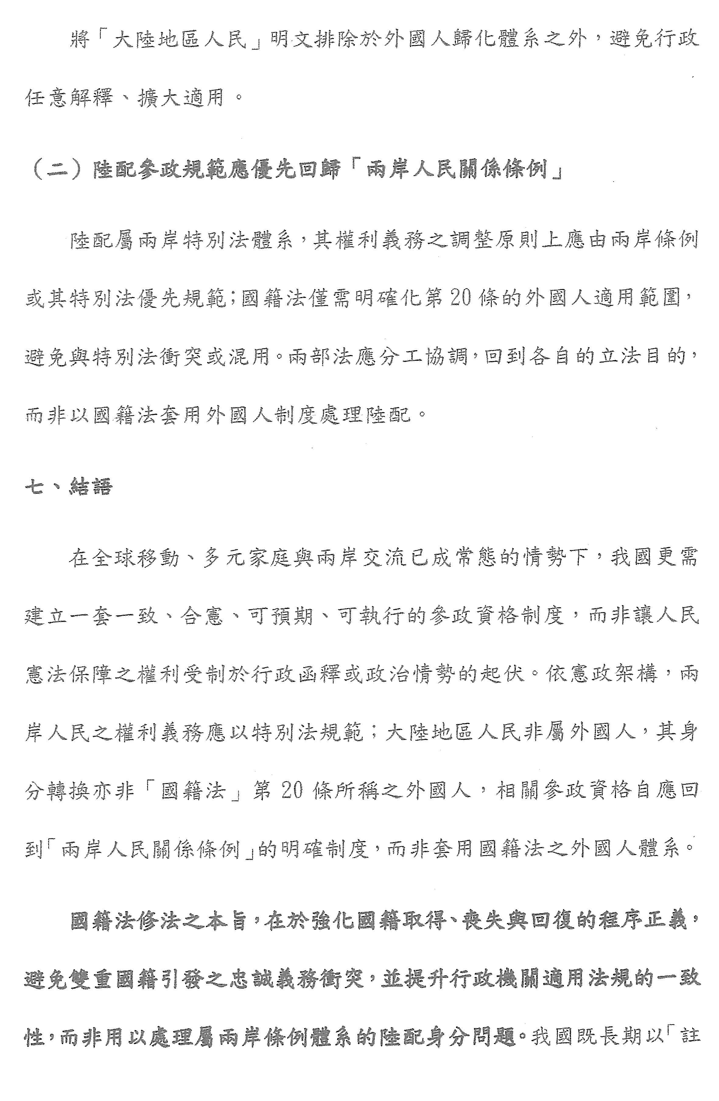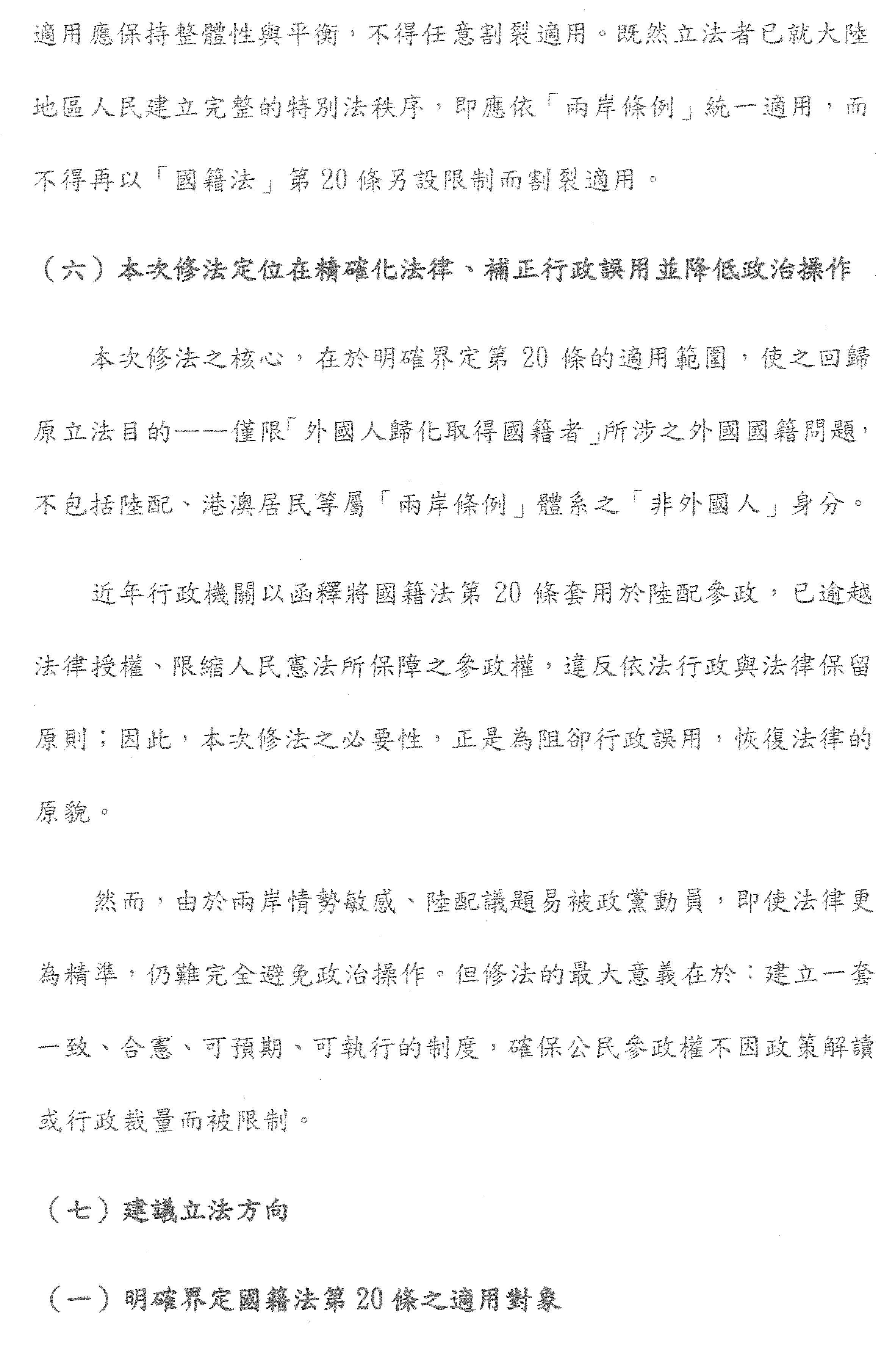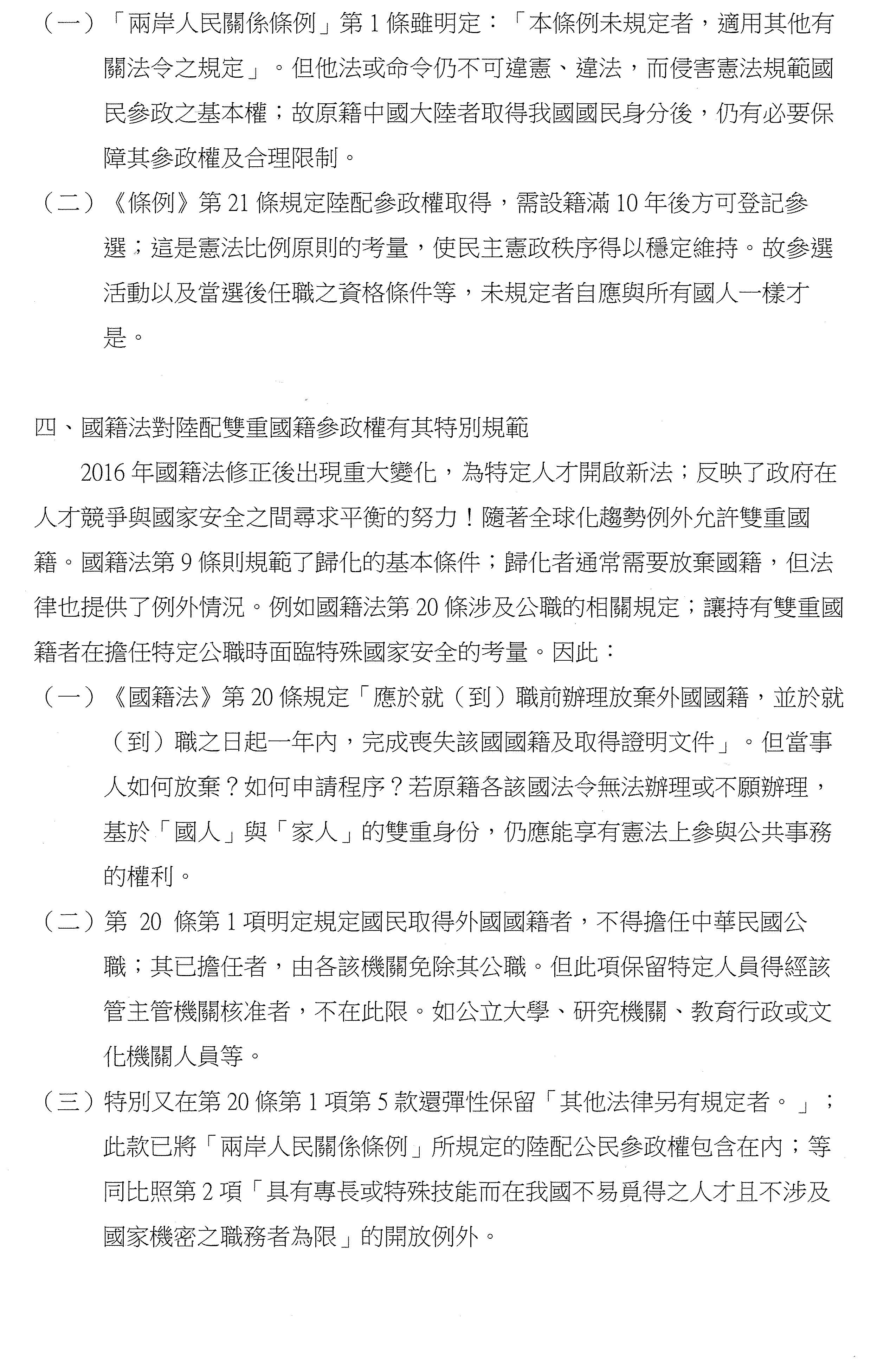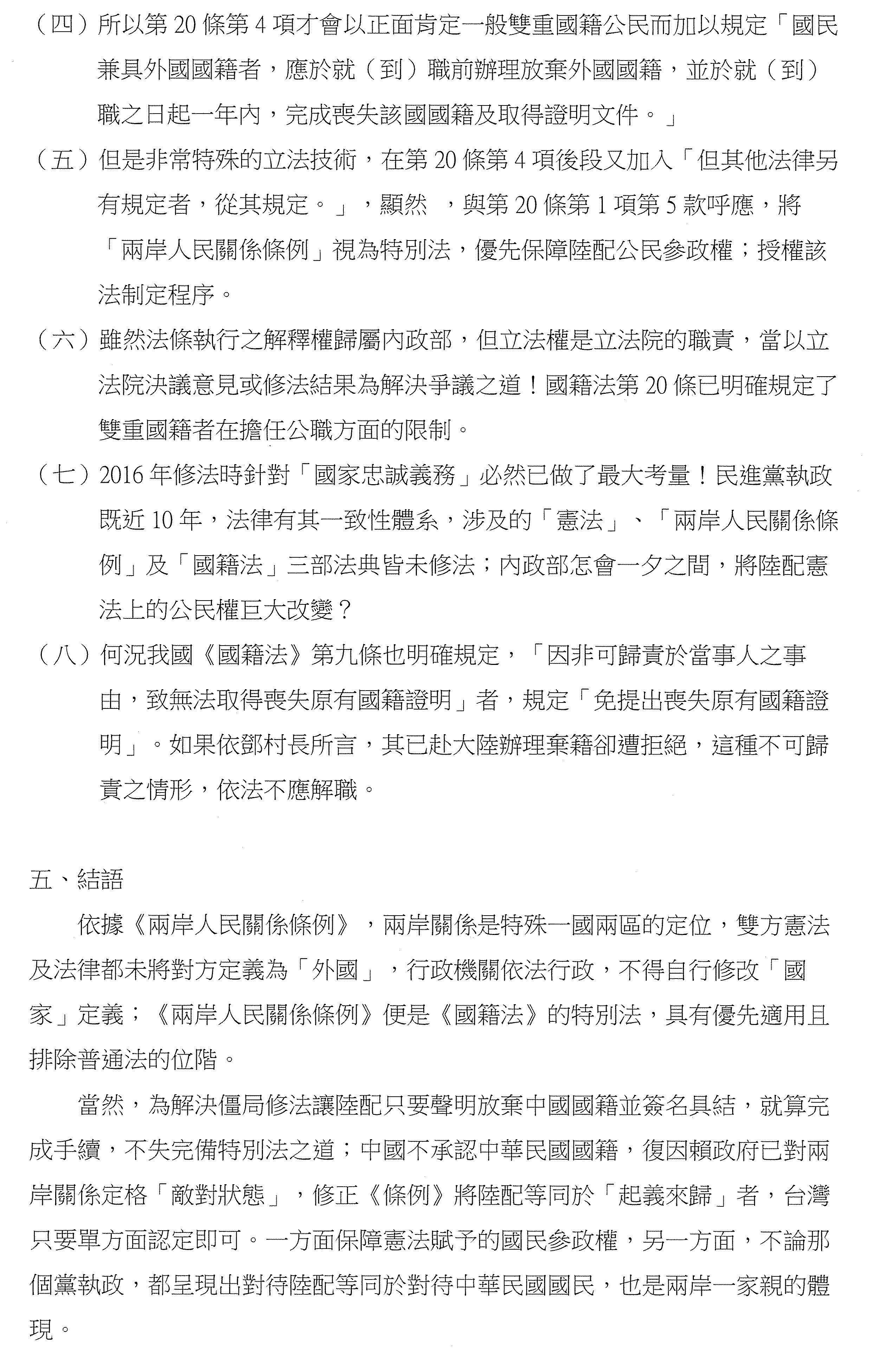 因此第五項,我文章裡面的第五項可以看得出來,這是一個非常特殊的立法技術,在106年的時候,在第二十條第四項後段加入「但其他法律另有規定者,從其規定」,所以這個基本上就是跟它的第一項第五款相互呼應嘛!為什麼?因為國籍法就尊重兩岸人民關係條例為特別法,國籍法本身就變成了普通法,因此它在第二十條第一項第五款以及後面的第四項給了這樣一個彈性,所以我認為目前立法院作成決議意見也好,修法意見也好,都應該保障公民的參政權。