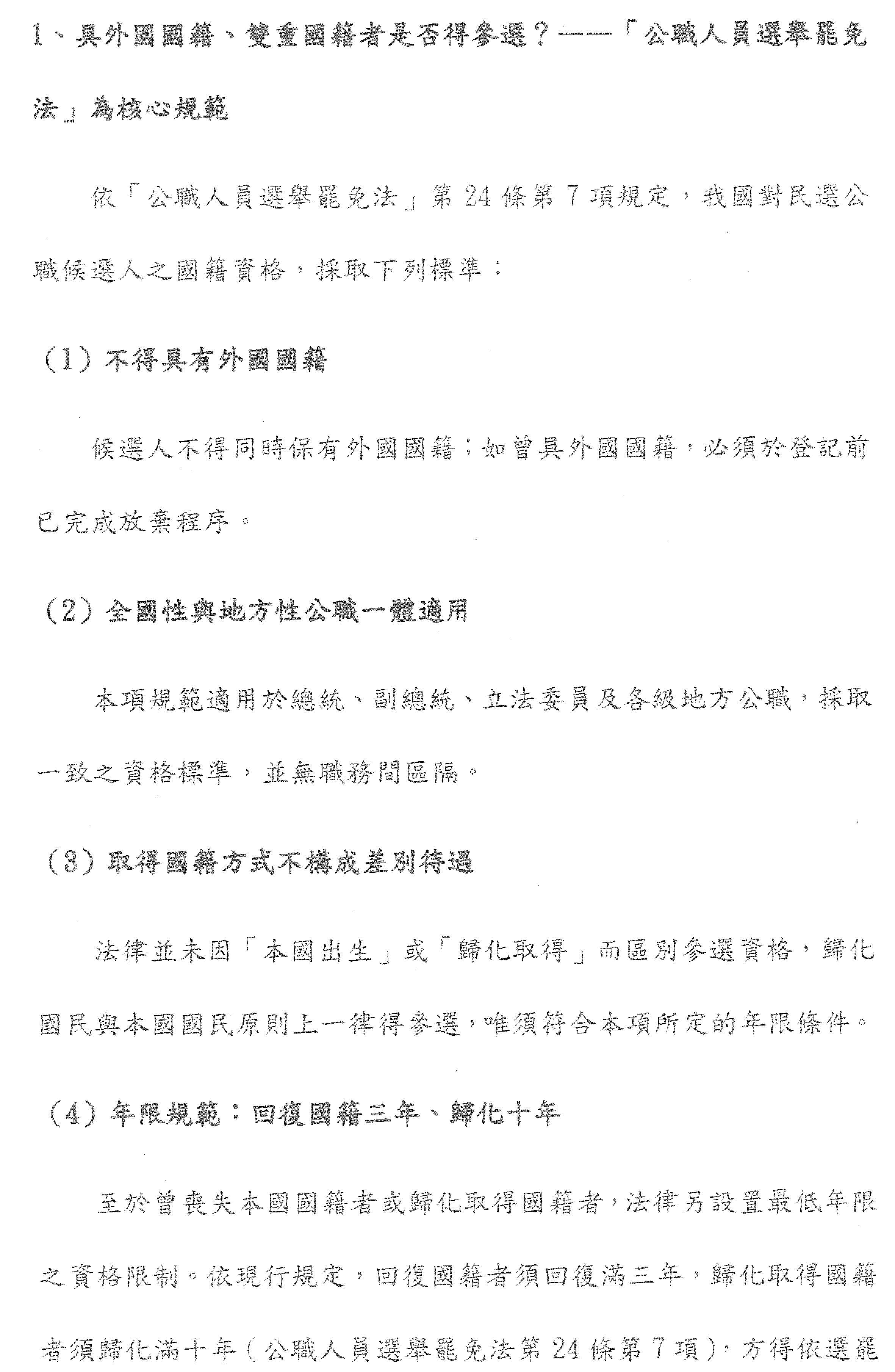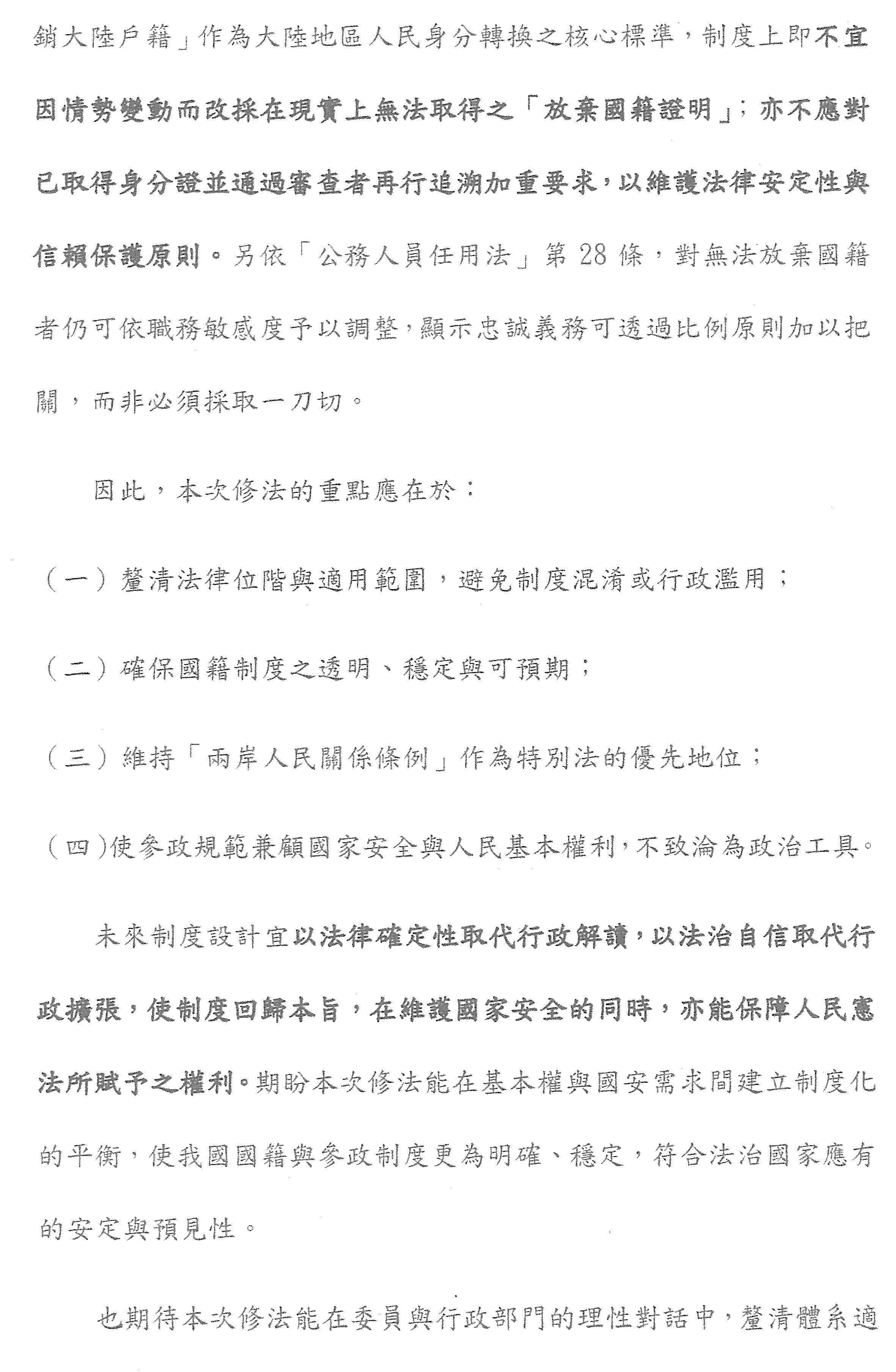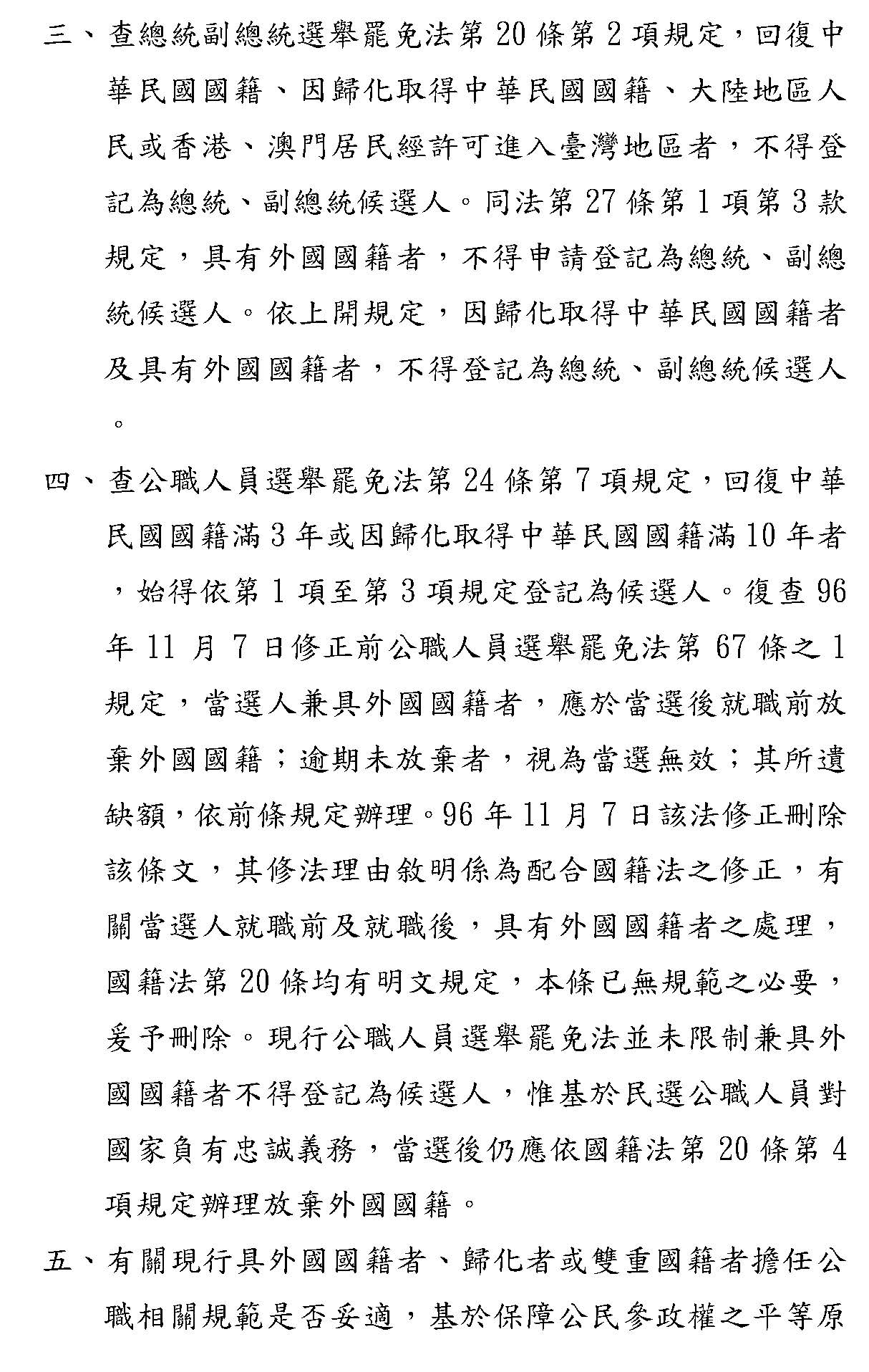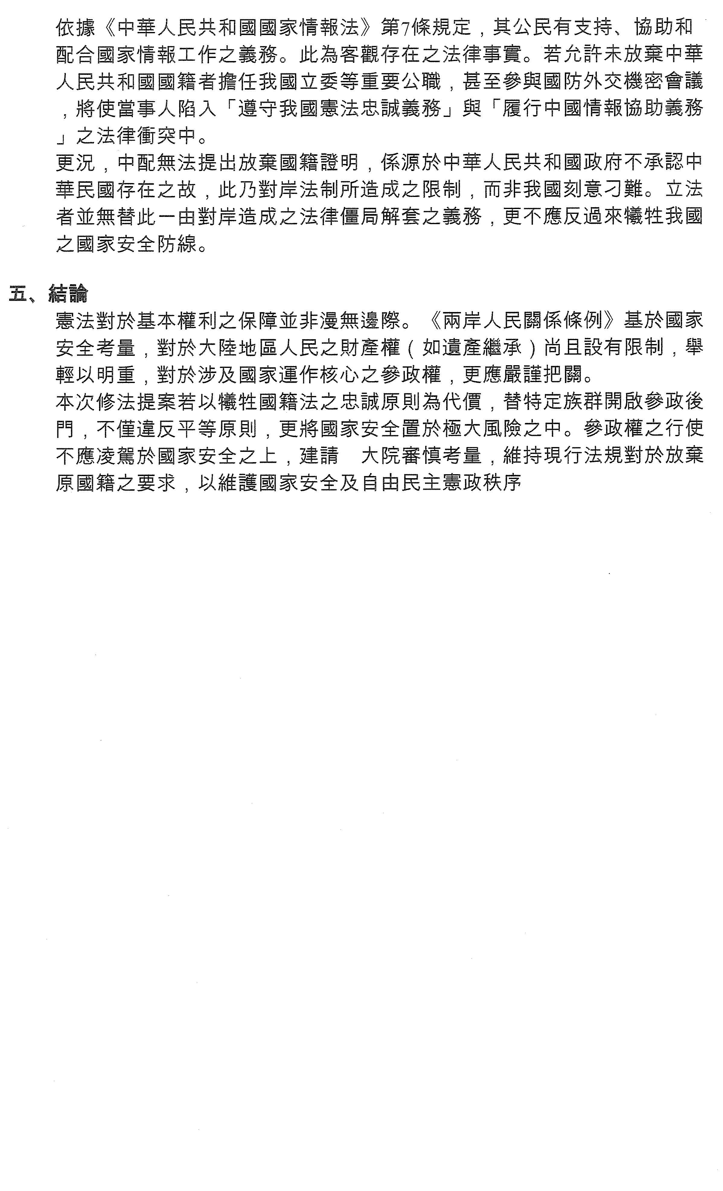 因此第五項,我文章裡面的第五項可以看得出來,這是一個非常特殊的立法技術,在106年的時候,在第二十條第四項後段加入「但其他法律另有規定者,從其規定」,所以這個基本上就是跟它的第一項第五款相互呼應嘛!為什麼?因為國籍法就尊重兩岸人民關係條例為特別法,國籍法本身就變成了普通法,因此它在第二十條第一項第五款以及後面的第四項給了這樣一個彈性,所以我認為目前立法院作成決議意見也好,修法意見也好,都應該保障公民的參政權。