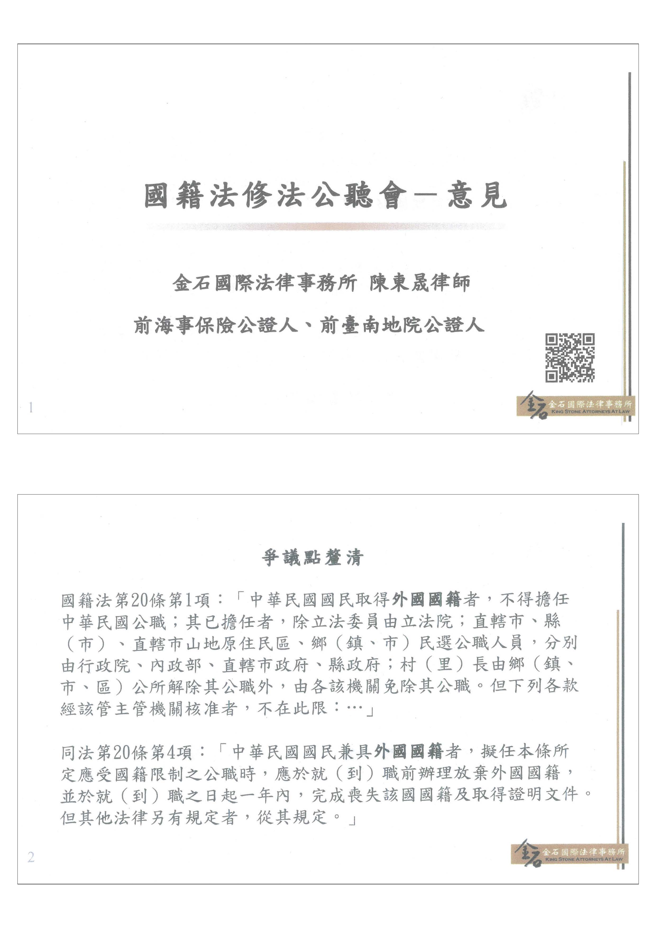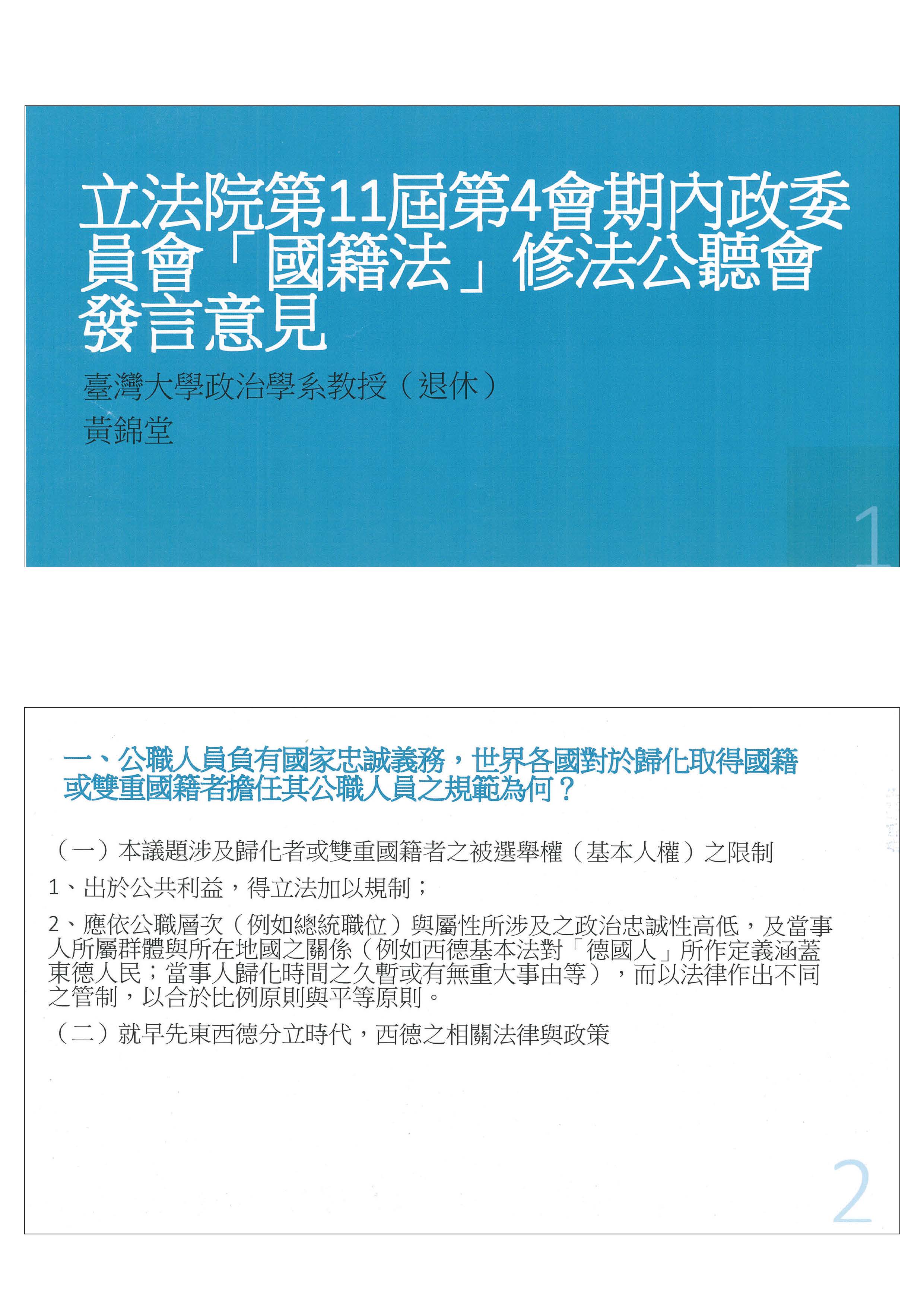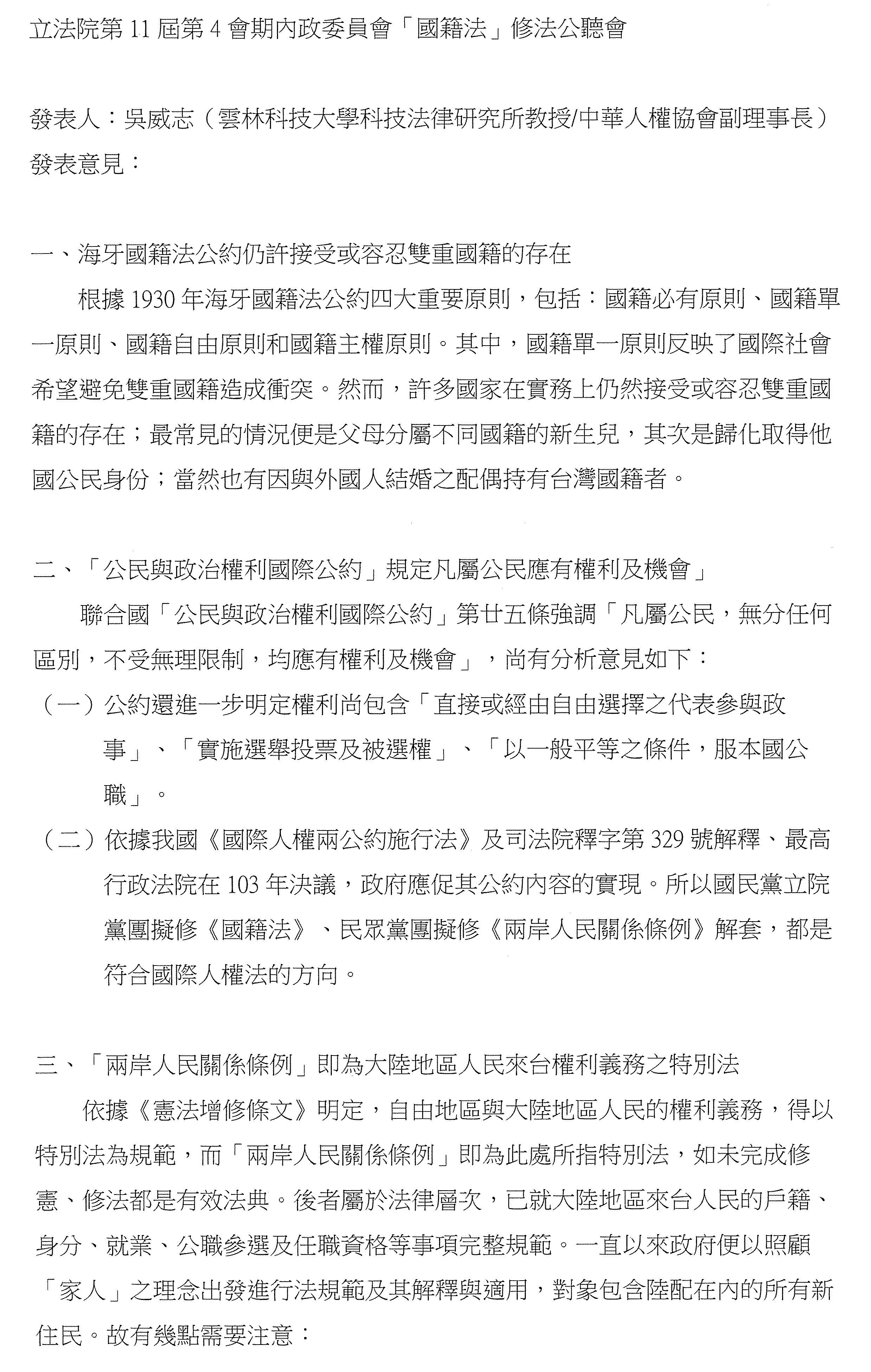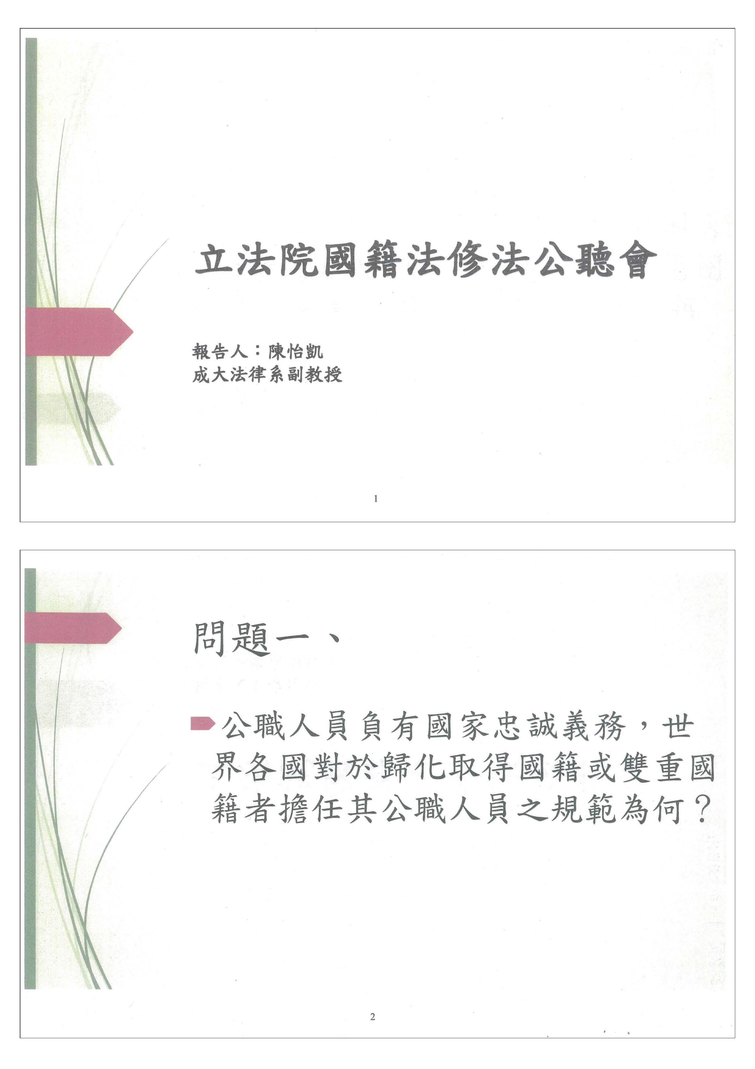 我是雲林科技大學科技法律研究所教授,也是中華人權協會副理事長。我所提供的資料裡面,第一個部分,海牙國籍法公約是不是接受或者是容忍雙重國籍的存在?我們看到1930年的國籍公約,雖然是主張國籍單一原則,但是許多國家實質上容忍雙重國籍的存在,而且這種容忍雙重國籍的存在是以規劃取得公民的身分為主,所以雙重國籍在我們國家並沒有違反海牙國籍法公約。