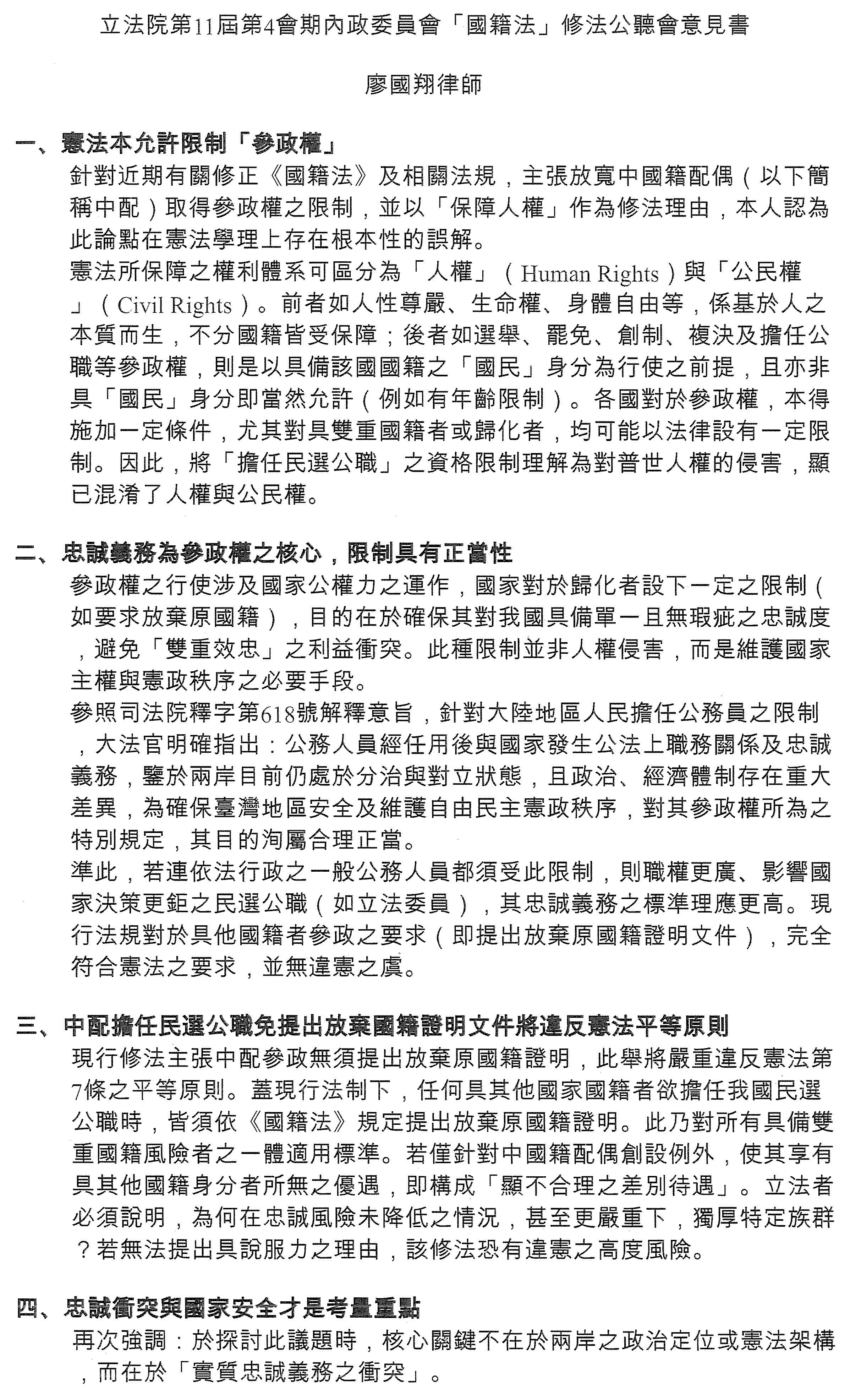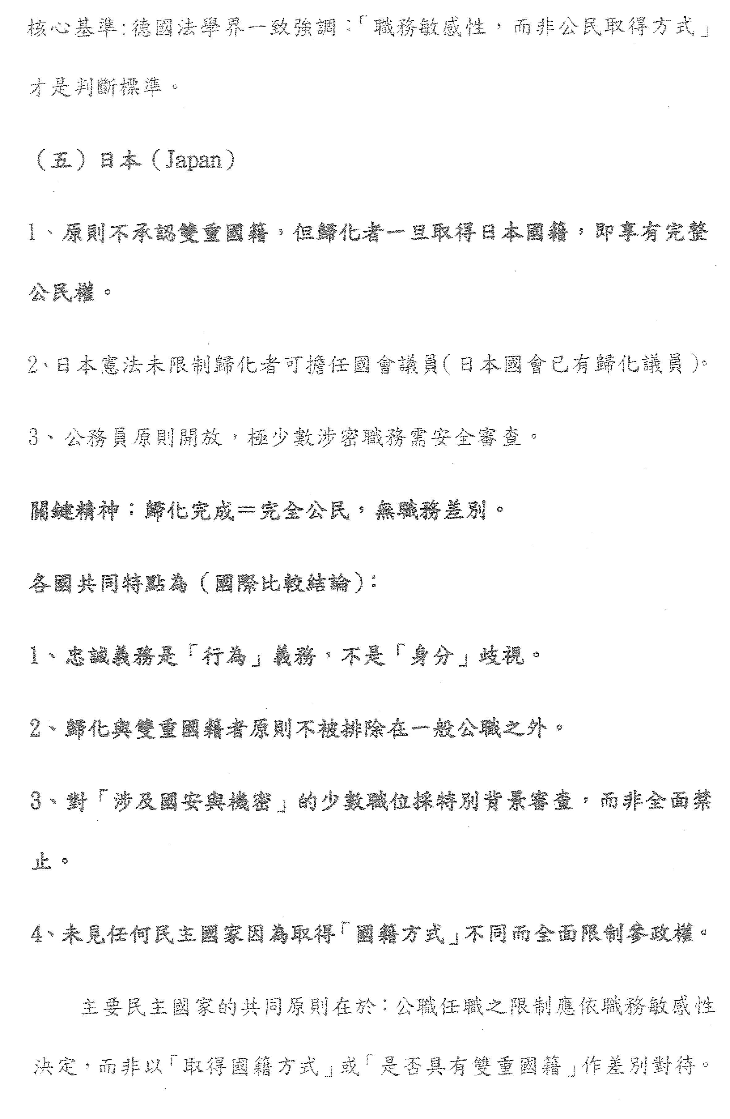 這個平等權是要一體適用的情況,而參政權它本來就應該是一個因為國家忠誠可以做相關硬限制的基本權利,這個部分其實也沒有太大的問題,所以整個來看,不論是從國際上整個先進民主國家相關的規範,或者是現有國籍法對於所有新住民平等參政權的要求,乃至於因為這樣子,所以可以讓所有新住民在參政的時候確保他的國家忠誠義務,當然包括中配在內,我覺得這一系列的過程其實是非常非常完整的,所以因此國籍法並沒有修正的必要,謝謝。