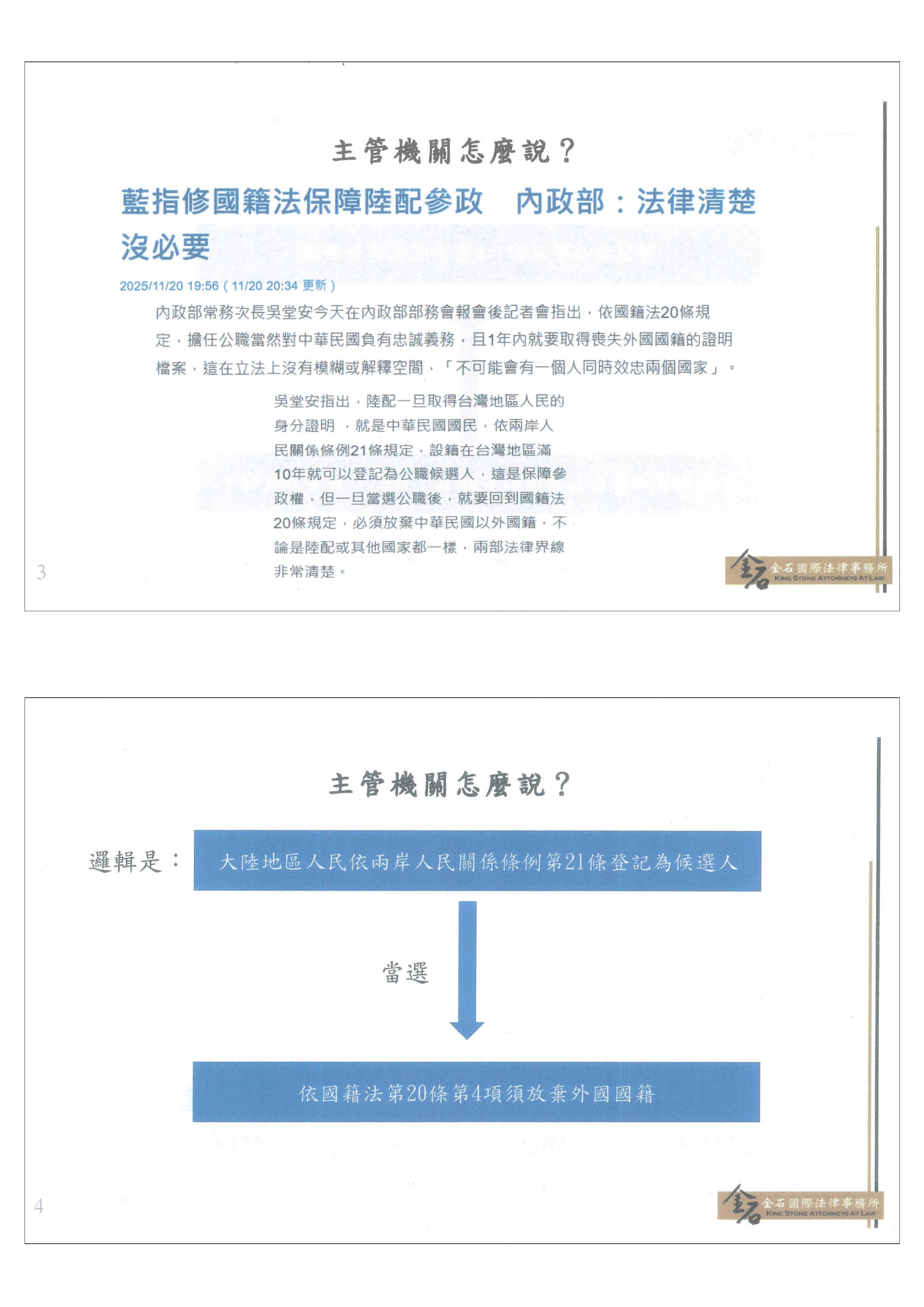 在第三個階段,就是這一次修法會出現疑義的部分,就是任職。如果他當選了,在就任的時候他必須要放棄原來的國籍,要提出證明,且在一年之內要確保真的有放棄國籍。在這件事情上面,我們是按照國籍法的規定,現在的爭議是什麼呢?現在的爭議是中國配偶要適用兩岸人民關係條例的規定,但很抱歉,兩岸人民關係條例就是沒有規定,兩岸人民關係條例規定的就只有登記第二階段的部分,它不包含第三階段的部分,這個法律是割裂的。