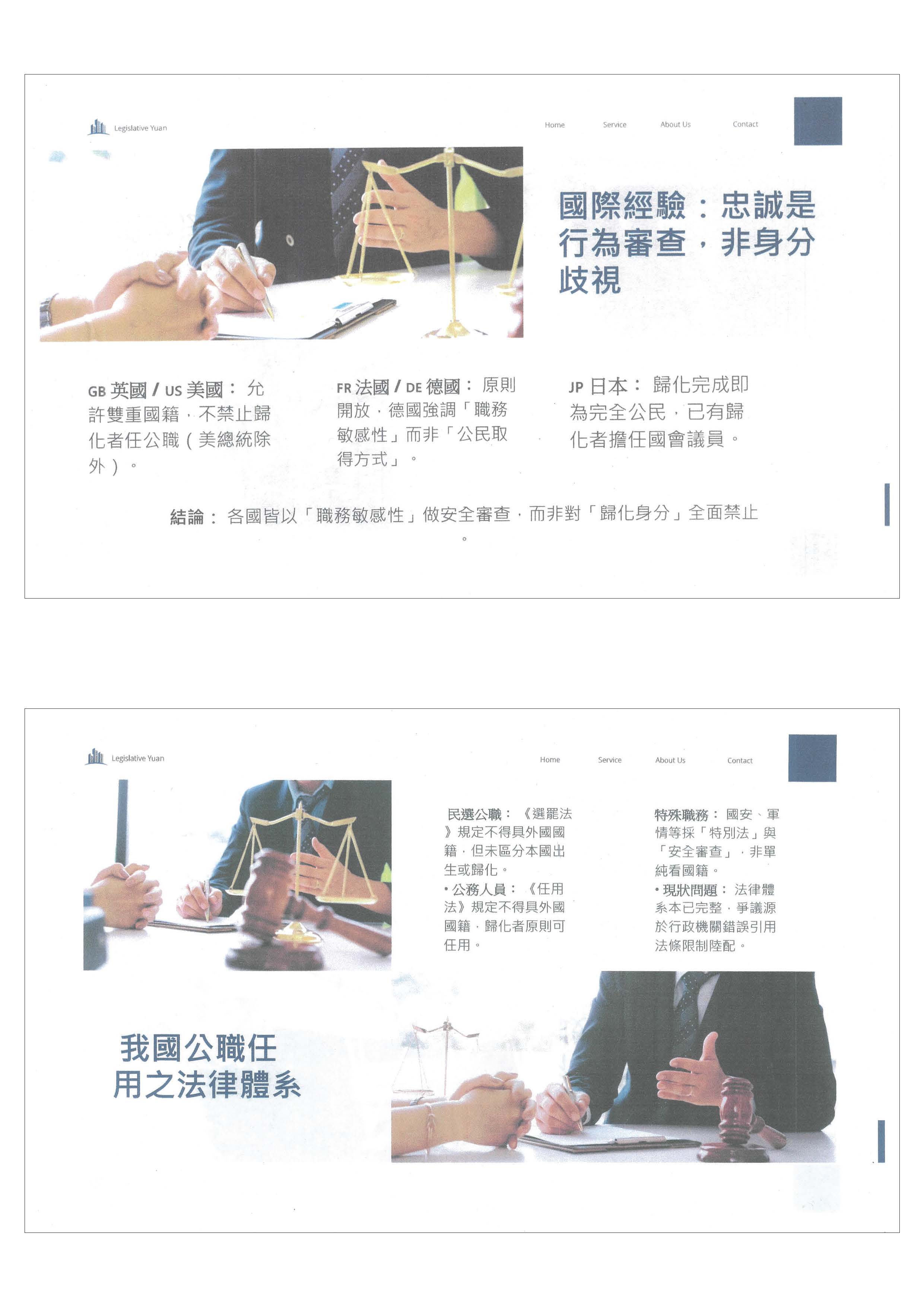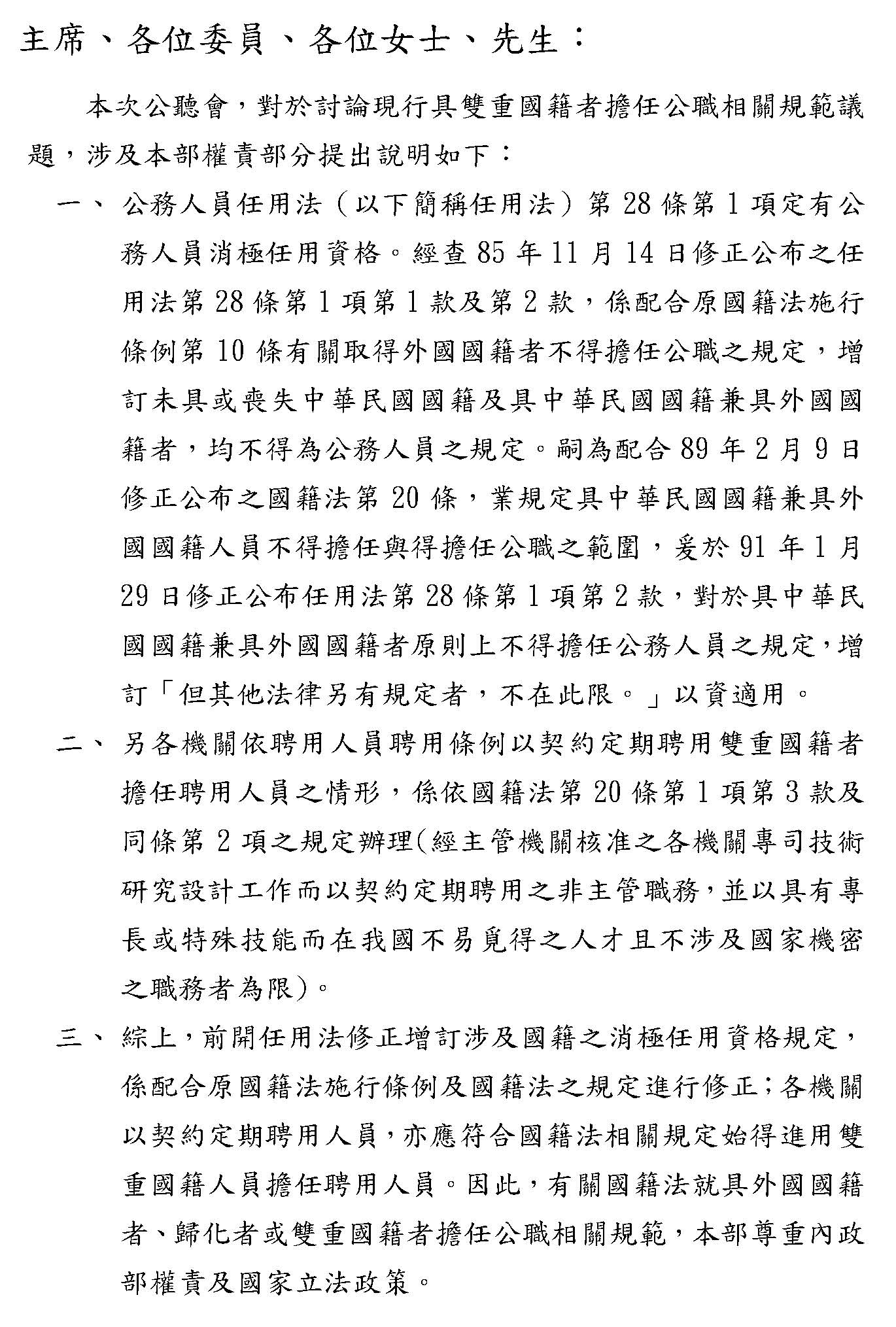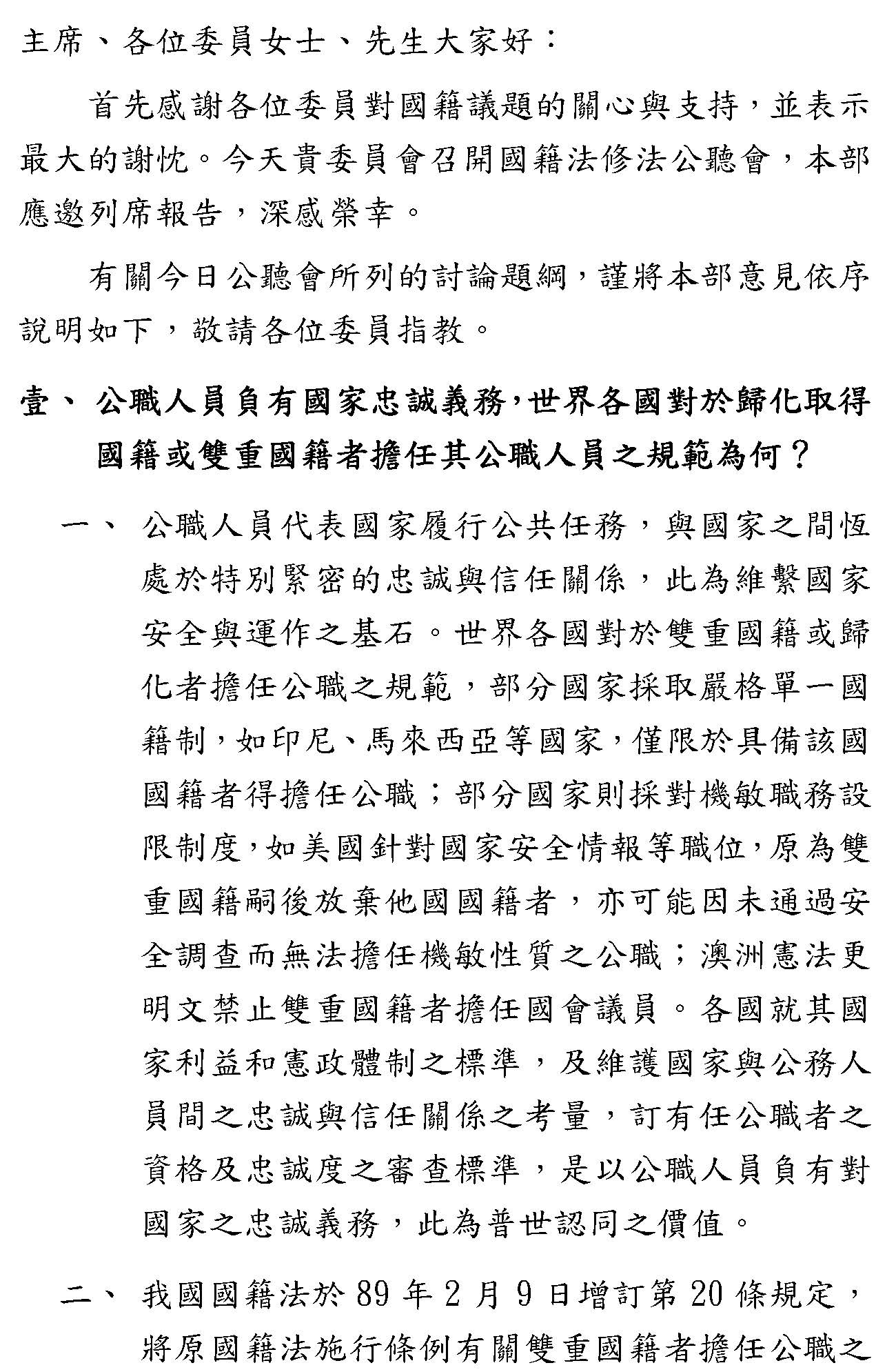 公職人員負有國家忠誠的義務,在世界各國對於歸化取得國籍或雙重國籍者擔任公職人員的規範是怎麼規劃,這就看得出對國家的忠誠。就雙重國籍跟擔任公職相關的規劃,是不是適合在臺灣中華民國等等相關的議題,我們特別舉辦公聽會,聽取專家學者的意見,我們會詳細記錄各位的高見,並列入立法院公報紀錄,作為國籍法修法討論時的參考。