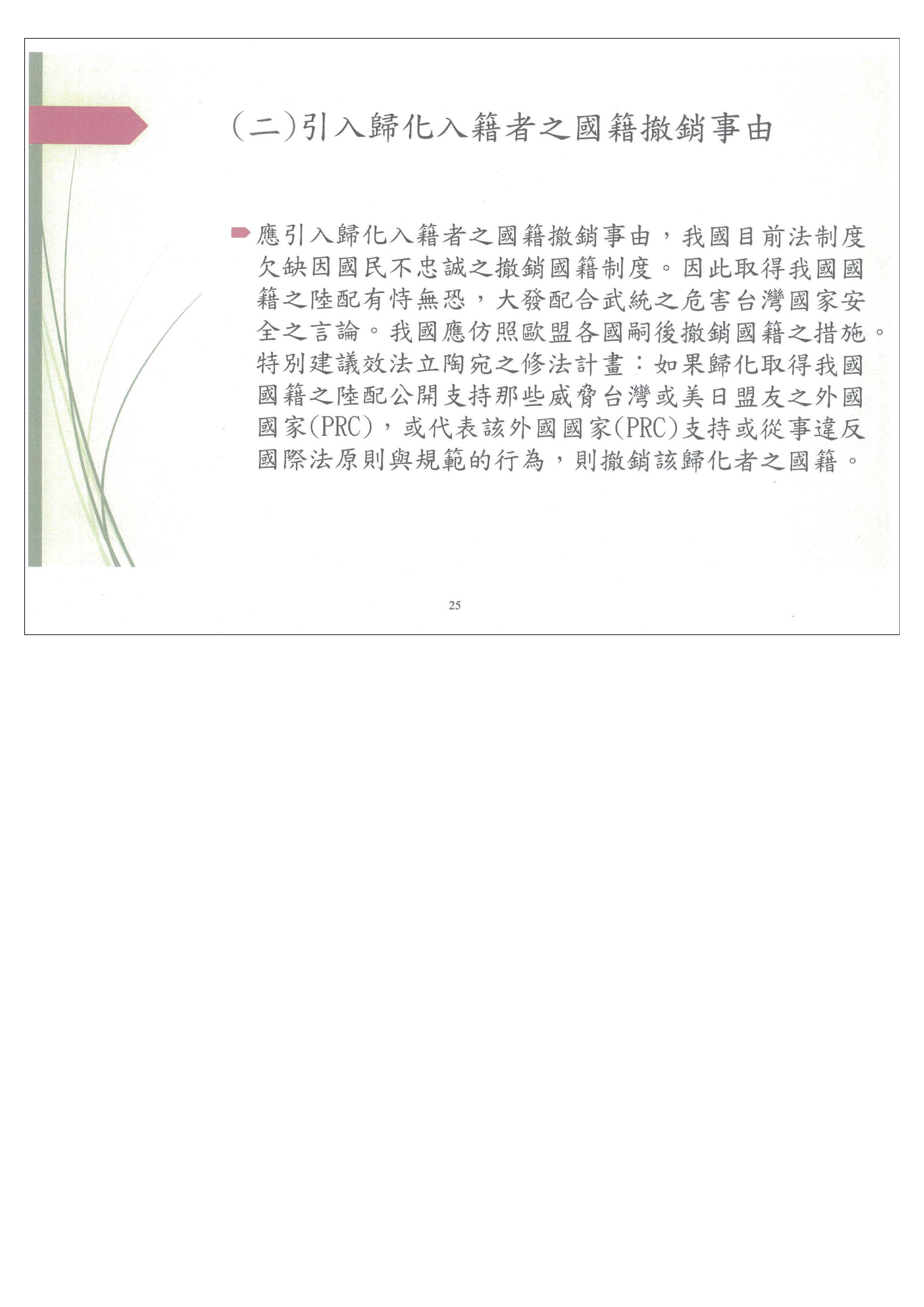 最後,我也要提到一個國安風險跟保障我們自己的國民,剛剛提到愛沙尼亞、拉脫維亞跟俄羅斯的關係,PRC對我們的敵意我們都非常地瞭解,我們務實地從政治實務和邊境管理,臺灣跟中國互不隸屬,或者你要說ROC跟PRC互不隸屬,這是客觀的事實。這個PRC中國政權對我們有高度的敵意,一旦擔任公職之後,如果我們允許我們的國民不放棄另一個國家,或者你要說另外一個政治實體的戶籍,你不就是在傷害他,讓他可能會在執行公務的時候受到政治威脅嗎?這樣子其實是傷害中華民國國民歸化後,來自PRC的國民行使他完整的參政權,我認為對所有歸化中華民國的外籍配偶,包含中國籍配偶,這樣的修法才是傷害他們完整的參政權,以上。