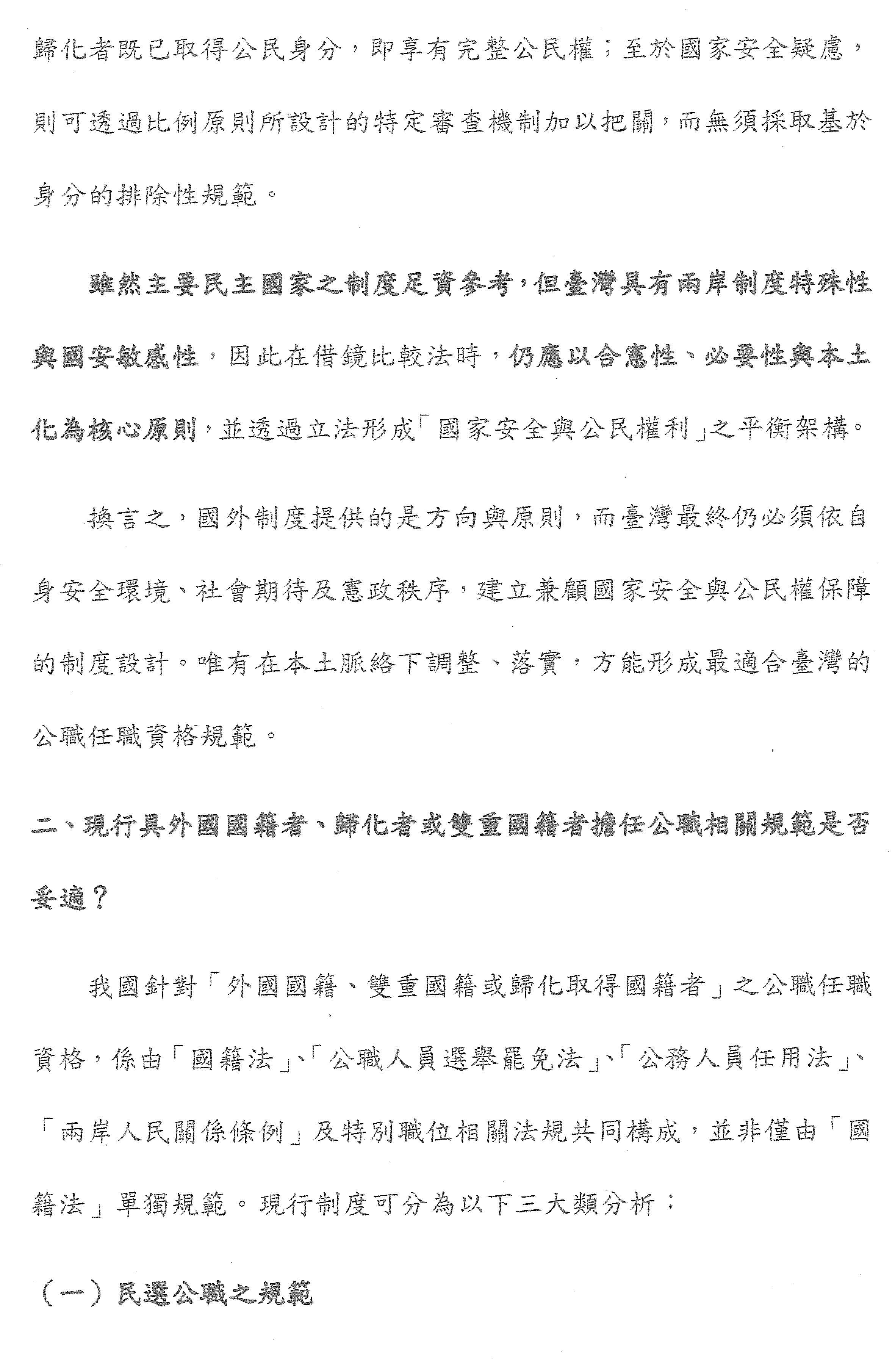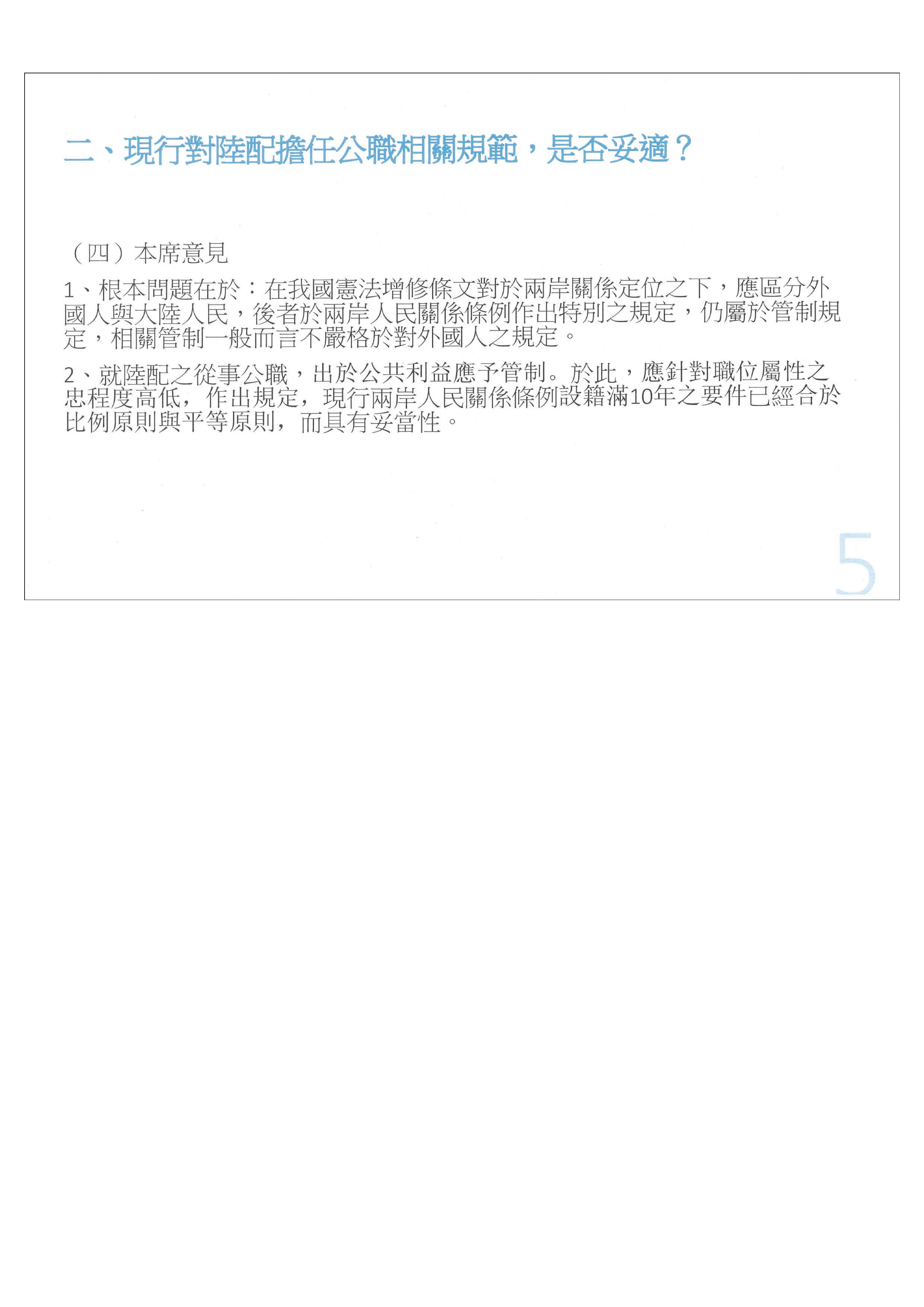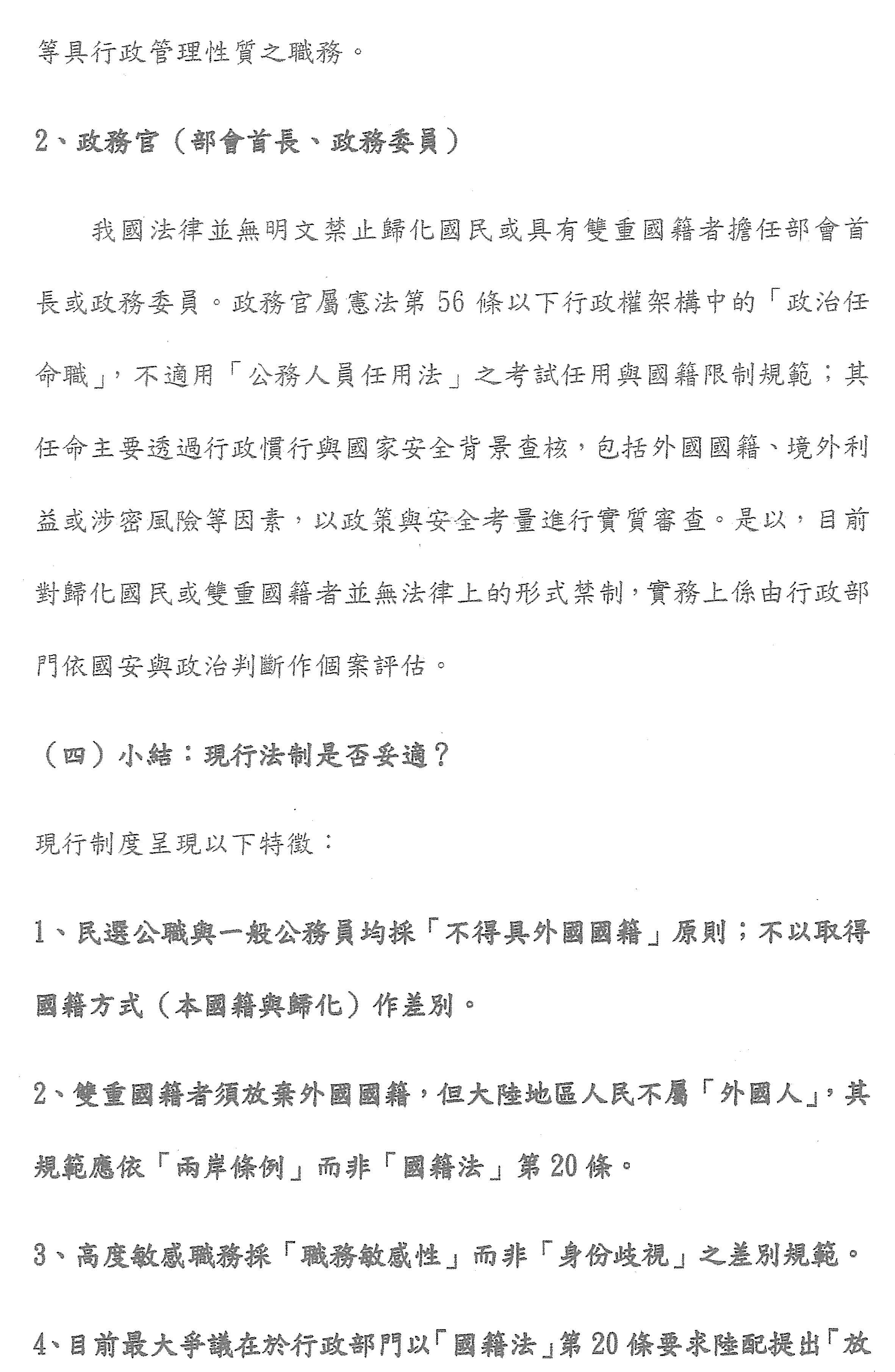 最後,我認為今天對於陸配的參政權應該要從兩岸人民關係條例去管制,現行的管制規定是只要設籍滿10年就可以參政、就可以服公職,這個規定是不是過於寬鬆?事實上,國籍法第十條有規定哪些職位是外國人不能擔任的,因此,我認為陸配或大陸居民在臺灣合法取得居留之後,其服公職的權利應該做如何的管制,這是涉及宏觀的判斷,也許各個主要政黨有不同的判斷,應該從這邊來做相關的管制規定,這才是正辦,而不是突然就換了一個軌道、一套論述。
