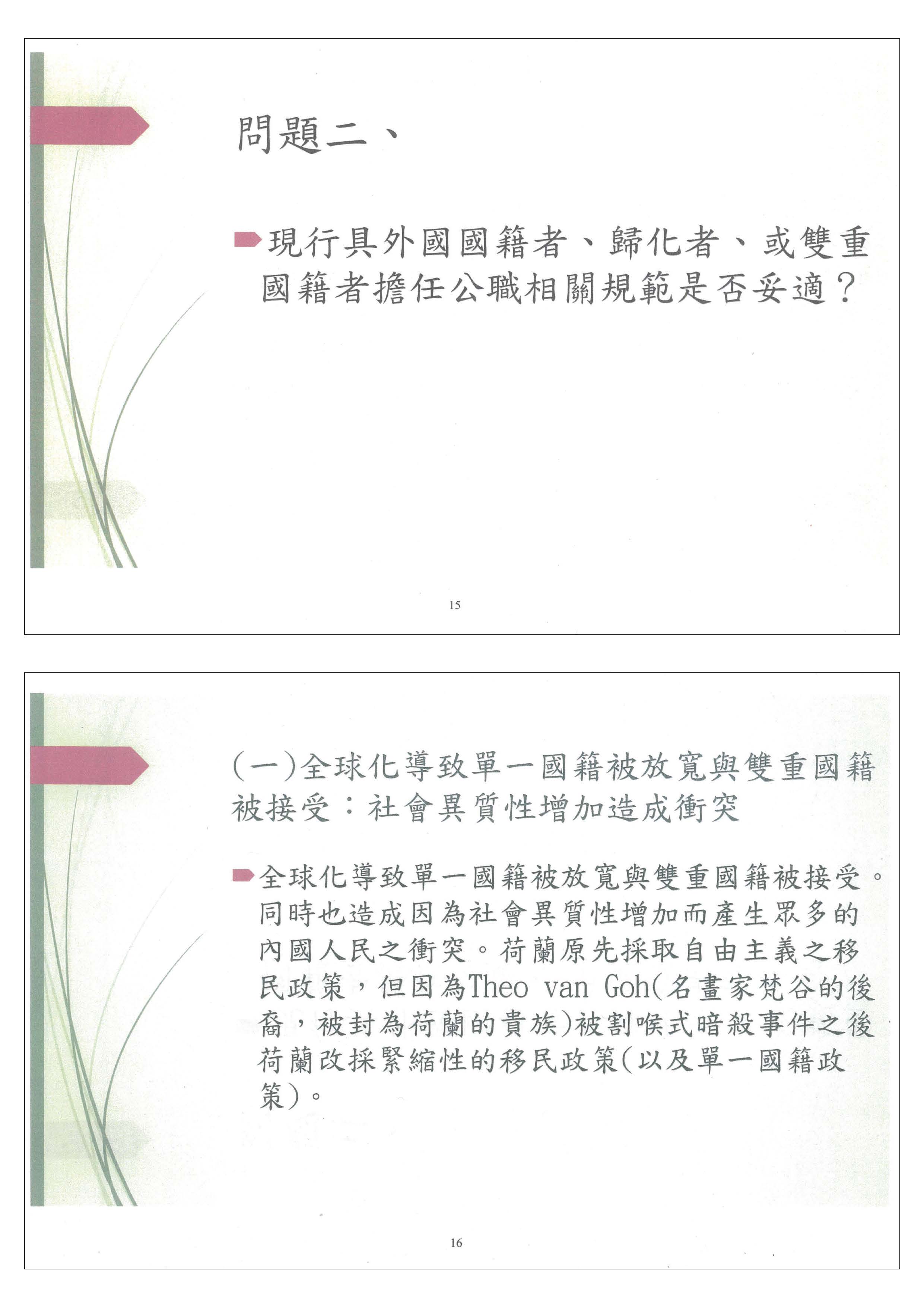 第二個問題討論到現行具外國國籍者、歸化者或雙重國籍者擔任公職相關規範是否妥適?那就是我們現在討論的國籍法第二十條的部分,我相信如果同樣的比較剛剛提到這些國家的規範的時候,就會發現臺灣的國籍法當中,我們一般是講說漠視雙重國籍,我們並沒有刻意地去排除或者是明文地說你可以有或可以沒有,因為這是屬人跟屬地主義之間造成的一個模糊空間。但是國籍法第二十條,剛剛吳威志老師也很清楚地強調,它其實很清楚地要求說如果你是有雙重國籍身分的人要擔任公職的話,必須先放棄,或者說必須放棄這個國籍,也就是現在的相關規範和剛剛我們所提到的這些小型先進民主國家的規範是完全一致的,這樣的規範當然我們整體來看是妥適的狀況,因為國籍會牽扯到國家認同與忠誠義務,我完全贊成應該要用平等權來看待所有成為臺灣國民相關的公民權,但是如果今天只為了中國籍人士去做例外排除的話,請問新住民怎麼辦?其他的新住民怎麼辦?所有的新住民應該是要一致、平等的狀況來進行這樣子的適用,如果只為了陸配去取消或者是在國籍法作排除,請問其他的新住民放棄國籍,這情何以堪?