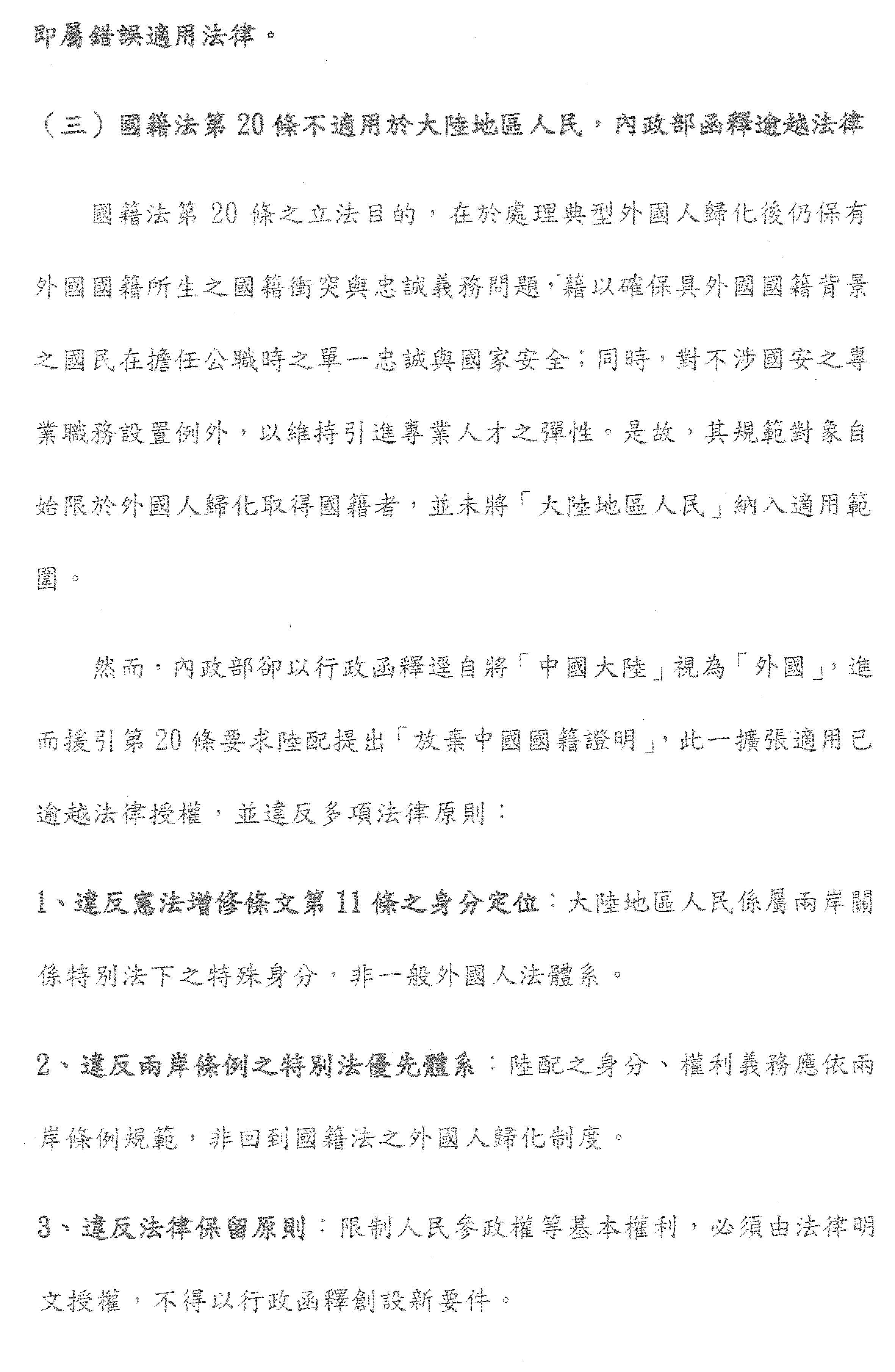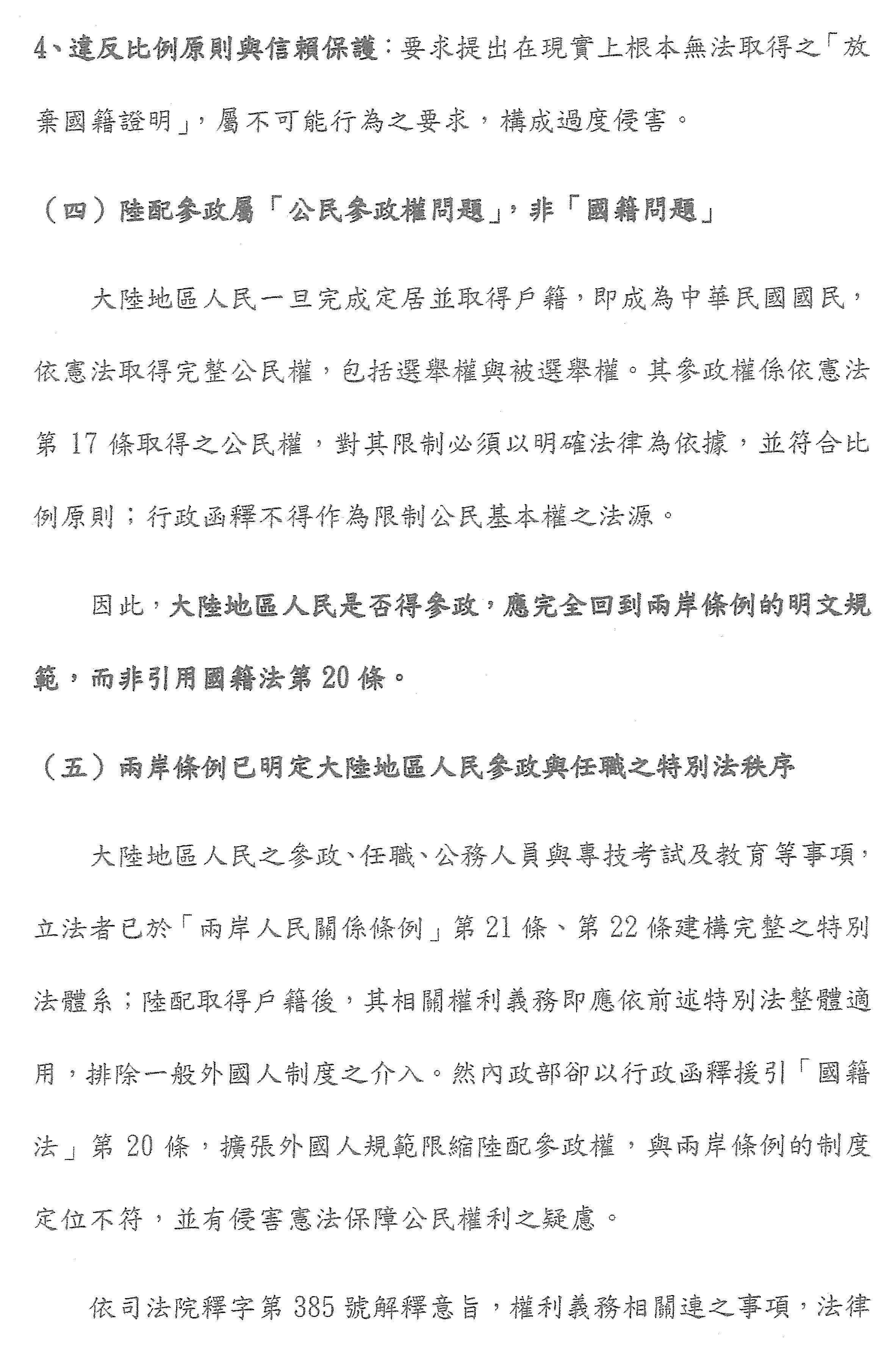 另外我引用司法院大法官釋字第385號解釋:法律所定之事項若權利義務相關聯者,本於法律適用之整體性及權利義務之平衡,當不得任意割裂適用;既然相關制度在兩岸人民關係條例第二十一條、第二十二條都有規定,已經就大陸地區人民建立完整的特別法秩序,就必須要依兩岸人民關係條例統一適用,而不得再以國籍法第二十條另設限制割裂的規定。另外針對立法建議方向就是:第一,明確界定國籍法第二十條適用對象。第二,陸配參政規範應優先回歸兩岸人民關係條例。