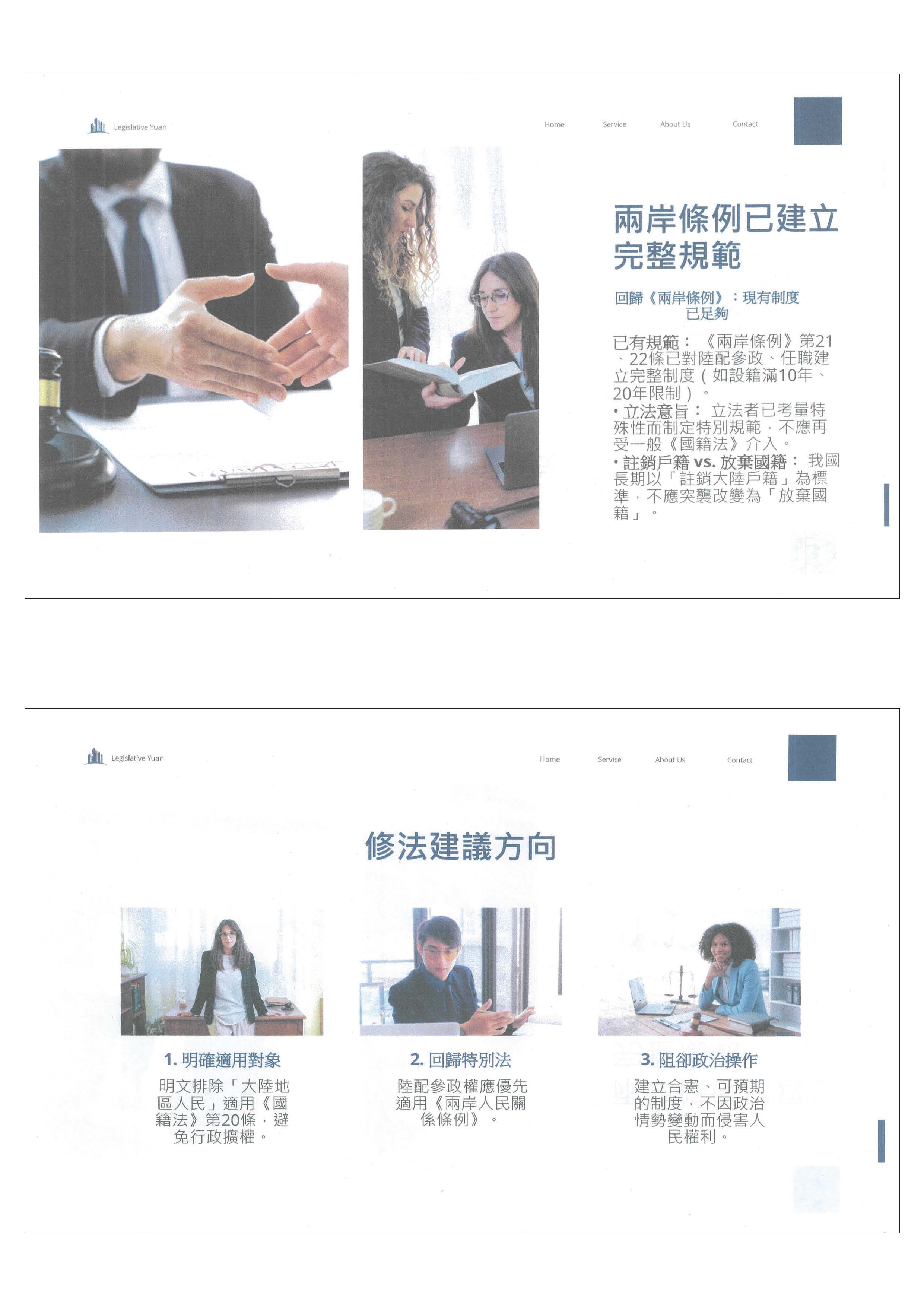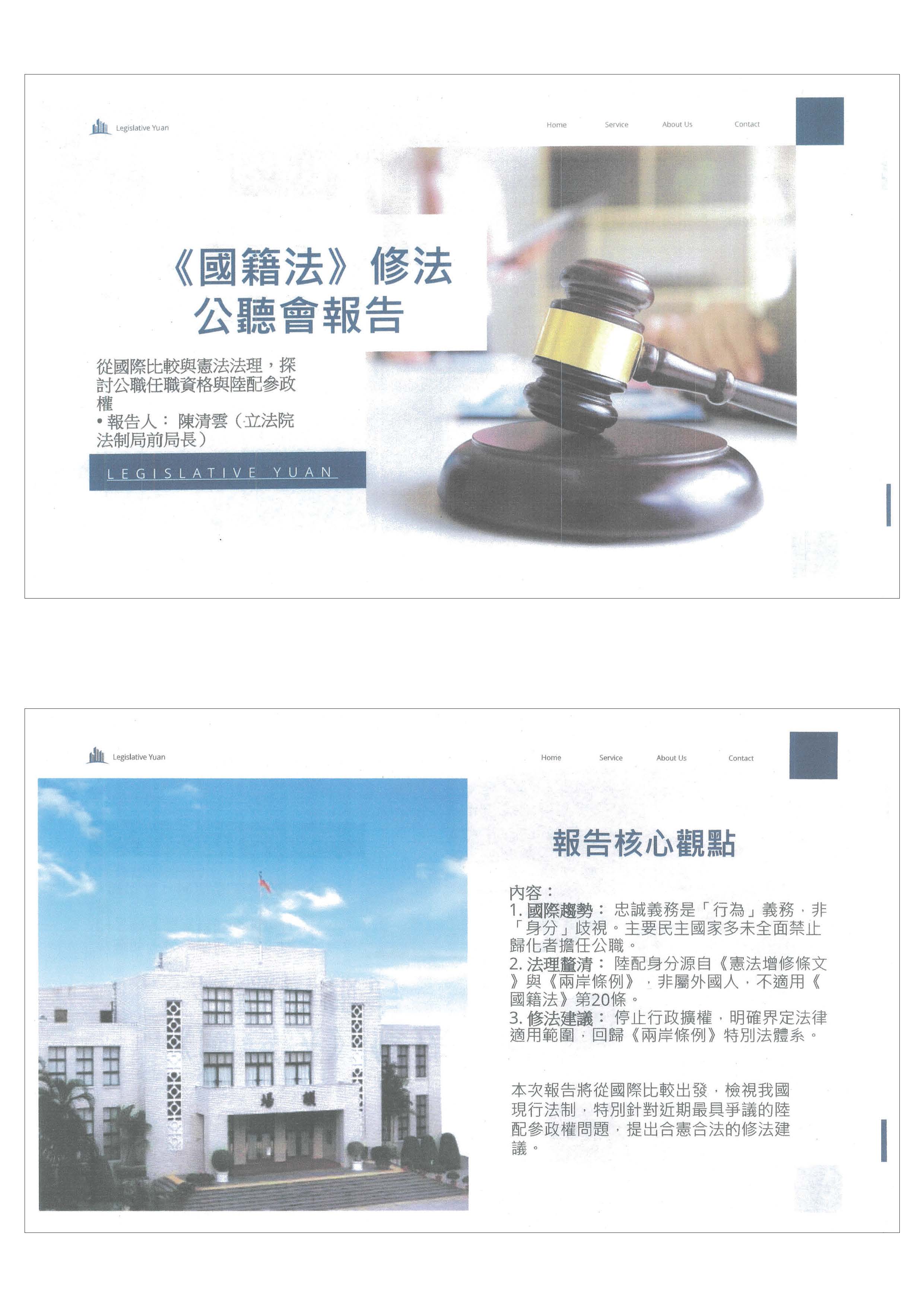 現在民眾黨所要提出來的,就是要補救兩岸人民關係條例,而不是國籍法,這個是我們跟國民黨不一樣的地方,我必須講清楚,是要把兩岸人民關係條例的制度補強,補到完整,我們主張的方向非常清楚,是什麼呢?第一,不要剝奪陸配的權利,尤其是參政權,為什麼?因為他們是領中華民國身分證的國民,也是公民,而且他們也是10年之後才能夠參選,才能夠登記,陸配在臺生活10年以上,他們納稅、工作、養小孩,是社會的一分子,是制度要給他們一條清楚的路,而不是讓他活在不確定裡面。第二個,我們的方法就是用公開忠誠宣誓取代不可能取得的文件,既然放棄大陸籍的證明拿不到,那就不應該再用這個標準,改成公開宣誓效忠中華民國、遵守憲法體制、不受境外指揮,這是大家做得到,也能夠維護公職的正當性。大家會說這個有沒有國際的案例呢?有喔!這個是有國際案例的,有宣誓制度的國家包括美國、加拿大、澳洲、英國、德國等,對於成為公職或者是加入國籍者都要宣誓忠誠,這個地方就是本黨未來要提出的方向、在思考的方向,這不是臺灣獨創,而是民主國家的共同做法。