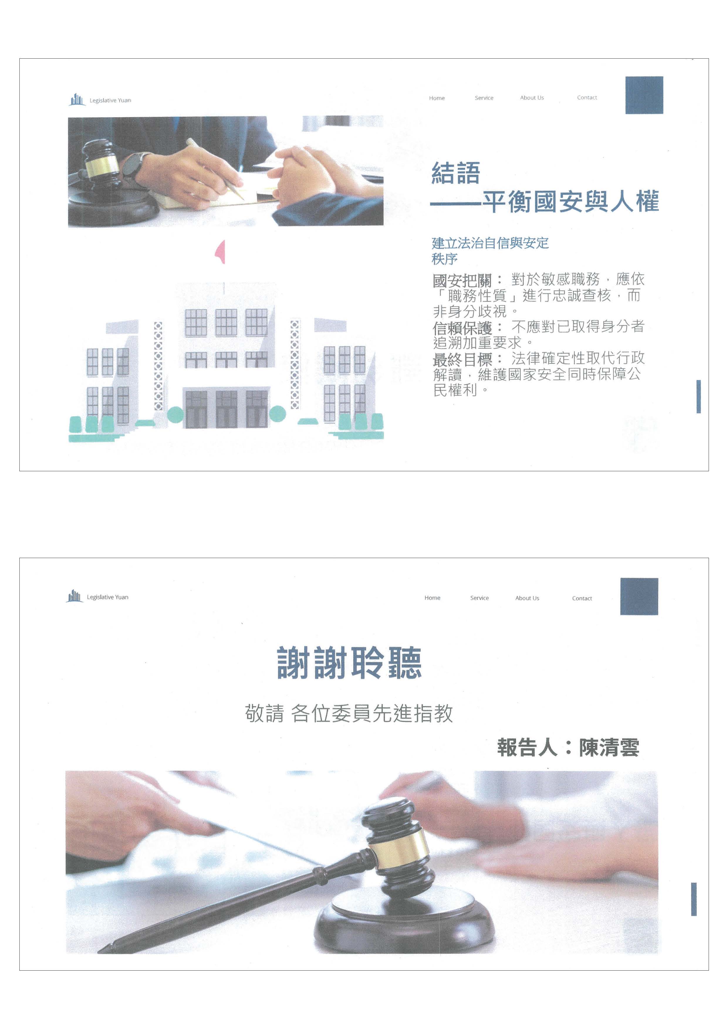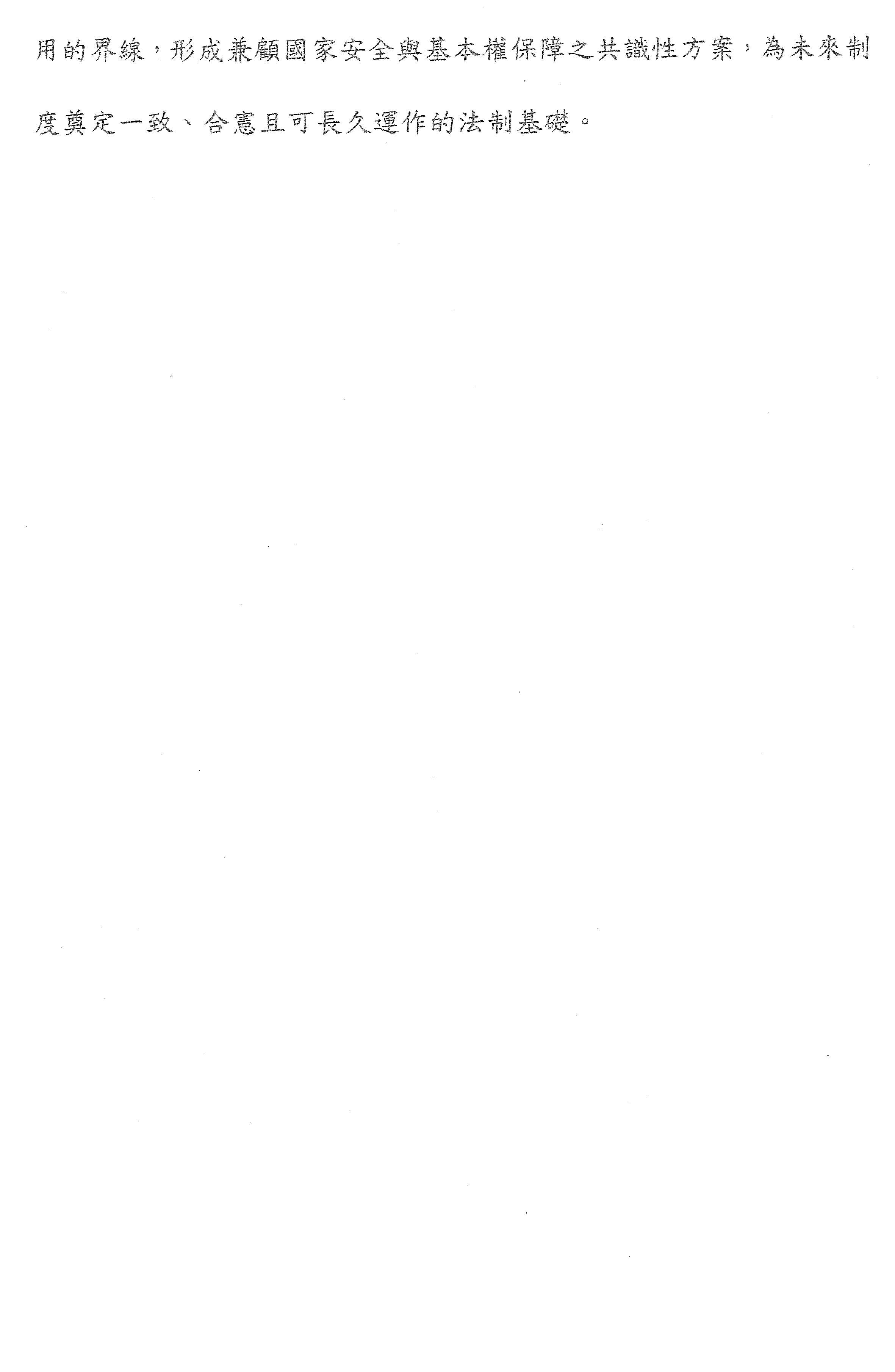 最後期待本次修法能在委員跟行政部門理性對話中,釐清體系適用的界限,形成兼顧國家安全與基本權保障之共識性方案,為未來制度奠定一致、合憲且可長久運作的法制基礎。以上報告,敬請各位指教,謝謝。