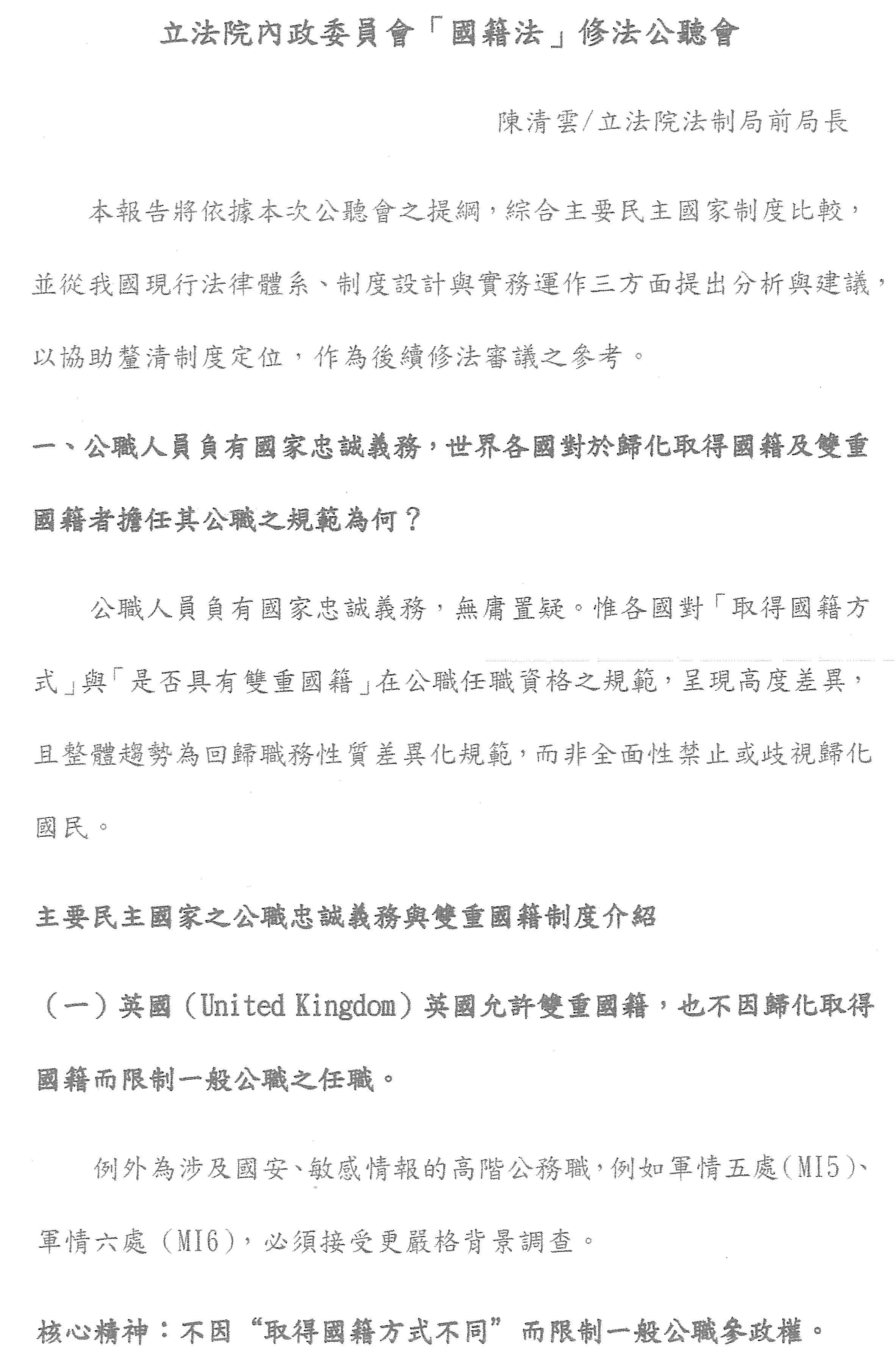 陳前局長清雲:主席、各位委員、各位學者專家、各位先進,大家好。我是立法院法制局局長退休,今天很榮幸能夠應邀來參加這個公聽會,也提供一些意見給各位作為國籍法修正的參考。內政委員會這次非常重視這個法律的修改,特地舉辦這個公聽會。