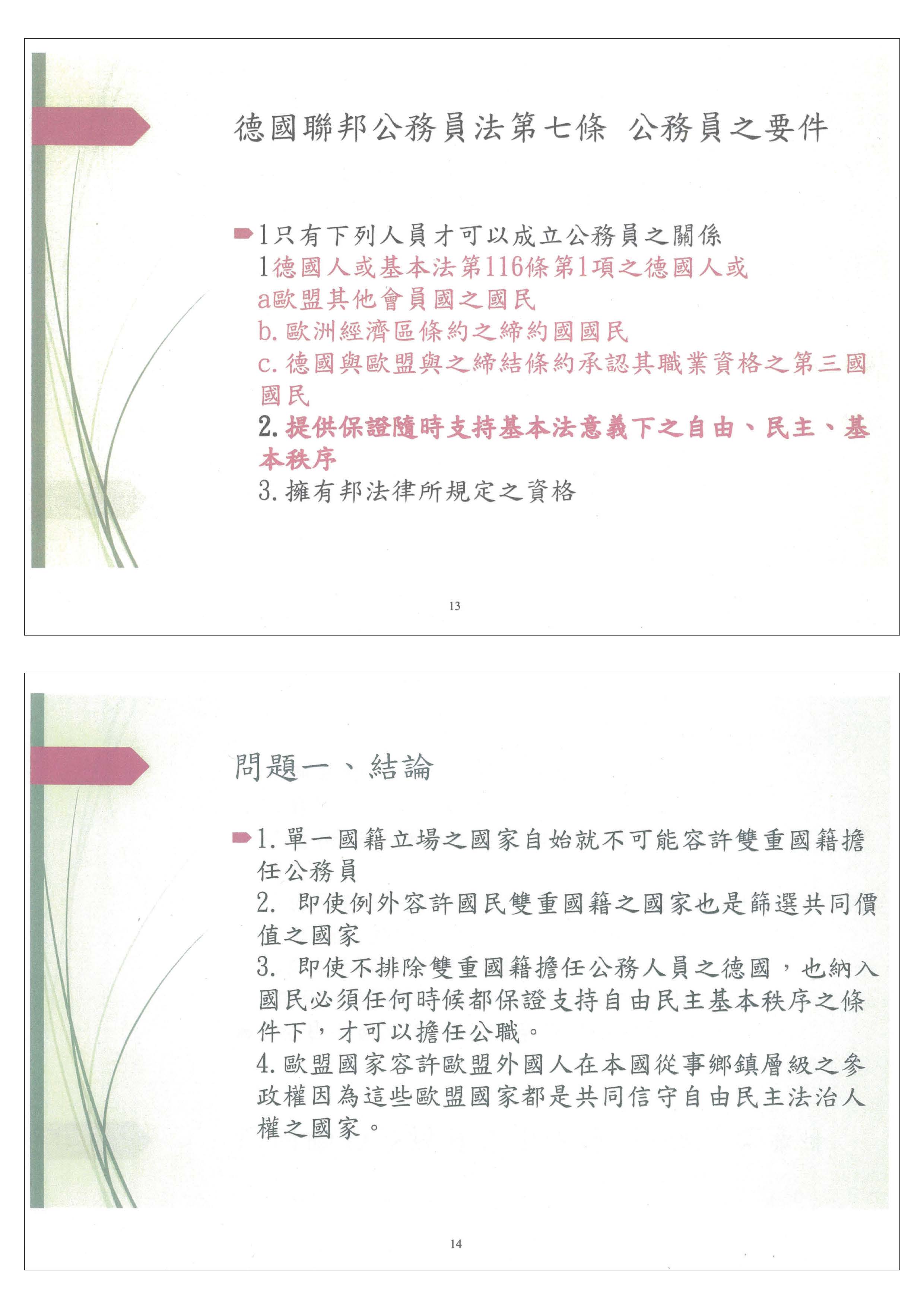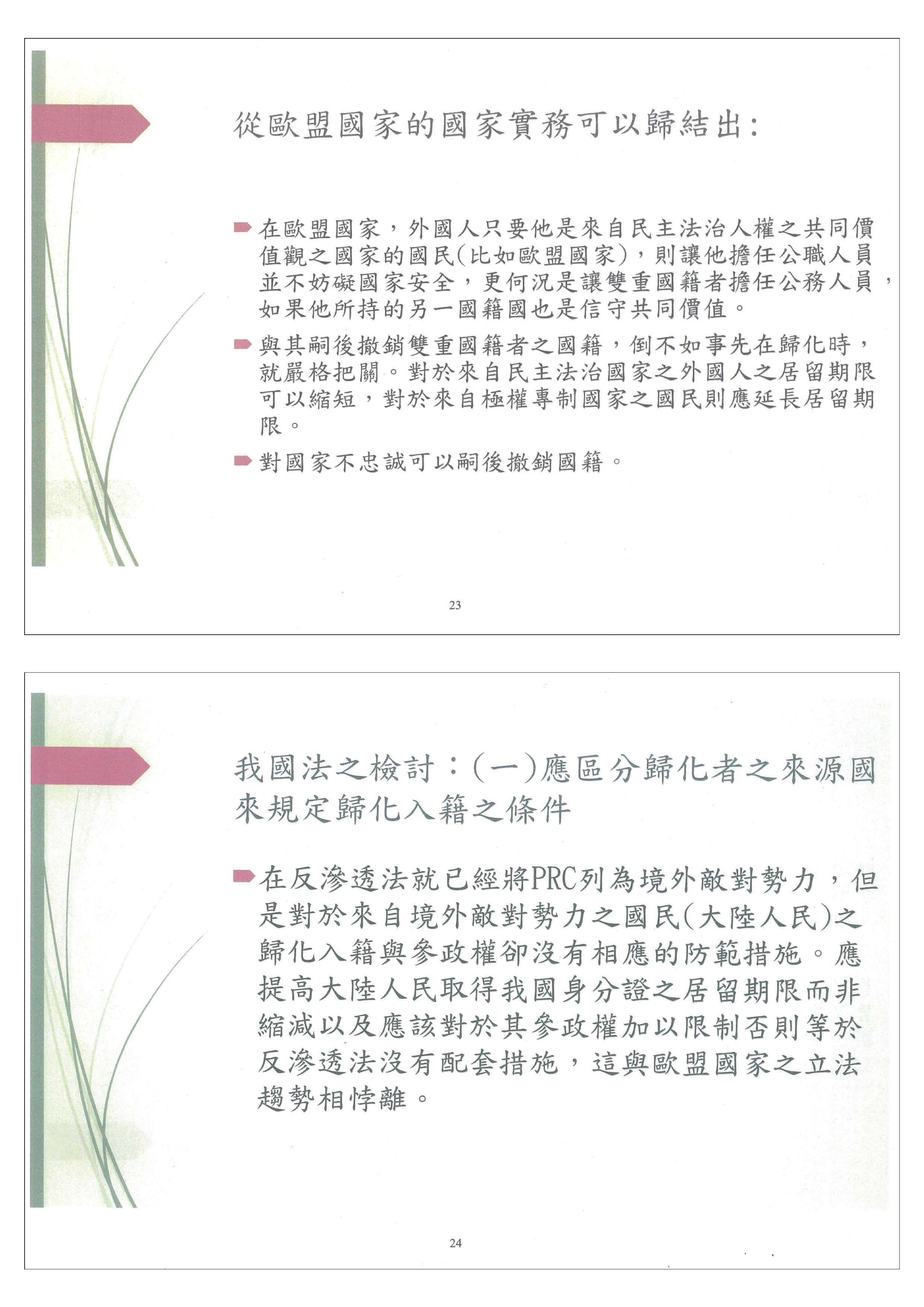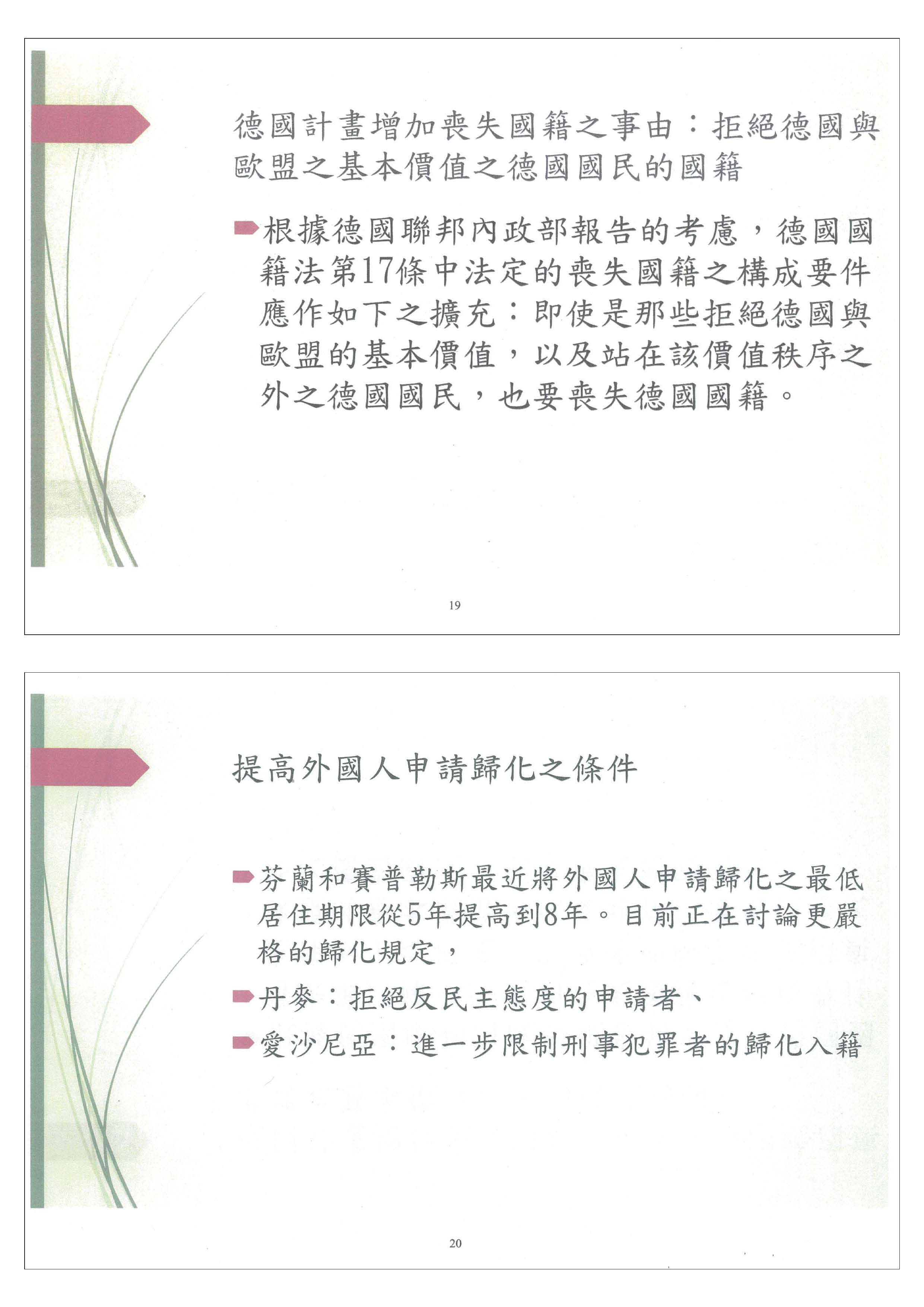 就算是承認雙重國籍的國家,目前也慢慢地增加、討論引進撤銷雙重國籍的規定。今年德國總理就說,在德國反猶太極端主義者,因反猶太而犯了刑事犯罪,要考慮撤銷他的國籍。對於不符合德國的自由民主基本秩序的人,在內政部的報告裡面說,德國國籍法第十七條的法定喪失國籍的構成要件應該要擴充,那些拒絕德國與歐盟基本價值的人,也要考慮撤銷國籍,還有芬蘭也都有這樣的討論,比如說要引進……對不起,我時間到了,我最後一句話就是說,申請歸化,對於從有疑問的國家來的人,要調高他的時限,而不是降低他的時限,他們會區分你是不是從歐盟國家、民主法治國家要過來移民的,還是從極權國家過來的。謝謝。