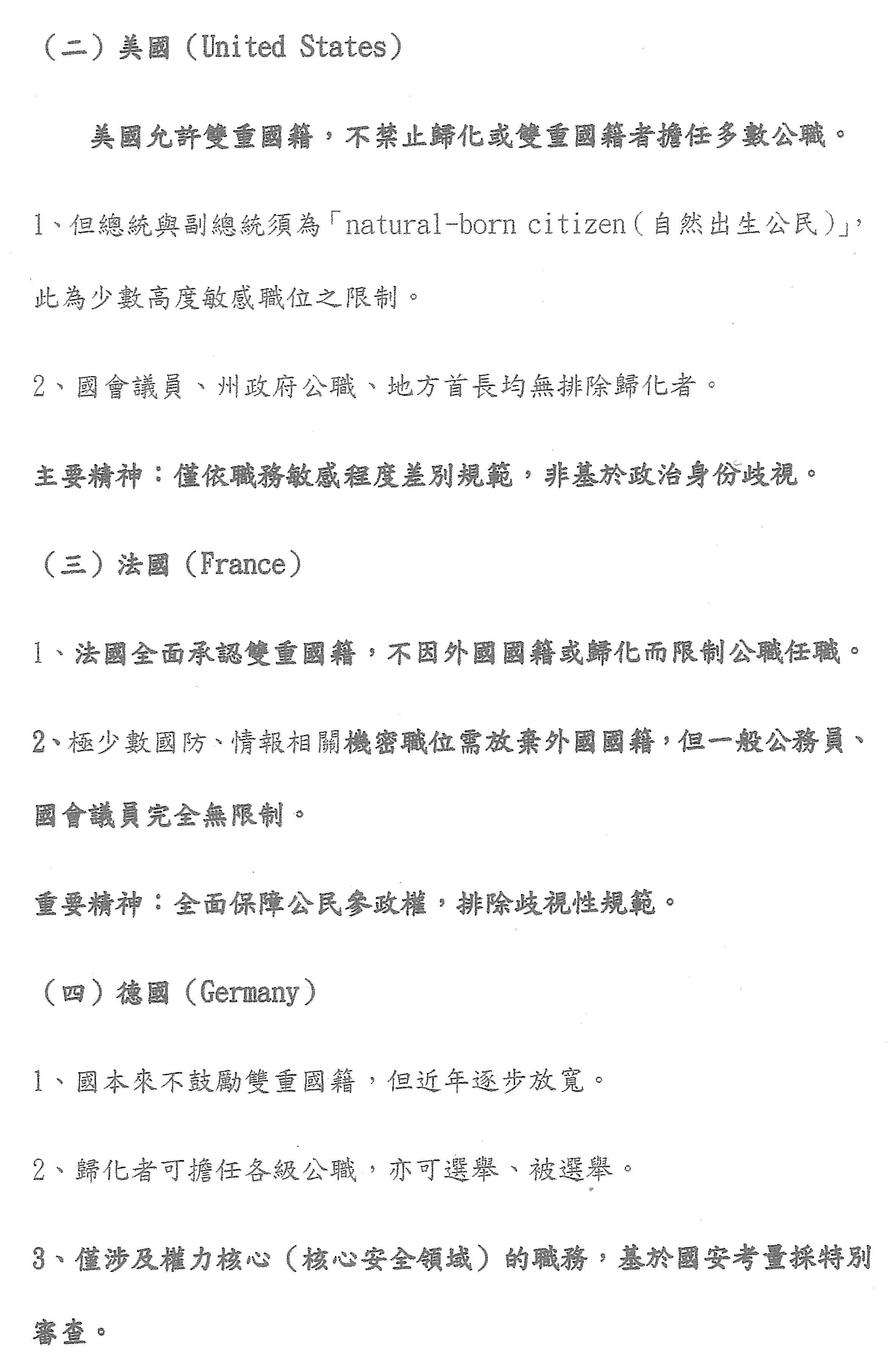 首先就國外法制來講,英國、美國和法國都可以承認雙重國籍,德國和日本原則上是不贊成的,但如果經過歸化之後對國家表示忠誠,我想就比較沒有限制。但是一般來講,針對敏感性的職務都會有安全審查,但不是對歸化身分全面禁止。