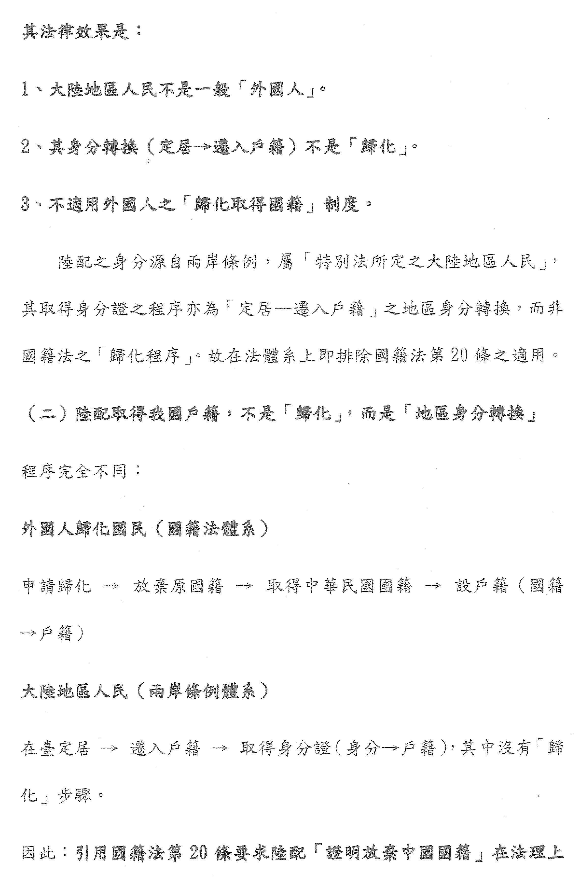 有關行政函釋的謬誤,國籍法第二十條並不適用於大陸地區人民,該條文僅規範外國人歸化,因為國籍法是解決外國人歸化取得國籍的問題,按照現行規定要取得放棄中國國籍證明可能也是完成不可能的任務,比較不容易,因為他不願意,所以才會發生目前幾個要解除村里長,或者其他民意代表公職的案例。對於這個規定,我們認為也不得以行政函釋限制憲法保障的公民參政權,因為公民參政權是憲法第十七條所保障的,這樣限制可能比較不妥當。我們的國民參政權一定都要有,但是在身分取得轉換方面可能必須要有更周延的配套。