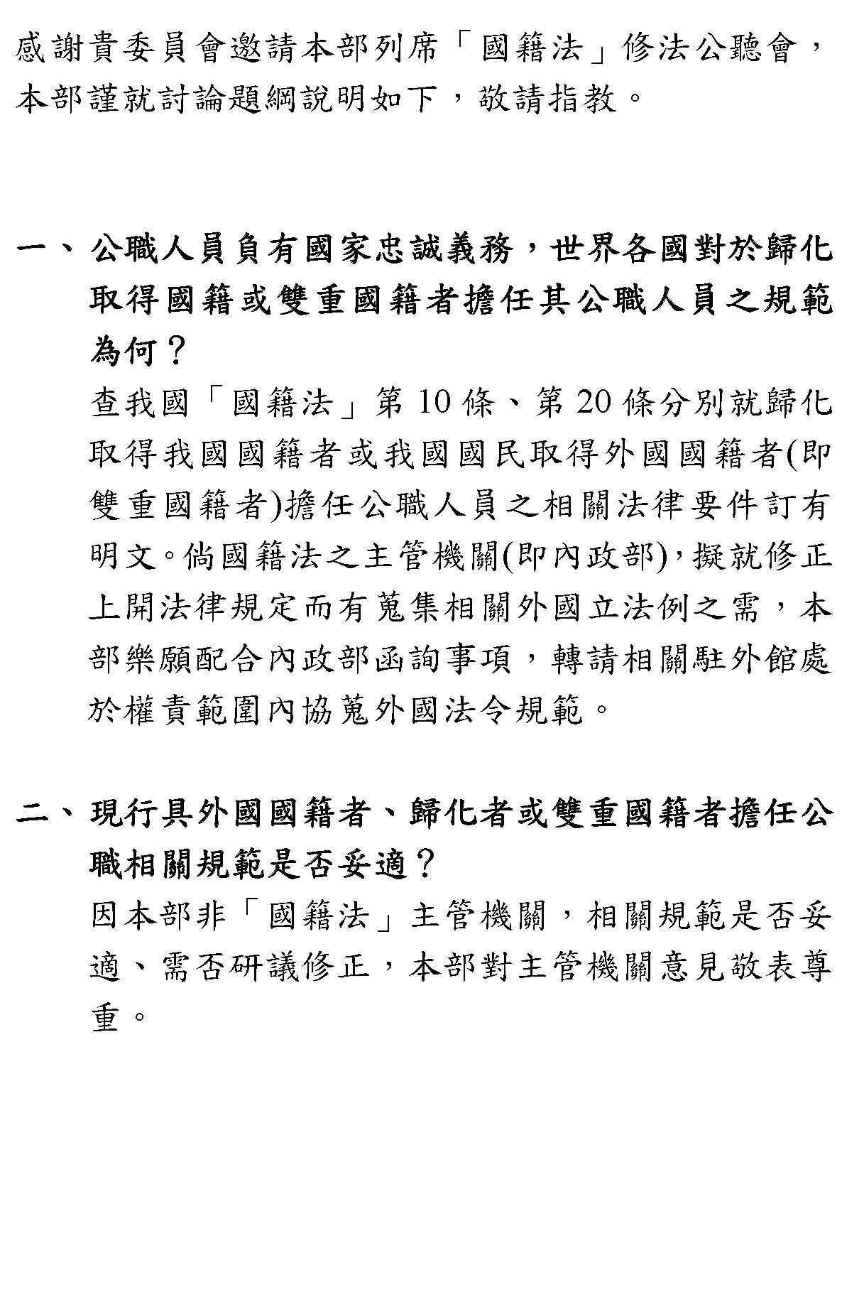 梁副主任委員文傑:主席好,各位大家好。剛剛聽到各位學者及立委的意見,我想我們要稍微說明一下:第一個,我們之所以這一次會談到國籍法第二十條,是因為很多人思考到底大陸人適不適用國籍法,對於這個問題,大家的看法南轅北轍,我們說明一下,因為國籍法第二十條這個規定其實原來是規定在選罷法裡面,後來才被移過來到國籍法,如果今天這個條文還在選罷法裡面的話,我覺得這個爭議會比較少一點,因為大家就不會再去爭議說國籍法到底適不適用大陸地區人民,這是第一點要澄清的。