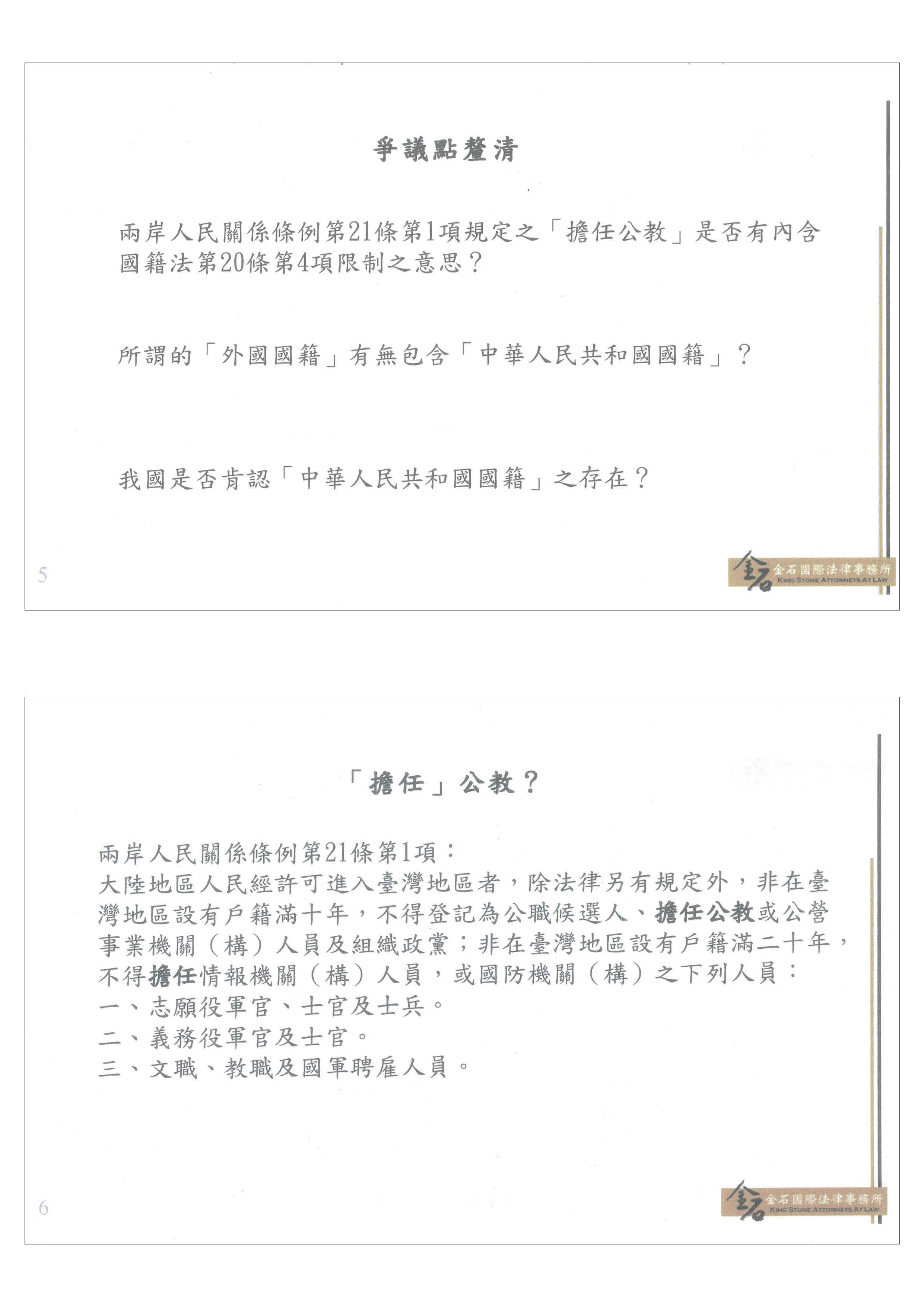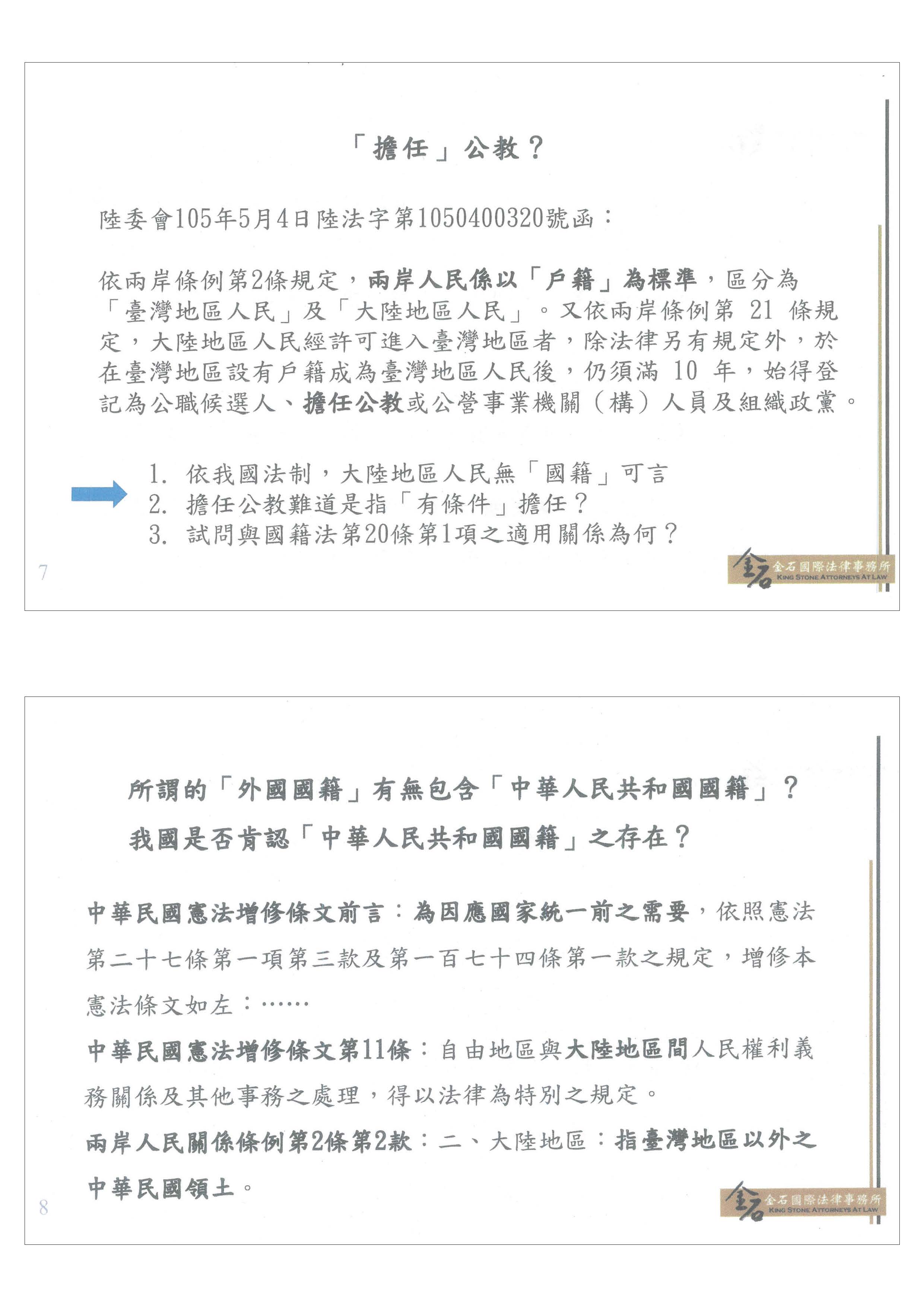 所以本人認為本次的爭議點大概有這三個,第一個,兩岸人民關係條例第二十一條第一項規定的擔任公教是否內含國籍法第二十條第四項限制的意思?以及第二跟第三,所謂外國國籍是否包含中華人民共和國國籍?還有我國是否肯認這個國籍的存在?我們看到兩岸人民關係條例,陸委會和內政部在解讀上就是只針對不得登記為公職候選人去加以闡釋,至於後面四個字「擔任公教」,就目前為止是看不出有進一步的闡釋。我們可以看得出來,兩岸人民關係條例第二十一條第一項跟國籍法第二十條第一項規定的立法體例與文意是相同的。在這種情況下,可不可以說這是一個兩岸人民關係條例沒有規定的情況,而必須依照同條例第一條後段的規定去適用國籍法第二十條第一項以及第四項呢?在這種情況下恐怕有所疑問!